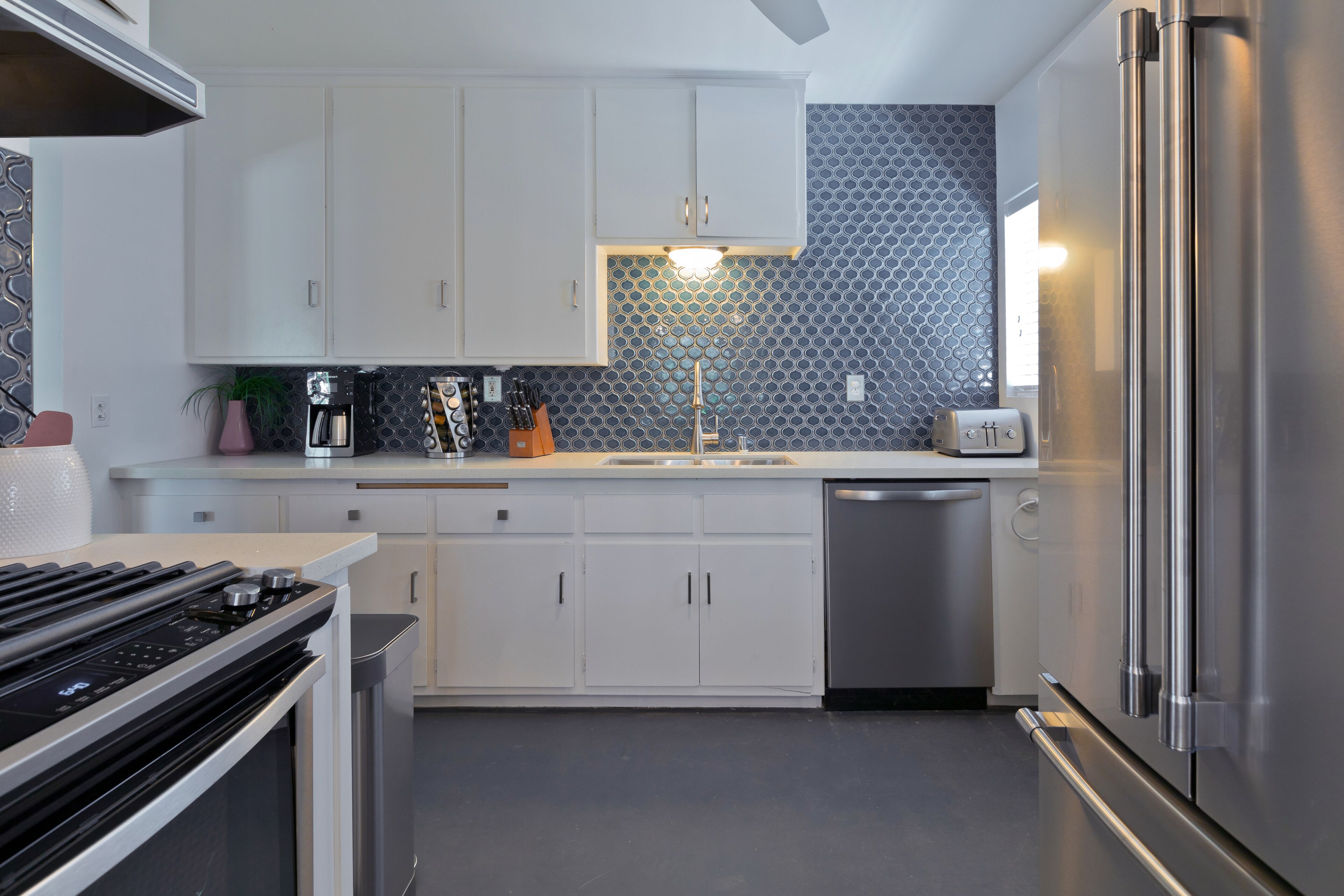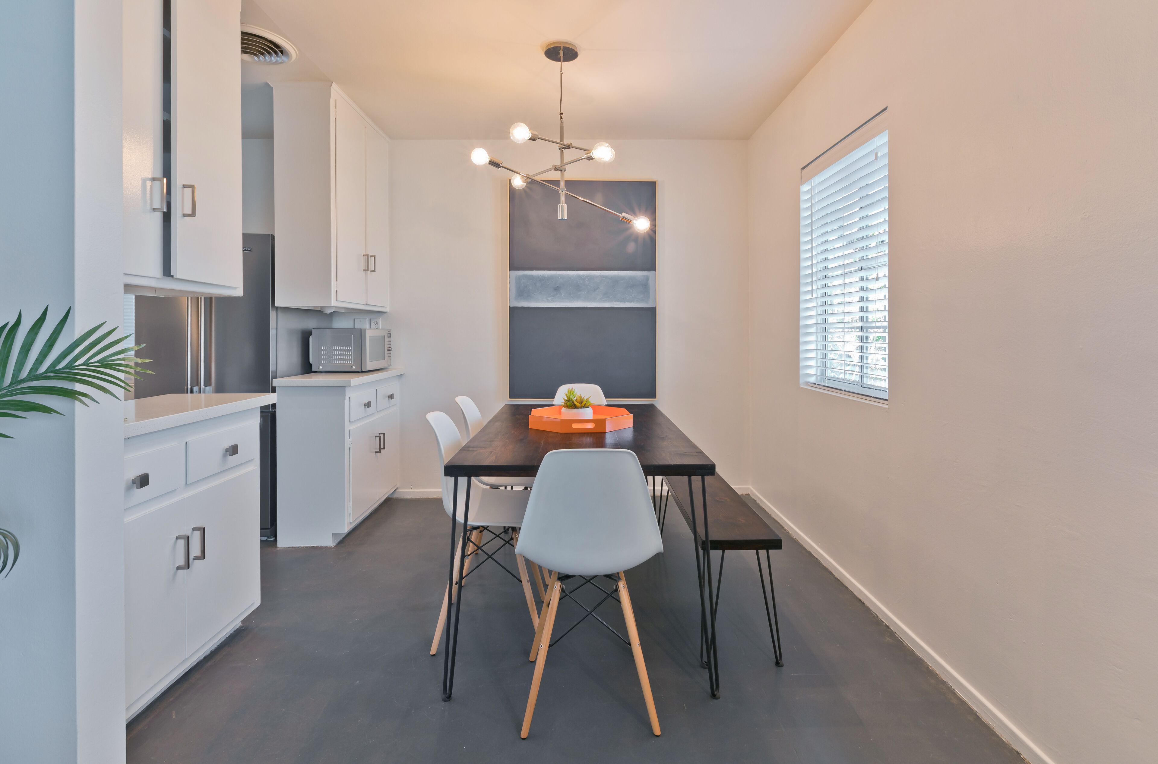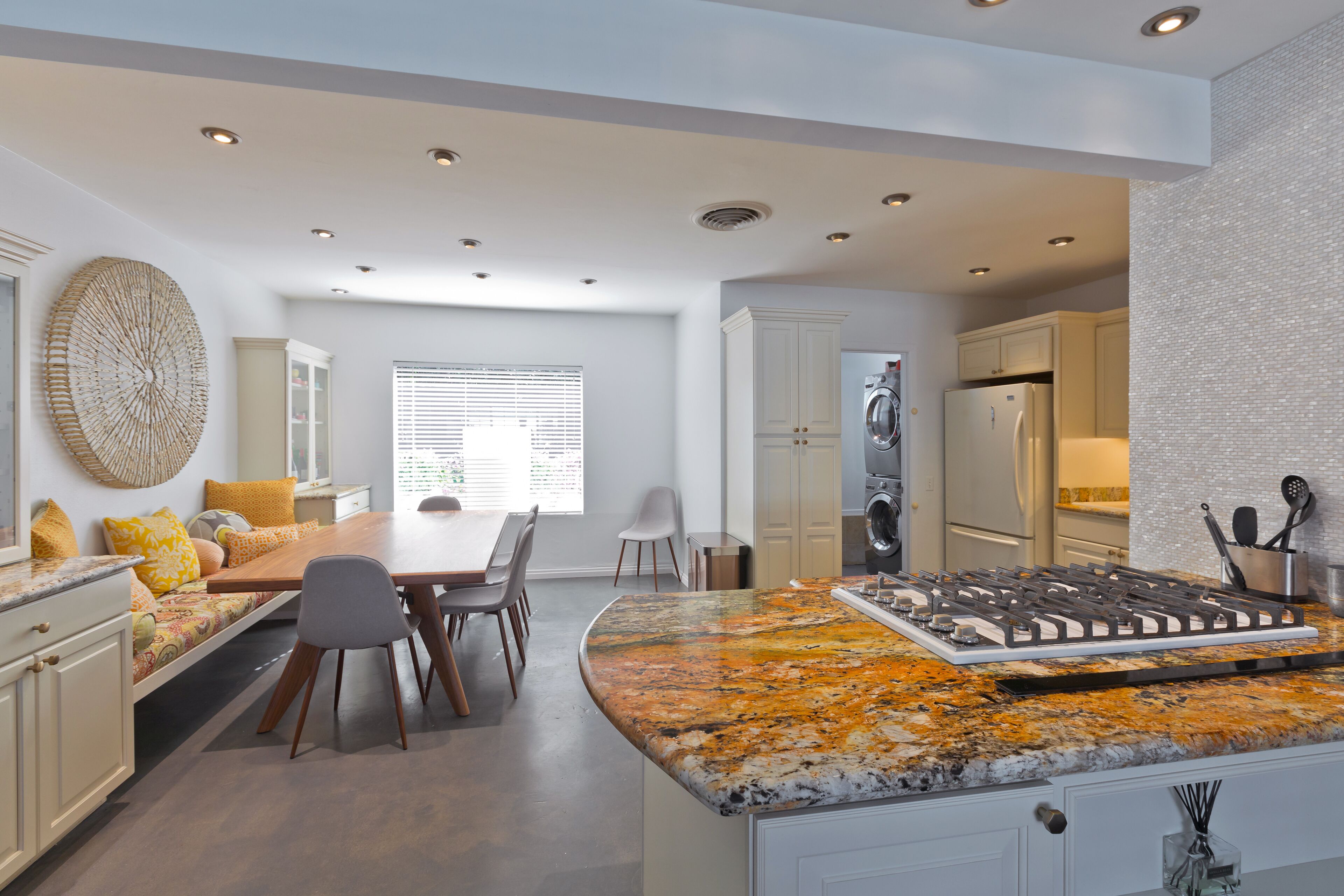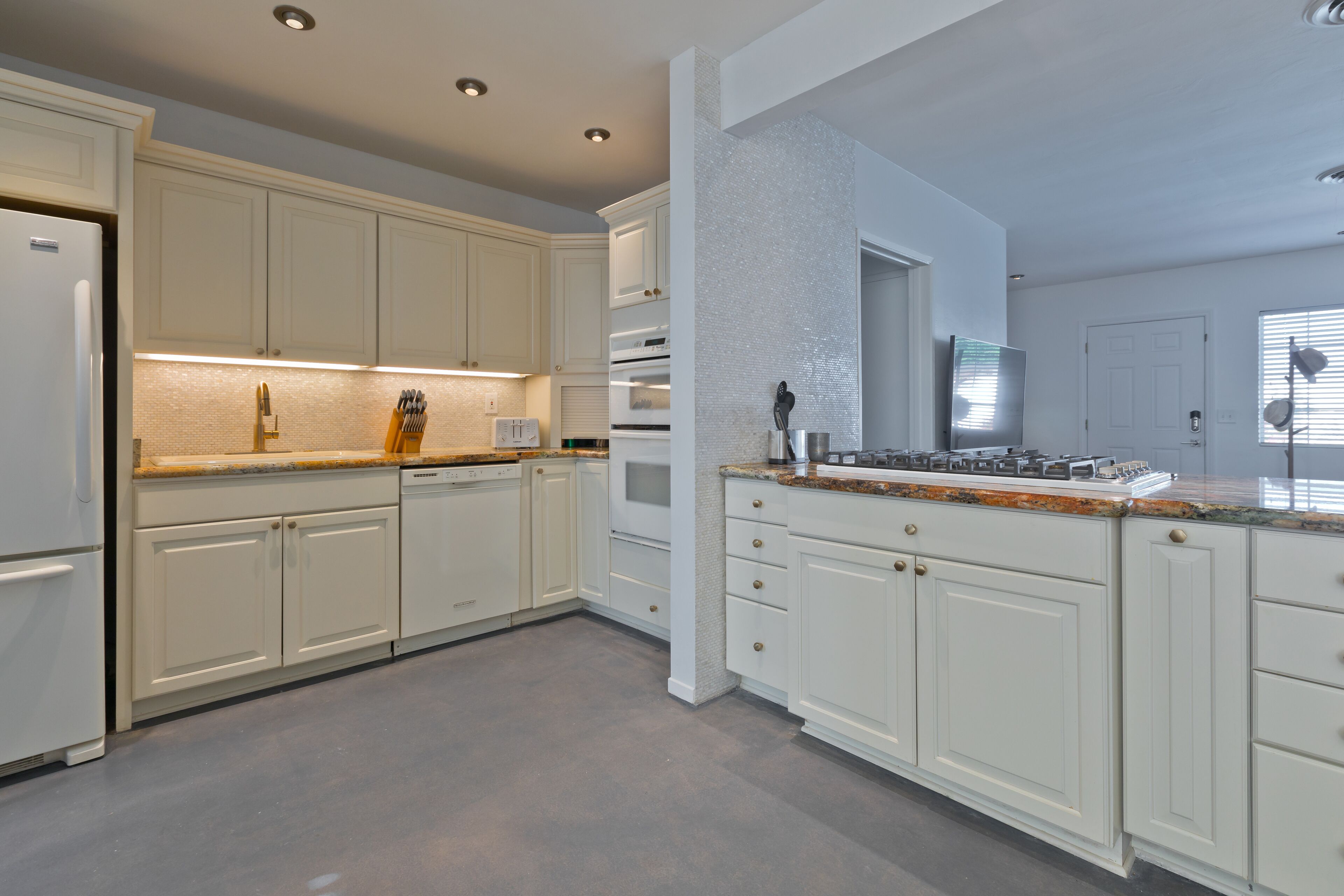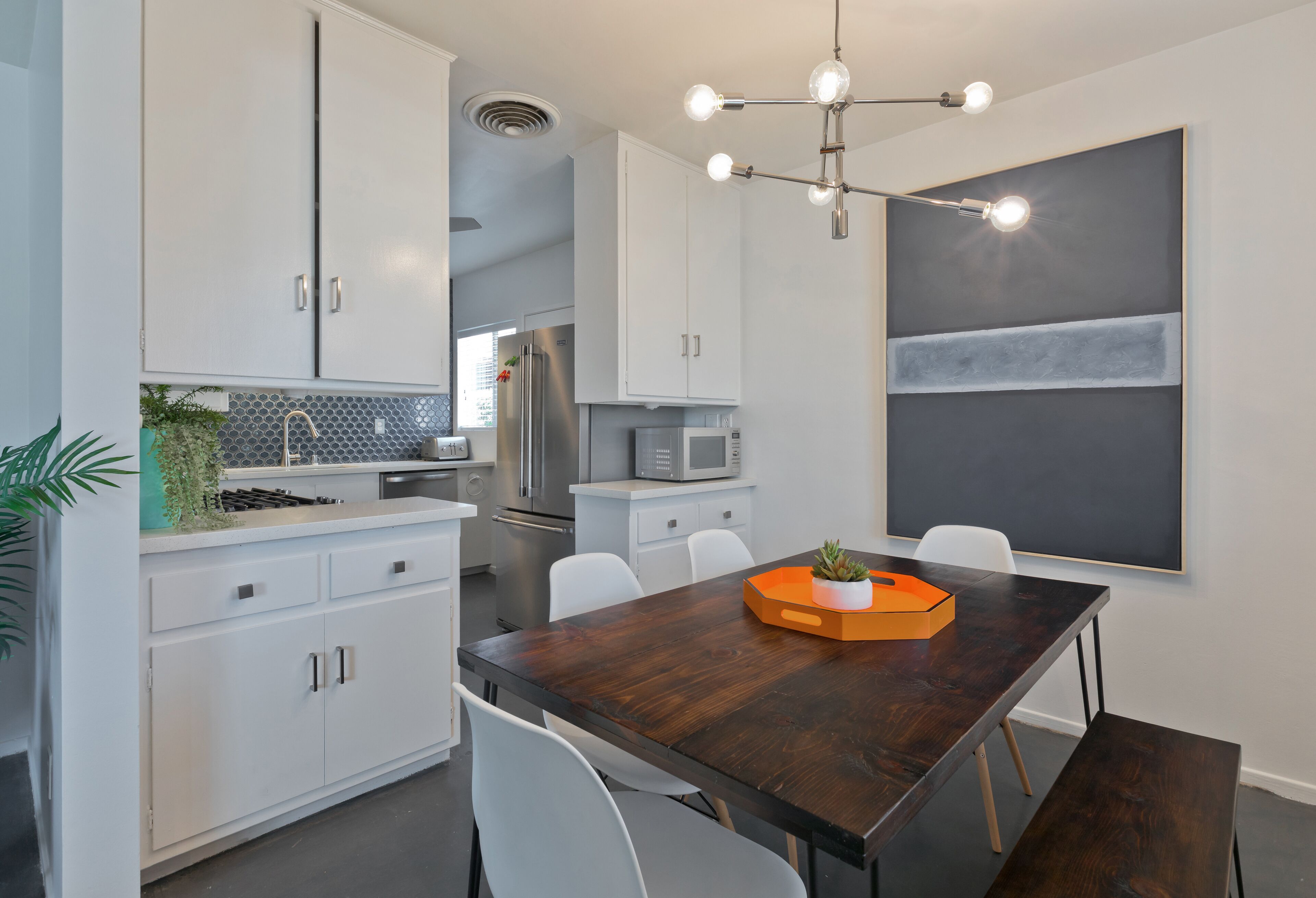 Luxury Private Resort - 1 Block to El Paseo! Sleeps 12! Love boutique hotels, but hate what happens once they're discovered? Here's the ideal hideaway for you. Designed for large group stays, we have three completely new, bungalow style units (6 bedrooms/6 baths) that offer a fun, Cali boho style. Three separate casitas within the walled grounds feature a large pool, elegant cabanas, Bocce Ball court, Hot Tub, Large BBQ, Pool table room, and more to make your stay unforgettable. We are just ONE BLOCK from El Paseo, with tons of shopping and great restaurants at your doorstep! Each casita features it's own living room, dining room, kitchen, bathrooms and bedrooms and you'll have the entire resort to yourselves! Each rental includes the use of the entire resort + house bikes so that you can ride around Palm Desert in style! Each casita is appointed with high end luxury items, including west elm furnishings, Tahari bedding, Restoration Hardware sheets, Casper & Tempurpedic mattresses, robes in each bathroom, pool towels, high end appliances, unique one-of-a-kind artwork, brand new bathrooms (all bathrooms were remodeled in 2018!), and so much more. The entire property was remodeled in 2018 and provides an incredible stay for a group who wants to relax in their own private resort just one block away from everything Palm Desert has to offer! Also just 15 minutes to Palm Springs! License #: BLIC2018-0457 Casita layout (7 beds total) Casita 1 - Master = 1 King Bed w/ Renovated bathroom attached, Guest Room = 1 Queen Bed w/ renovated bathroom in the hall. Full Renovated kitchen w/ Fridge, dishwasher, Silestone countertops, gas range and more with beautiful dining room & Large living room attached. Open layout throughout! Casita 2: Master - 1 Queen Bed w/ Renovated bathroom attached, Guest Room = 2 Twins w/ renovated bathroom in the hall. Full Renovated kitchen w/ Fridge, dishwasher, Silestone countertops, gas range and more with beautiful dining room and a large living room attached. Open layout throughout! Casita 3: Master - 1 Queen Bed w/ Renovated bathroom attached, Guest Room = 1 King Bed w/ renovated bathroom in the hall. Full Renovated kitchen w/ Fridge, dishwasher, Silestone countertops, gas range and more with beautiful dining room and a large living room attached. Open layout throughout! Game Room complete with bar, big screen TV and pool table!. Full Renovated kitchen w/ Fridge, gas range and more.