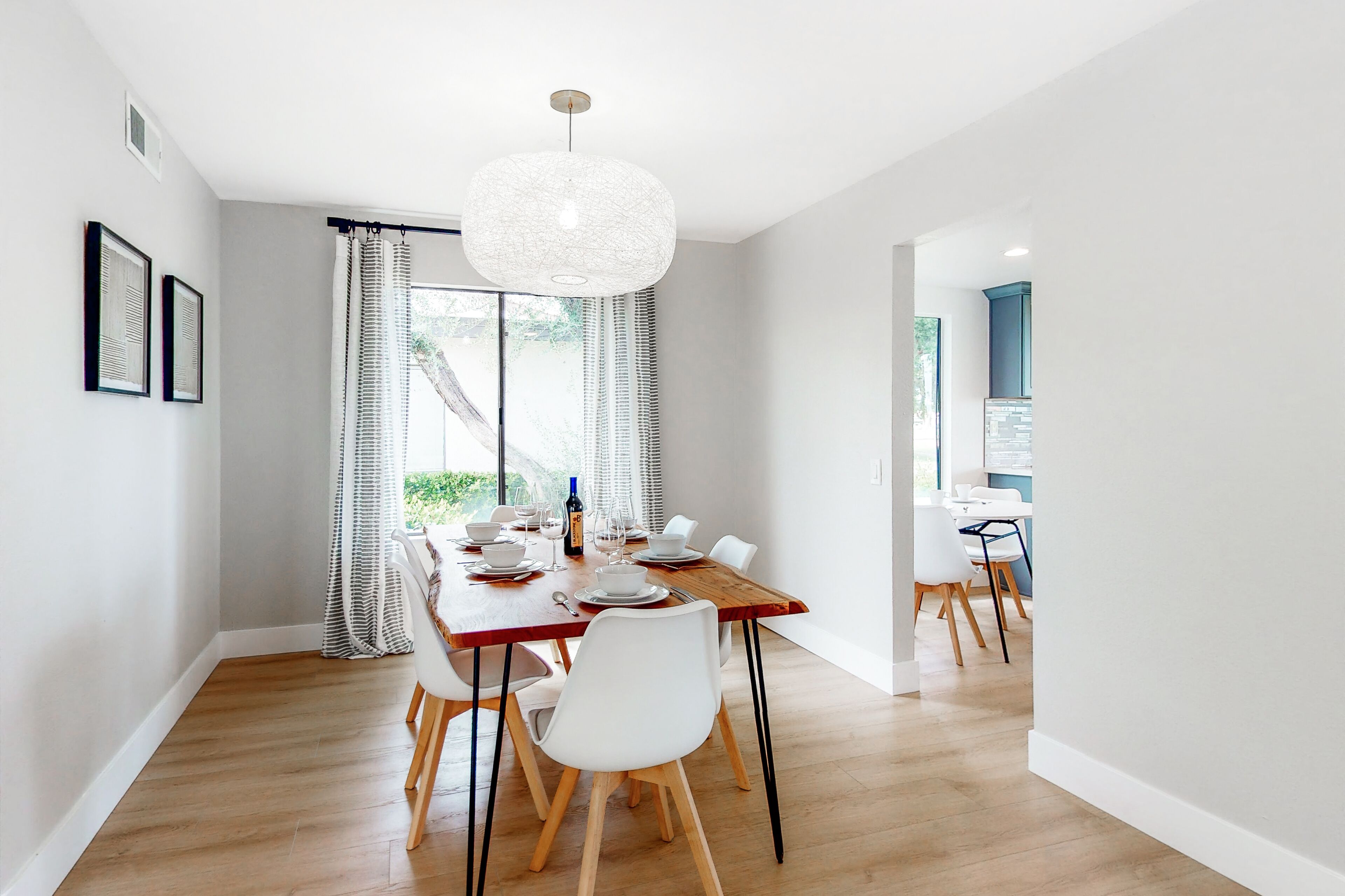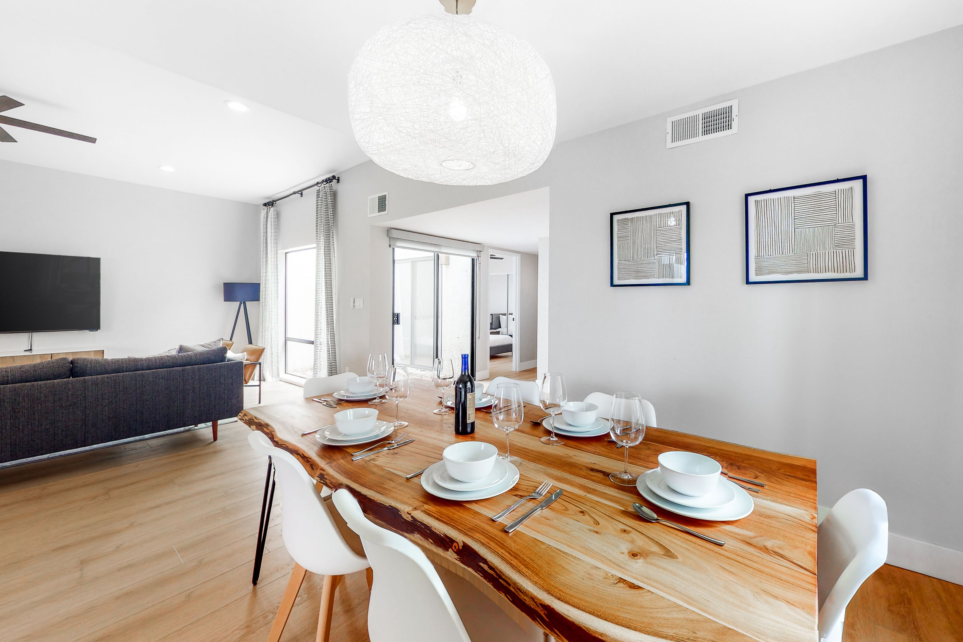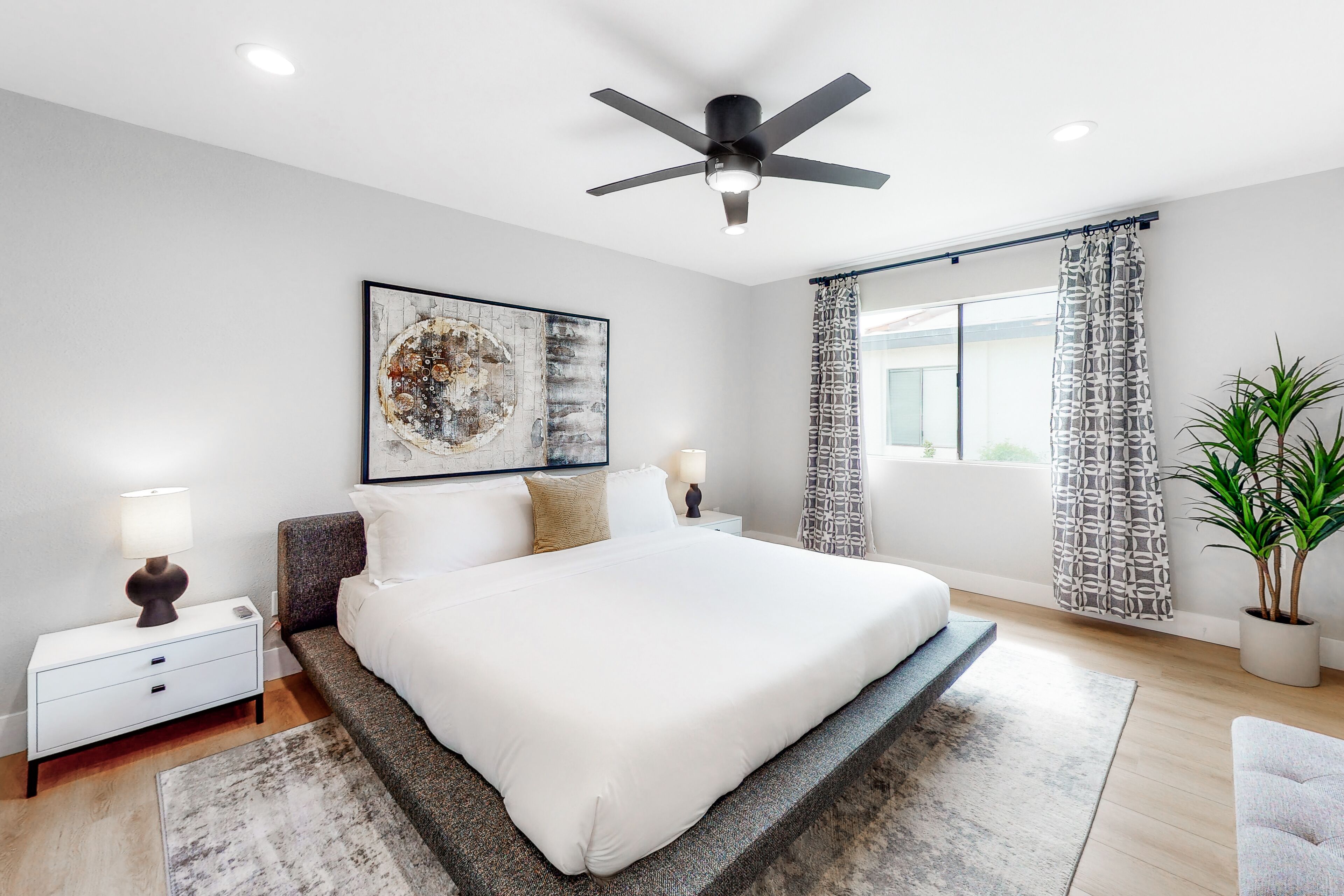 Golf Course Front Home with Shared Pool, Fast WiFi, Central AC, and Washer/Dryer Modern Desert RetreatOur calendar is updated in real-time & our nightly rates are accurately displayed. Simply enter your desired dates and click 'Book Now!'Enjoy peaceful views and modern luxury at this midcentury-inspired home right on the edge of Rancho Las Palmas Golf Course. Clean lines and comfortable spots to relax make this home a fabulous retreat after a day of golf or exploration. All ground floor, no one will have to struggle with stairs in order to wind down here. Let a fire blaze in the gas fireplace for warmth or ambiance. The full kitchen, tastefully decorated in a slate grey color, features full-sized appliances and cooking tools to help you put together delicious vacation meals. Central air conditioning will help everyone stay comfortable inside. Guests of the main bedroom can enjoy access to an en suite bathroom, but each bedroom features a ceiling fan for extra sleeping comfort. In addition to everything at this home, guests can also enjoy access to a shared outdoor pool during their stay. Of course, the crisp desert air always comes free.Things to KnowFree high-speed WiFi and cableFull kitchen with a dishwasherGated entranceGuests must travel by car to reach this condoNetflix streaming is available with guest accounts*There is a doorbell surveillance camera at the front doorParking notes: There is free parking available for 2 vehicles.Security camera details: There is a doorbell camera at the front door.Damage waiver: The total cost of your reservation for this Property includes a nightly damage waiver fee, plus tax if applicable (the “Damage Waiver”). (A discount may be applied for stays of 28 nights or longer, if permitted.) The Damage Waiver covers you for up to $3,000 of accidental damage to the Property or its contents (such as furniture, fixtures, and appliances) as long as you report the incident to the host prior to checking out. The Damage Waiver fee eliminates the need for a traditional security deposit.More information can be downloaded from the "Rental Agreement" on the checkout page.Due to local laws or HOA requirements, guests must be at least 30 years of age to book. Guests under 30 must be accompanied by a parent or legal guardian for the duration of the reservation.