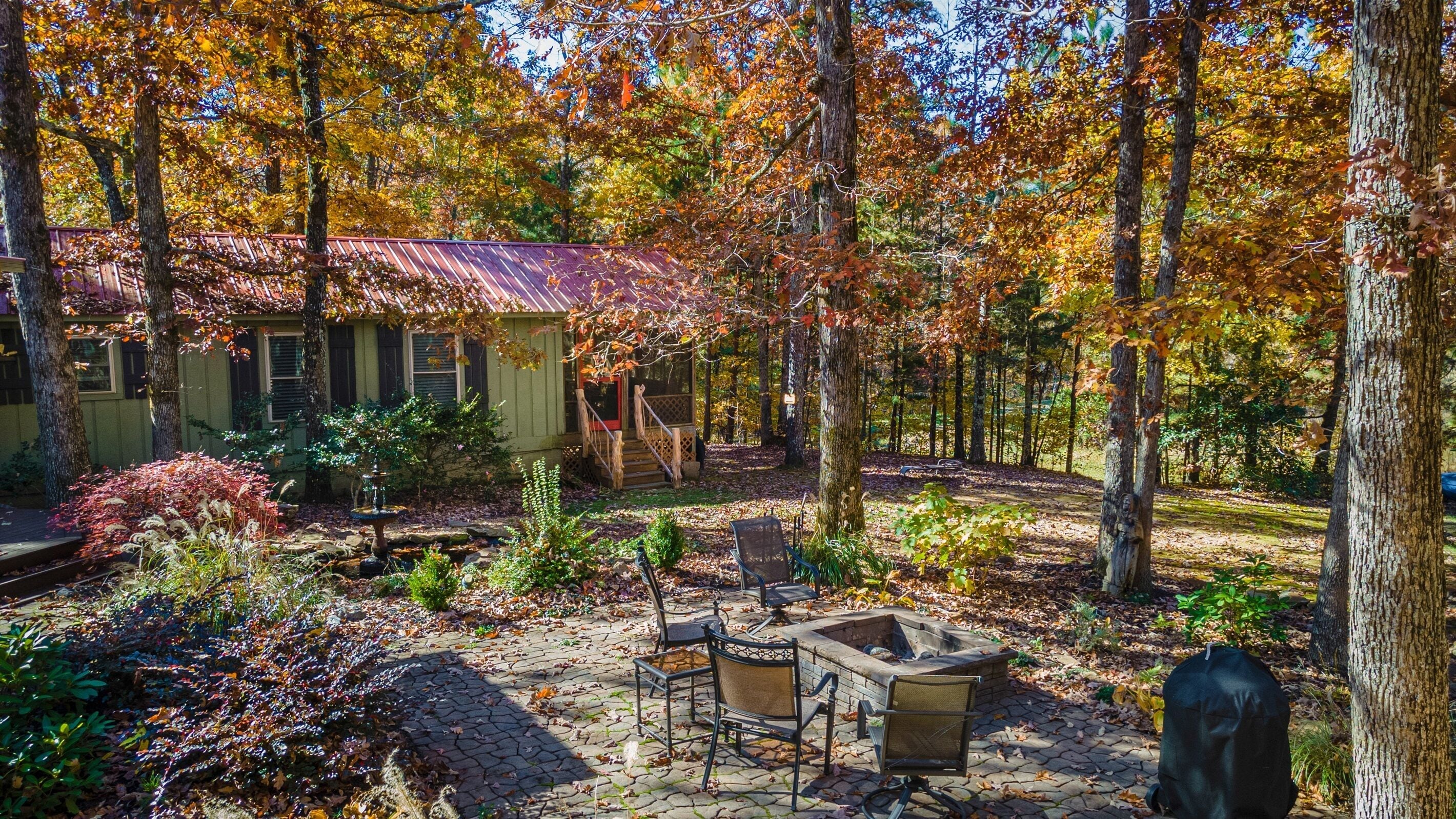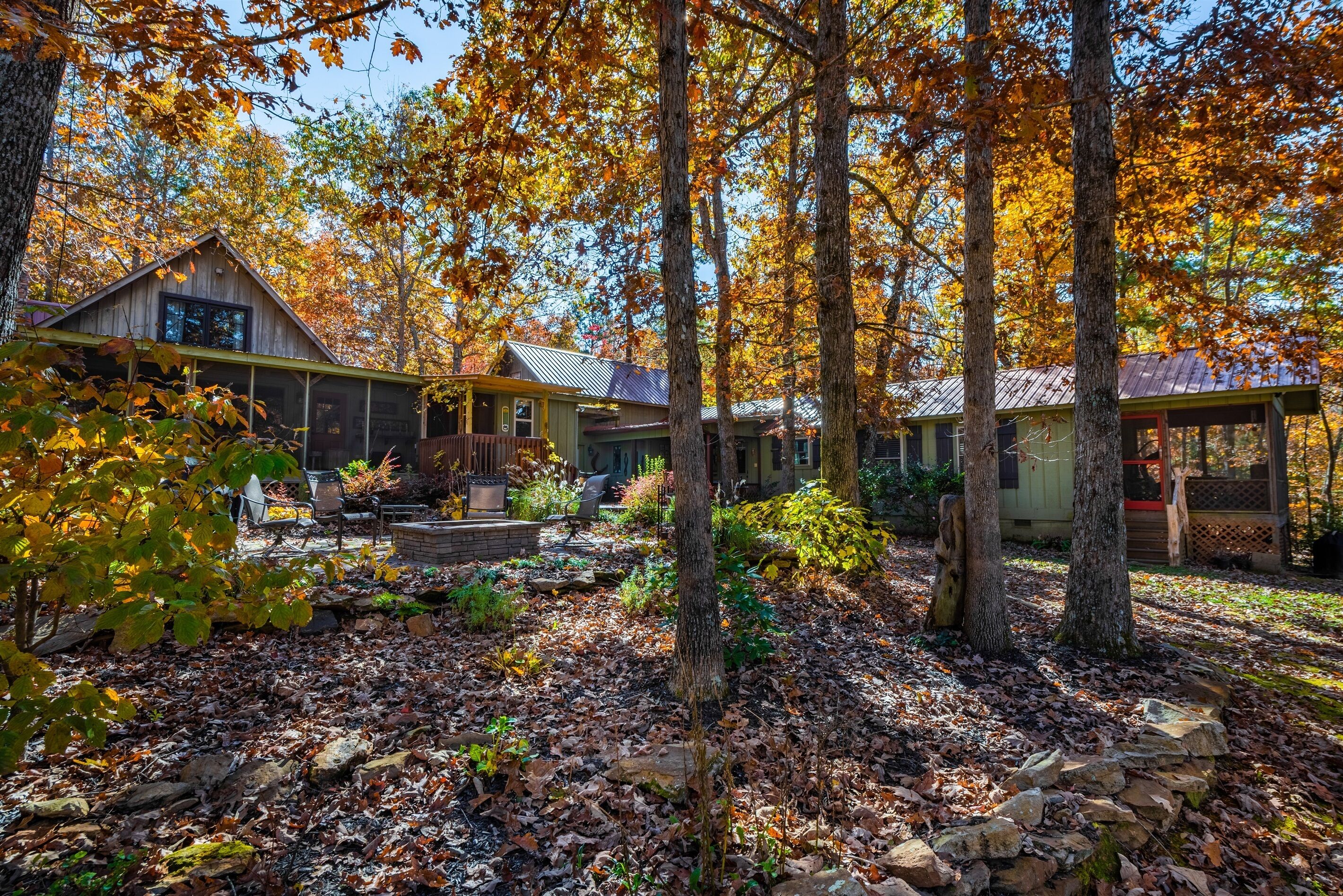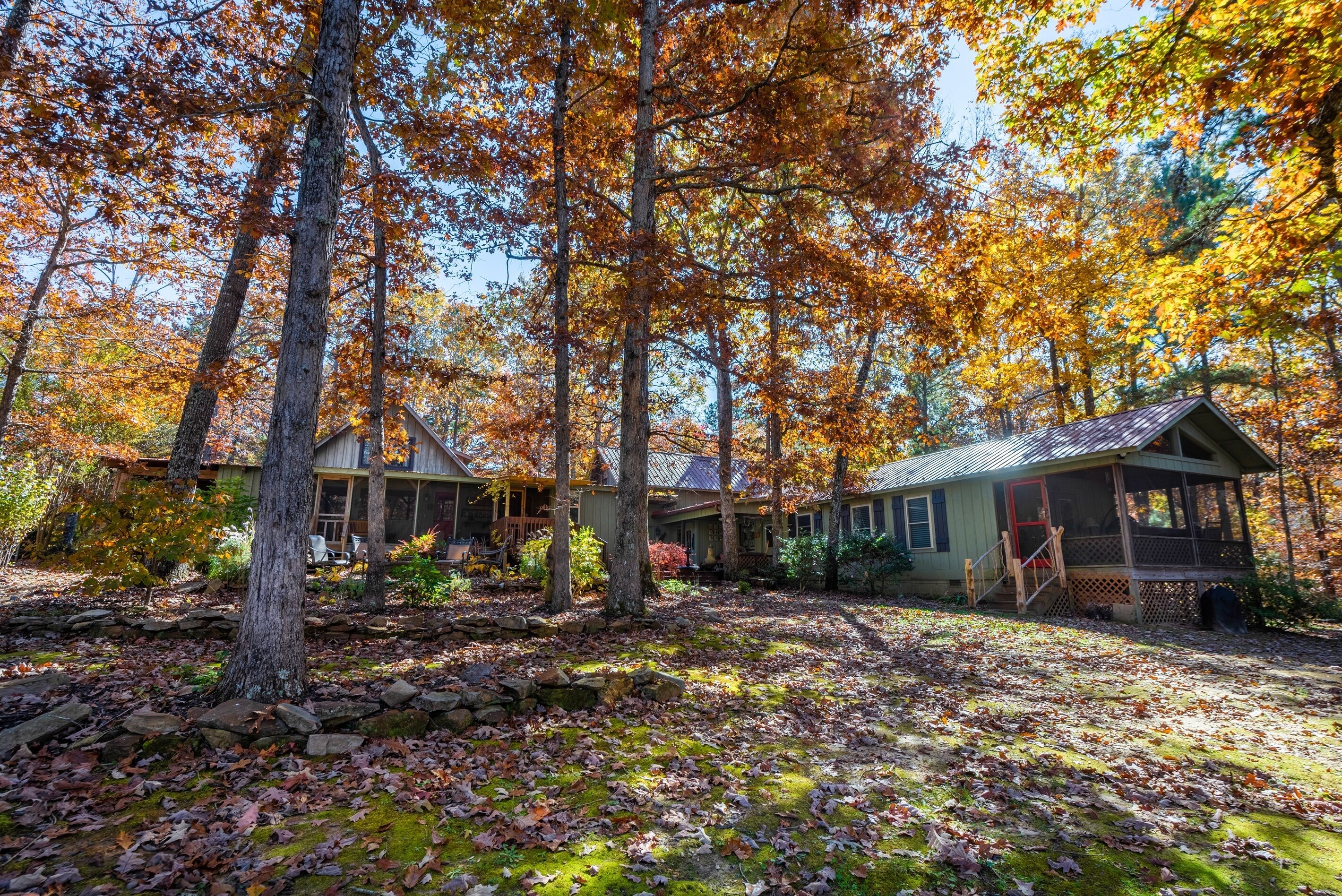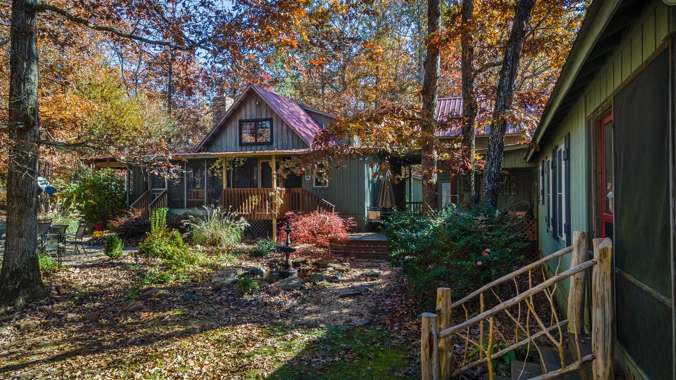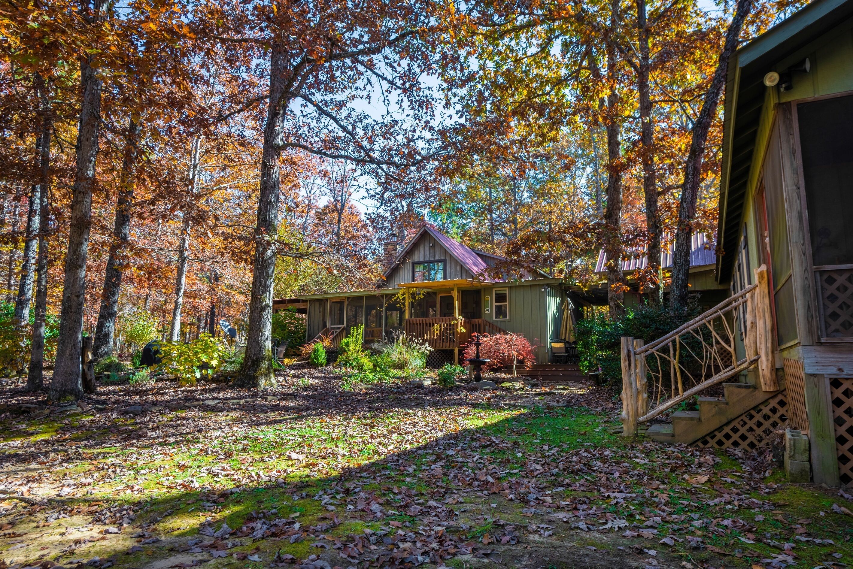 Eagles + Owl's-TWO cabins on the lake-sleeps 16 Lakefront Living at it's best! Bring the whole family & make the memories you'll cherish forever. Eagle's Rest & Owl's Perch sit side by side overlooking Eagle Lake. These cabins can accommodate up to 16 quests with a combination of 5 bedrooms, 4 ½ baths, 2 full kitchens, 2 livings rooms, a pool table & air hockey table! Outdoors you'll find two fire pits, two charcoal grills, paddleboat, paddle board, your own dock on the lake, & plenty of room for fun! These cabins are also pet friendly! This property contains TWO cabins, side by side on Eagle Lake.A large front porch welcomes you to Eagle's Rest overlooking beautiful Eagle Lake. Upon entering this gorgeous custom cabin, you'll find the comfy living room with wood floors and a stone, woodburning fireplace, dining area, and fully equipped kitchen with stainless steel appliances. Whimsical details can be found throughout this unique cabin including door handles carved by a local artist and interesting art throughout. There is also a game room stocked with plenty of games, puzzles and toys and an air hockey table. The quiet and inviting king-sized en suite master bedroom is on the main level. A powder room and a laundry room with a full-size washer and dryer finishes out the main level. Upstairs you'll find another full-size bath as well as a loft style bedroom with queen size bed plus two twin size beds. Enjoy views of Eagle Lake while relaxing on the screened porch, accessible from both the living room and the master bedroom. The outdoor space features a large yard, lots of sitting and outdoor dining areas, a charcoal grill and an antique forged iron fountain on the patio. Bring your fishing gear to fish off the dock or cruise around the lake on our paddleboat/paddle board or your own kayak or canoe. Please bring your own lifejackets. Owl's Perch is nestled beside the neighboring cabin and overlooks gorgeous Eagle Lake. The cabin has that wonderful rustic Mentone feel while offering all the creature comforts of home. A brand new fully equipped kitchen with stainless steel appliances and an outdoor charcoal grill will have you prepping meals for the fam to enjoy either at the indoor dining table or at the lakeside picnic table. A cozy living room with flat screen tv, leads you out onto the screened porch overlooking Eagle Lake. There are two bedrooms downstairs: one private with a queen bed and TV; the other with twin bed and another twin sized custom-built top bunk. A full-sized bath with clawfoot tub and shower is also on the main level in addition to a laundry room with full size washer and dryer. On your way upstairs, stop off in the game room with full size pool table, games, puzzles, toys for the kids and a reading nook as well as another full-size bath. Upstairs loft bedroom offers lots of space with a queen bed + full bed, a custom dollhouse and a cozy seating area. There's plenty of space to play outdoors in the large lakefront yard. Enjoy smores around the private (second) fire pit tucked behind the cabin near the woods. We have lots of outdoor seating for you to enjoy your morning coffee or an evening cocktail on the screened-in porch overlooking the lake or relaxing on the spacious deck by the antique fountain. These cabins are completely separate with separate entrances and screened porches but they are joined by a deck. Located approximately 5-10 minutes from downtown Mentone, 10 minutes to Desoto State Park, 30 minutes to Cloudland State Park.