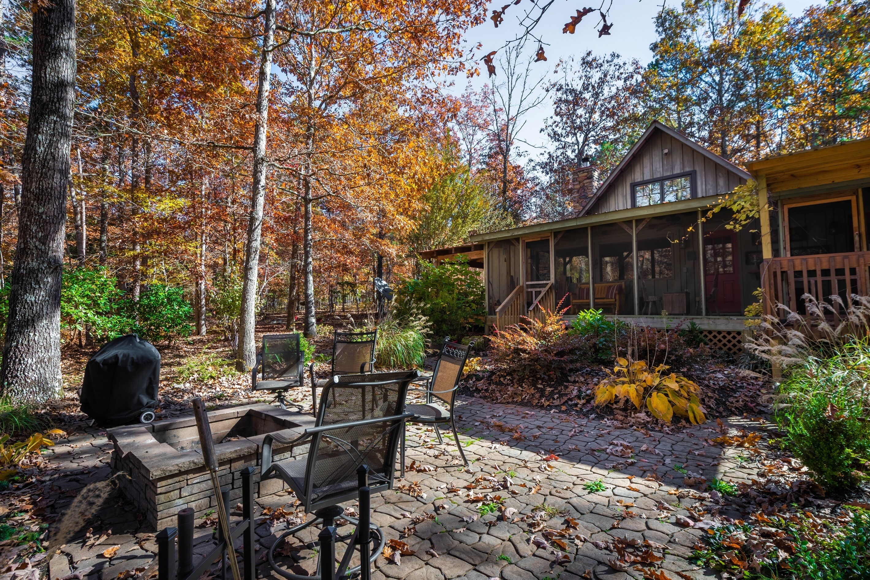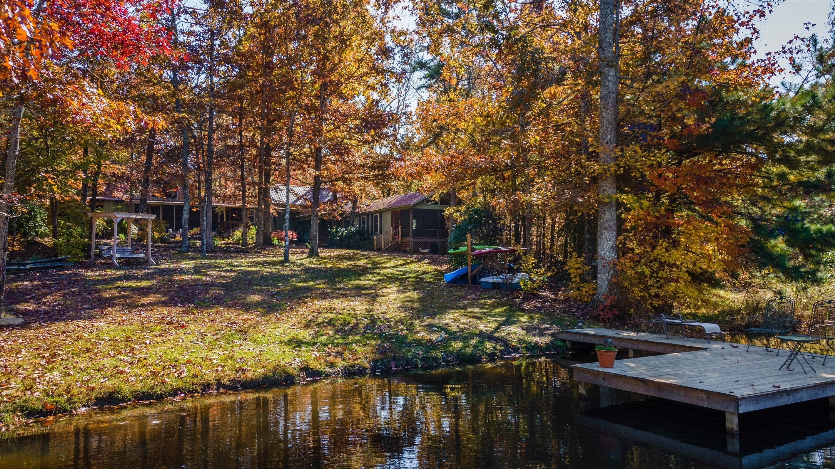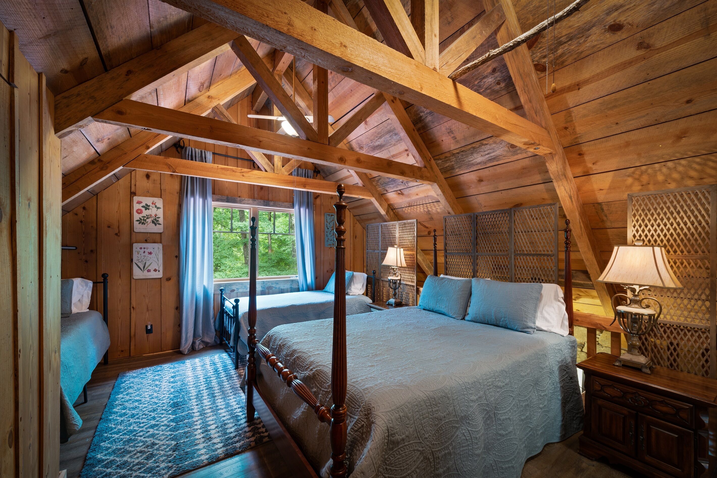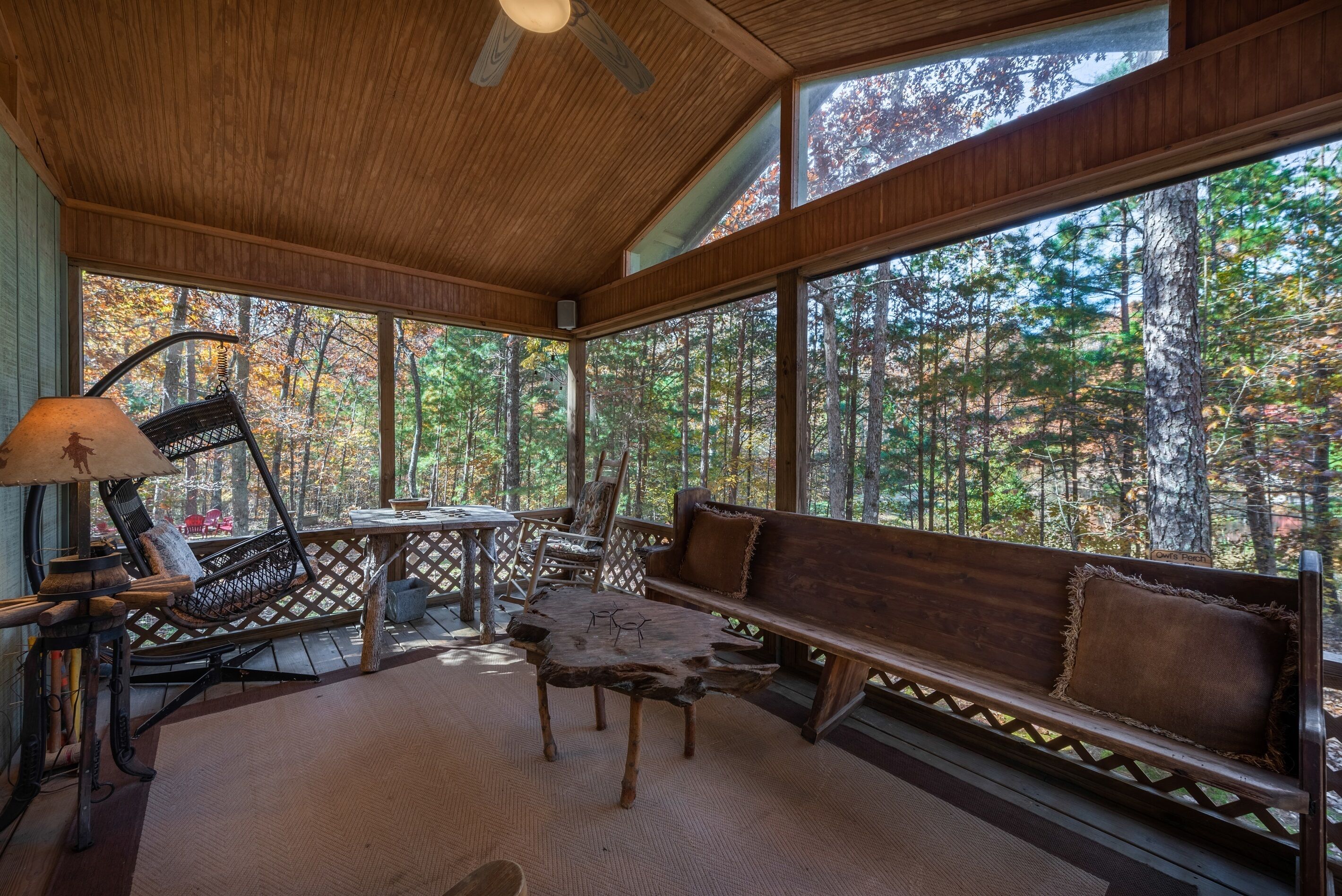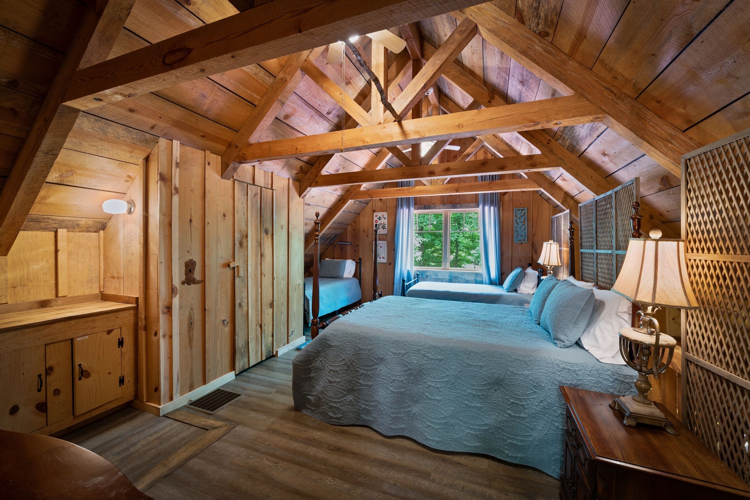 Eagles + Owl's-TWO cabins on the lake-sleeps 16 Lakefront Living at it's best! Bring the whole family & make the memories you'll cherish forever. Eagle's Rest & Owl's Perch sit side by side overlooking Eagle Lake. These cabins can accommodate up to 16 quests with a combination of 5 bedrooms, 4 ½ baths, 2 full kitchens, 2 livings rooms, a pool table & air hockey table! Outdoors you'll find two fire pits, two charcoal grills, paddleboat, paddle board, your own dock on the lake, & plenty of room for fun! These cabins are also pet friendly! This property contains TWO cabins, side by side on Eagle Lake.A large front porch welcomes you to Eagle's Rest overlooking beautiful Eagle Lake. Upon entering this gorgeous custom cabin, you'll find the comfy living room with wood floors and a stone, woodburning fireplace, dining area, and fully equipped kitchen with stainless steel appliances. Whimsical details can be found throughout this unique cabin including door handles carved by a local artist and interesting art throughout. There is also a game room stocked with plenty of games, puzzles and toys and an air hockey table. The quiet and inviting king-sized en suite master bedroom is on the main level. A powder room and a laundry room with a full-size washer and dryer finishes out the main level. Upstairs you'll find another full-size bath as well as a loft style bedroom with queen size bed plus two twin size beds. Enjoy views of Eagle Lake while relaxing on the screened porch, accessible from both the living room and the master bedroom. The outdoor space features a large yard, lots of sitting and outdoor dining areas, a charcoal grill and an antique forged iron fountain on the patio. Bring your fishing gear to fish off the dock or cruise around the lake on our paddleboat/paddle board or your own kayak or canoe. Please bring your own lifejackets. Owl's Perch is nestled beside the neighboring cabin and overlooks gorgeous Eagle Lake. The cabin has that wonderful rustic Mentone feel while offering all the creature comforts of home. A brand new fully equipped kitchen with stainless steel appliances and an outdoor charcoal grill will have you prepping meals for the fam to enjoy either at the indoor dining table or at the lakeside picnic table. A cozy living room with flat screen tv, leads you out onto the screened porch overlooking Eagle Lake. There are two bedrooms downstairs: one private with a queen bed and TV; the other with twin bed and another twin sized custom-built top bunk. A full-sized bath with clawfoot tub and shower is also on the main level in addition to a laundry room with full size washer and dryer. On your way upstairs, stop off in the game room with full size pool table, games, puzzles, toys for the kids and a reading nook as well as another full-size bath. Upstairs loft bedroom offers lots of space with a queen bed + full bed, a custom dollhouse and a cozy seating area. There's plenty of space to play outdoors in the large lakefront yard. Enjoy smores around the private (second) fire pit tucked behind the cabin near the woods. We have lots of outdoor seating for you to enjoy your morning coffee or an evening cocktail on the screened-in porch overlooking the lake or relaxing on the spacious deck by the antique fountain. These cabins are completely separate with separate entrances and screened porches but they are joined by a deck. Located approximately 5-10 minutes from downtown Mentone, 10 minutes to Desoto State Park, 30 minutes to Cloudland State Park.