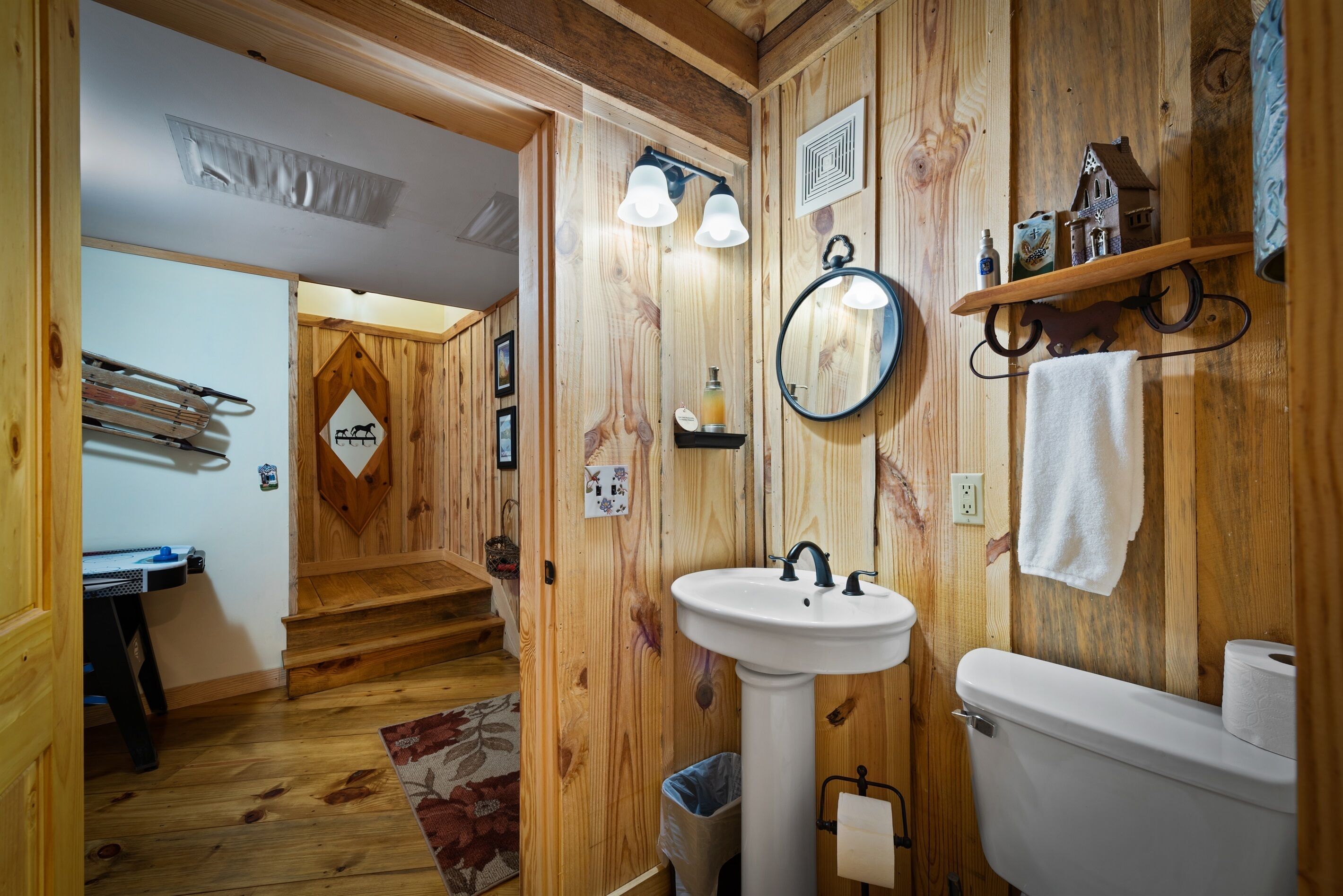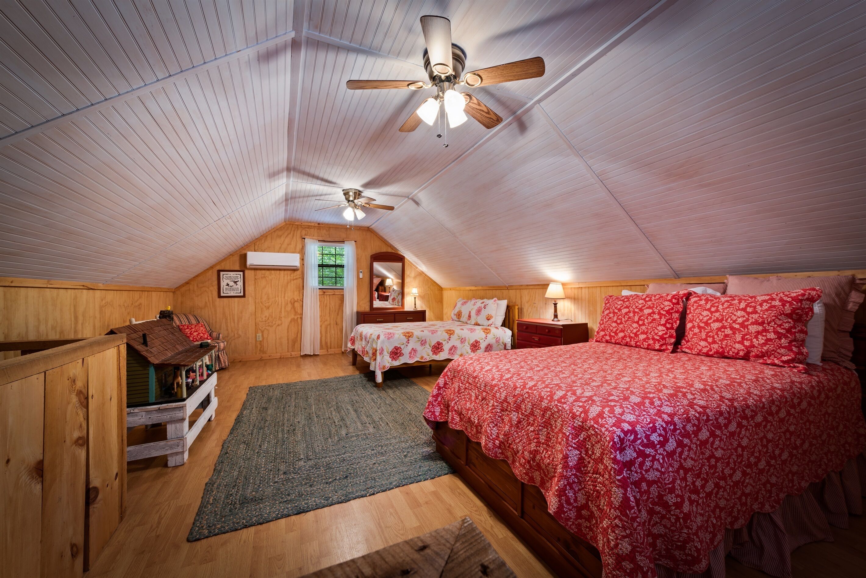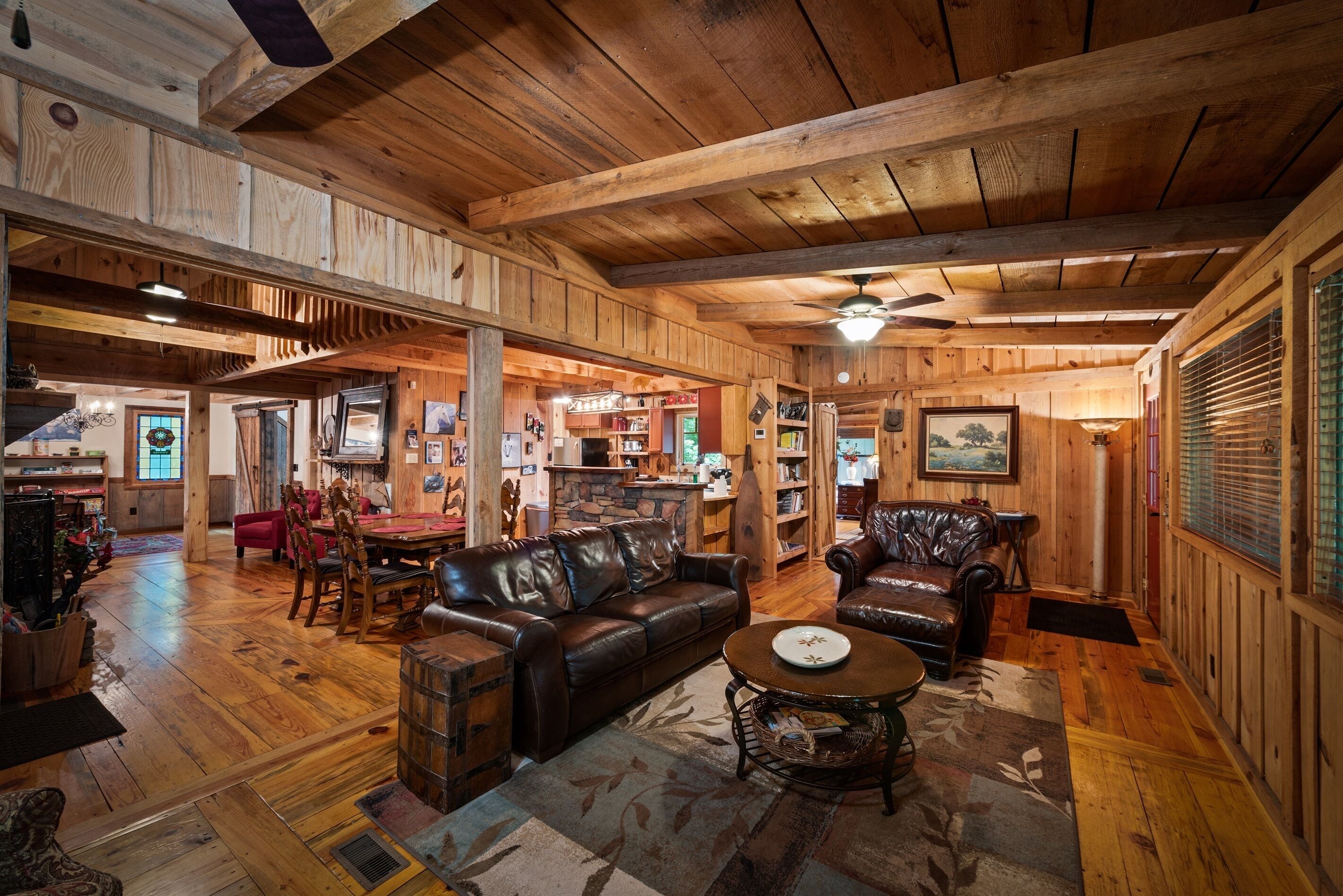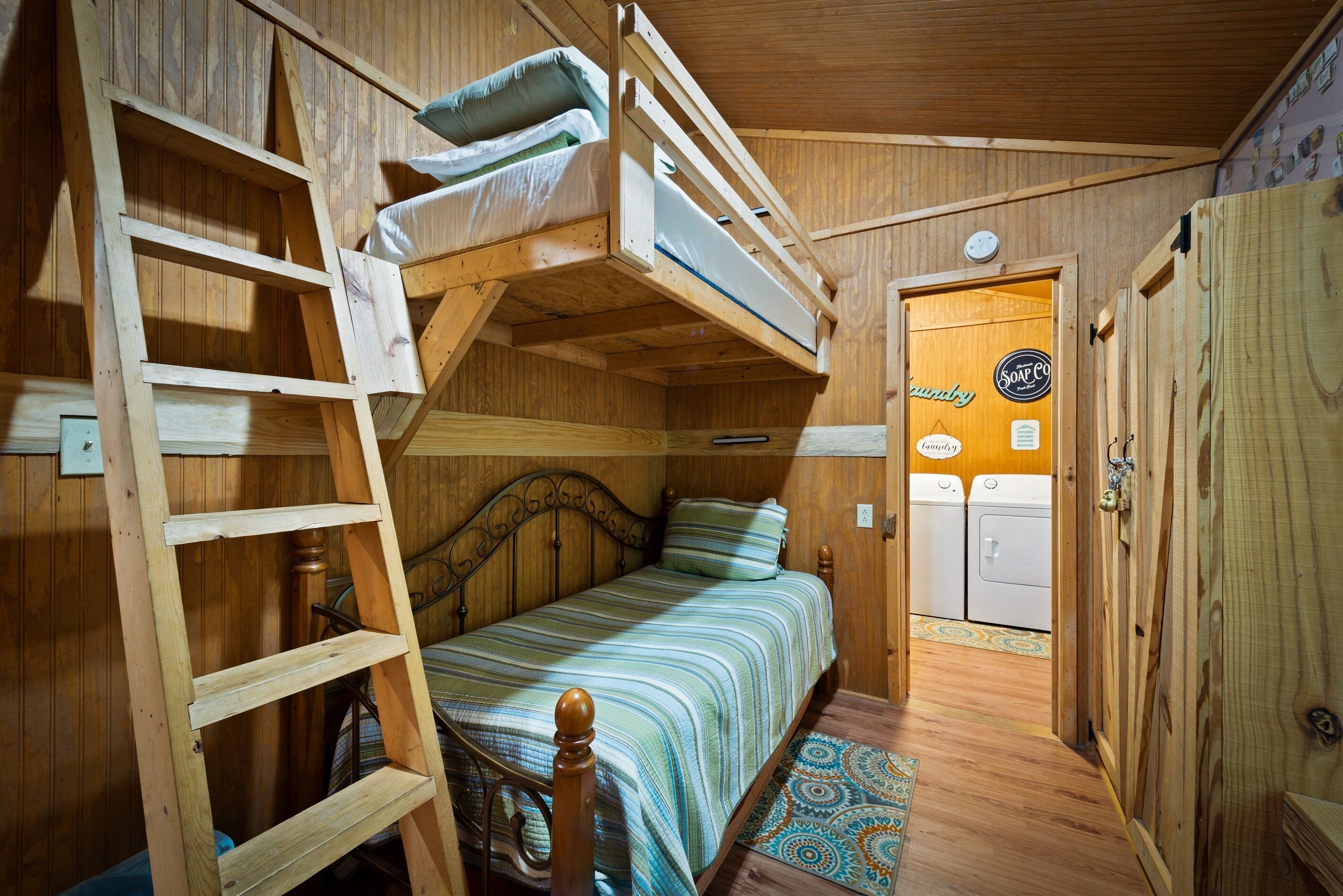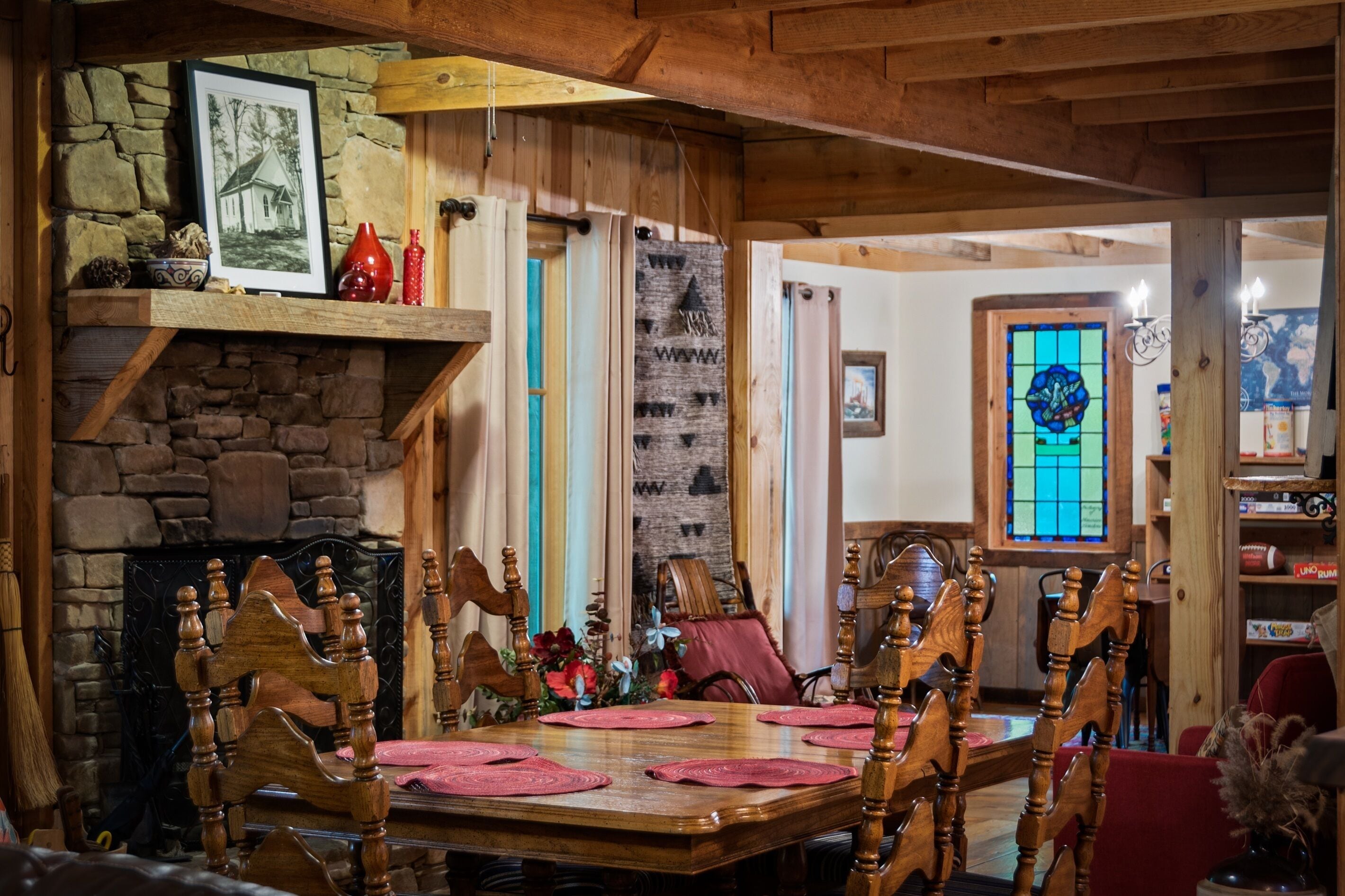 Eagles + Owl's-TWO cabins on the lake-sleeps 16 Lakefront Living at it's best! Bring the whole family & make the memories you'll cherish forever. Eagle's Rest & Owl's Perch sit side by side overlooking Eagle Lake. These cabins can accommodate up to 16 quests with a combination of 5 bedrooms, 4 ½ baths, 2 full kitchens, 2 livings rooms, a pool table & air hockey table! Outdoors you'll find two fire pits, two charcoal grills, paddleboat, paddle board, your own dock on the lake, & plenty of room for fun! These cabins are also pet friendly! This property contains TWO cabins, side by side on Eagle Lake.A large front porch welcomes you to Eagle's Rest overlooking beautiful Eagle Lake. Upon entering this gorgeous custom cabin, you'll find the comfy living room with wood floors and a stone, woodburning fireplace, dining area, and fully equipped kitchen with stainless steel appliances. Whimsical details can be found throughout this unique cabin including door handles carved by a local artist and interesting art throughout. There is also a game room stocked with plenty of games, puzzles and toys and an air hockey table. The quiet and inviting king-sized en suite master bedroom is on the main level. A powder room and a laundry room with a full-size washer and dryer finishes out the main level. Upstairs you'll find another full-size bath as well as a loft style bedroom with queen size bed plus two twin size beds. Enjoy views of Eagle Lake while relaxing on the screened porch, accessible from both the living room and the master bedroom. The outdoor space features a large yard, lots of sitting and outdoor dining areas, a charcoal grill and an antique forged iron fountain on the patio. Bring your fishing gear to fish off the dock or cruise around the lake on our paddleboat/paddle board or your own kayak or canoe. Please bring your own lifejackets. Owl's Perch is nestled beside the neighboring cabin and overlooks gorgeous Eagle Lake. The cabin has that wonderful rustic Mentone feel while offering all the creature comforts of home. A brand new fully equipped kitchen with stainless steel appliances and an outdoor charcoal grill will have you prepping meals for the fam to enjoy either at the indoor dining table or at the lakeside picnic table. A cozy living room with flat screen tv, leads you out onto the screened porch overlooking Eagle Lake. There are two bedrooms downstairs: one private with a queen bed and TV; the other with twin bed and another twin sized custom-built top bunk. A full-sized bath with clawfoot tub and shower is also on the main level in addition to a laundry room with full size washer and dryer. On your way upstairs, stop off in the game room with full size pool table, games, puzzles, toys for the kids and a reading nook as well as another full-size bath. Upstairs loft bedroom offers lots of space with a queen bed + full bed, a custom dollhouse and a cozy seating area. There's plenty of space to play outdoors in the large lakefront yard. Enjoy smores around the private (second) fire pit tucked behind the cabin near the woods. We have lots of outdoor seating for you to enjoy your morning coffee or an evening cocktail on the screened-in porch overlooking the lake or relaxing on the spacious deck by the antique fountain. These cabins are completely separate with separate entrances and screened porches but they are joined by a deck. Located approximately 5-10 minutes from downtown Mentone, 10 minutes to Desoto State Park, 30 minutes to Cloudland State Park.