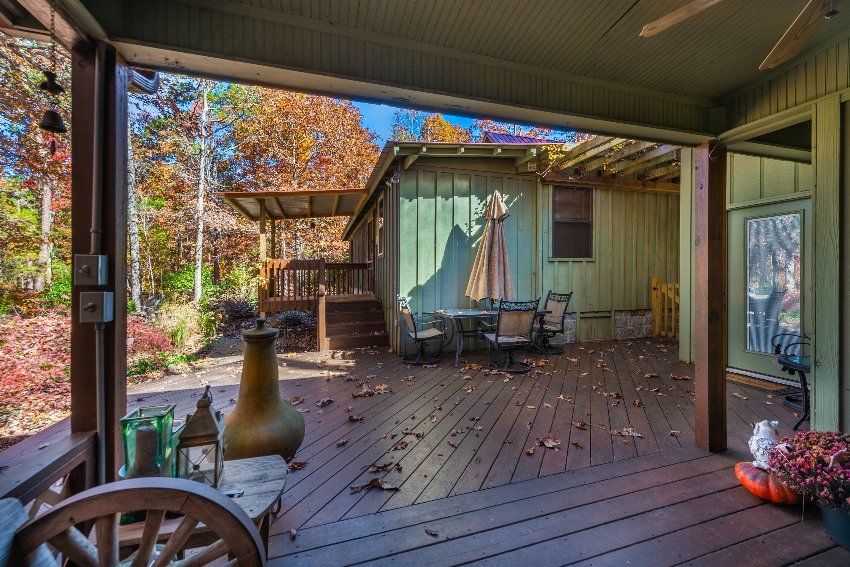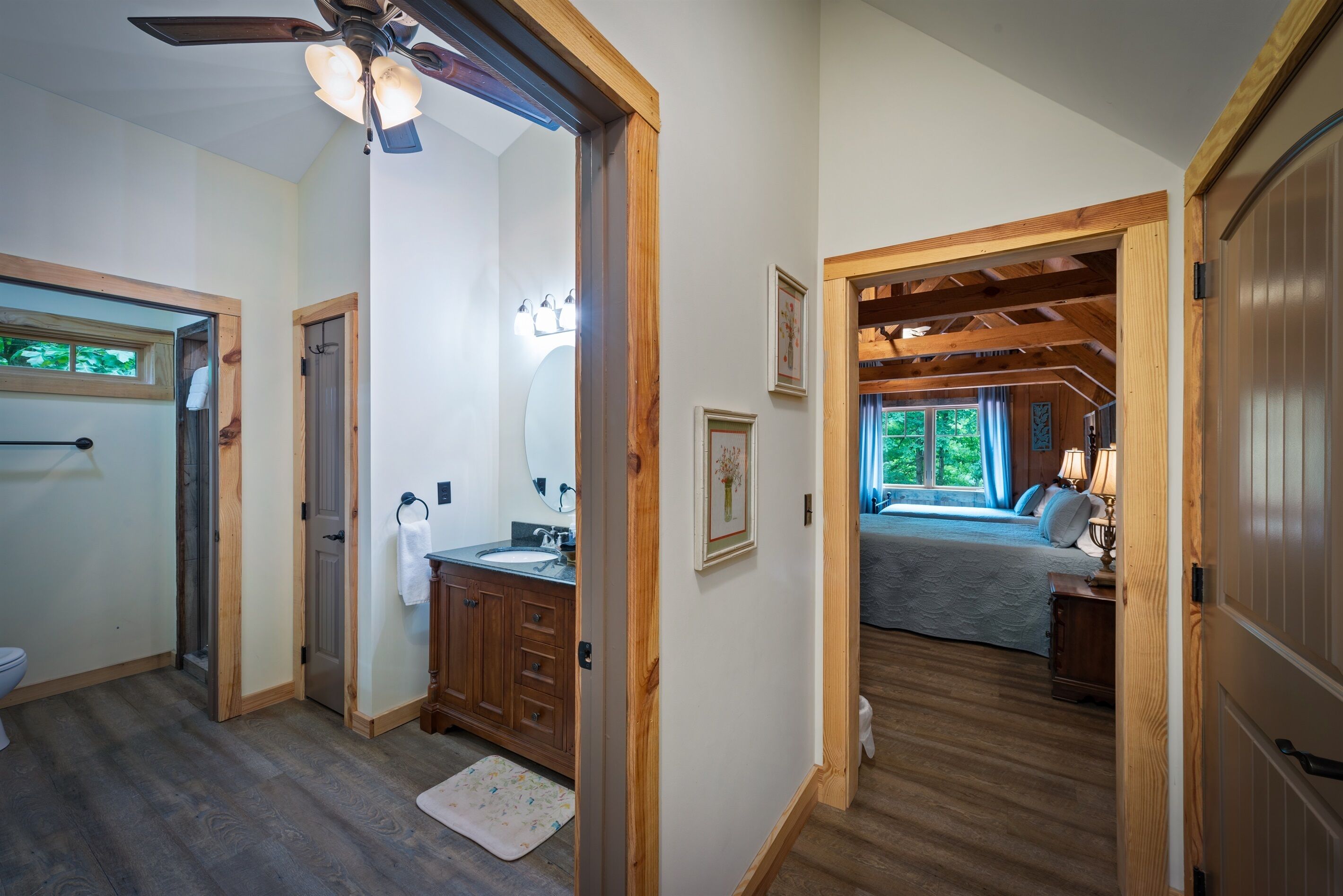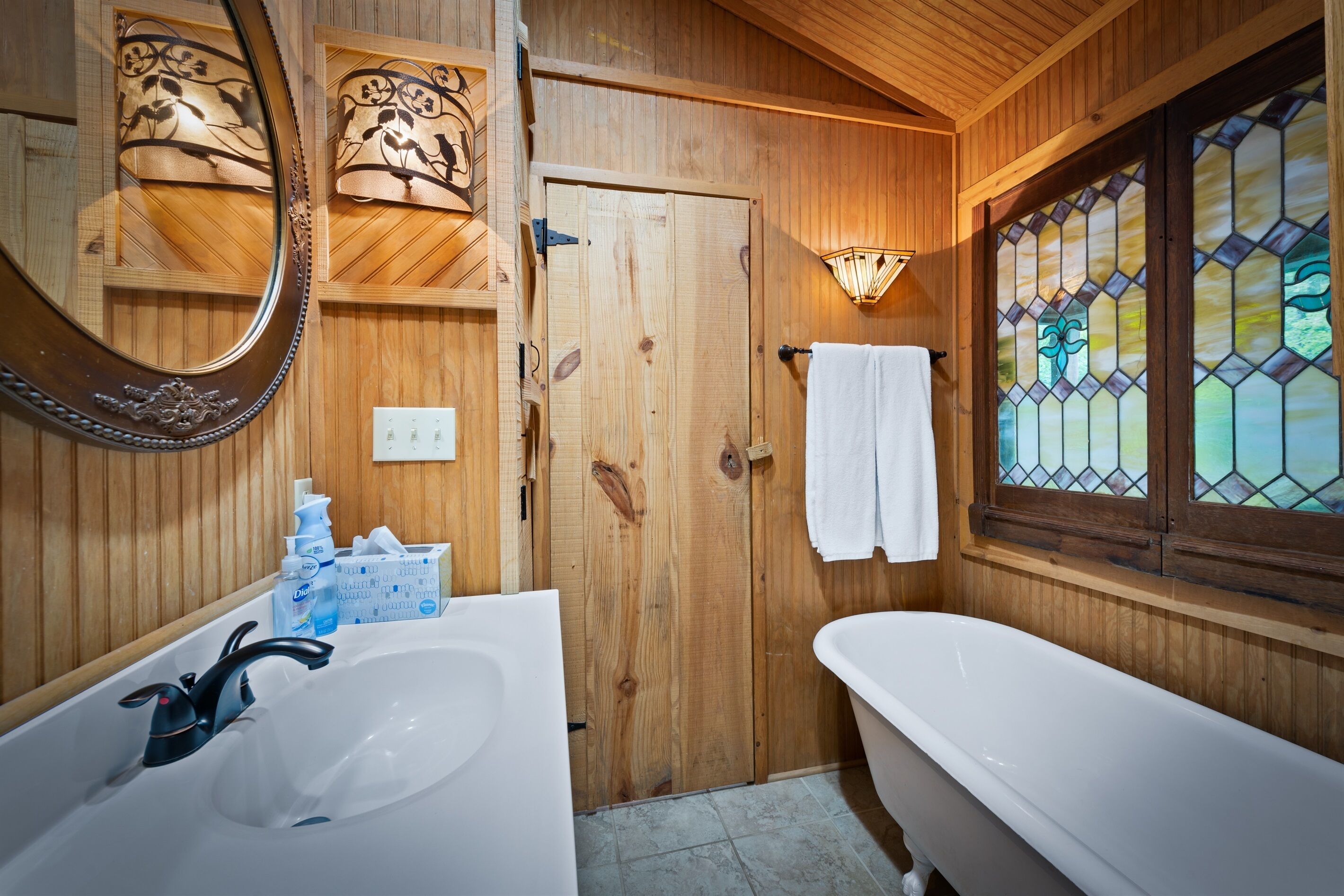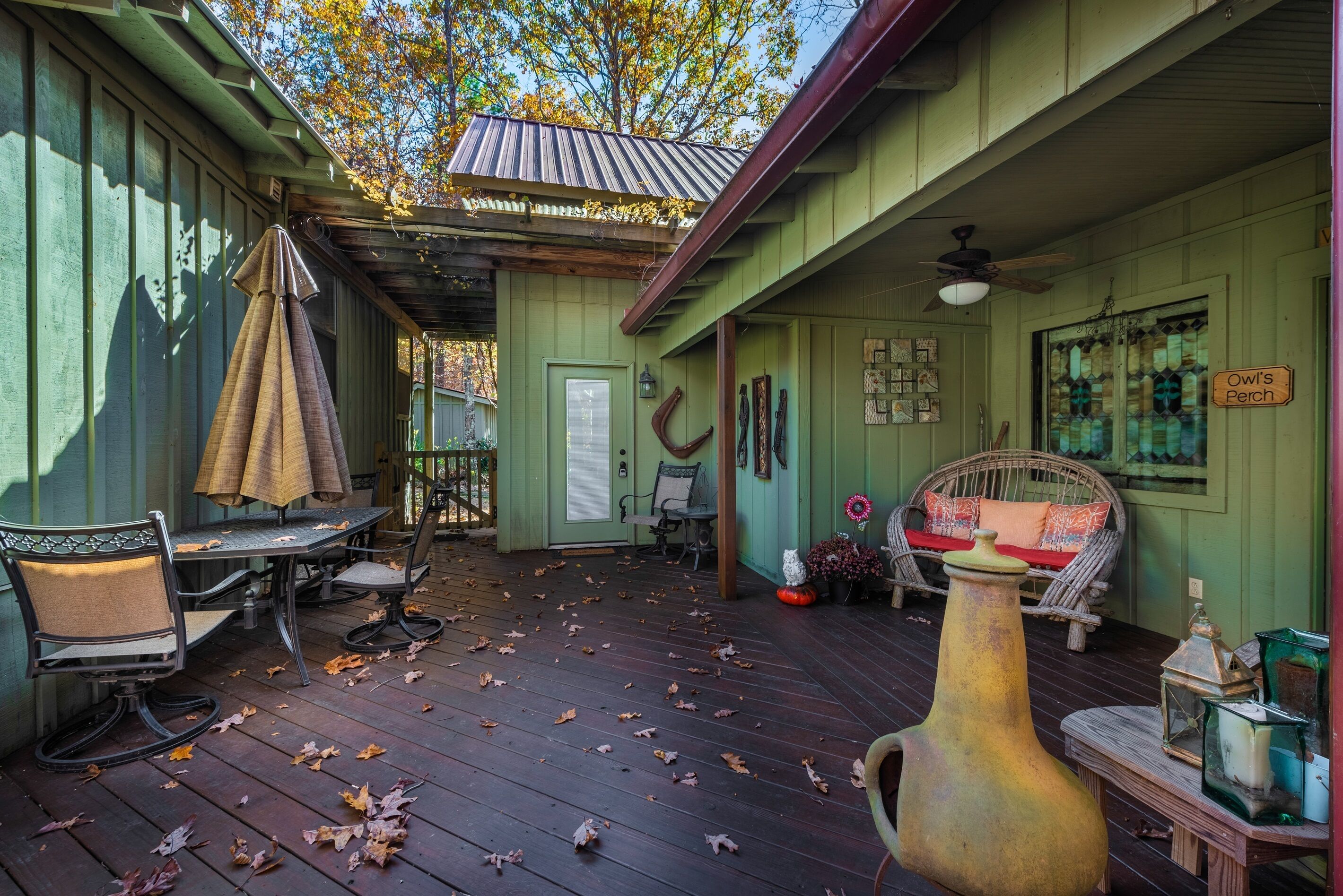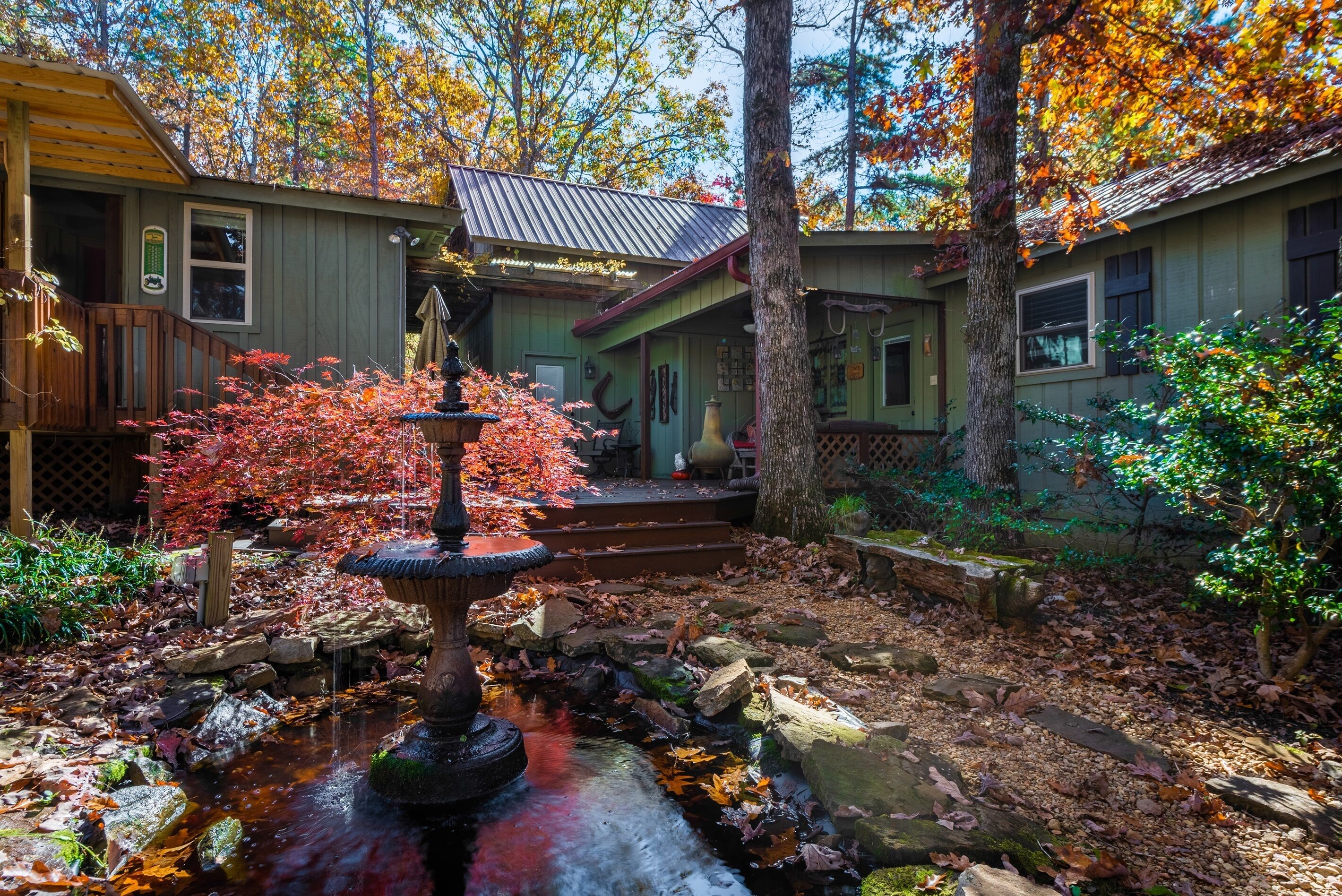Eagles + Owl's-TWO cabins on the lake-sleeps 16 Lakefront Living at it's best! Bring the whole family & make the memories you'll cherish forever. Eagle's Rest & Owl's Perch sit side by side overlooking Eagle Lake. These cabins can accommodate up to 16 quests with a combination of 5 bedrooms, 4 ½ baths, 2 full kitchens, 2 livings rooms, a pool table & air hockey table! Outdoors you'll find two fire pits, two charcoal grills, paddleboat, paddle board, your own dock on the lake, & plenty of room for fun! These cabins are also pet friendly! This property contains TWO cabins, side by side on Eagle Lake.A large front porch welcomes you to Eagle's Rest overlooking beautiful Eagle Lake. Upon entering this gorgeous custom cabin, you'll find the comfy living room with wood floors and a stone, woodburning fireplace, dining area, and fully equipped kitchen with stainless steel appliances. Whimsical details can be found throughout this unique cabin including door handles carved by a local artist and interesting art throughout. There is also a game room stocked with plenty of games, puzzles and toys and an air hockey table. The quiet and inviting king-sized en suite master bedroom is on the main level. A powder room and a laundry room with a full-size washer and dryer finishes out the main level. Upstairs you'll find another full-size bath as well as a loft style bedroom with queen size bed plus two twin size beds. Enjoy views of Eagle Lake while relaxing on the screened porch, accessible from both the living room and the master bedroom. The outdoor space features a large yard, lots of sitting and outdoor dining areas, a charcoal grill and an antique forged iron fountain on the patio. Bring your fishing gear to fish off the dock or cruise around the lake on our paddleboat/paddle board or your own kayak or canoe. Please bring your own lifejackets. Owl's Perch is nestled beside the neighboring cabin and overlooks gorgeous Eagle Lake. The cabin has that wonderful rustic Mentone feel while offering all the creature comforts of home. A brand new fully equipped kitchen with stainless steel appliances and an outdoor charcoal grill will have you prepping meals for the fam to enjoy either at the indoor dining table or at the lakeside picnic table. A cozy living room with flat screen tv, leads you out onto the screened porch overlooking Eagle Lake. There are two bedrooms downstairs: one private with a queen bed and TV; the other with twin bed and another twin sized custom-built top bunk. A full-sized bath with clawfoot tub and shower is also on the main level in addition to a laundry room with full size washer and dryer. On your way upstairs, stop off in the game room with full size pool table, games, puzzles, toys for the kids and a reading nook as well as another full-size bath. Upstairs loft bedroom offers lots of space with a queen bed + full bed, a custom dollhouse and a cozy seating area. There's plenty of space to play outdoors in the large lakefront yard. Enjoy smores around the private (second) fire pit tucked behind the cabin near the woods. We have lots of outdoor seating for you to enjoy your morning coffee or an evening cocktail on the screened-in porch overlooking the lake or relaxing on the spacious deck by the antique fountain. These cabins are completely separate with separate entrances and screened porches but they are joined by a deck. Located approximately 5-10 minutes from downtown Mentone, 10 minutes to Desoto State Park, 30 minutes to Cloudland State Park.