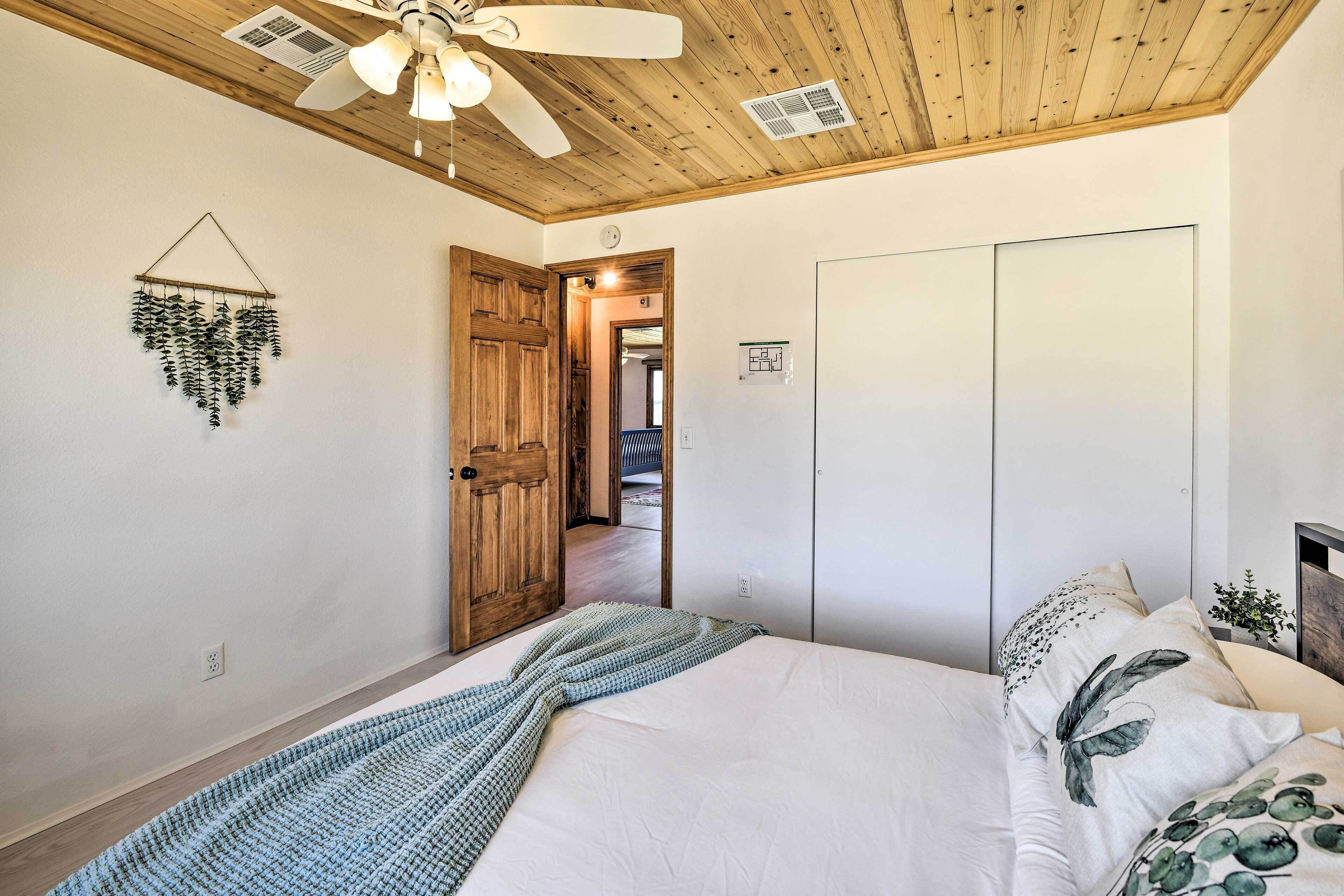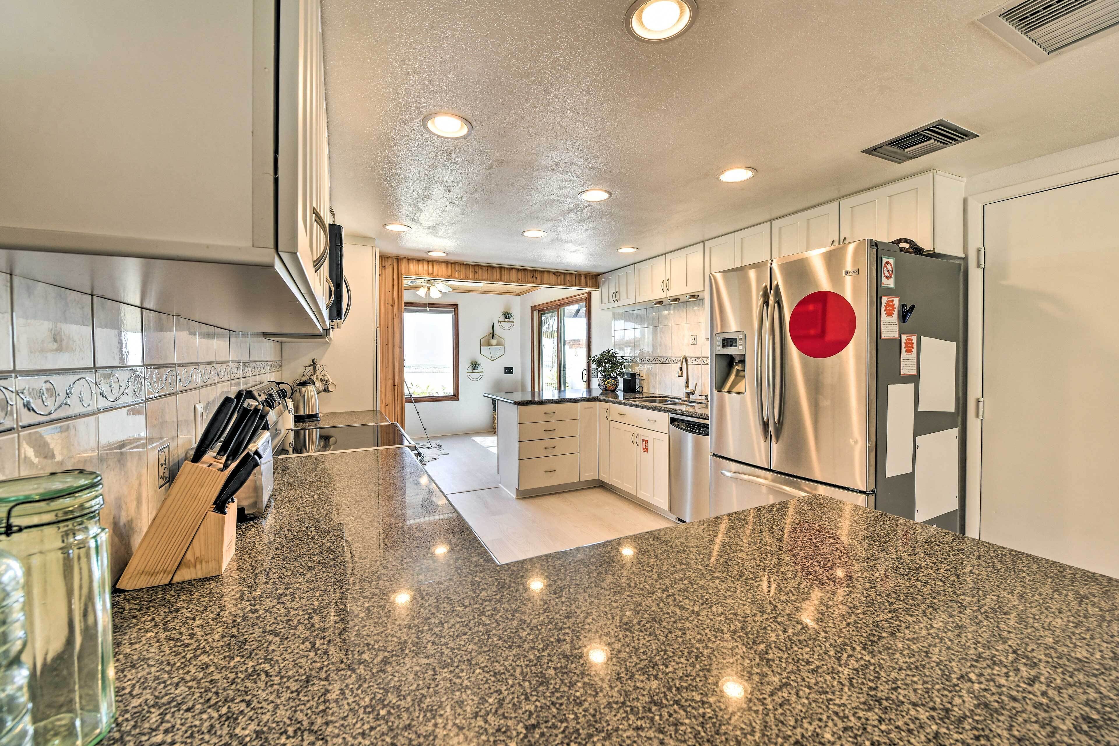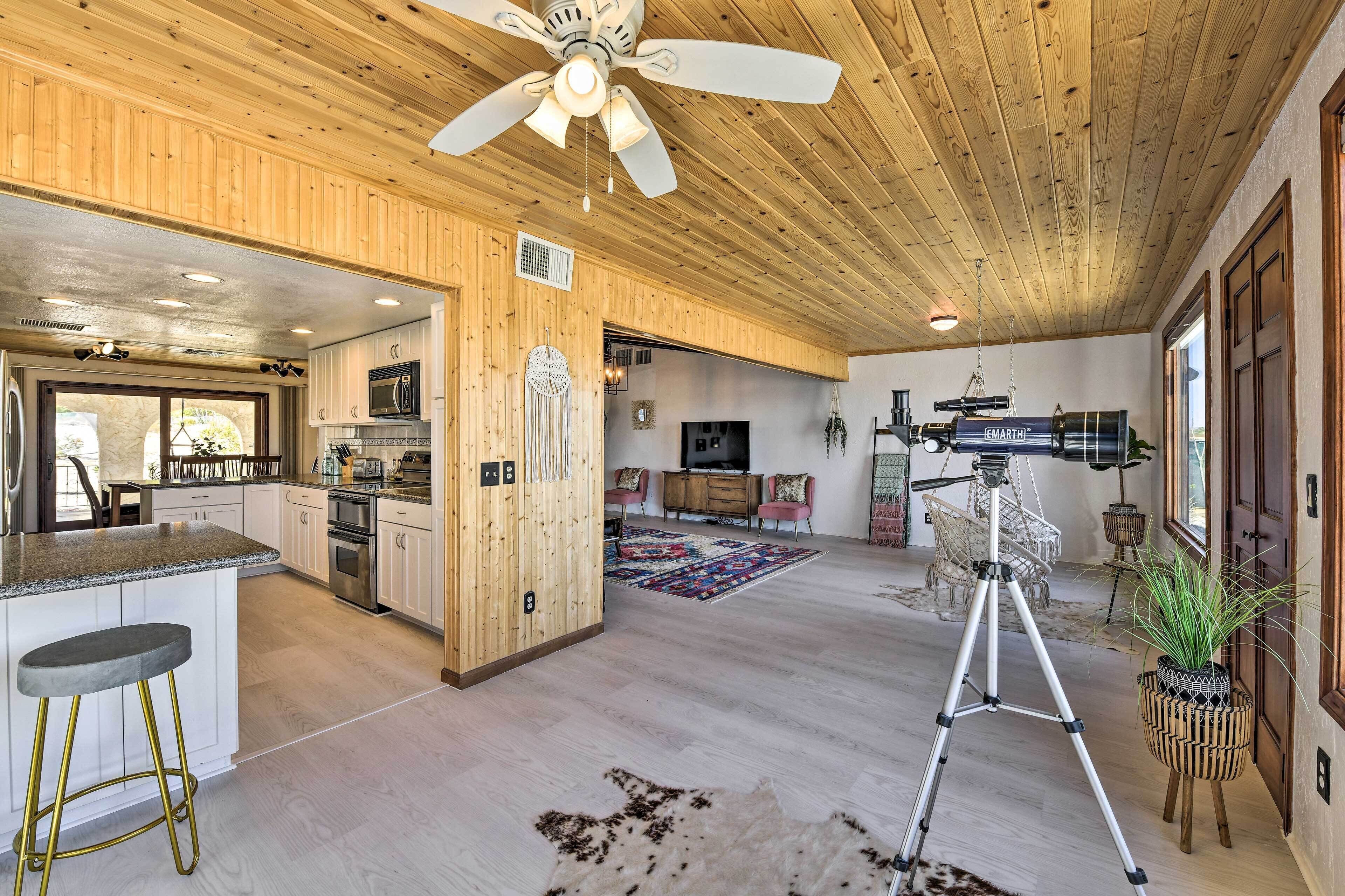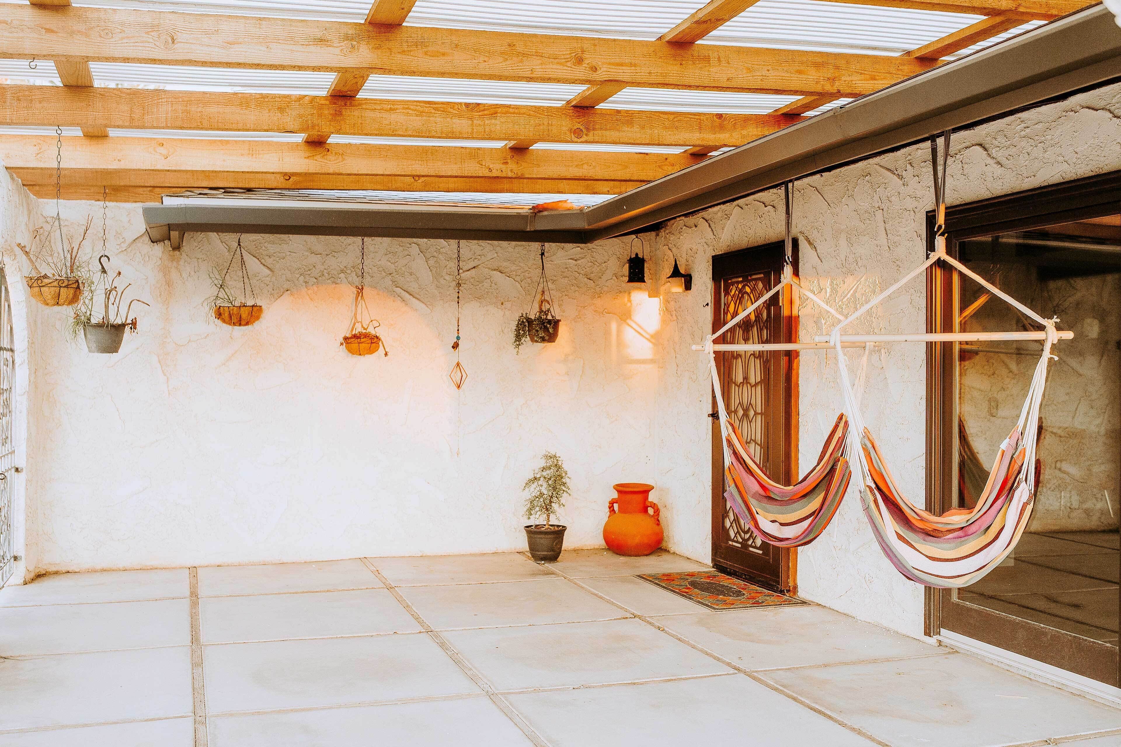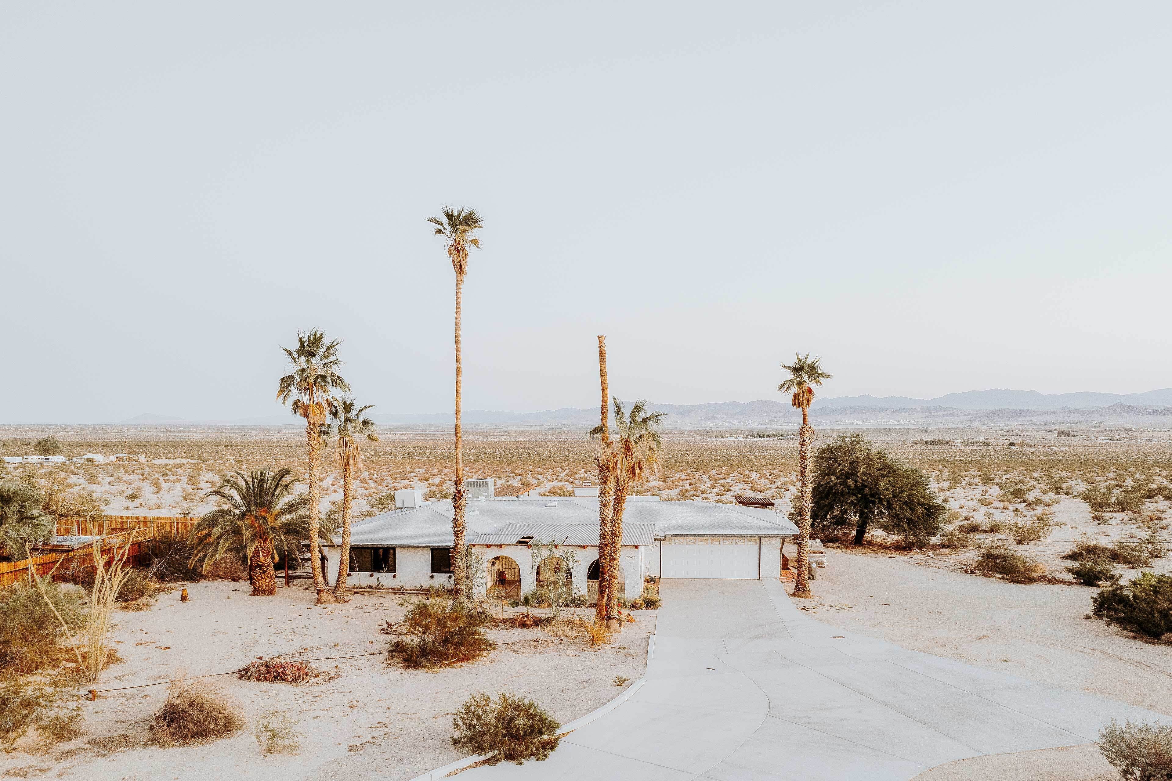 Chic Joshua Tree Pad w/ Mountain Views & Hot Tub Embrace the magic of the desert from this stunning 3-bedroom, 2-bath home in Twentynine Palms. The vacation rental has everything needed for a memorable getaway, including a chic interior, an enclosed patio with a hot tub and chiminea, and awe-inspiring views of the high-desert landscape. Wake up early and enjoy some coffee on the patio, and later, venture off to Joshua Tree National Park for a scenic hike! Come evening, whip up a new recipe in the modern kitchen for your whole crew to enjoy.-- THE PROPERTY --Twentynine Palms Vacation Home Rental Permit: VHR22-060 | Fenced Patio | Wood-Burning Chiminea | On Private 6 AcresBedroom 1: California King Bed | Bedroom 2: Queen Bed | Bedroom 3: Queen Bed | Additional Sleeping: Pack 'n PlaySTEP OUTSIDE: Private patio w/ ample outdoor seating, gas grill, mountain views, private hot tubINDOOR LIVING: Modern interior, Smart TV, exposed beams, exercise bike, open layout, rattan hanging egg chairs, telescope, formal dining table, abundant natural lightCHEF'S CORNER: Modern kitchen, stainless steel appliances, dishwasher, toaster, knife set, drip coffee maker, electric tea kettle, cooking utensils, dishware/flatwareGENERAL: Free WiFi, linens/towels, complimentary toiletries, first aid kit, hair dryer, trash bags, paper towels FAQ: Step-free access, 1 exterior security camera (facing out)PARKING: Driveway (3 vehicles), RV parking allowed-- THE LOCATION --DESERT OUTDOORS: Fortynine Palms Oasis Trail (5.4 miles), Joshua Tree National Park (7.4 miles), Indian Cove Campground (8.1 miles), Hidden Valley Nature Trail (23.9 miles), Barker Dam (25.4 miles), Keys View (27.8 miles), San Bernardino National Forest (65.9 miles), Mojave National Preserve (67.4 miles)THINGS TO SEE + DO: Smiths Ranch Drive-In Theater (3.0 miles), Old Schoolhouse Museum (3.1 miles), Oasis Visitor Center (3.6 miles), Tortoise Rock Casino (3.7 miles)VENTURE OUT: Palm Springs (48.1 miles), Big Bear Lake (81.9 miles), San Bernardino (90.1 miles)AIRPORT: Palm Springs International Airport (53.6 miles)-- REST EASY WITH US --Evolve makes it easy to find and book properties you’ll never want to leave. You can relax knowing that our properties will always be ready for you and that we’ll answer the phone 24/7. Even better, if anything is off about your stay, we’ll make it right. You can count on our homes and our people to make you feel welcome--because we know what vacation means to you.-- POLICIES --- No smoking- No pets allowed- No events, parties, or large gatherings- Must be at least 25 years old to book- Additional fees and taxes may apply- Photo ID may be required upon check-in- NOTE: Your safety matters. This property features 1 exterior security camera located on the front entrance, facing outward toward the driveway. It does not look into any interior spaces. The camera records video and sound when activated by motion. It will record when it first senses motion and 30 seconds after the last motion is detected