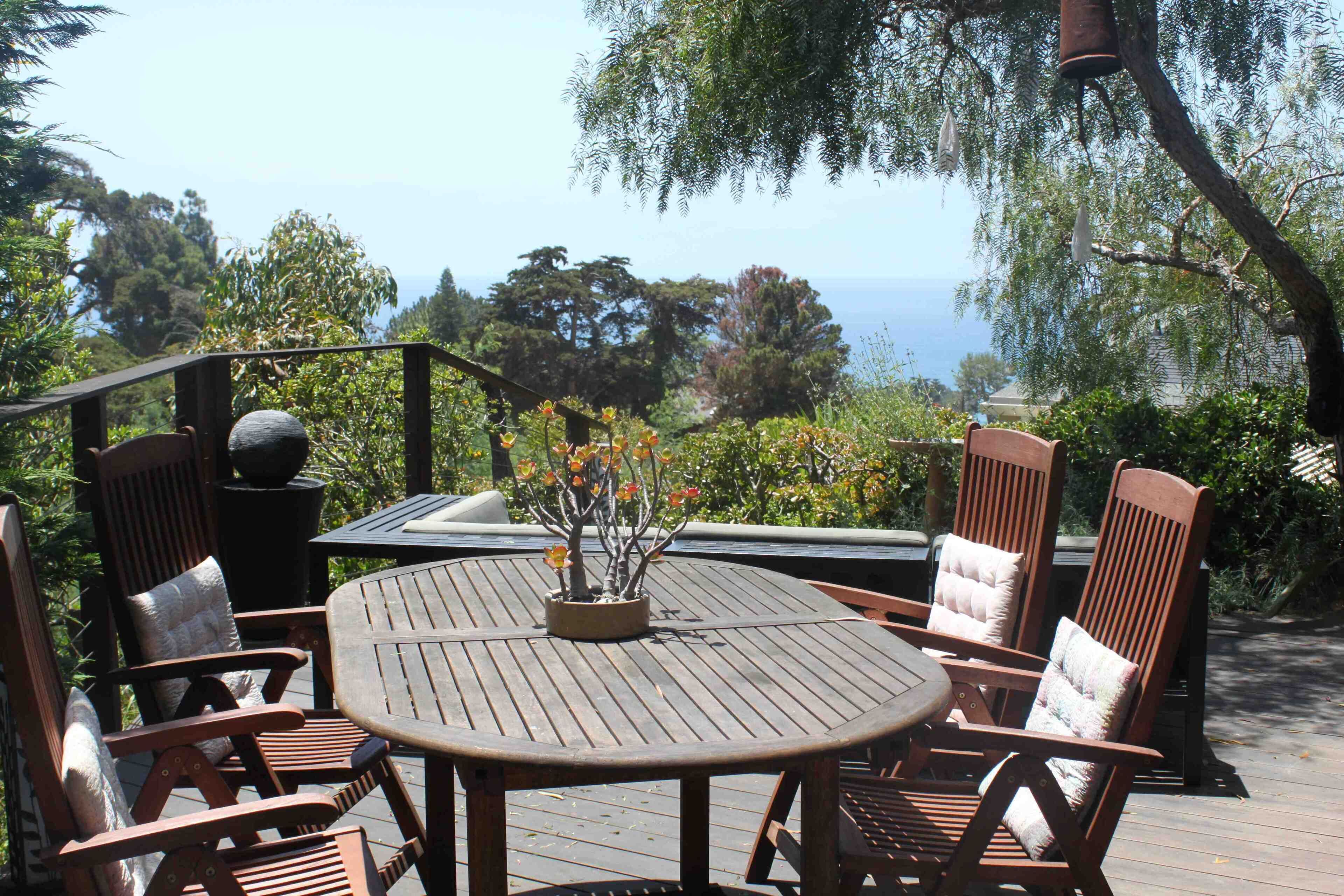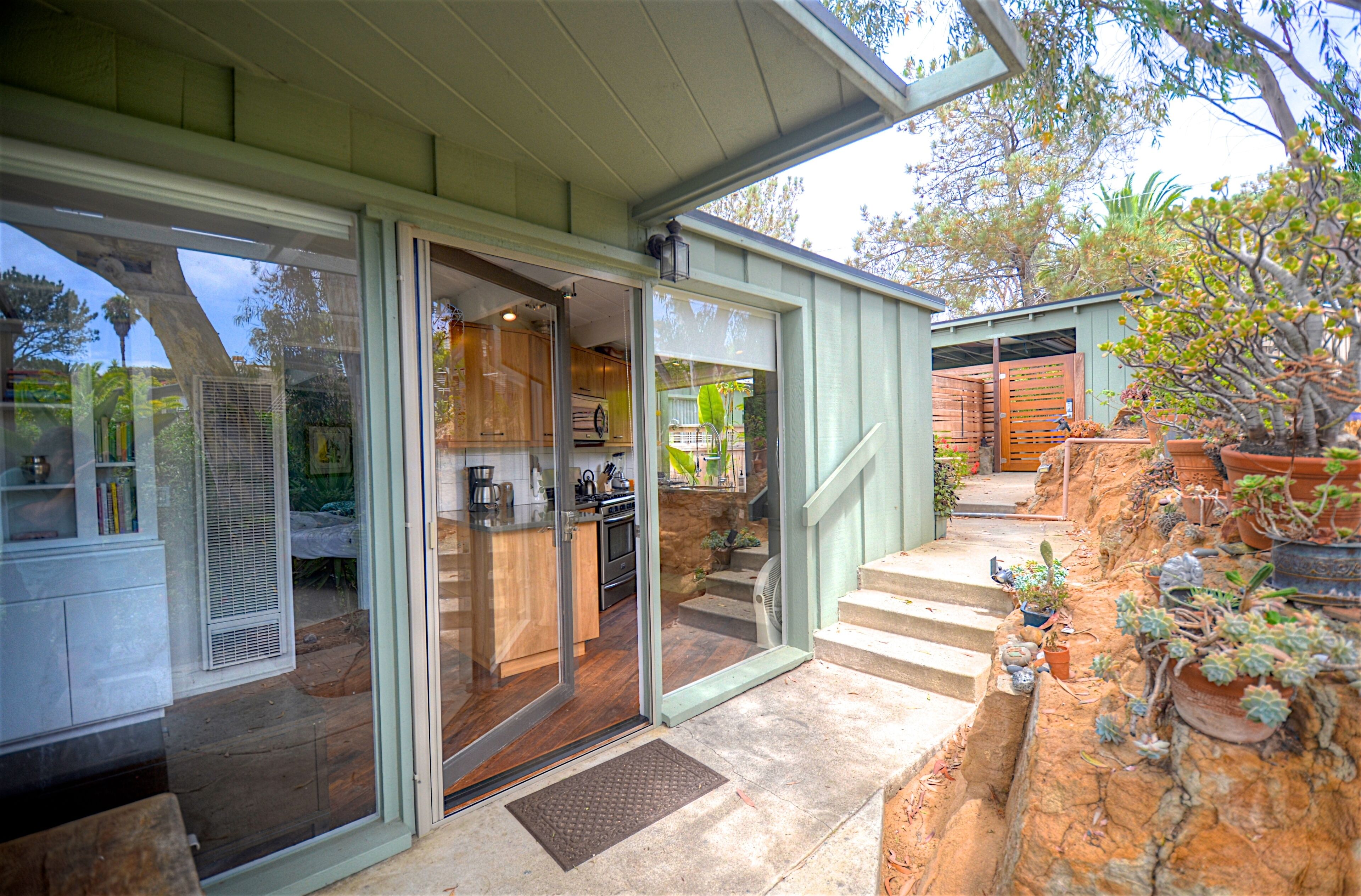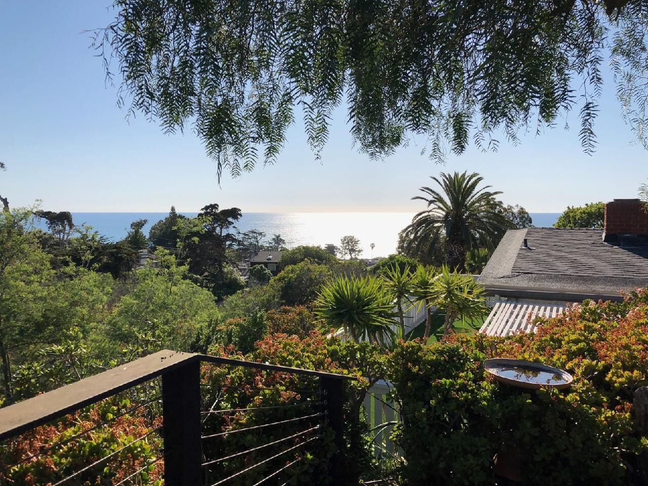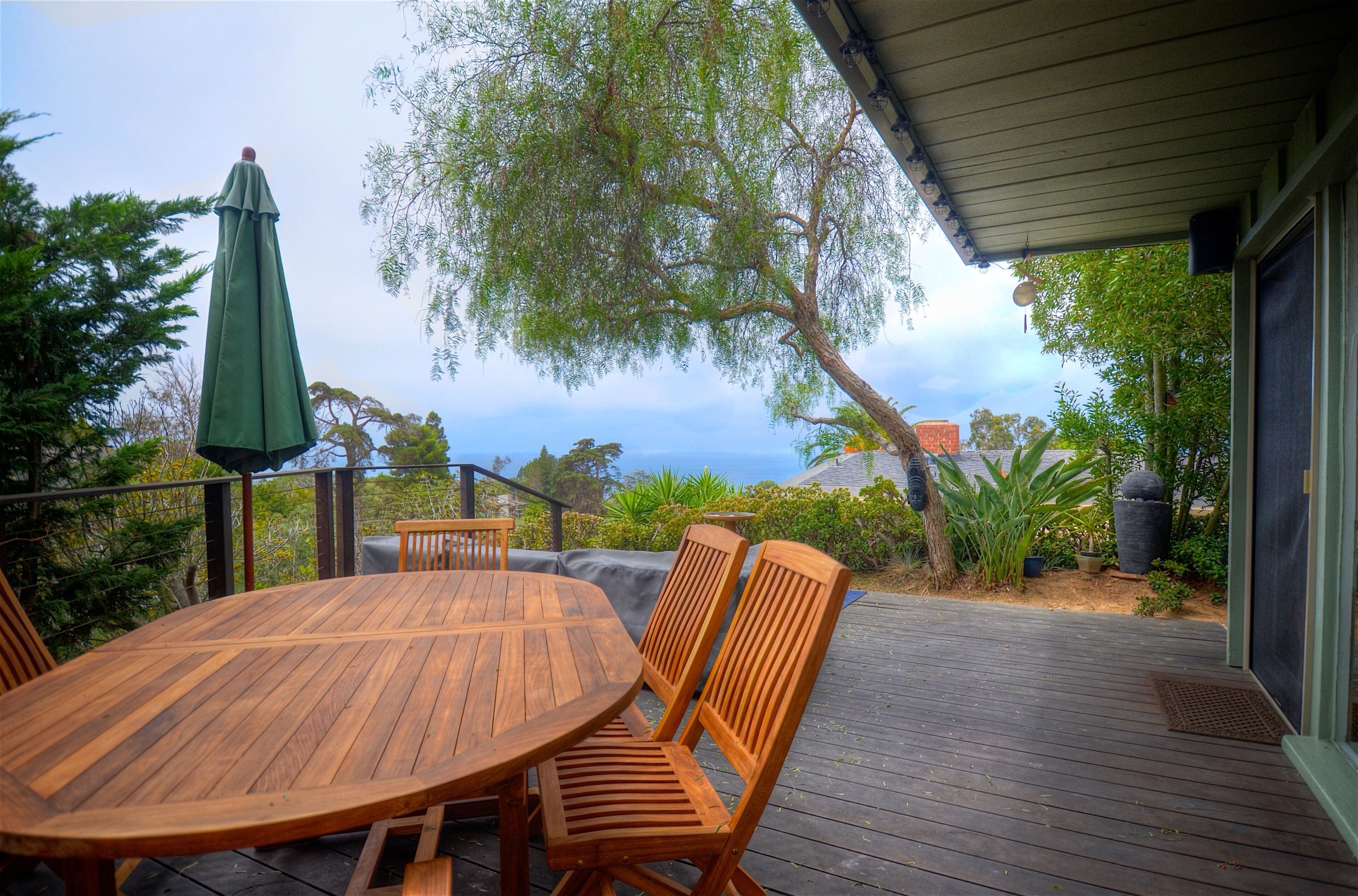 Ocean-View Hillside 2-Bedroom Bungalow Olde Del Mar Gorgeous private, 2-bedroom bungalow in Olde Del Mar. This quiet, scenic residence is located in park-like, hillside setting with sweeping ocean views, surrounded by trees and gentle ocean breezes. 6 blocks from the Del Mar Plaza, and the beach, it offers easy access to downtown Del Mar, the Racetrack, and beaches.Completely remodeled in 2013, new kitchen with quartzite counters, walnut cabinets, stainless appliances, Teak floors, walk in shower with dual shower heads, and so much more! Amenities include wrap around ocean view deck with outdoor BBQ and dining, outdoor shower, floor to ceiling windows, ocean views from both bedrooms, gas stove, 50' flat screen smart HDTV, free high speed WiFi, and off-street parking in a very quiet neighborhood. Maximum 4 people (1 King and 1 Queen bed). New firm Avocado organic King Mattress (2022).Sorry, no pets.Inquire about our additional 5% Senior discount; or 10% returning guest discount. 1 bedroom house also available vrbo 362217Rent both together for a large group (both sides of duplex)!Keywords: Del Mar, bungalow, ocean view, race track, beach, 2 bedroom, surf, golf, horse races, fair, eco friendly, hypoallergenic, green.Green LEED-GOLD remodel: all non toxic materials used, zero VOC paints, all natural cleaners used, organic mattresses, and so much more.