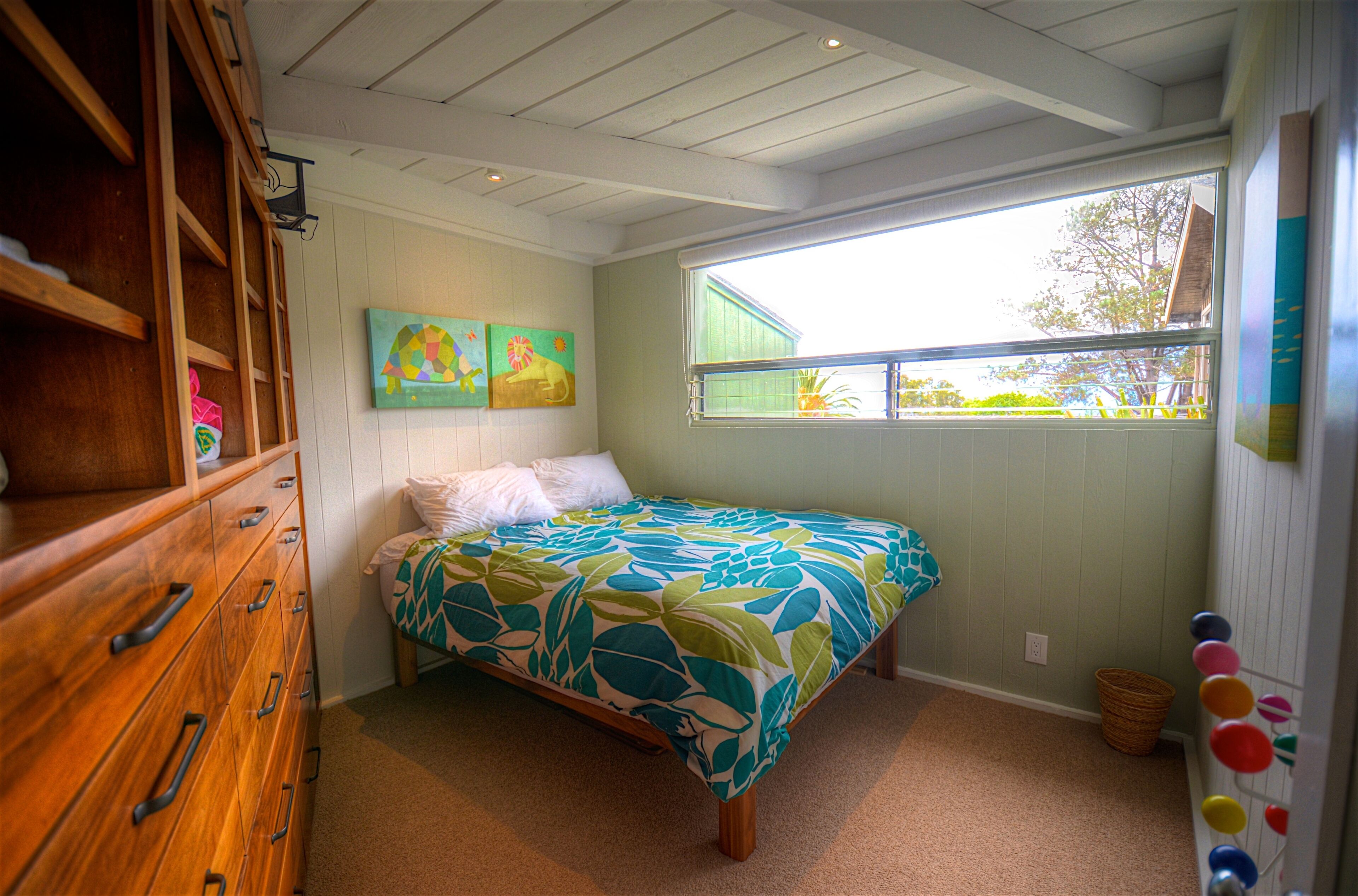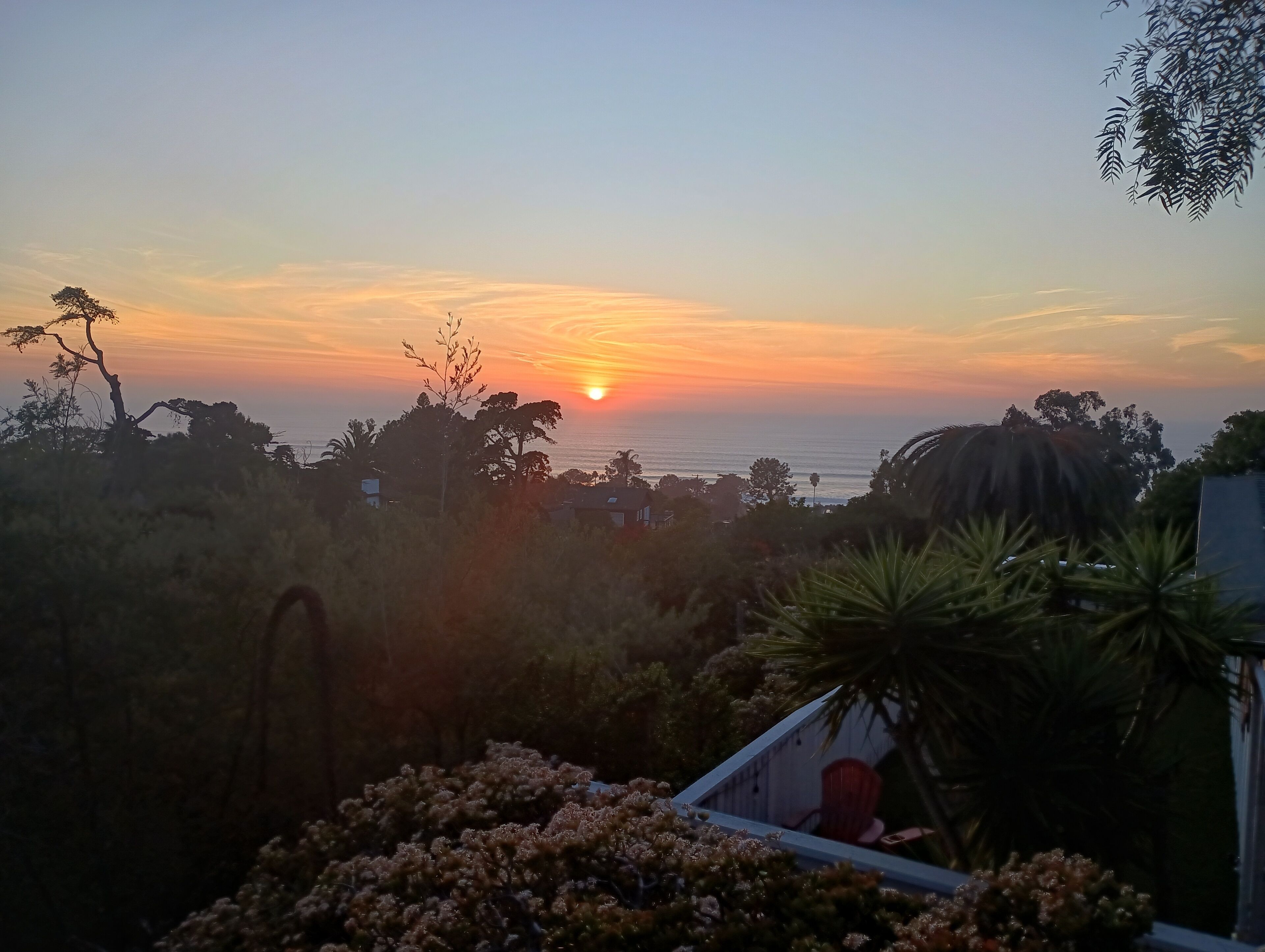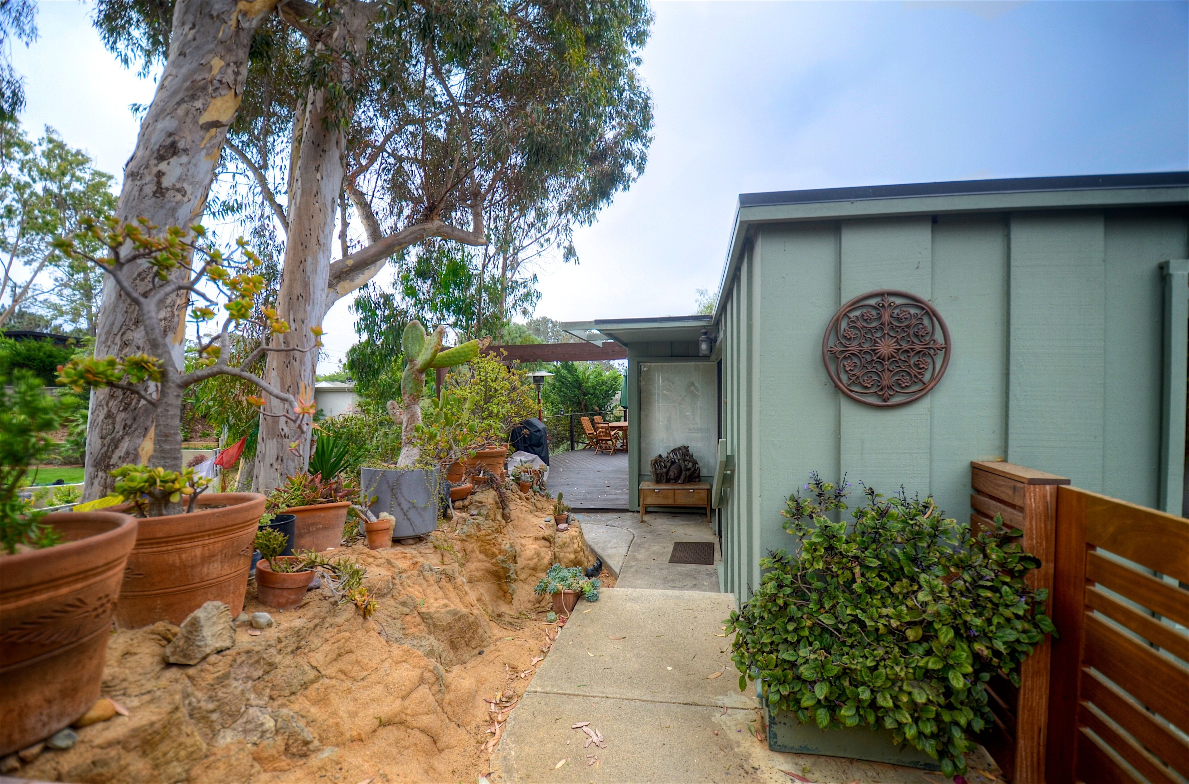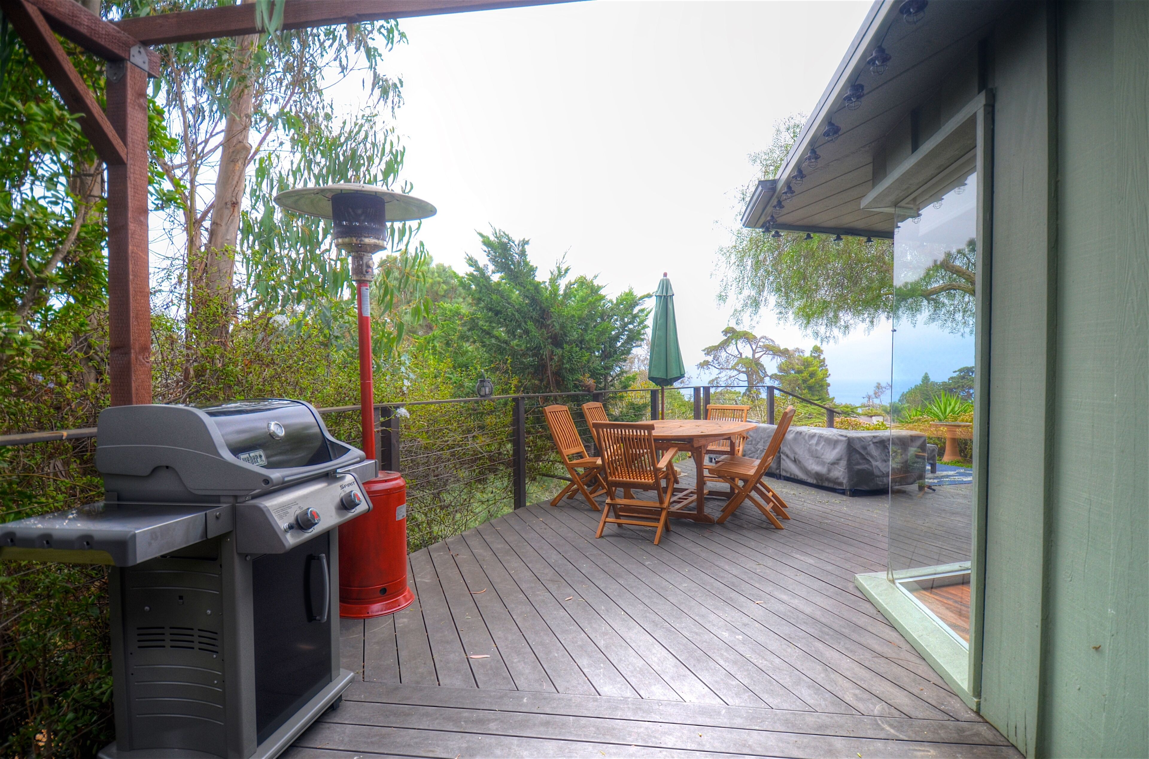 Ocean-View Hillside 2-Bedroom Bungalow Olde Del Mar Gorgeous private, 2-bedroom bungalow in Olde Del Mar. This quiet, scenic residence is located in park-like, hillside setting with sweeping ocean views, surrounded by trees and gentle ocean breezes. 6 blocks from the Del Mar Plaza, and the beach, it offers easy access to downtown Del Mar, the Racetrack, and beaches.Completely remodeled in 2013, new kitchen with quartzite counters, walnut cabinets, stainless appliances, Teak floors, walk in shower with dual shower heads, and so much more! Amenities include wrap around ocean view deck with outdoor BBQ and dining, outdoor shower, floor to ceiling windows, ocean views from both bedrooms, gas stove, 50' flat screen smart HDTV, free high speed WiFi, and off-street parking in a very quiet neighborhood. Maximum 4 people (1 King and 1 Queen bed). New firm Avocado organic King Mattress (2022).Sorry, no pets.Inquire about our additional 5% Senior discount; or 10% returning guest discount. 1 bedroom house also available vrbo 362217Rent both together for a large group (both sides of duplex)!Keywords: Del Mar, bungalow, ocean view, race track, beach, 2 bedroom, surf, golf, horse races, fair, eco friendly, hypoallergenic, green.Green LEED-GOLD remodel: all non toxic materials used, zero VOC paints, all natural cleaners used, organic mattresses, and so much more.