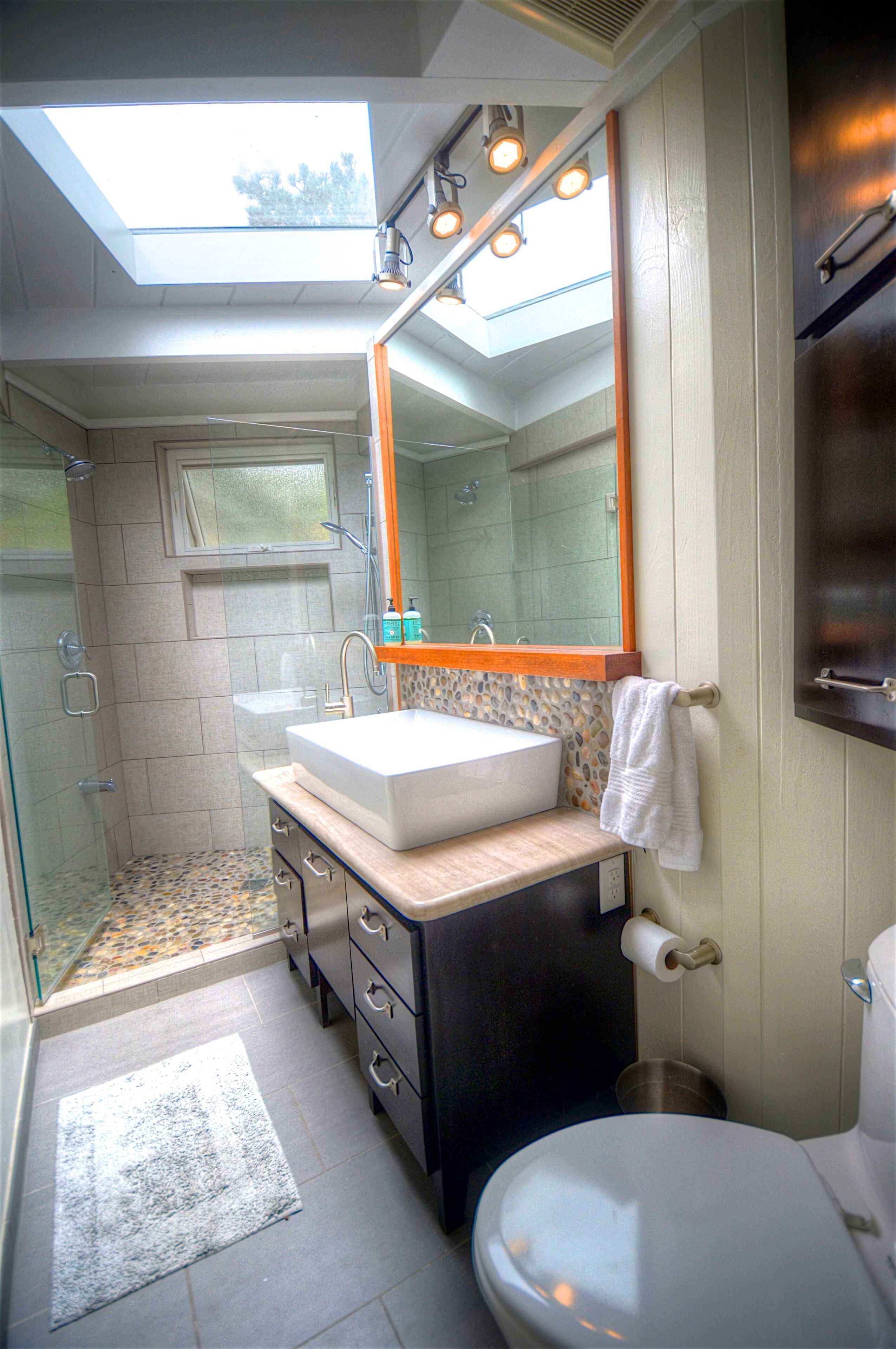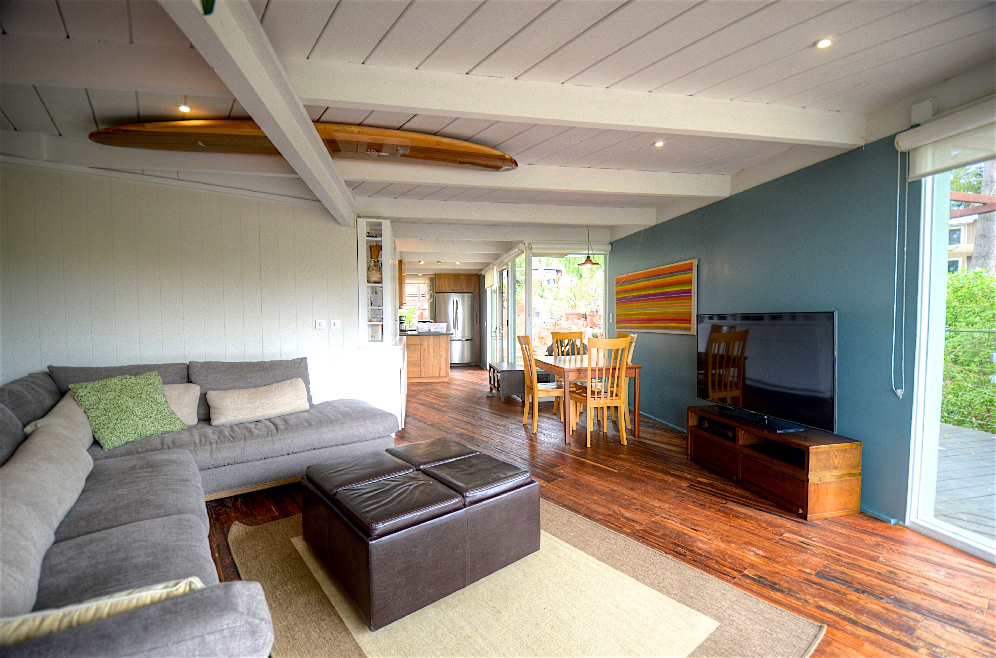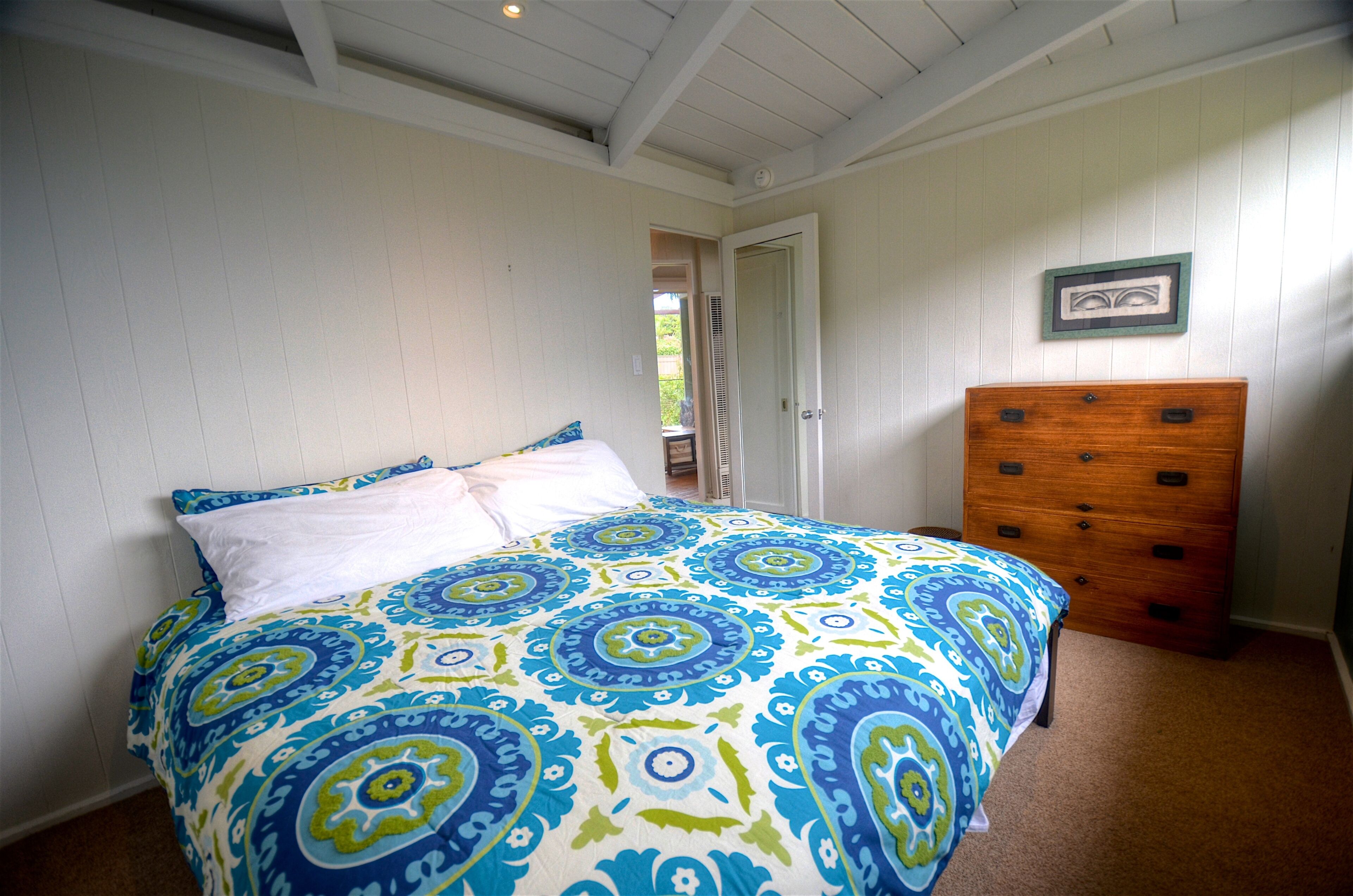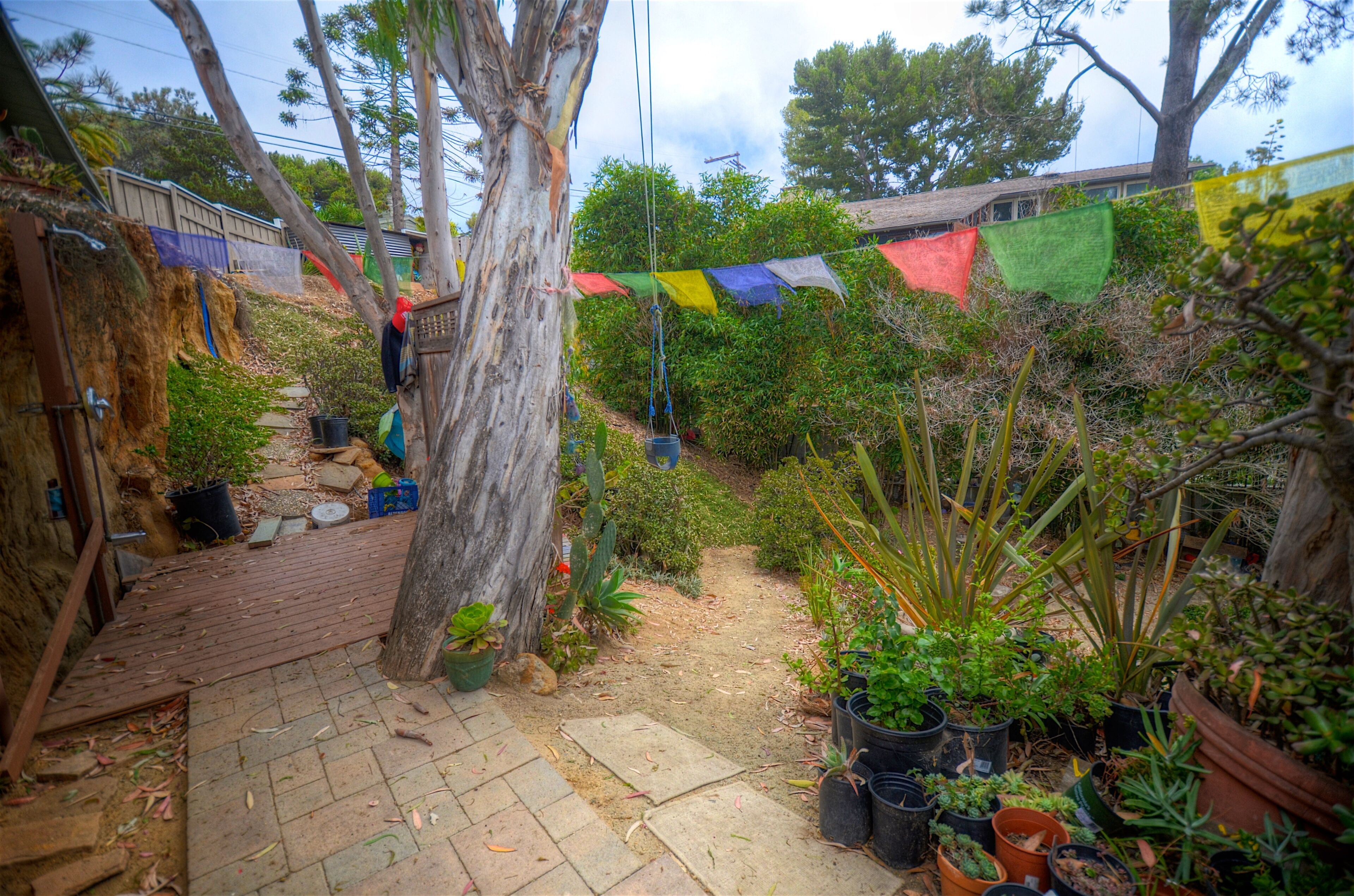 Ocean-View Hillside 2-Bedroom Bungalow Olde Del Mar Gorgeous private, 2-bedroom bungalow in Olde Del Mar. This quiet, scenic residence is located in park-like, hillside setting with sweeping ocean views, surrounded by trees and gentle ocean breezes. 6 blocks from the Del Mar Plaza, and the beach, it offers easy access to downtown Del Mar, the Racetrack, and beaches.Completely remodeled in 2013, new kitchen with quartzite counters, walnut cabinets, stainless appliances, Teak floors, walk in shower with dual shower heads, and so much more! Amenities include wrap around ocean view deck with outdoor BBQ and dining, outdoor shower, floor to ceiling windows, ocean views from both bedrooms, gas stove, 50' flat screen smart HDTV, free high speed WiFi, and off-street parking in a very quiet neighborhood. Maximum 4 people (1 King and 1 Queen bed). New firm Avocado organic King Mattress (2022).Sorry, no pets.Inquire about our additional 5% Senior discount; or 10% returning guest discount. 1 bedroom house also available vrbo 362217Rent both together for a large group (both sides of duplex)!Keywords: Del Mar, bungalow, ocean view, race track, beach, 2 bedroom, surf, golf, horse races, fair, eco friendly, hypoallergenic, green.Green LEED-GOLD remodel: all non toxic materials used, zero VOC paints, all natural cleaners used, organic mattresses, and so much more.
