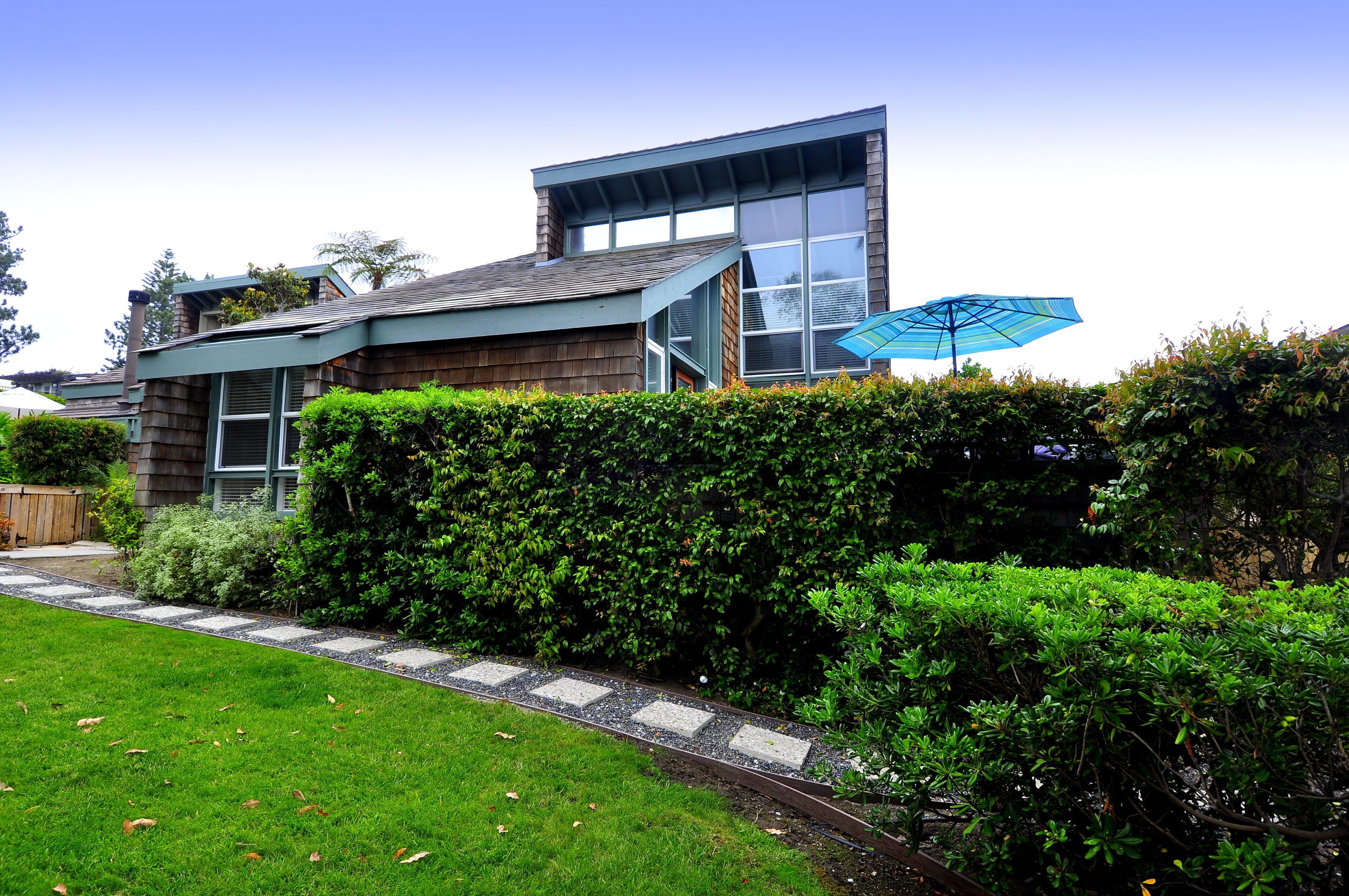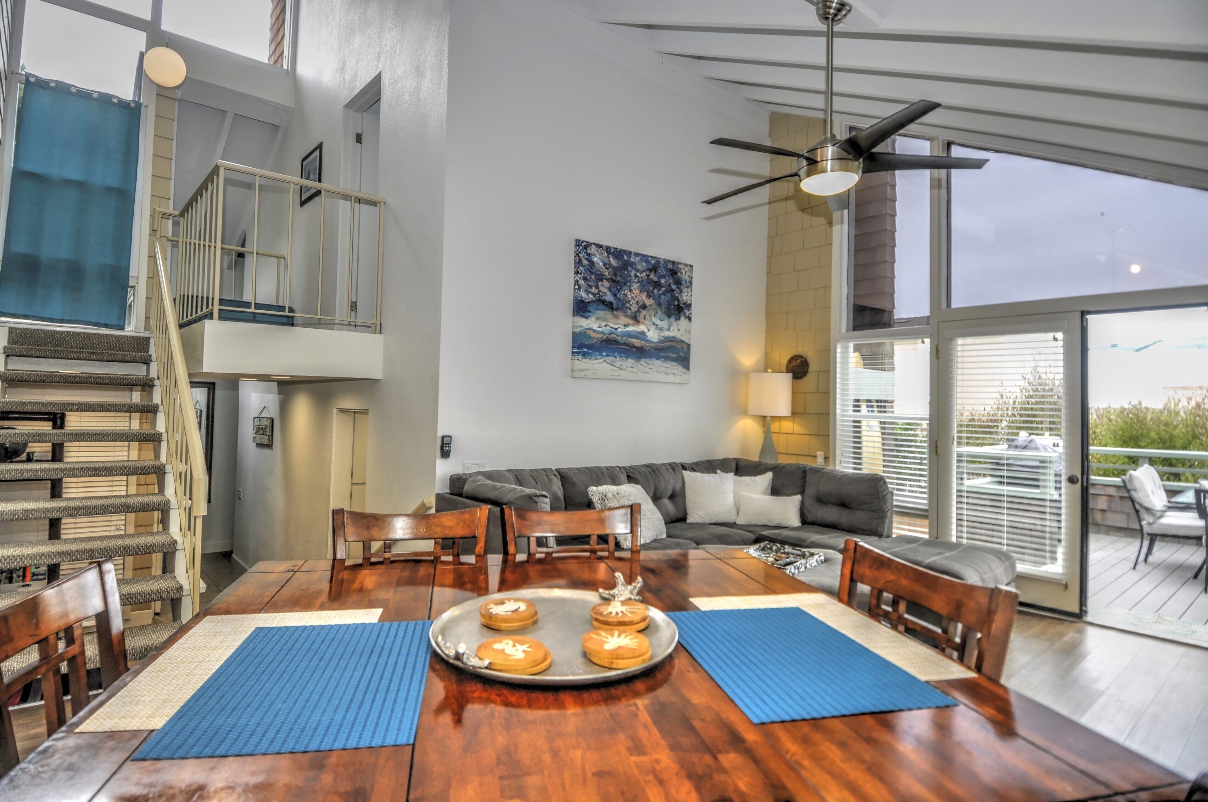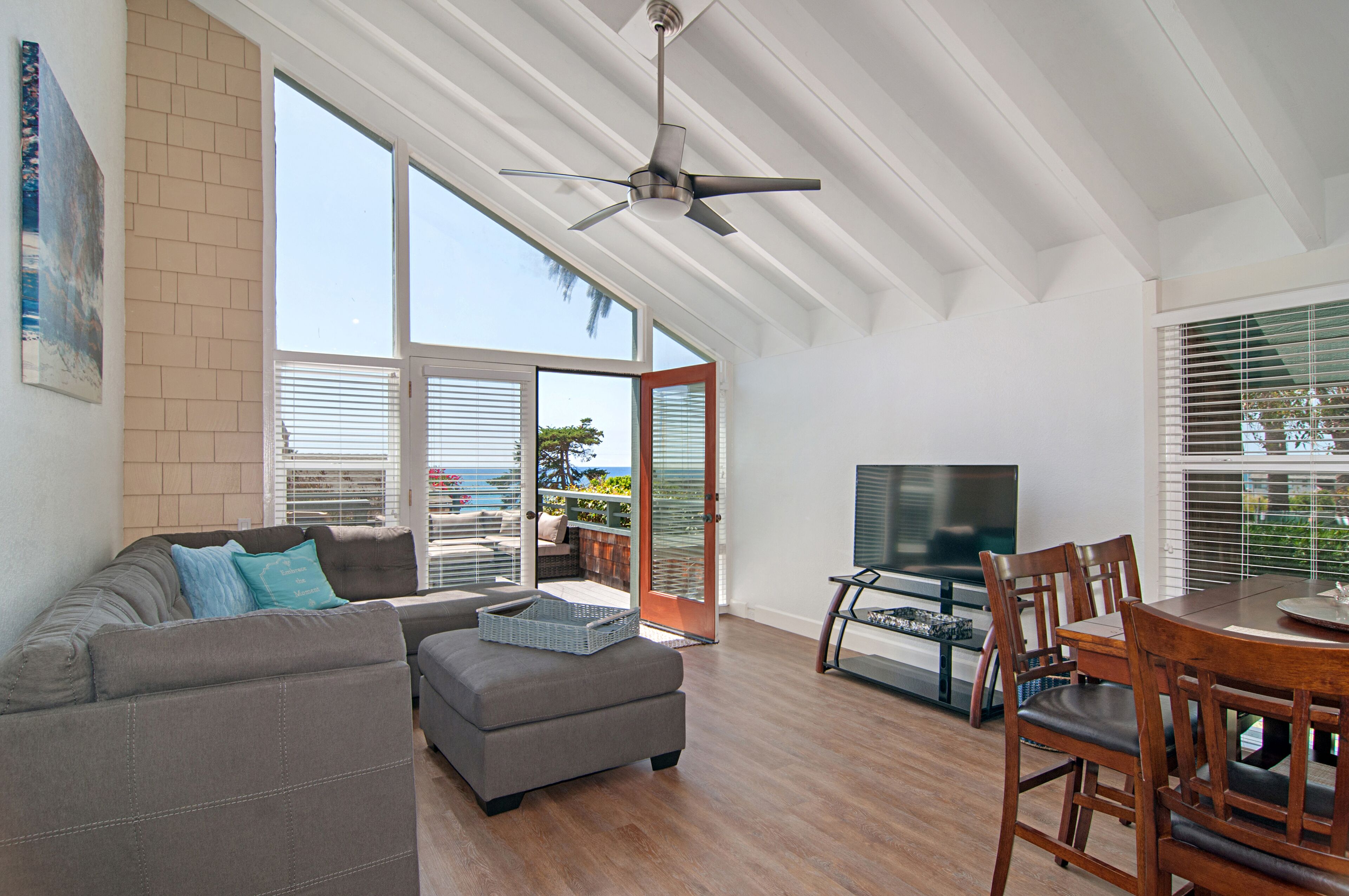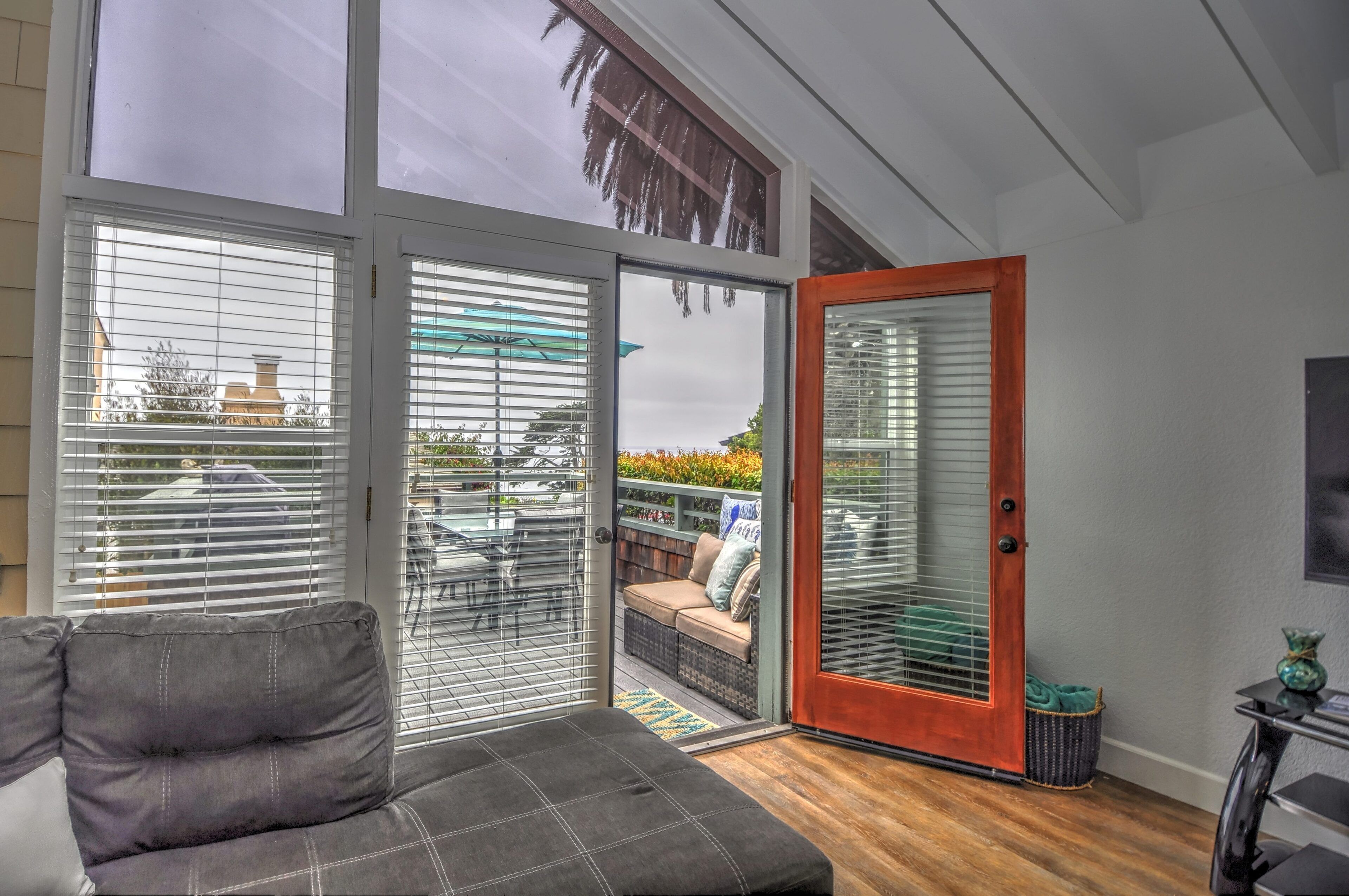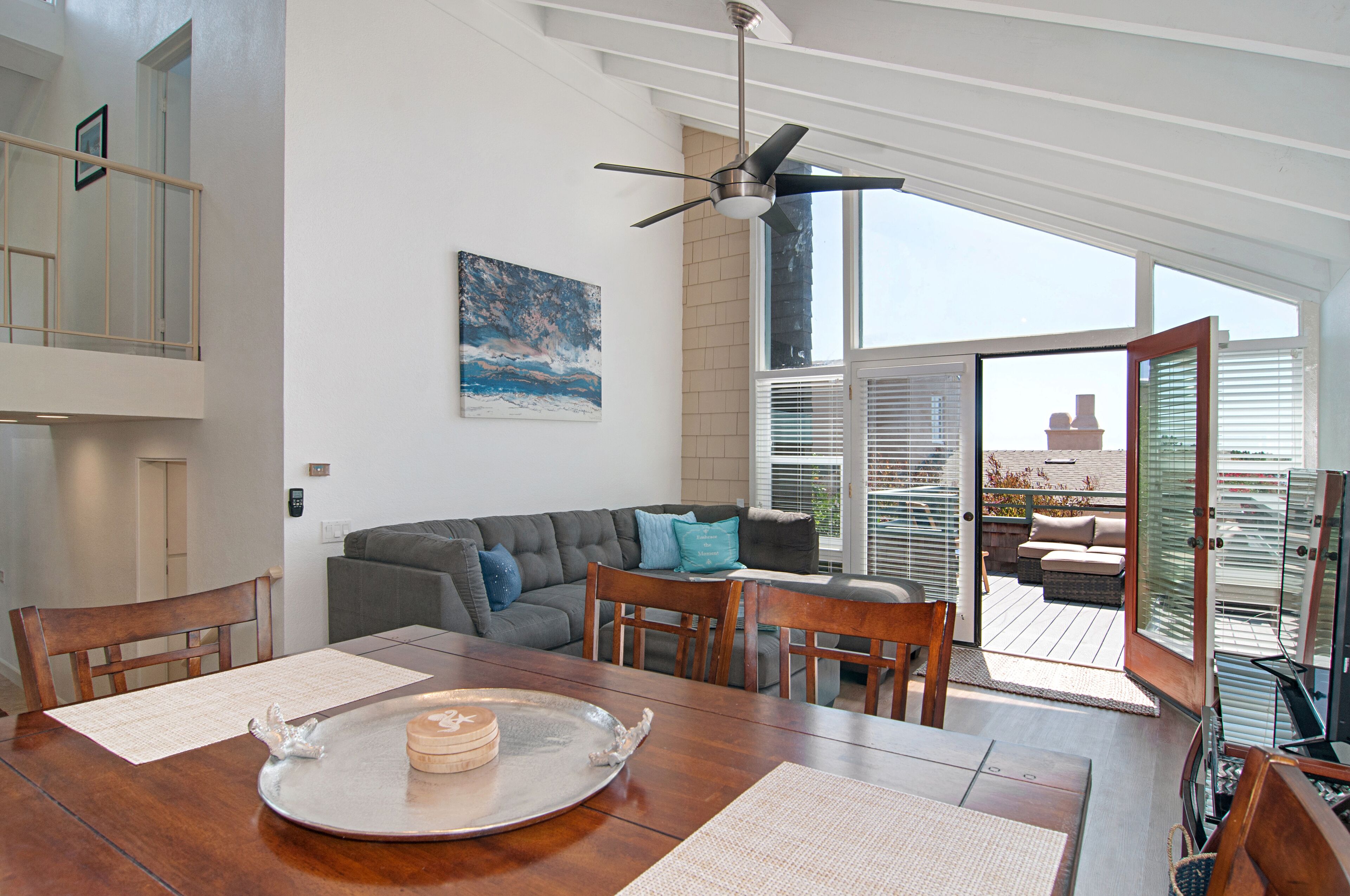 Stay and play in the Village by the Sea! Home is centered in the heart of Del Mar, walking distance to the beach, restaurants, shops, Del Mar Racetrack, and more. With an ocean view from the main living area, back patio, master bedroom, and grassy front yard, this home is ideal for relaxing and celebrating life in a setting suited for singles and families. Throughout the home, you will find open vaulted ceilings above classy, comfy furnishings flowing with a sand and sea theme creating it's own unique vibe. For ultimate comfort, ceiling fans hang in each room complimenting the air conditioning. Granite countertops, stainless steel appliances, and digital washer and dryer for the ease of being at your own home. The upstairs master is home to an exceptionally comfortable heavenly king size bed, sea colored Berber carpeting, saturated by closet and storage space. The upstairs bathroom is attached to the master, it has a beautiful spacious granite counter top, sand tiled flooring with a separated custom shower to open your days and eyes in style and close your days with soothing surroundings to melt you into bed. The 2nd bedroom nestles a cozy queen sized bed, fit for a queen. Sea colored Berber carpeting, with lots of closet space and a privacy wall outside the window, this room is a sweet sleeper! The 3rd bedroom is home to a full/full bunk bed with a twin trundle sitting atop sea stained Berber carpeting, accompanied by roomy closets. The f/f/t bunk/trundle provides plenty of room for kids but large and comfortable enough to accommodate the groups too! The downstairs shared bathroom is situated between bedroom 2 and 3, making it perfect for sharing. It presents a granite counter top, sand tiled floor sealed with a shower/bath combo. All bedrooms and bathrooms are sure to bring gratitude and comfort to all the days of your stay, no matter which side you get out of bed!