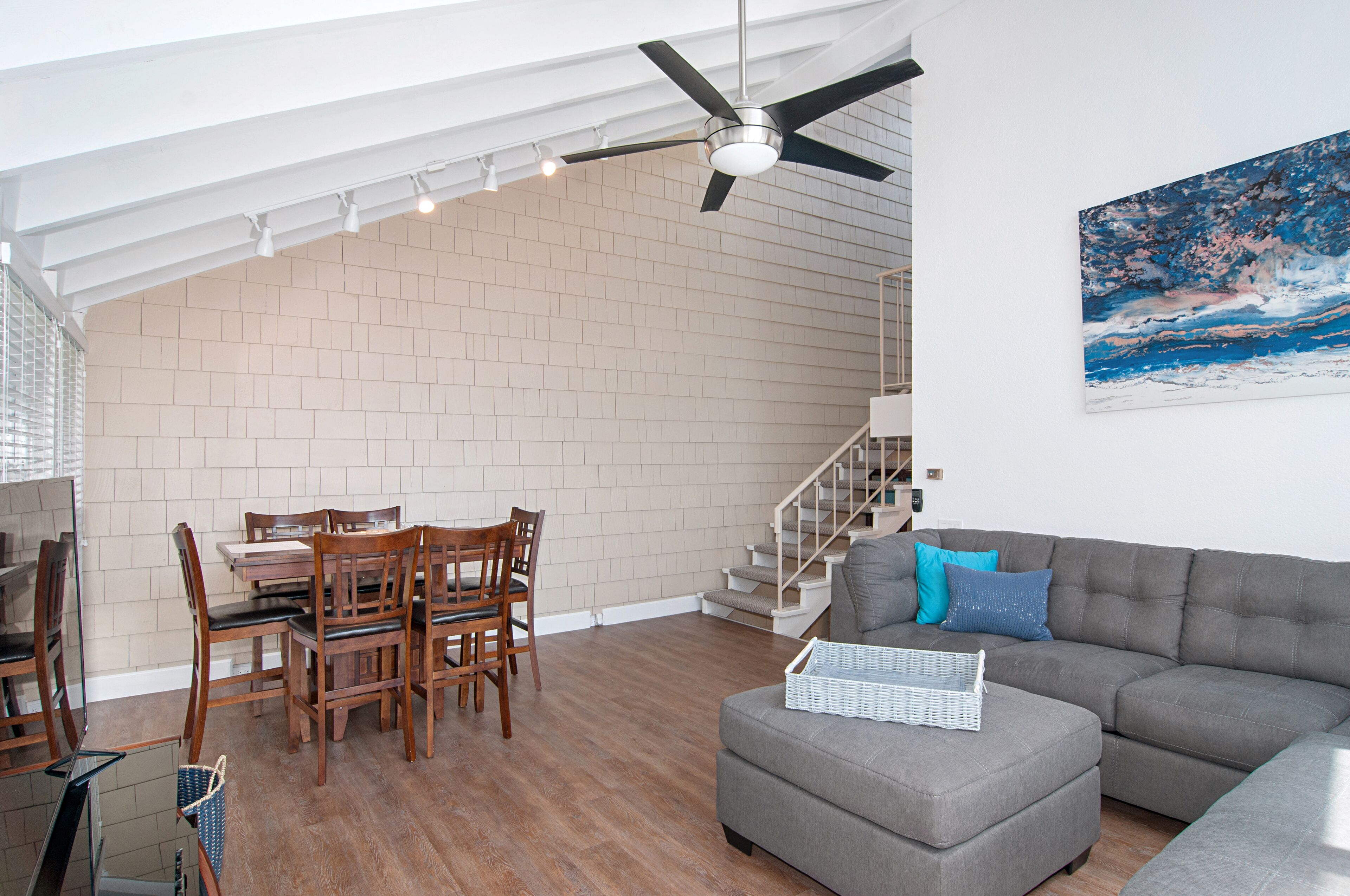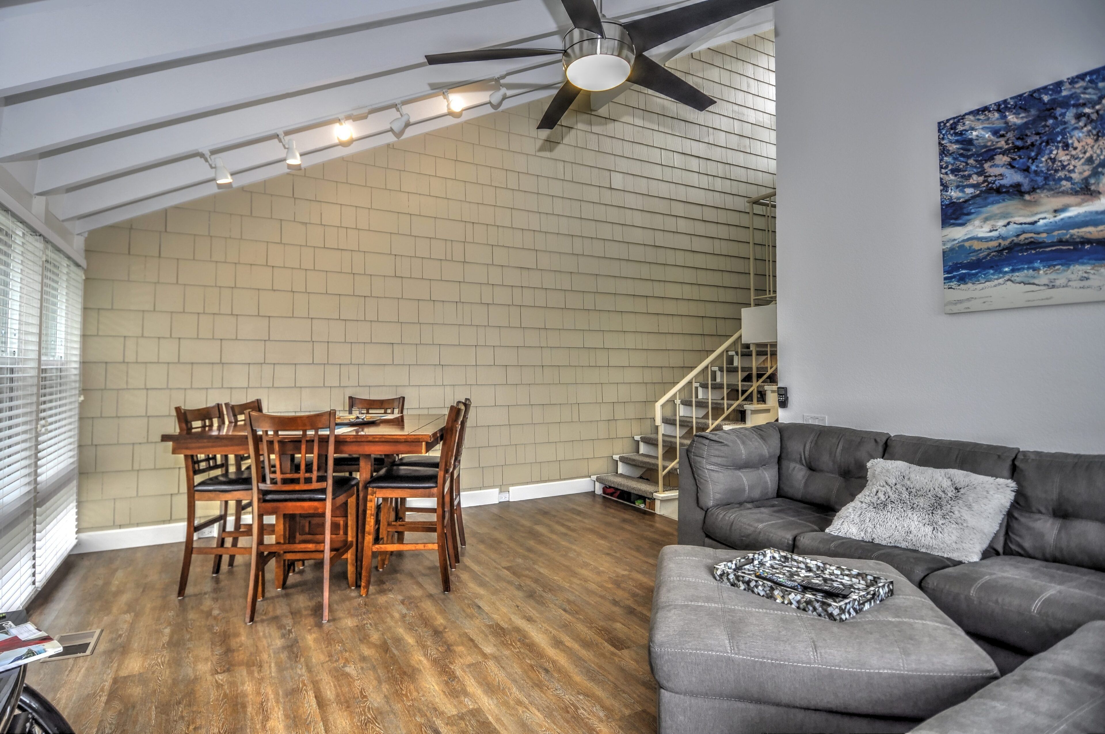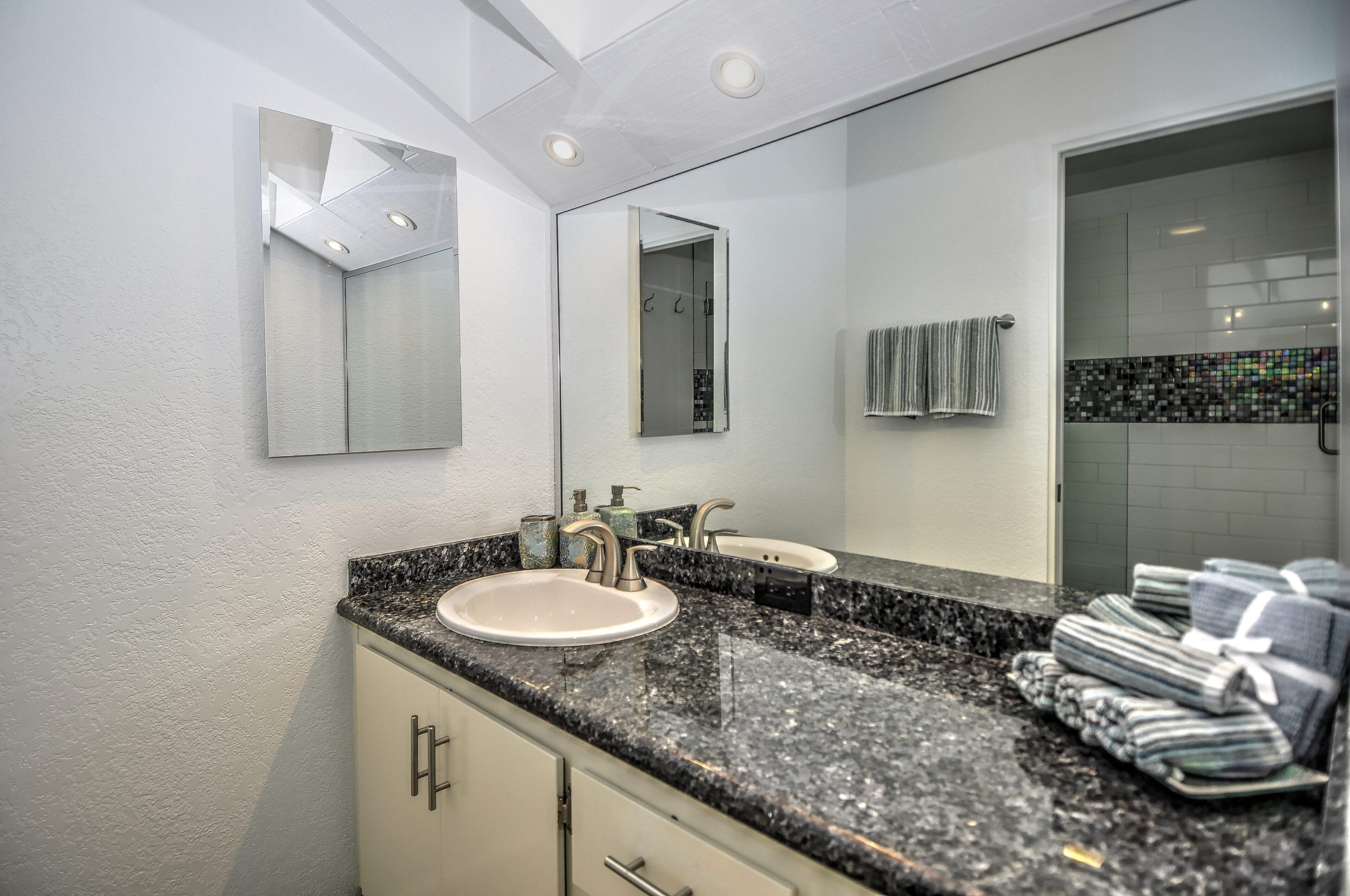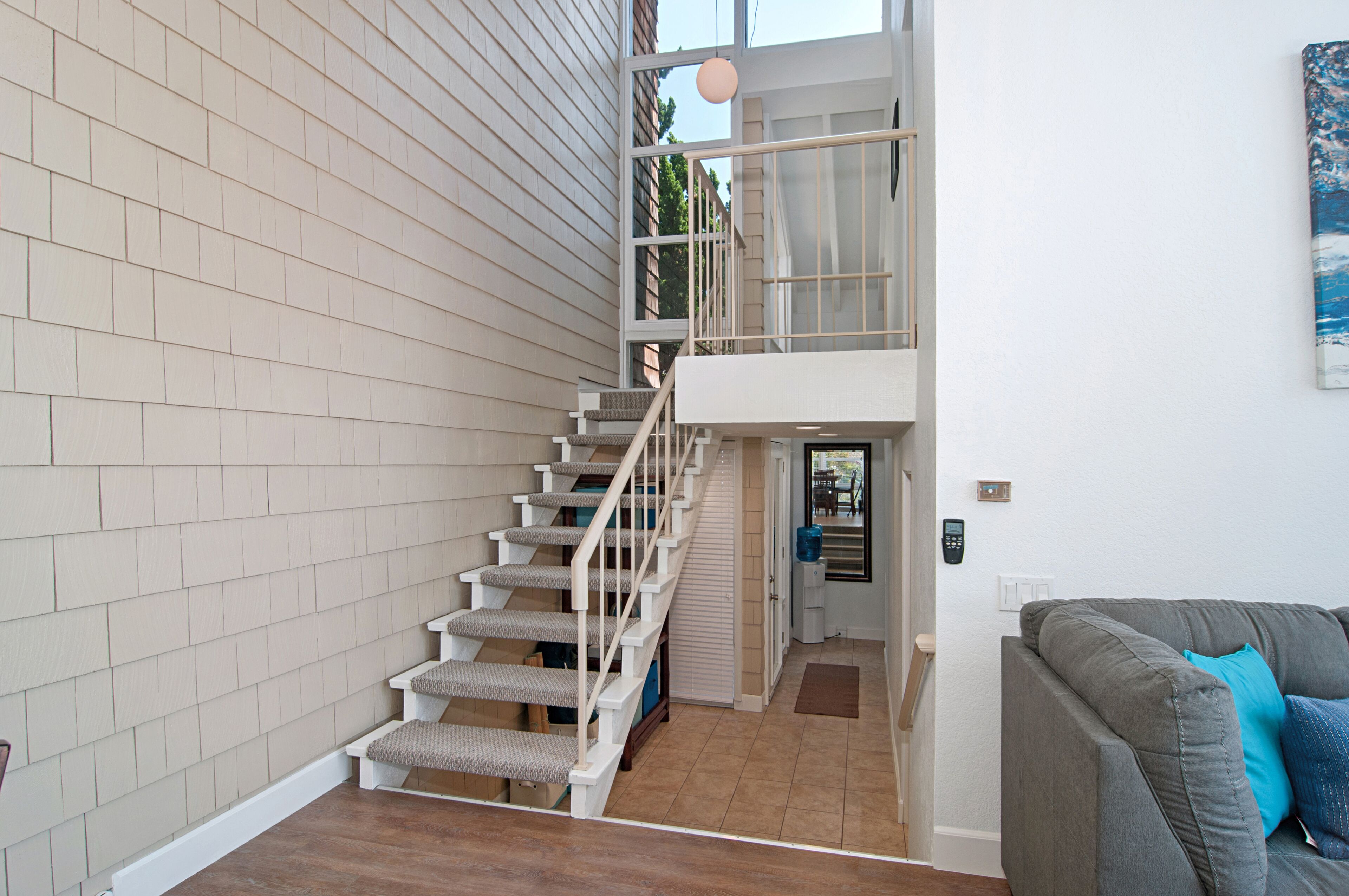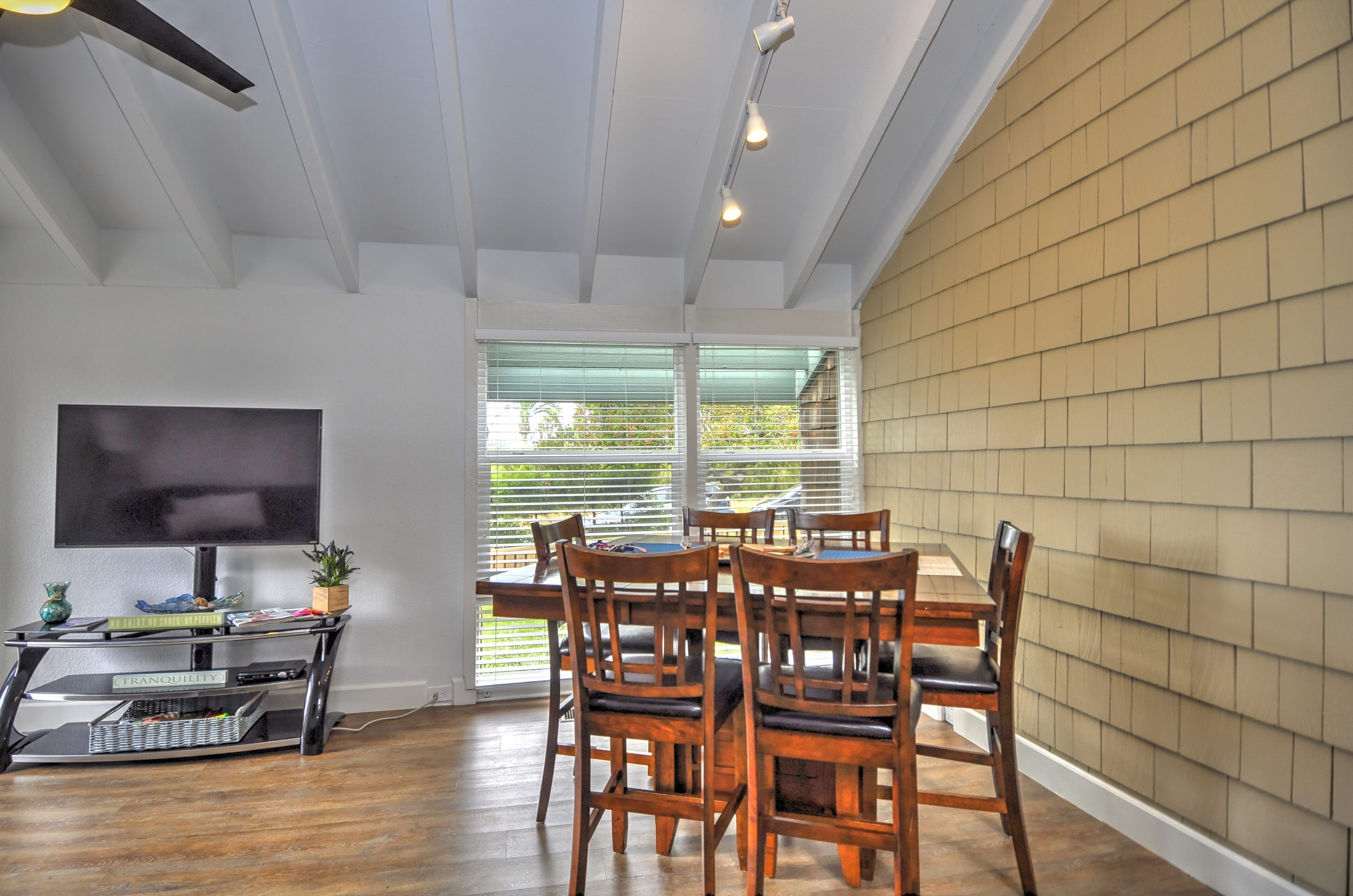 Stay and play in the Village by the Sea! Home is centered in the heart of Del Mar, walking distance to the beach, restaurants, shops, Del Mar Racetrack, and more. With an ocean view from the main living area, back patio, master bedroom, and grassy front yard, this home is ideal for relaxing and celebrating life in a setting suited for singles and families. Throughout the home, you will find open vaulted ceilings above classy, comfy furnishings flowing with a sand and sea theme creating it's own unique vibe. For ultimate comfort, ceiling fans hang in each room complimenting the air conditioning. Granite countertops, stainless steel appliances, and digital washer and dryer for the ease of being at your own home. The upstairs master is home to an exceptionally comfortable heavenly king size bed, sea colored Berber carpeting, saturated by closet and storage space. The upstairs bathroom is attached to the master, it has a beautiful spacious granite counter top, sand tiled flooring with a separated custom shower to open your days and eyes in style and close your days with soothing surroundings to melt you into bed. The 2nd bedroom nestles a cozy queen sized bed, fit for a queen. Sea colored Berber carpeting, with lots of closet space and a privacy wall outside the window, this room is a sweet sleeper! The 3rd bedroom is home to a full/full bunk bed with a twin trundle sitting atop sea stained Berber carpeting, accompanied by roomy closets. The f/f/t bunk/trundle provides plenty of room for kids but large and comfortable enough to accommodate the groups too! The downstairs shared bathroom is situated between bedroom 2 and 3, making it perfect for sharing. It presents a granite counter top, sand tiled floor sealed with a shower/bath combo. All bedrooms and bathrooms are sure to bring gratitude and comfort to all the days of your stay, no matter which side you get out of bed!