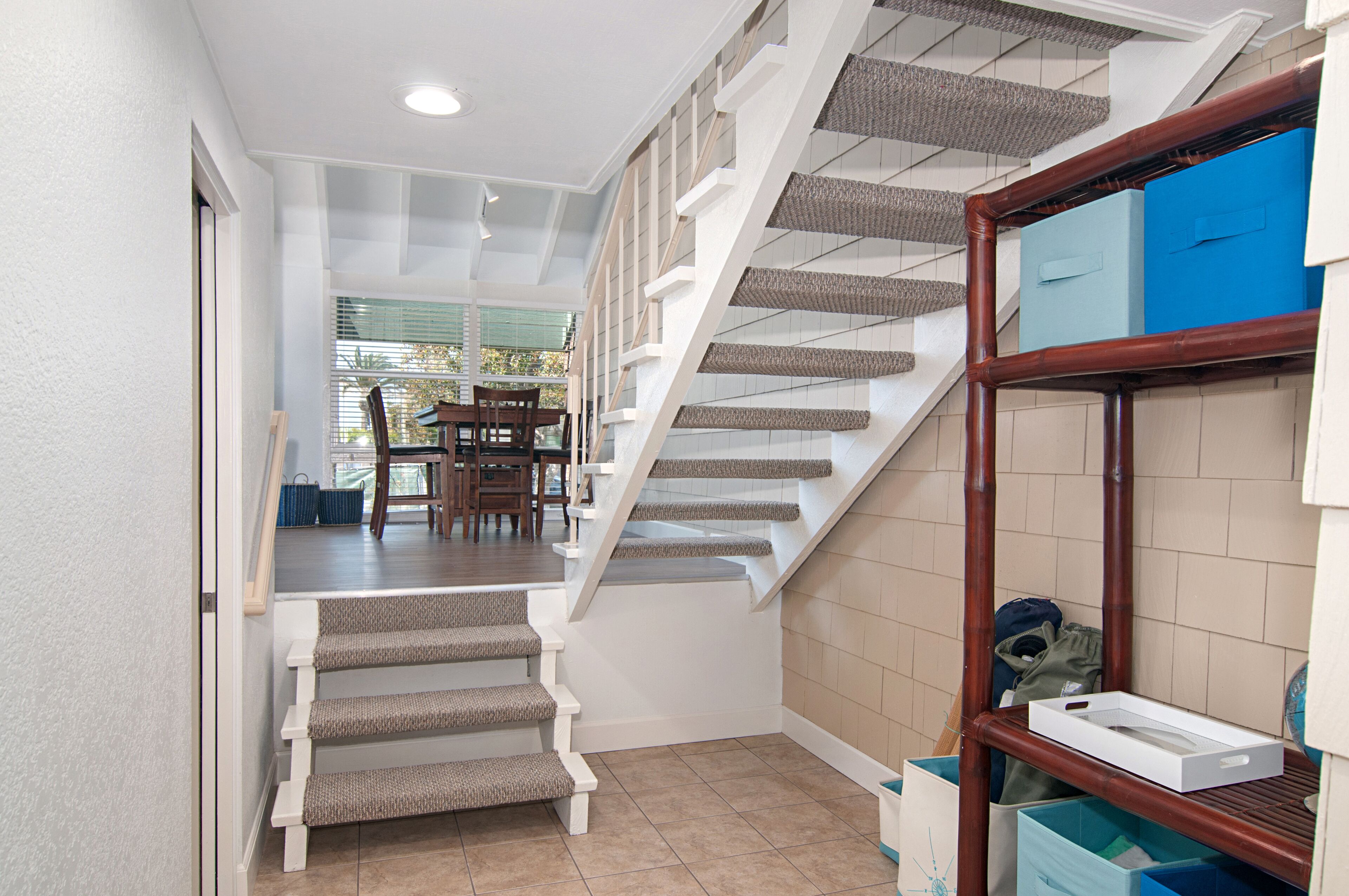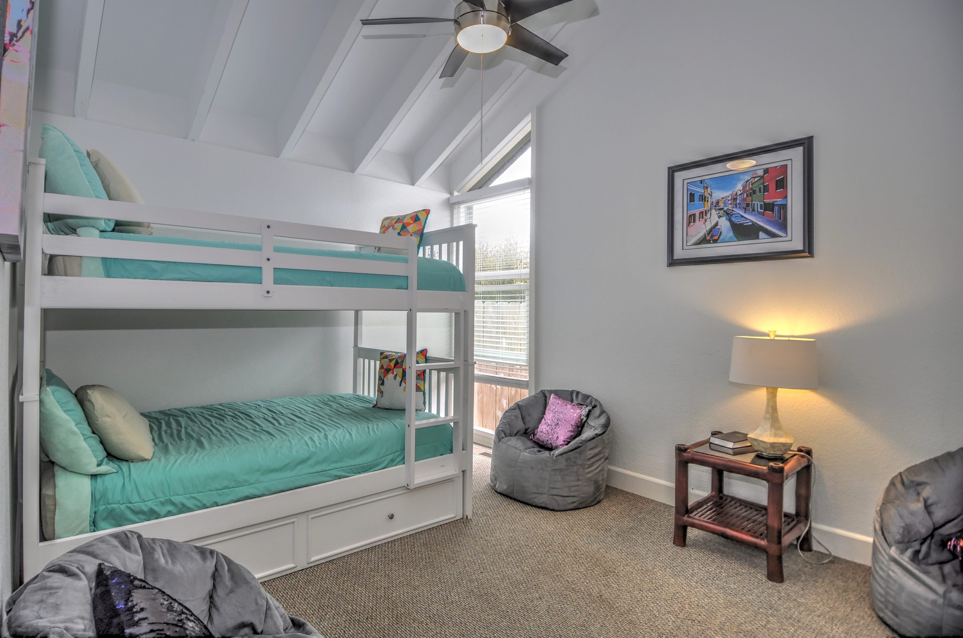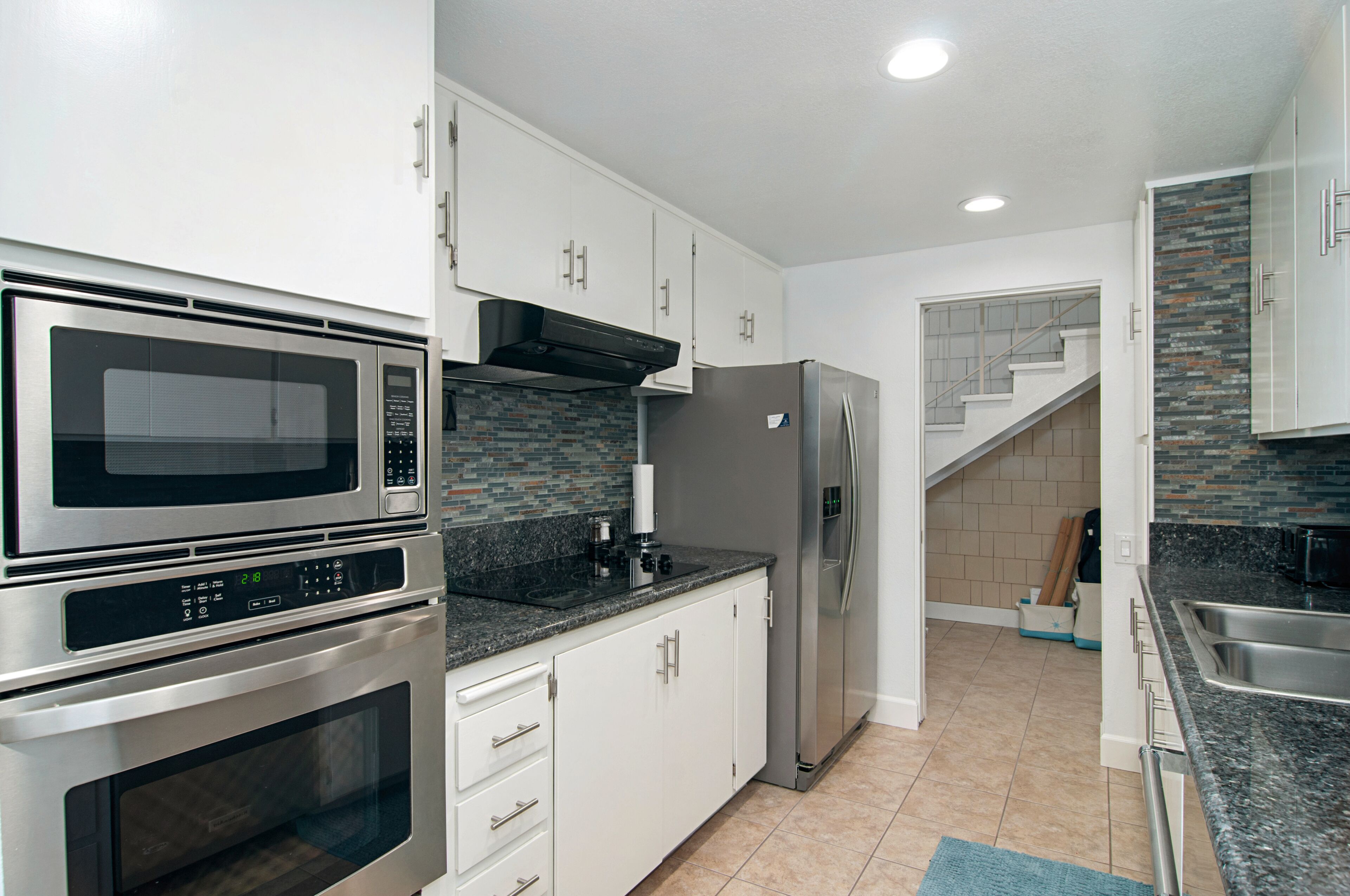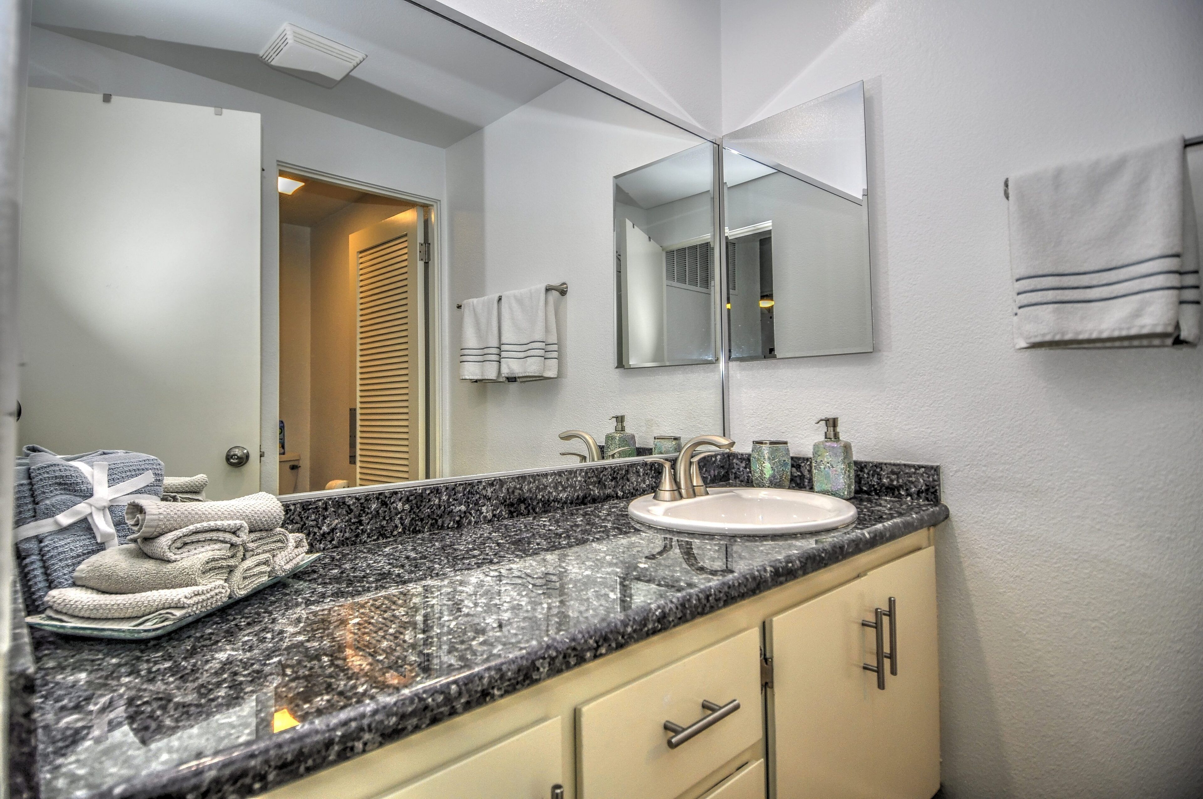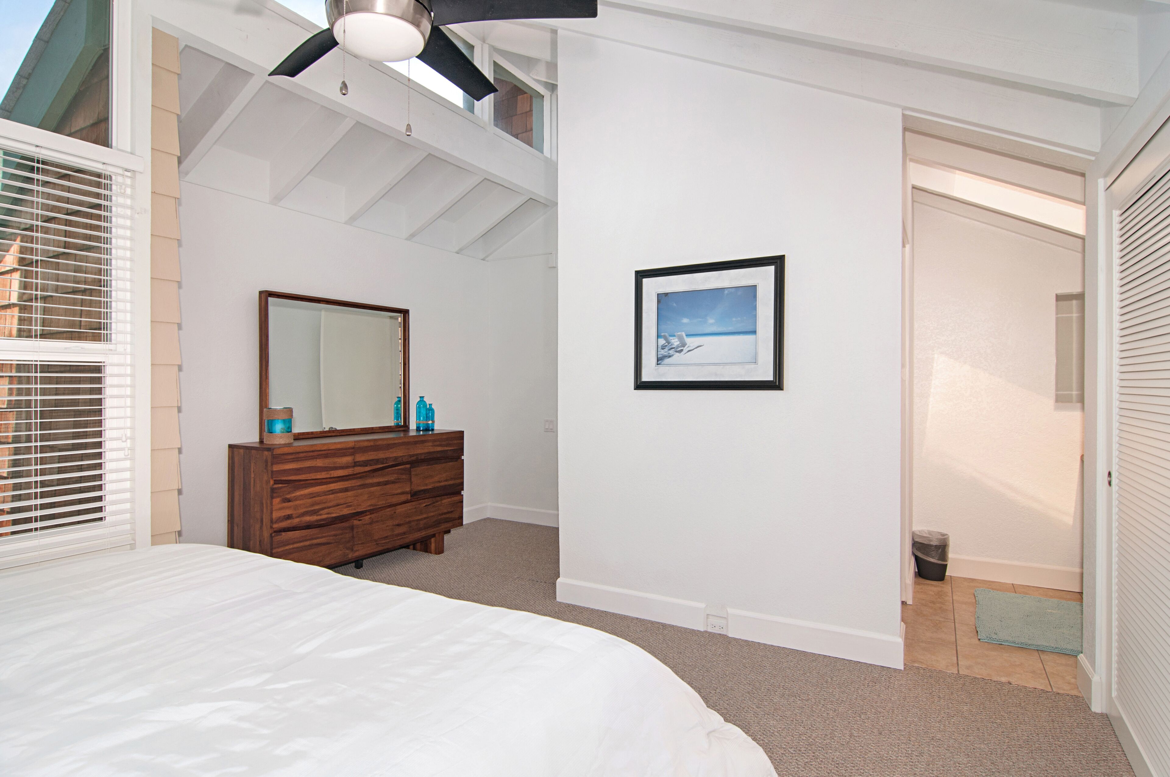 Stay and play in the Village by the Sea! Home is centered in the heart of Del Mar, walking distance to the beach, restaurants, shops, Del Mar Racetrack, and more. With an ocean view from the main living area, back patio, master bedroom, and grassy front yard, this home is ideal for relaxing and celebrating life in a setting suited for singles and families. Throughout the home, you will find open vaulted ceilings above classy, comfy furnishings flowing with a sand and sea theme creating it's own unique vibe. For ultimate comfort, ceiling fans hang in each room complimenting the air conditioning. Granite countertops, stainless steel appliances, and digital washer and dryer for the ease of being at your own home. The upstairs master is home to an exceptionally comfortable heavenly king size bed, sea colored Berber carpeting, saturated by closet and storage space. The upstairs bathroom is attached to the master, it has a beautiful spacious granite counter top, sand tiled flooring with a separated custom shower to open your days and eyes in style and close your days with soothing surroundings to melt you into bed. The 2nd bedroom nestles a cozy queen sized bed, fit for a queen. Sea colored Berber carpeting, with lots of closet space and a privacy wall outside the window, this room is a sweet sleeper! The 3rd bedroom is home to a full/full bunk bed with a twin trundle sitting atop sea stained Berber carpeting, accompanied by roomy closets. The f/f/t bunk/trundle provides plenty of room for kids but large and comfortable enough to accommodate the groups too! The downstairs shared bathroom is situated between bedroom 2 and 3, making it perfect for sharing. It presents a granite counter top, sand tiled floor sealed with a shower/bath combo. All bedrooms and bathrooms are sure to bring gratitude and comfort to all the days of your stay, no matter which side you get out of bed!