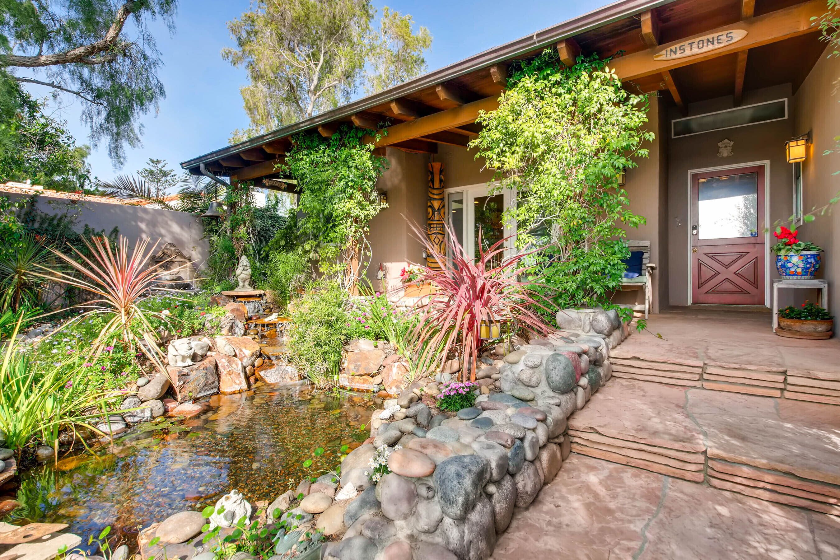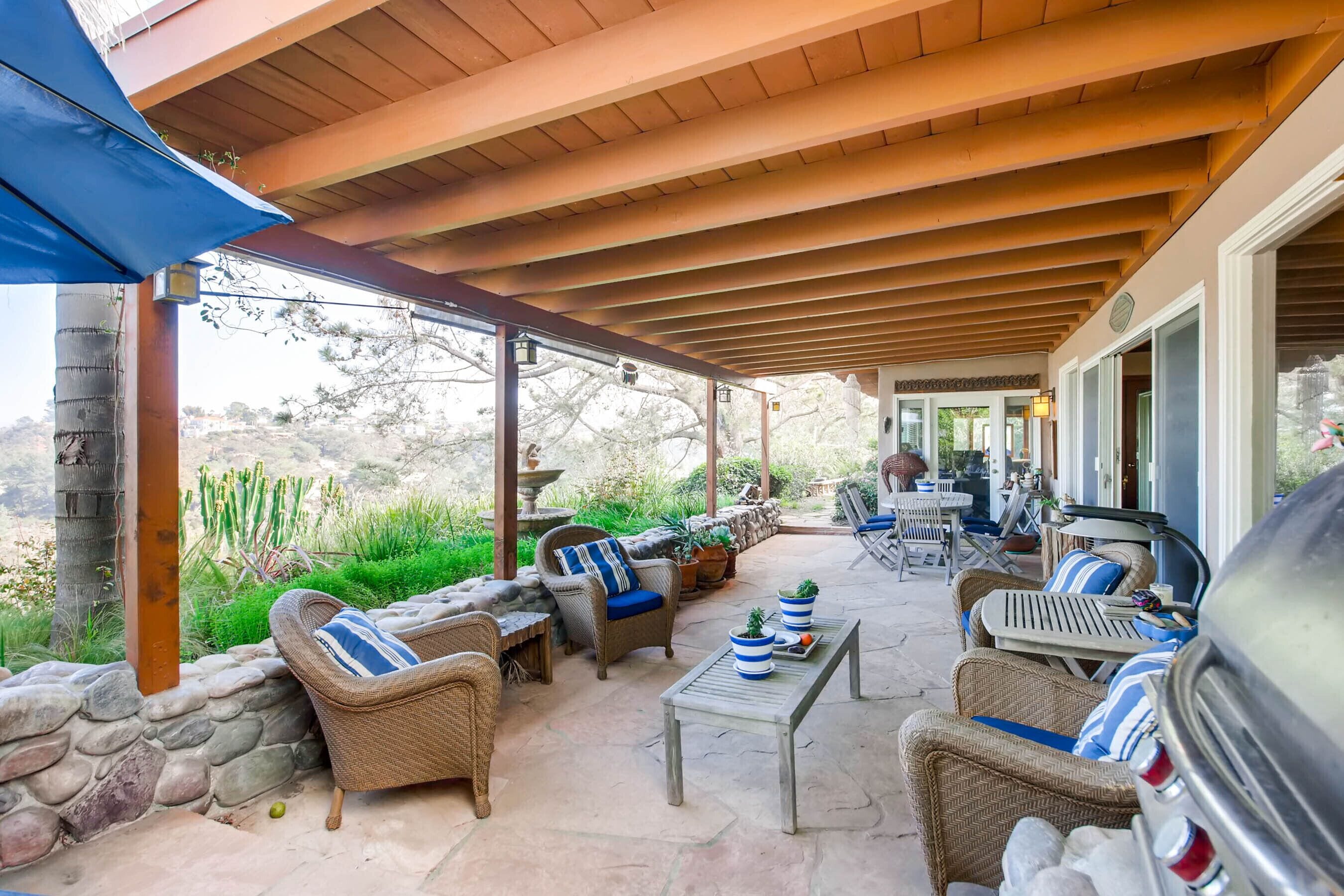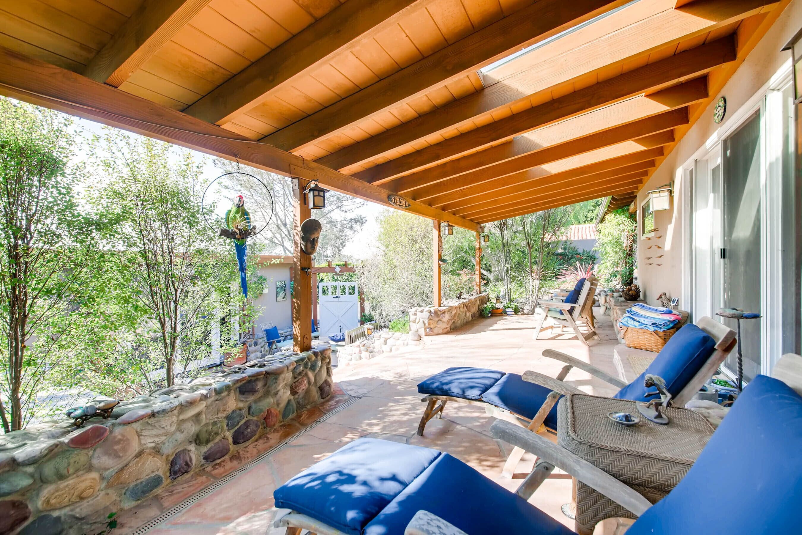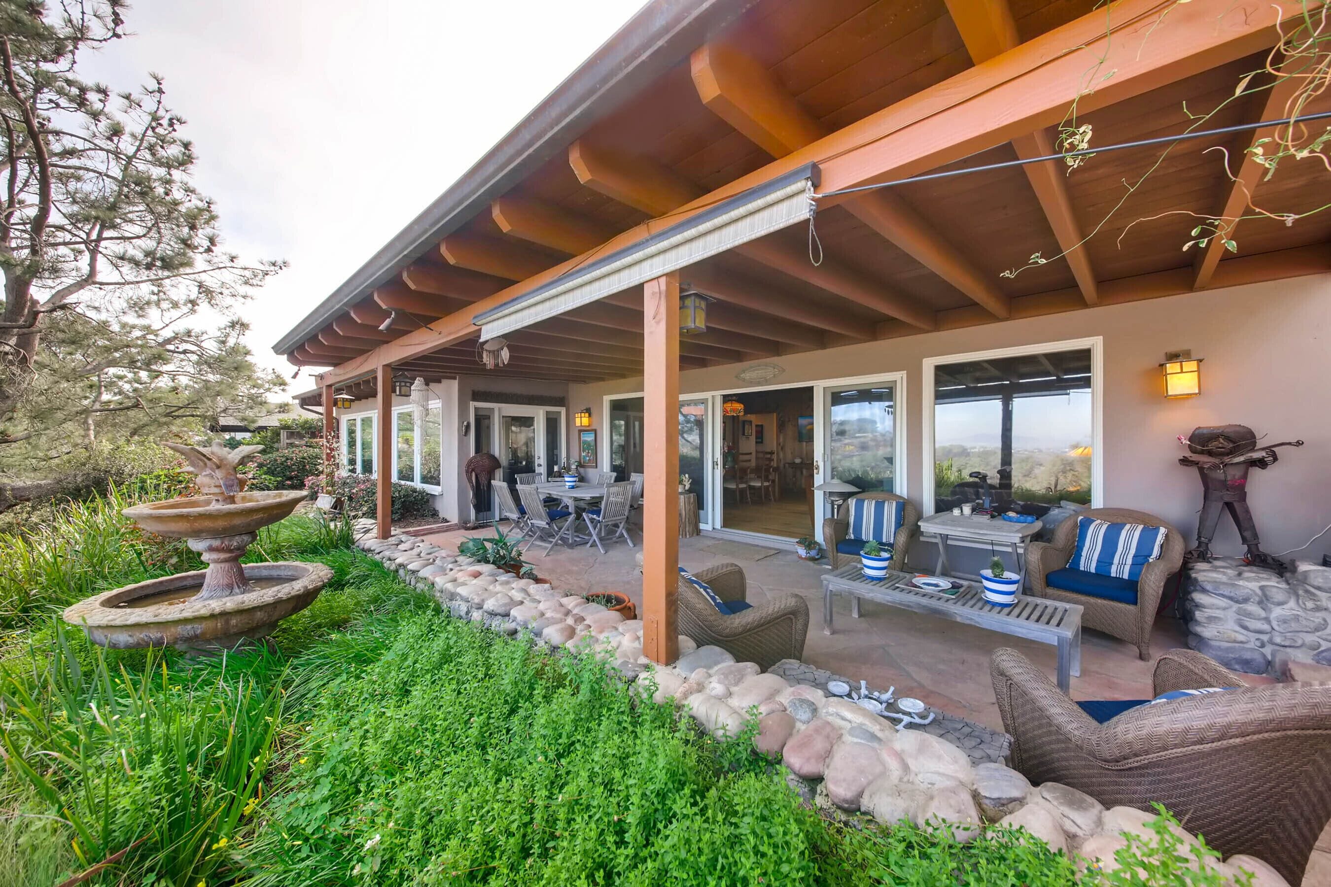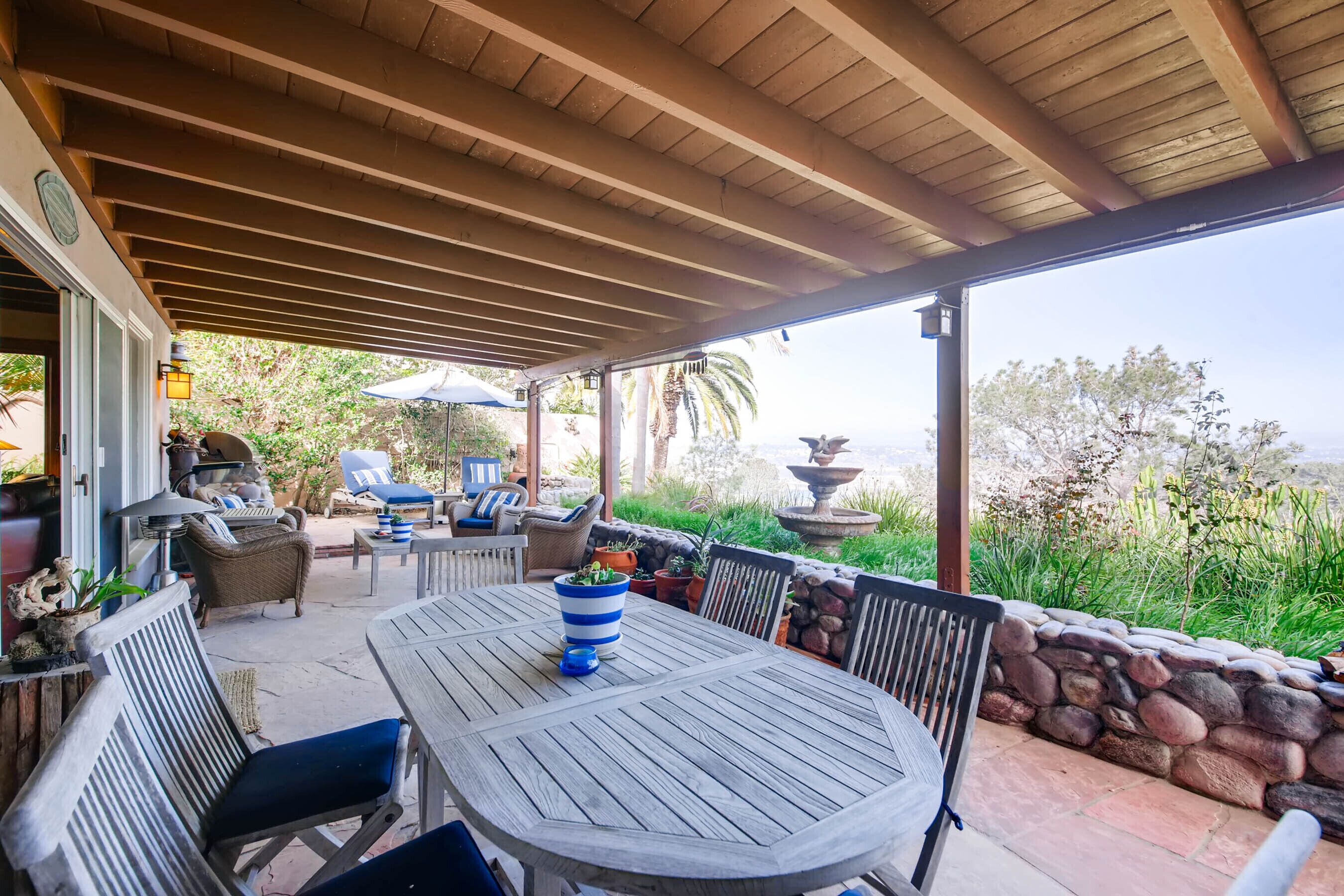 Del Mar Retreat on 2/3 Acre-Canyon, Ocean and Mountain views. Outdoor jacuzzi! Enjoy this special vacation home among the Torrey Pines in Olde Del Mar with ocean and canyon views, close to all, however with privacy and serenity. This beautifully furnished home accommodates 6 with 1 king sized bed, and 1 queen sized bed and two long twin beds. The open beam wood paneled living room offers a cozy oversized wood burning fireplace and opens to the wide veranda overlooking Crest Canyon and the easterly views of the mountains. There are 3 HD TV's one in the living room, one in the master bedroom, and one in the kitchen. The kitchen also features its own wood burning fireplace and is fully equipped with stainless steel appliances, flatware, serving dishes, and all entertaining necessities. Take a moment to enjoy the ambience of one of the three patios with the sound of the birds, fountains and waterfall from the pond. The spacious property also includes a very private outdoor shower, outdoor Sundance jacuzzi, outdoor barbeque, access to hiking trails in Crest Canyon, many great restaurants and abundant stores for shopping. There is plenty of private parking on the property for guests. The Del Mar Beach and Seagrove Park are within walking distance or just a short drive if preferred. It's truly a (re)treat to stay in this home. A Magical Place!The owner will require guest to sign the included Short Term Rental Agreement and Rental Rules and Addendums and provide a valid drivers license in order to gain occupancy to the property.