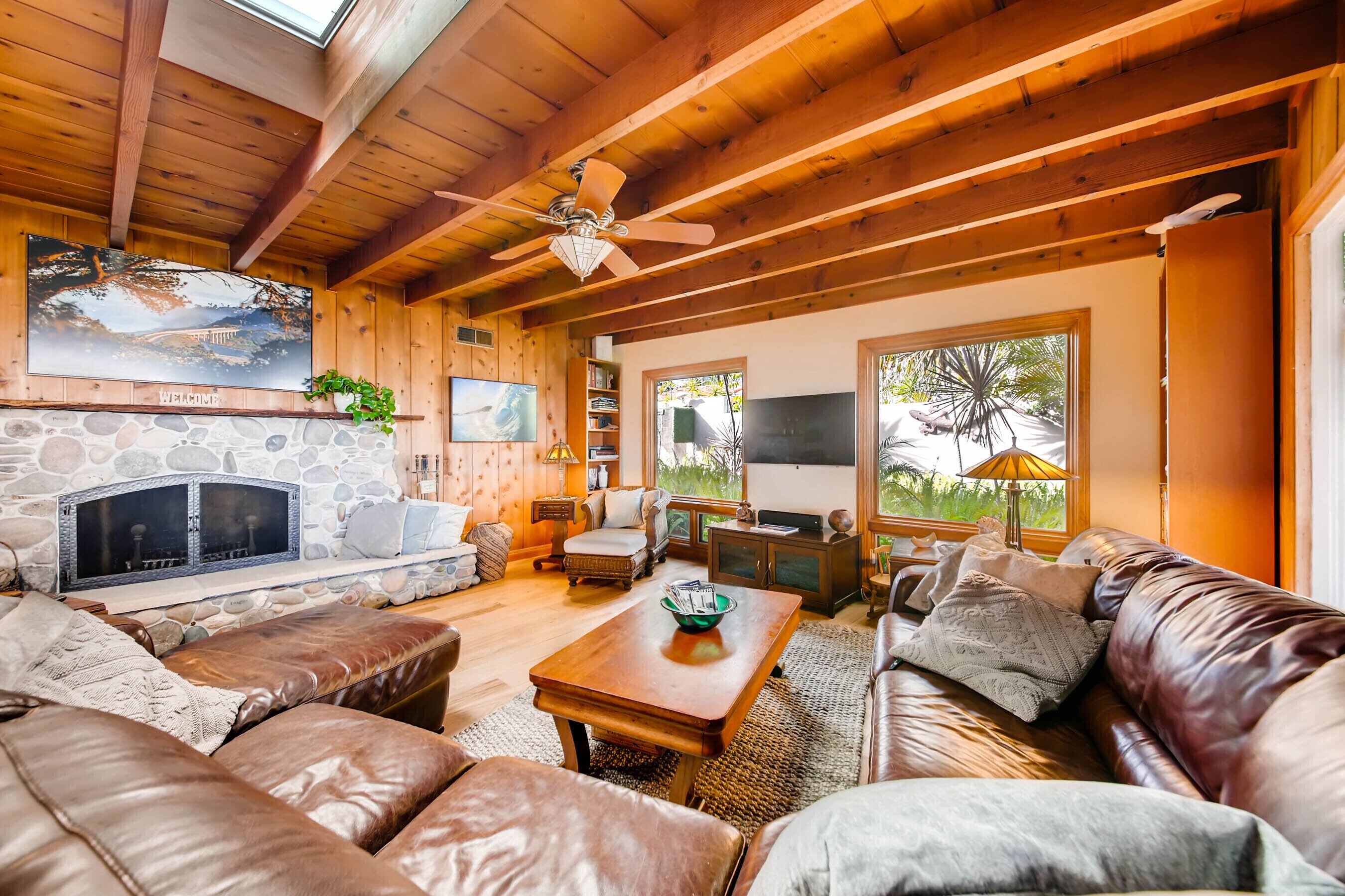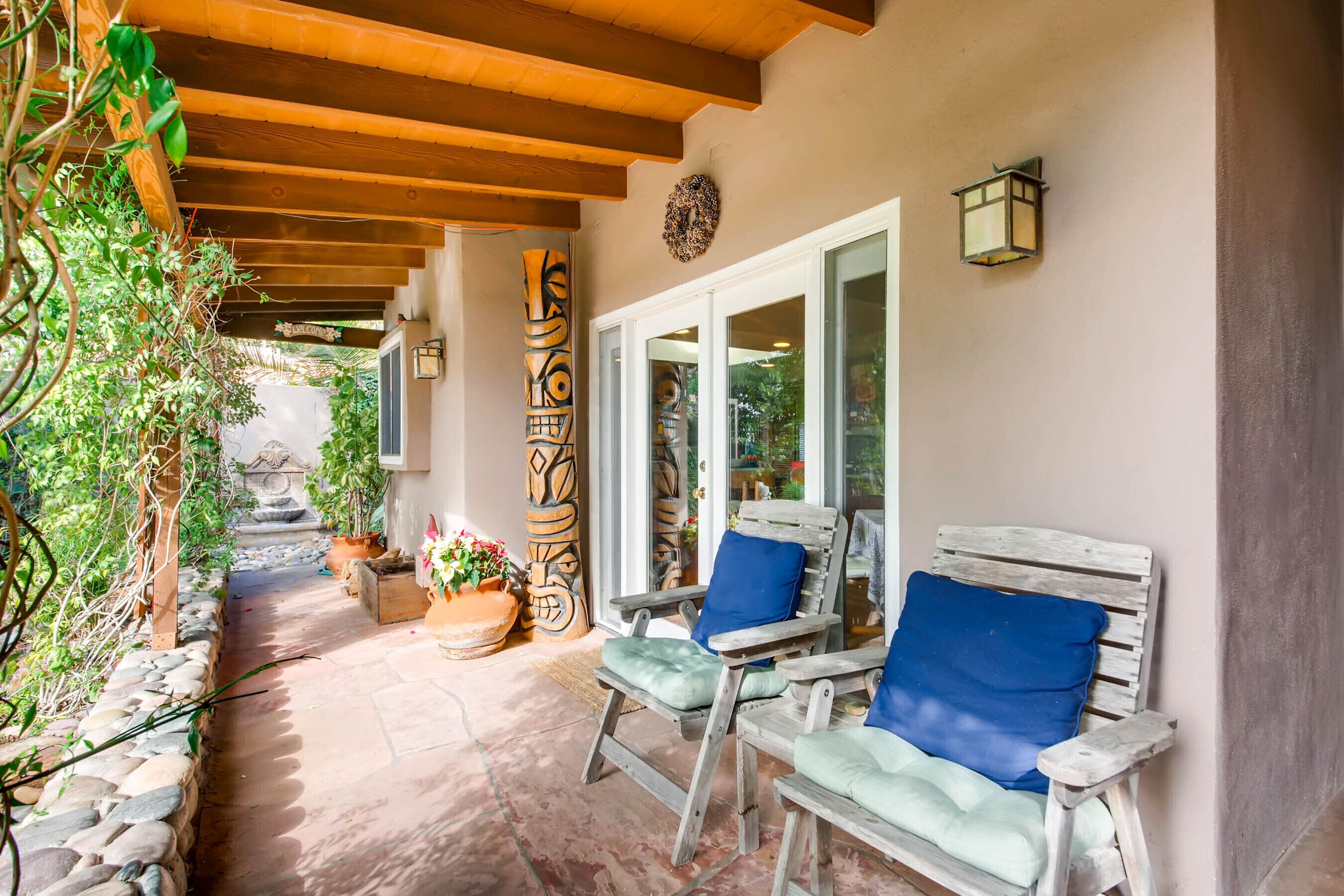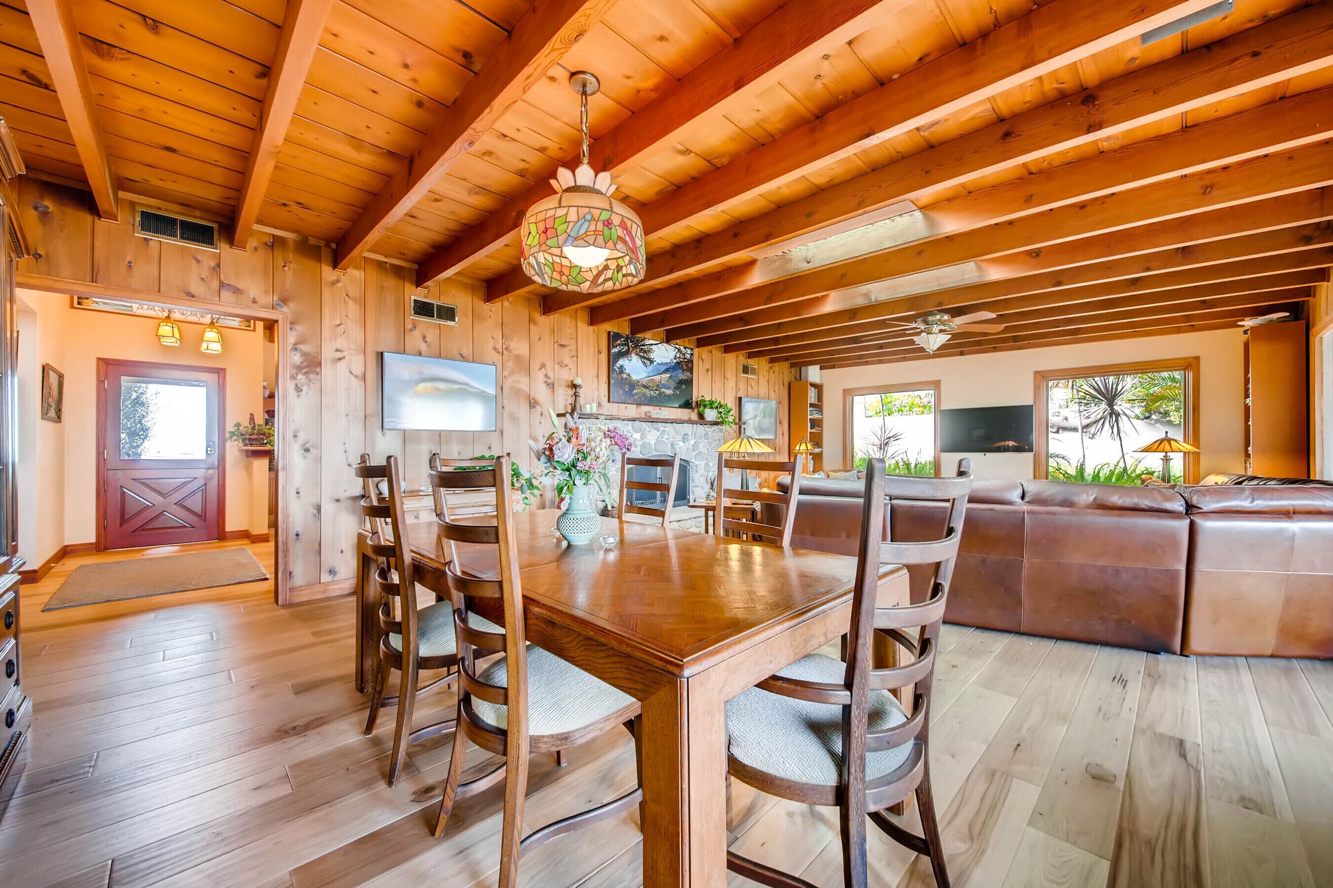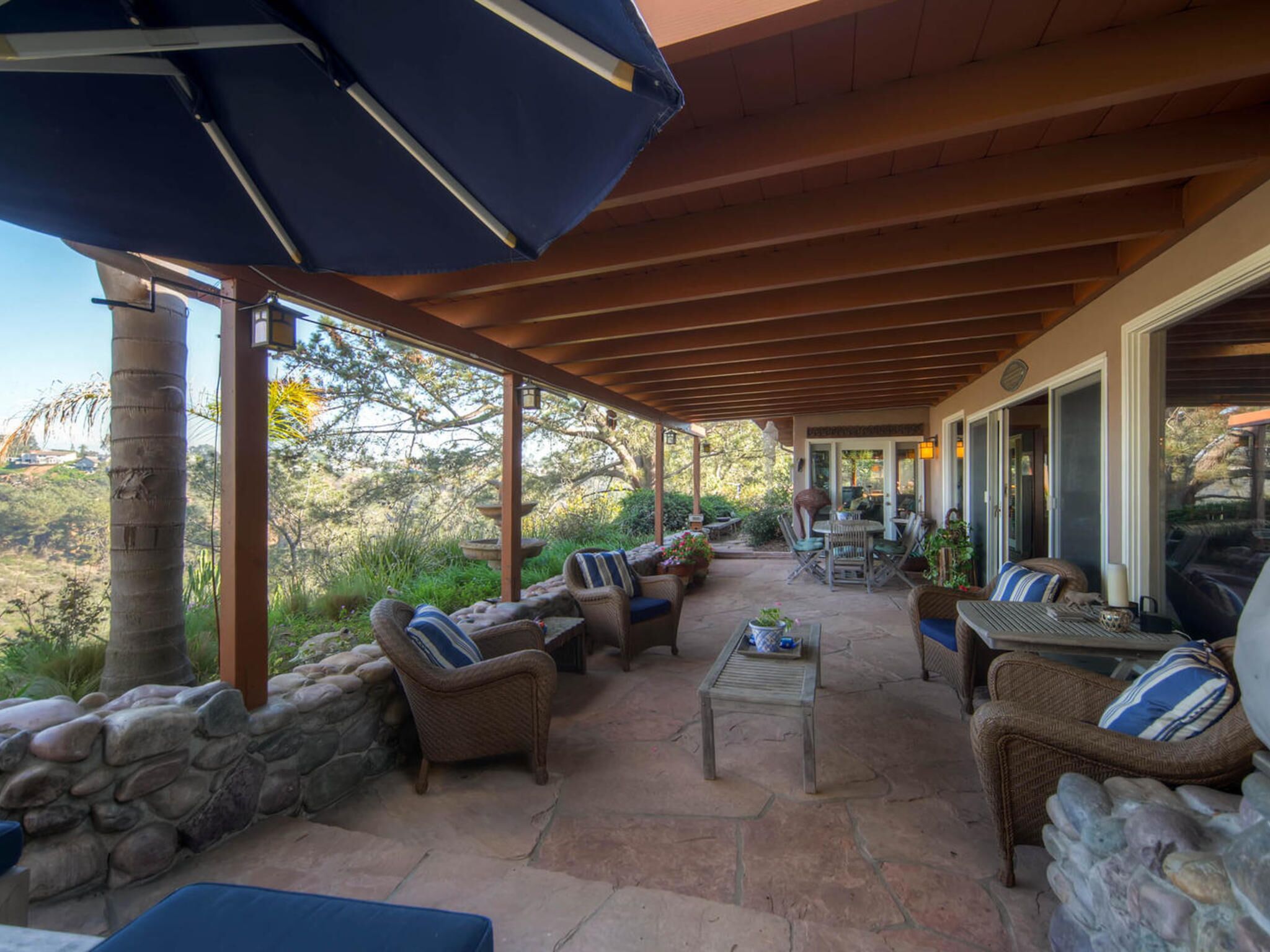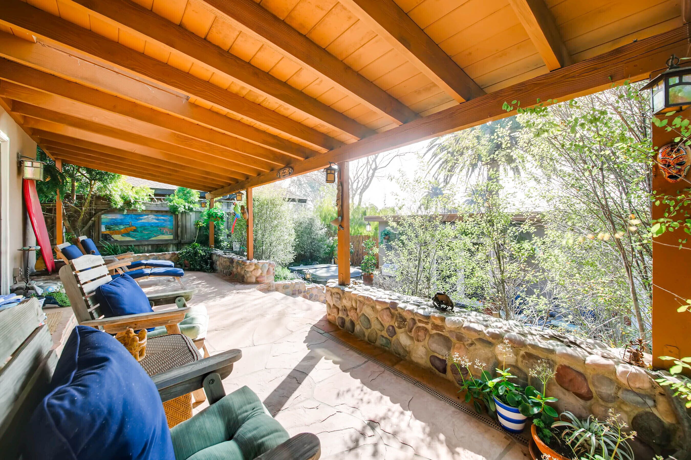 Del Mar Retreat on 2/3 Acre-Canyon, Ocean and Mountain views. Outdoor jacuzzi! Enjoy this special vacation home among the Torrey Pines in Olde Del Mar with ocean and canyon views, close to all, however with privacy and serenity. This beautifully furnished home accommodates 6 with 1 king sized bed, and 1 queen sized bed and two long twin beds. The open beam wood paneled living room offers a cozy oversized wood burning fireplace and opens to the wide veranda overlooking Crest Canyon and the easterly views of the mountains. There are 3 HD TV's one in the living room, one in the master bedroom, and one in the kitchen. The kitchen also features its own wood burning fireplace and is fully equipped with stainless steel appliances, flatware, serving dishes, and all entertaining necessities. Take a moment to enjoy the ambience of one of the three patios with the sound of the birds, fountains and waterfall from the pond. The spacious property also includes a very private outdoor shower, outdoor Sundance jacuzzi, outdoor barbeque, access to hiking trails in Crest Canyon, many great restaurants and abundant stores for shopping. There is plenty of private parking on the property for guests. The Del Mar Beach and Seagrove Park are within walking distance or just a short drive if preferred. It's truly a (re)treat to stay in this home. A Magical Place!The owner will require guest to sign the included Short Term Rental Agreement and Rental Rules and Addendums and provide a valid drivers license in order to gain occupancy to the property.