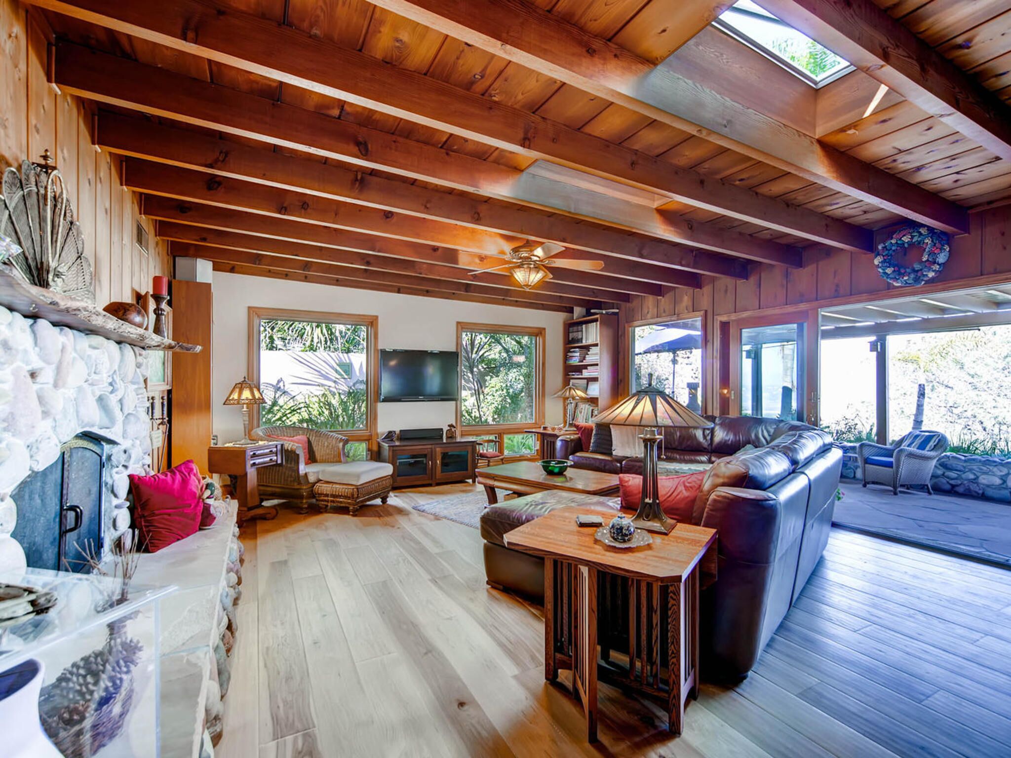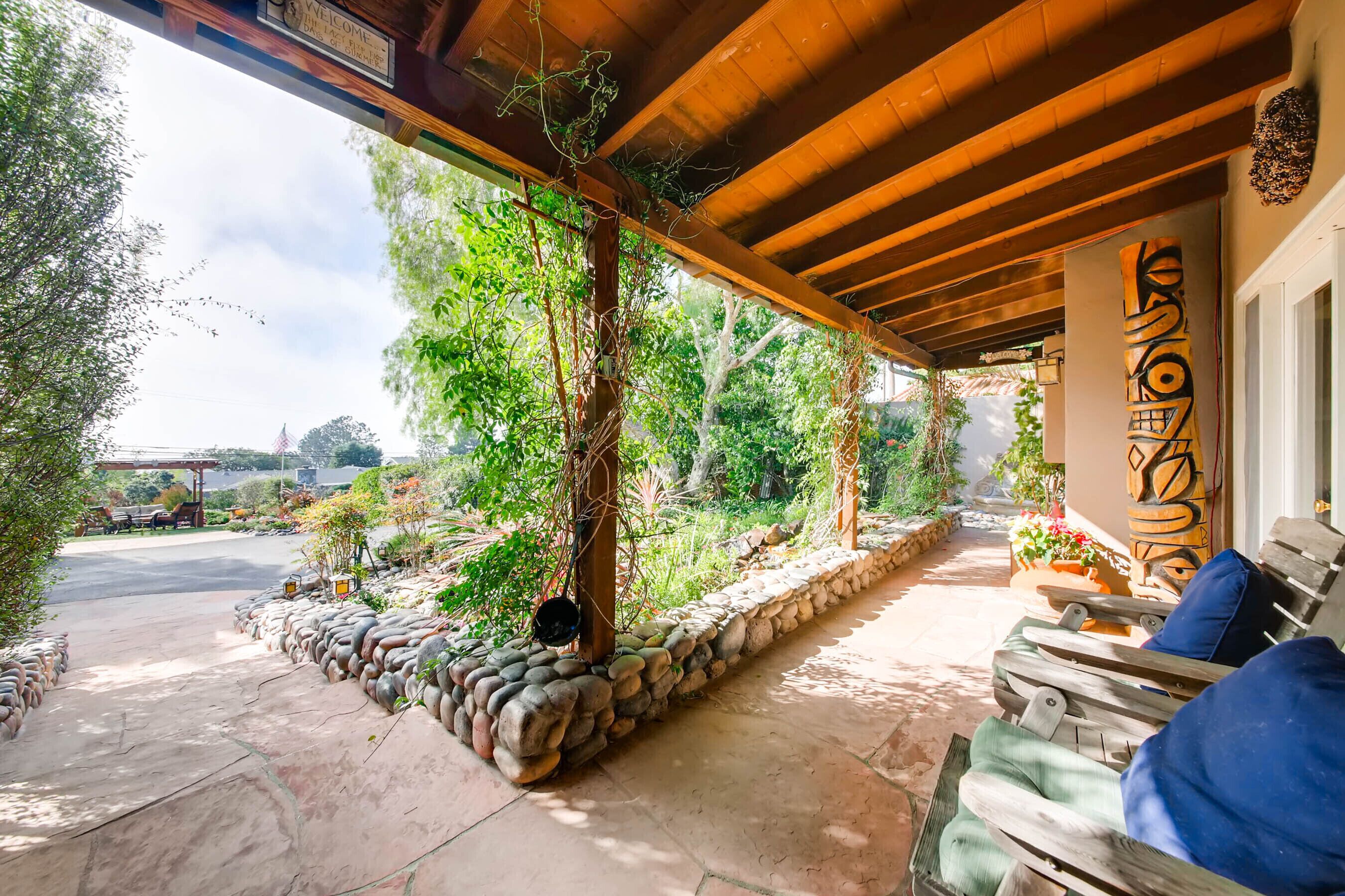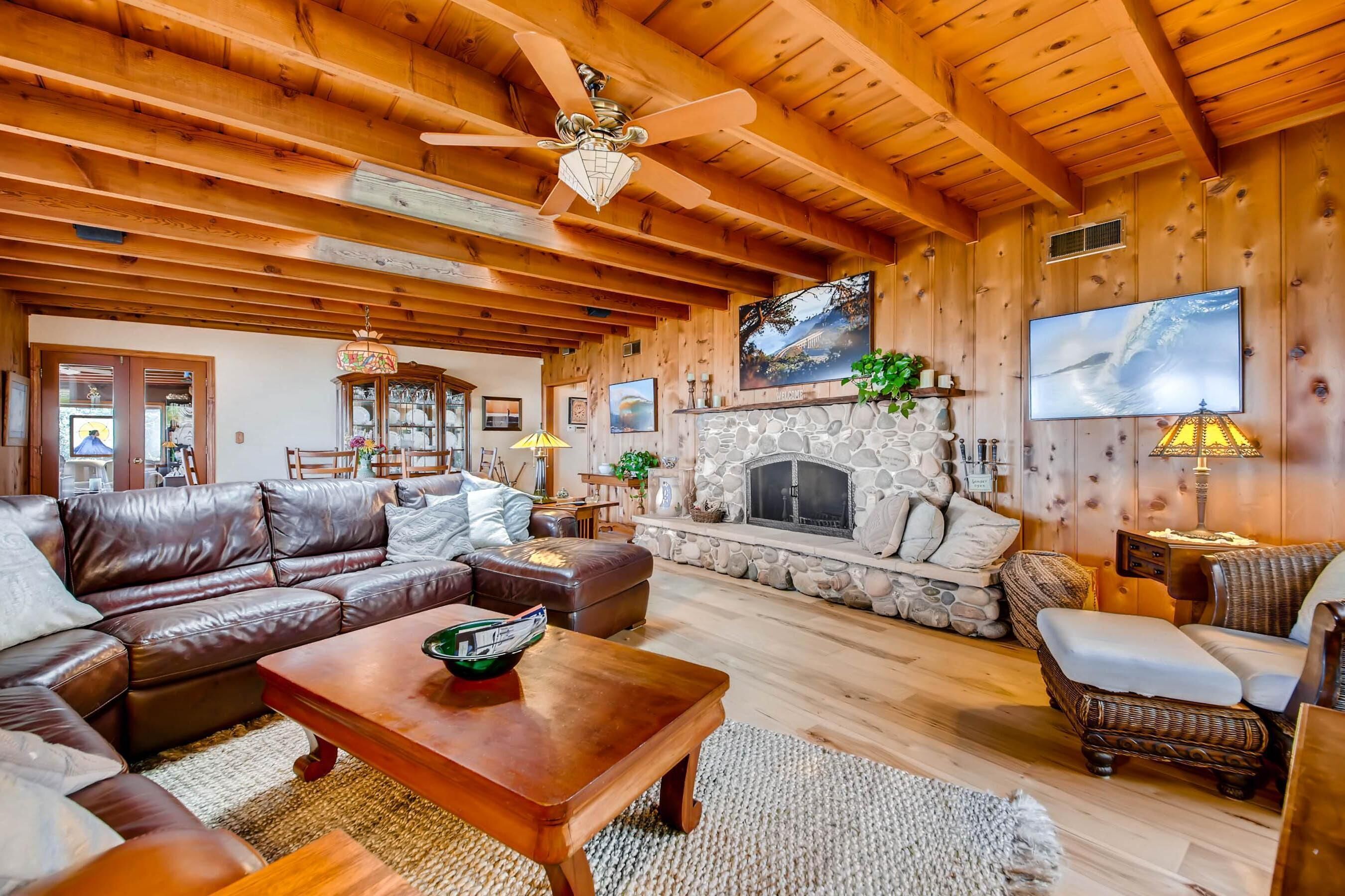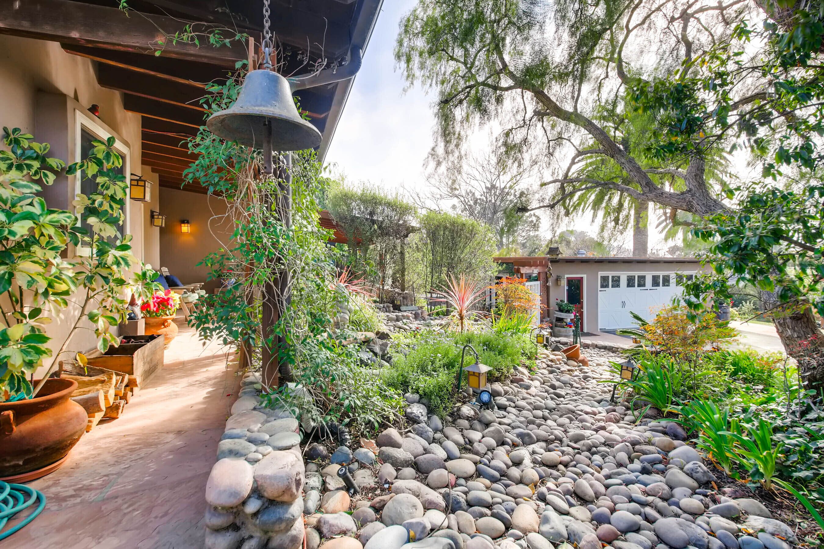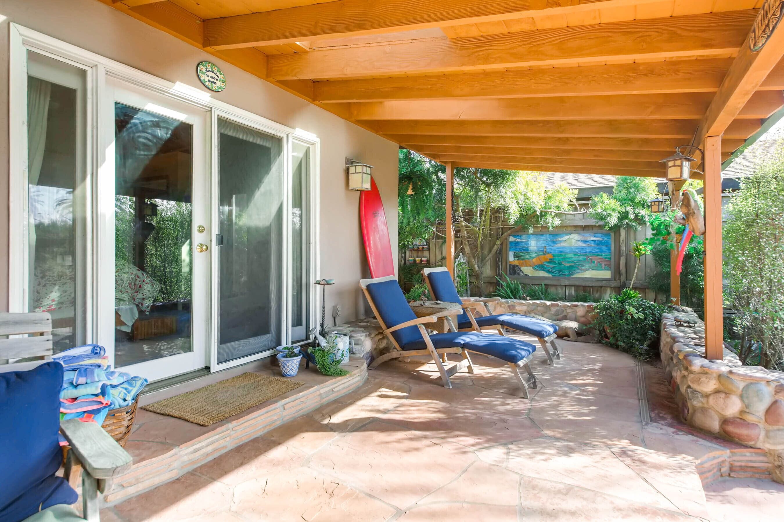 Del Mar Retreat on 2/3 Acre-Canyon, Ocean and Mountain views. Outdoor jacuzzi! Enjoy this special vacation home among the Torrey Pines in Olde Del Mar with ocean and canyon views, close to all, however with privacy and serenity. This beautifully furnished home accommodates 6 with 1 king sized bed, and 1 queen sized bed and two long twin beds. The open beam wood paneled living room offers a cozy oversized wood burning fireplace and opens to the wide veranda overlooking Crest Canyon and the easterly views of the mountains. There are 3 HD TV's one in the living room, one in the master bedroom, and one in the kitchen. The kitchen also features its own wood burning fireplace and is fully equipped with stainless steel appliances, flatware, serving dishes, and all entertaining necessities. Take a moment to enjoy the ambience of one of the three patios with the sound of the birds, fountains and waterfall from the pond. The spacious property also includes a very private outdoor shower, outdoor Sundance jacuzzi, outdoor barbeque, access to hiking trails in Crest Canyon, many great restaurants and abundant stores for shopping. There is plenty of private parking on the property for guests. The Del Mar Beach and Seagrove Park are within walking distance or just a short drive if preferred. It's truly a (re)treat to stay in this home. A Magical Place!The owner will require guest to sign the included Short Term Rental Agreement and Rental Rules and Addendums and provide a valid drivers license in order to gain occupancy to the property.