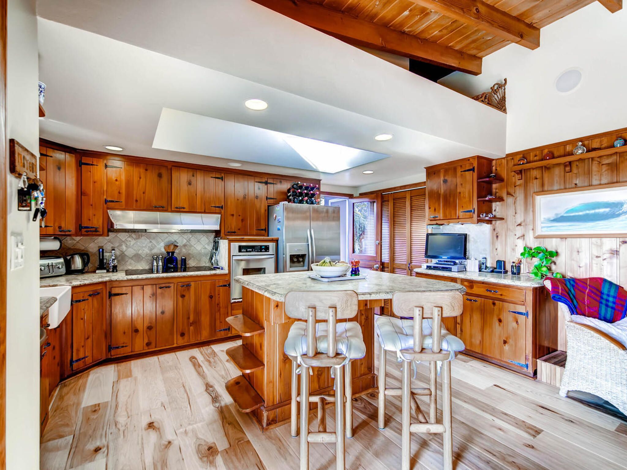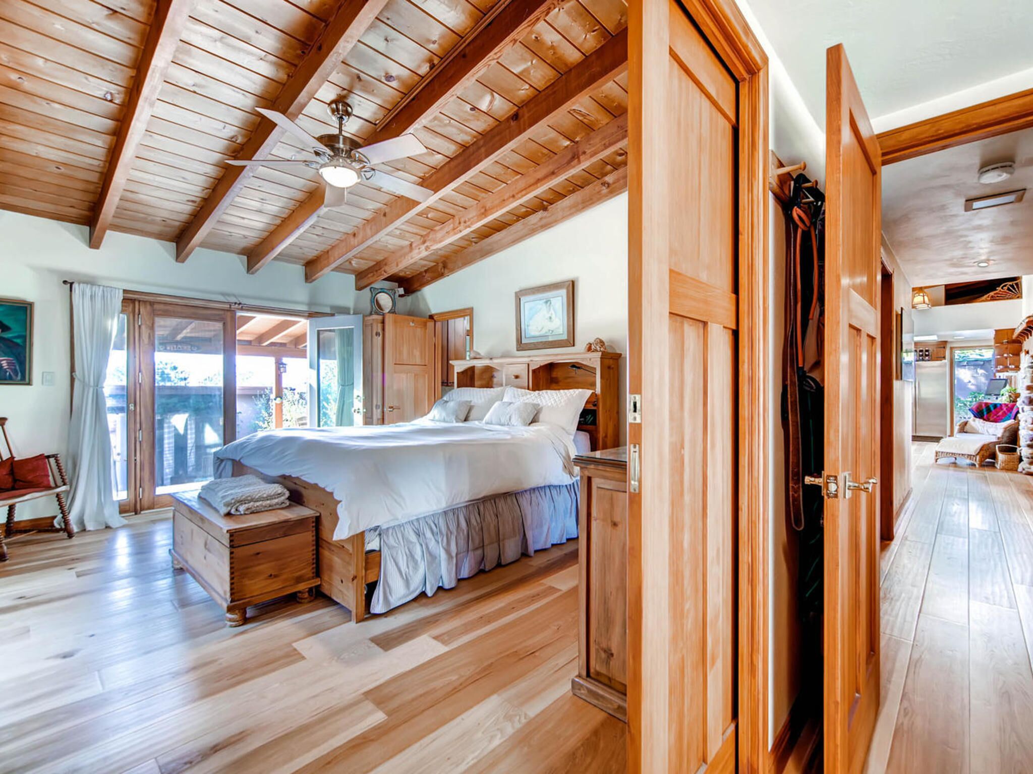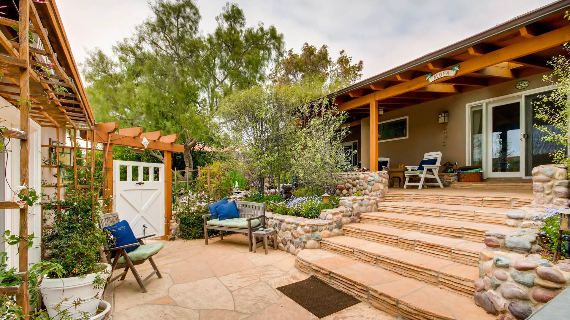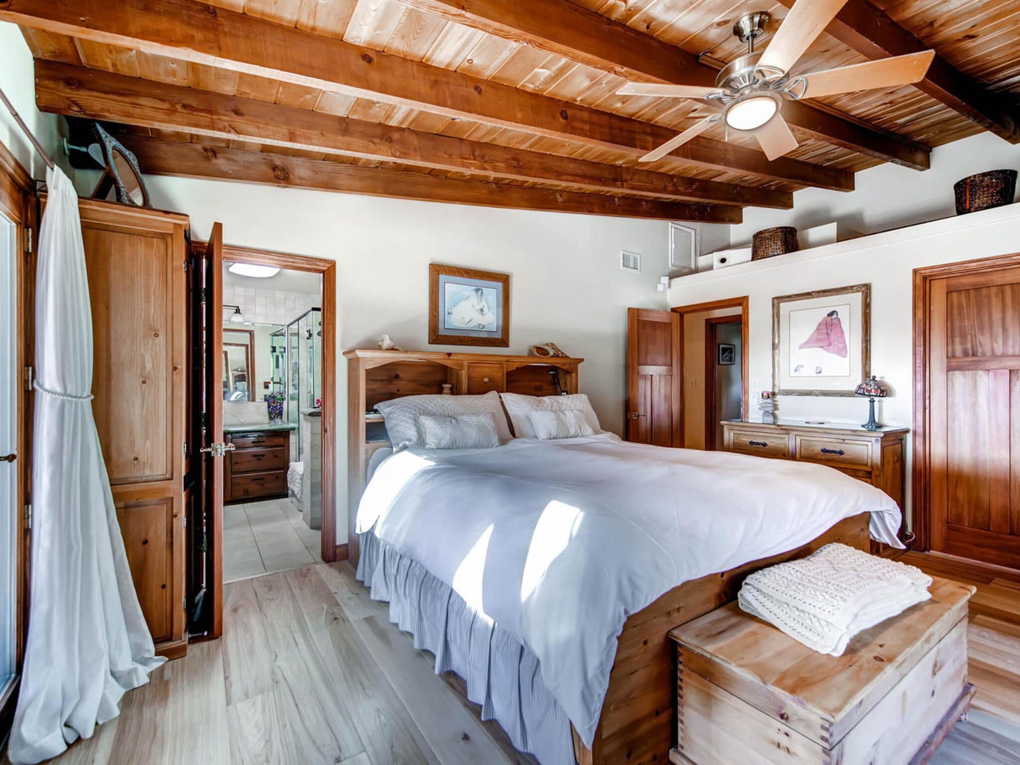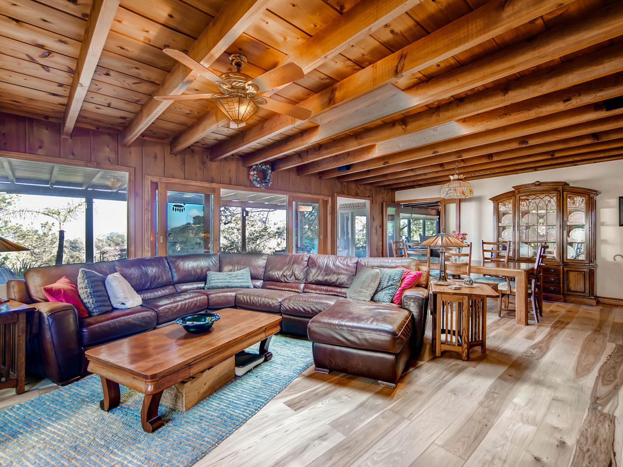 Del Mar Retreat on 2/3 Acre-Canyon, Ocean and Mountain views. Outdoor jacuzzi! Enjoy this special vacation home among the Torrey Pines in Olde Del Mar with ocean and canyon views, close to all, however with privacy and serenity. This beautifully furnished home accommodates 6 with 1 king sized bed, and 1 queen sized bed and two long twin beds. The open beam wood paneled living room offers a cozy oversized wood burning fireplace and opens to the wide veranda overlooking Crest Canyon and the easterly views of the mountains. There are 3 HD TV's one in the living room, one in the master bedroom, and one in the kitchen. The kitchen also features its own wood burning fireplace and is fully equipped with stainless steel appliances, flatware, serving dishes, and all entertaining necessities. Take a moment to enjoy the ambience of one of the three patios with the sound of the birds, fountains and waterfall from the pond. The spacious property also includes a very private outdoor shower, outdoor Sundance jacuzzi, outdoor barbeque, access to hiking trails in Crest Canyon, many great restaurants and abundant stores for shopping. There is plenty of private parking on the property for guests. The Del Mar Beach and Seagrove Park are within walking distance or just a short drive if preferred. It's truly a (re)treat to stay in this home. A Magical Place!The owner will require guest to sign the included Short Term Rental Agreement and Rental Rules and Addendums and provide a valid drivers license in order to gain occupancy to the property.