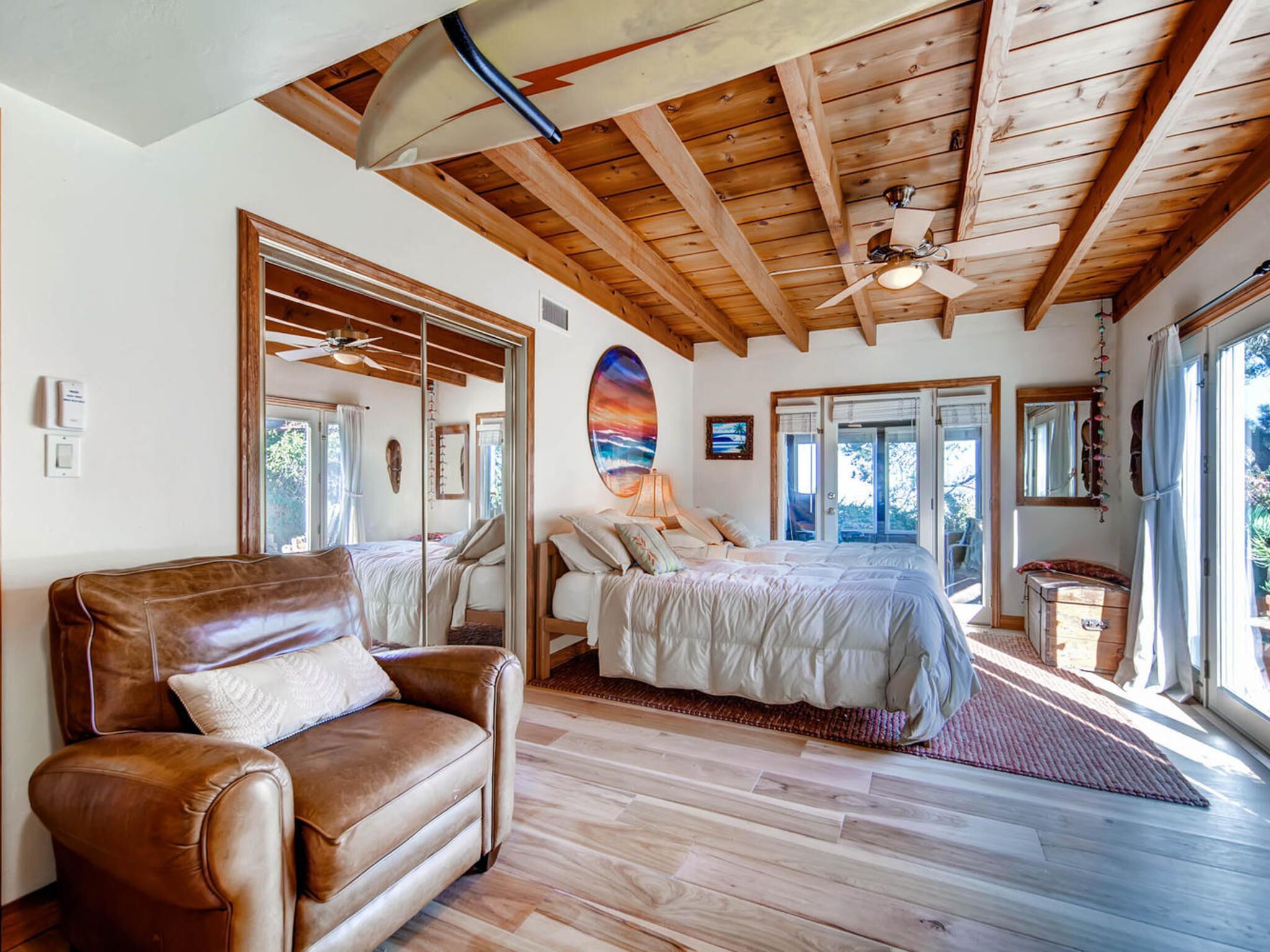 Del Mar Retreat on 2/3 Acre-Canyon, Ocean and Mountain views. Outdoor jacuzzi! Enjoy this special vacation home among the Torrey Pines in Olde Del Mar with ocean and canyon views, close to all, however with privacy and serenity. This beautifully furnished home accommodates 6 with 1 king sized bed, and 1 queen sized bed and two long twin beds. The open beam wood paneled living room offers a cozy...