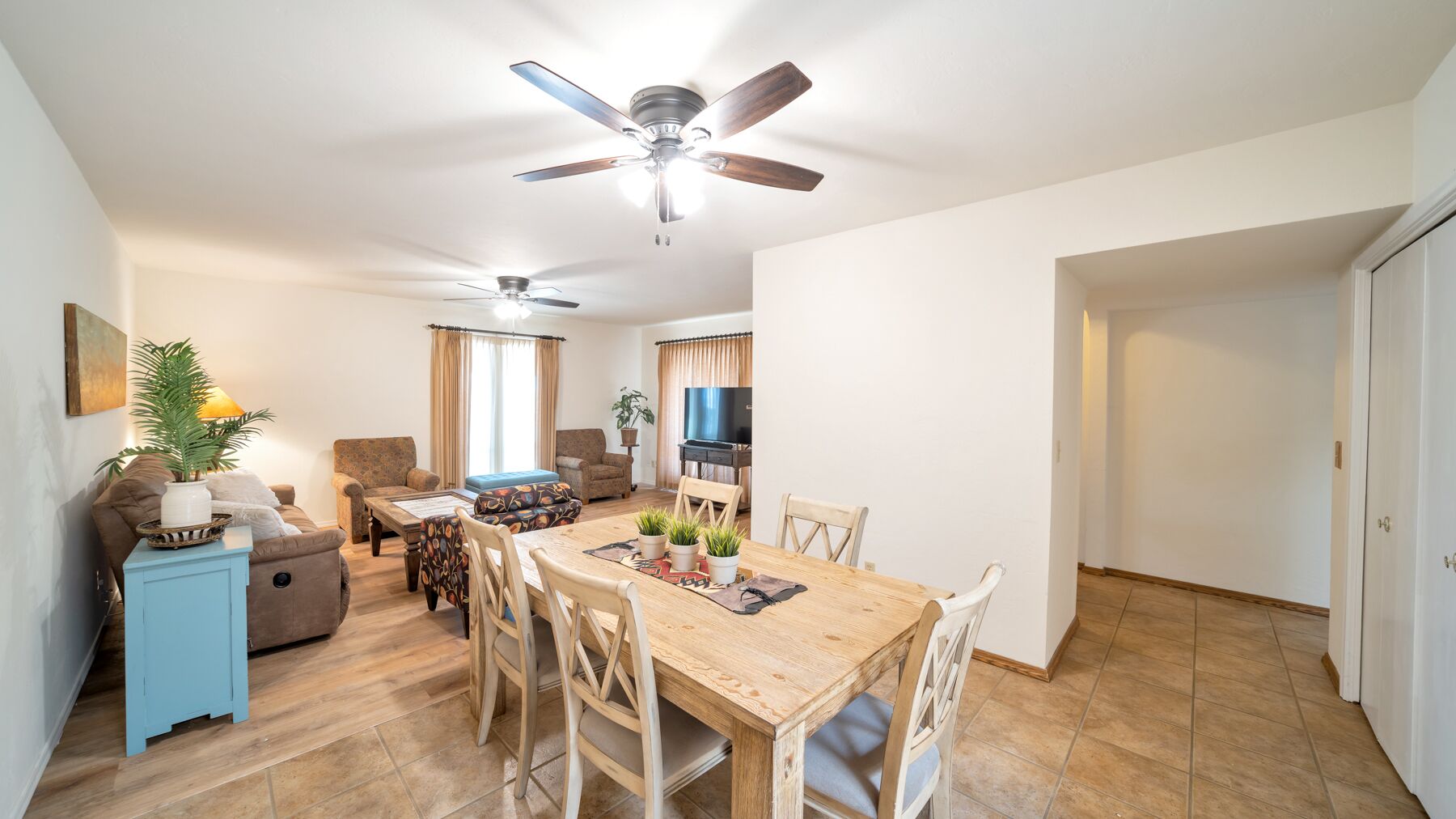Entire 1500 sqft 2bed 2bath access to the pool don't be cramped in a room! Welcome to this 1500 sqft townhome in Casa Paloma 1. Located in Green Valley, Arizona, for active adults and retirees ages 55 and better. Don't be cramped in a room. This home has 2 bedroom, 2 bathrooms, 2 carport spaces, a covered gated front patio, an enclosed back patio an office space and a gated backyard. You will enter through the spacious covered patio where you can enjoy your morning and evening beverage with beautiful views of the mountain. The bedrooms are to your left. The Guest bedroom accommodates a queen bed set, a TV and the views of the mountains. The guest bathroom is a tub and shower combo. The Master has a King bed set, a his and her closet, a TV, a full length mirror, and a walk in shower in the bathroom. The great room is a large light and bright open space with reclining sofa and chair, a 55" smart TV for a quiet movie night. Meal prepping is a breeze in the functional galley kitchen. The dining set seats six comfortably. There's an extra space for multi purpose use of an office or craft or exercise room. Access to Green Valley Rec satellite center that has 32×70 foot sparkling swimming pool with an adjacent spa, shuffleboard courts with shaded seating, horseshoes, and a multipurpose room with a kitchenette. It is walking distance. Green Valley AZ is just 25 miles south of Tucson. It offers the best of both worlds: quiet residential streets in a stunning desert setting coupled with easy access to a vibrant, bustling city. This is the space you need to enjoy your vacation. Come home & relax here after enjoying outdoor activities that Arizona offers.