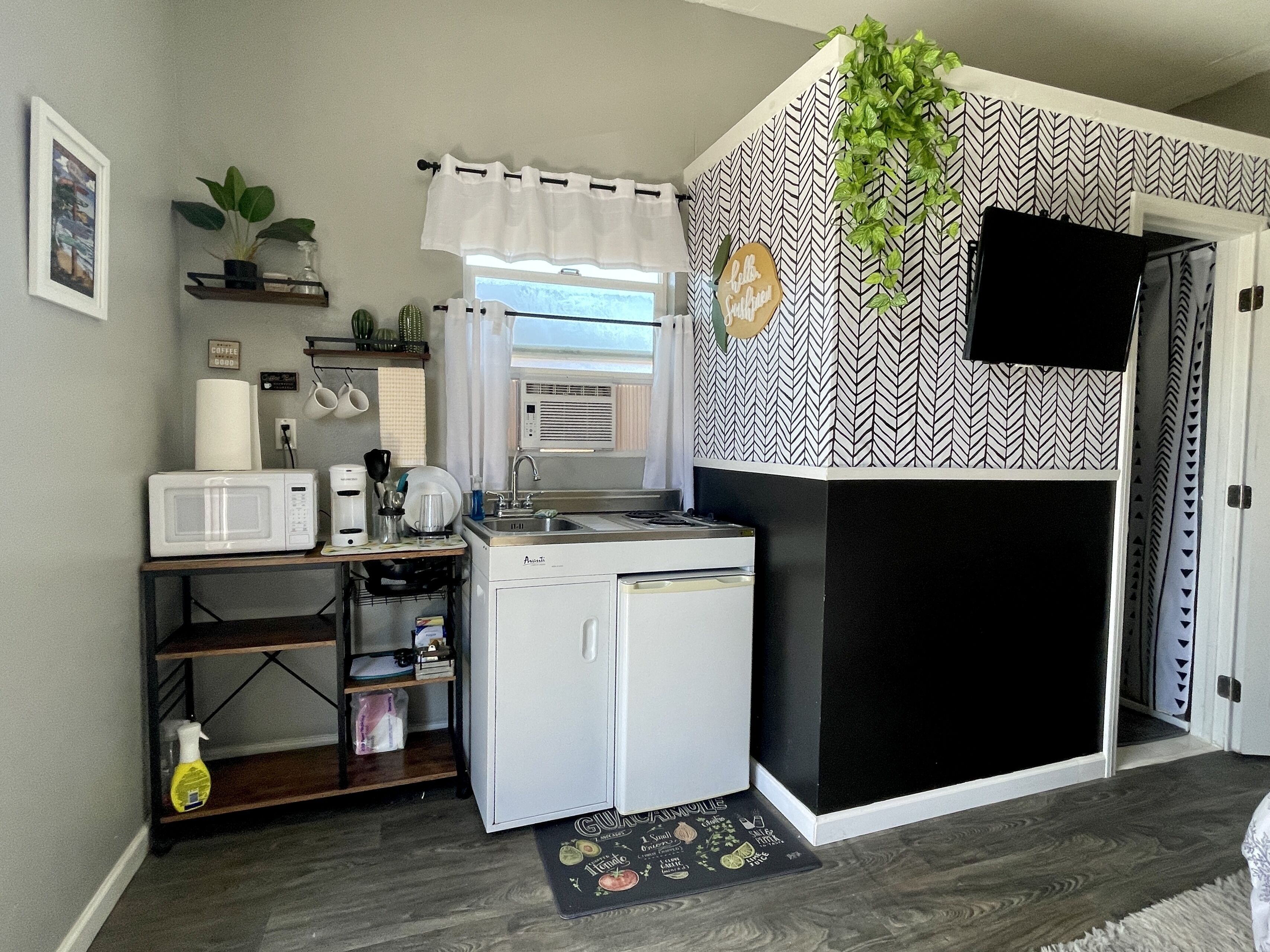 Cozy Studio Super cozy studio ready to be your home away from home. Lemon Drop is small but extremely functional.Slumber on a firm Queen mattress and enjoy streaming on the tv. It’s equipped with a mini fridge, two burner electric stove, coffee maker, microwave, outdoor private patio area. Street parking. Lemon drop is behind the main house currently occupied by tenants, there is one shared wall. Entrance is private and away from Main Street.