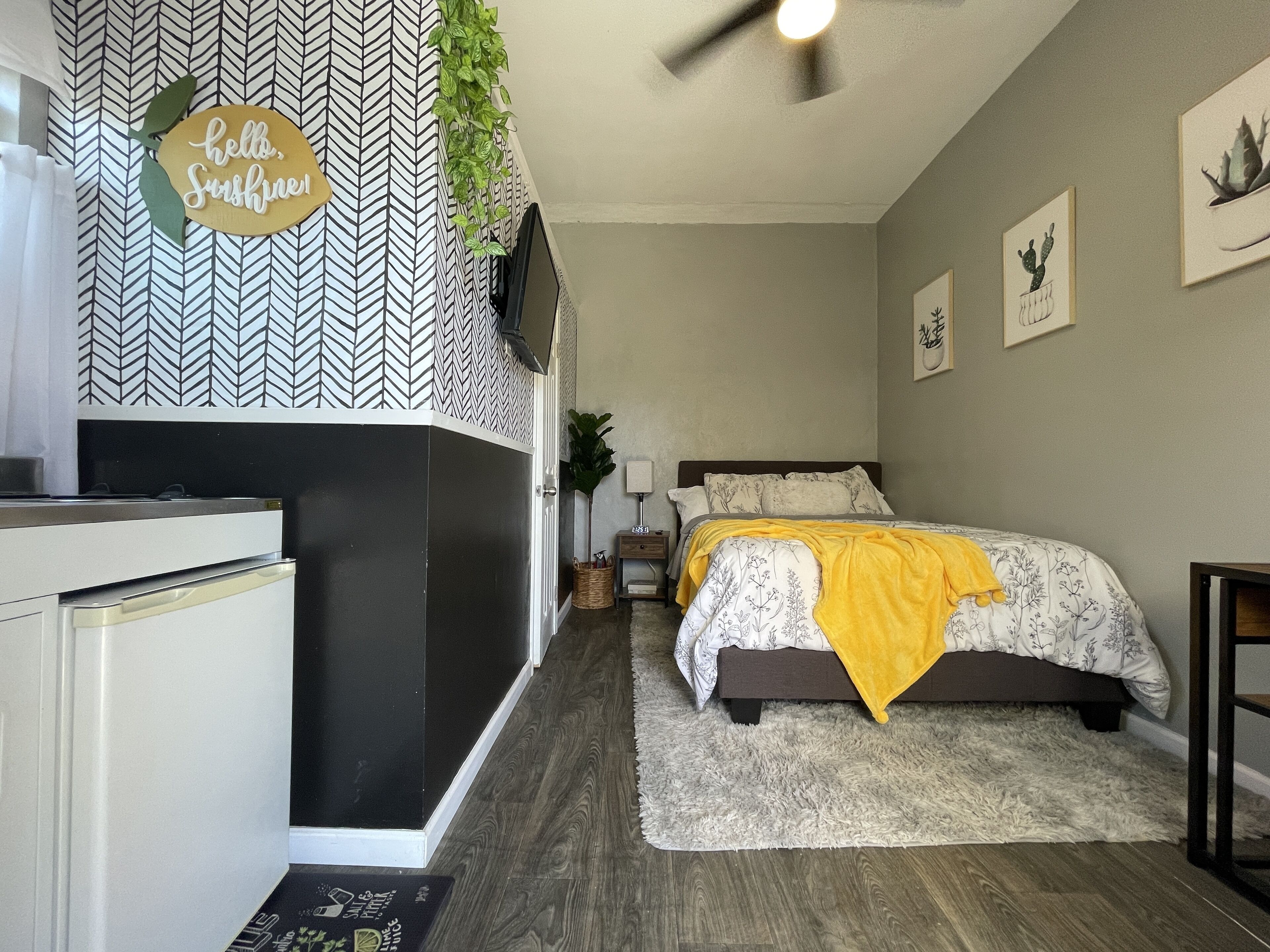 Cozy Studio Super cozy studio ready to be your home away from home. Lemon Drop is small but extremely functional.Slumber on a firm Queen mattress and enjoy streaming on the tv. It’s equipped with a mini fridge, two burner electric stove, coffee maker, microwave, outdoor private patio area. Street parking. Lemon drop is behind the main house currently occupied by tenants, there is one shared wall....