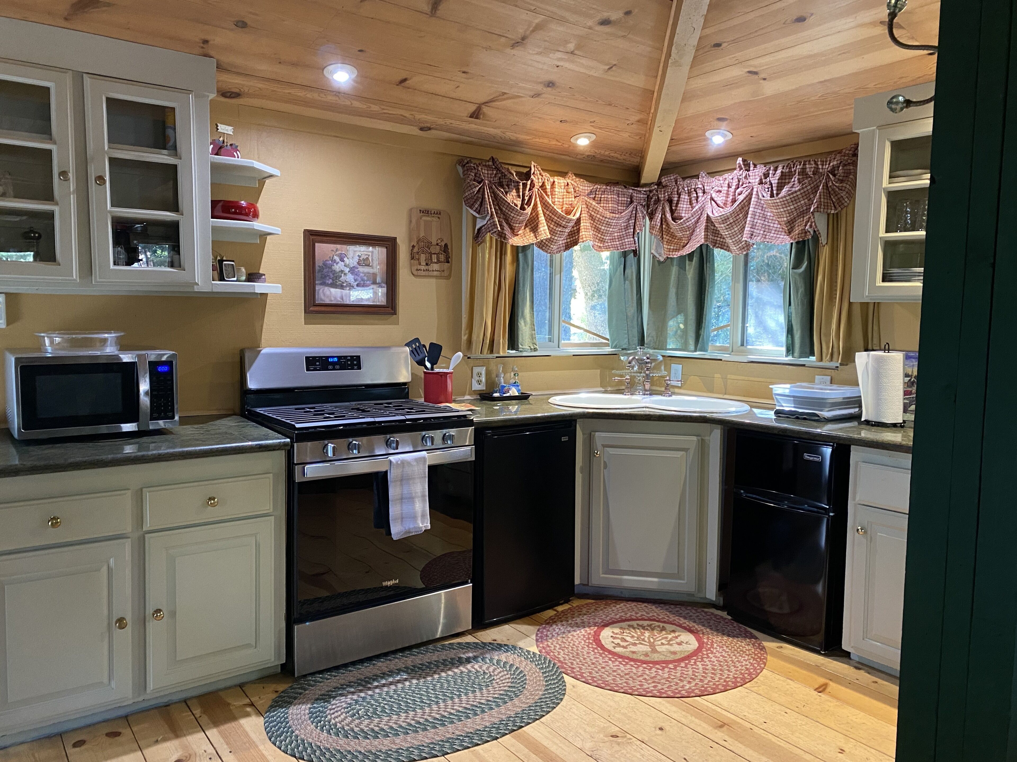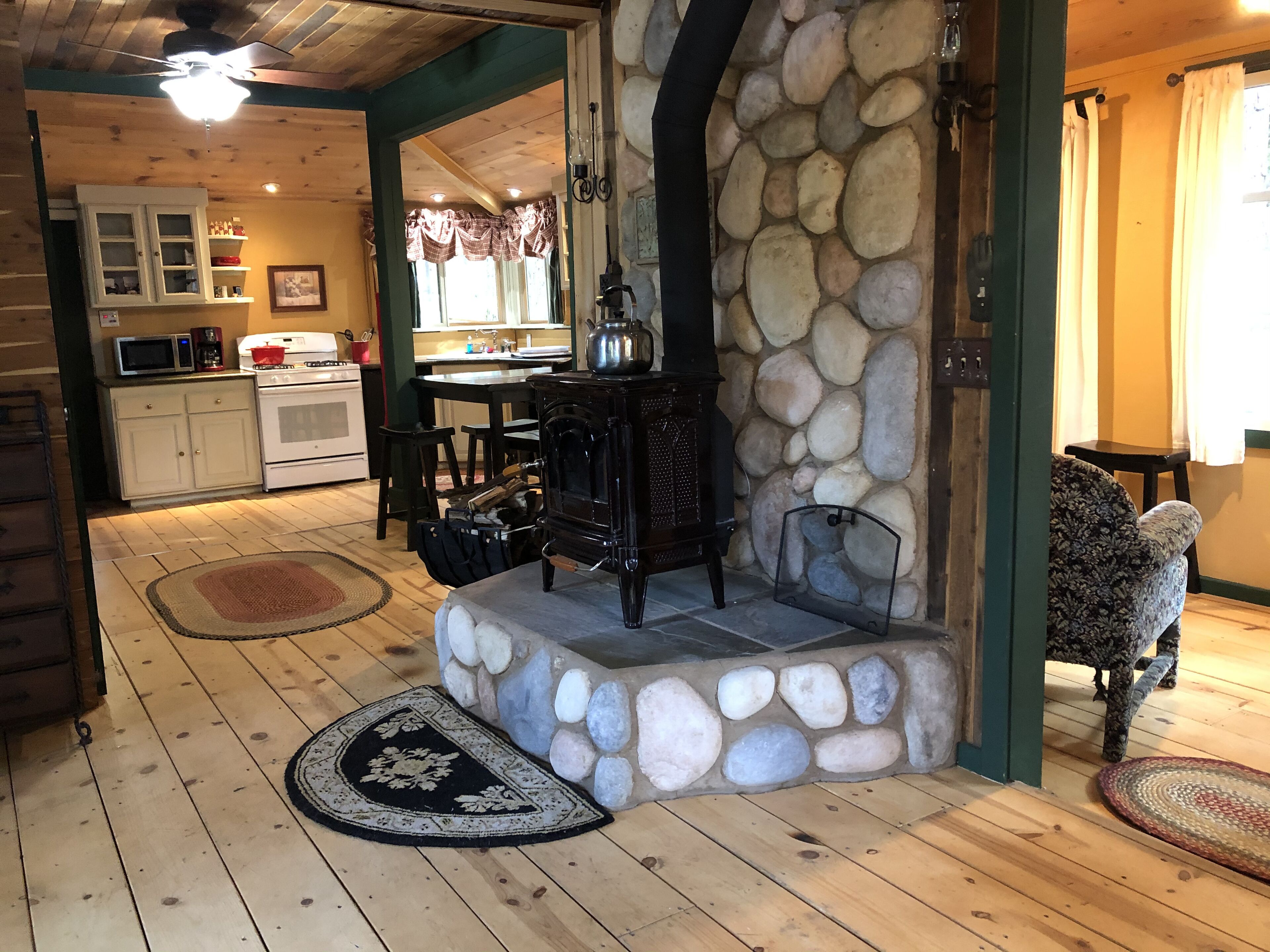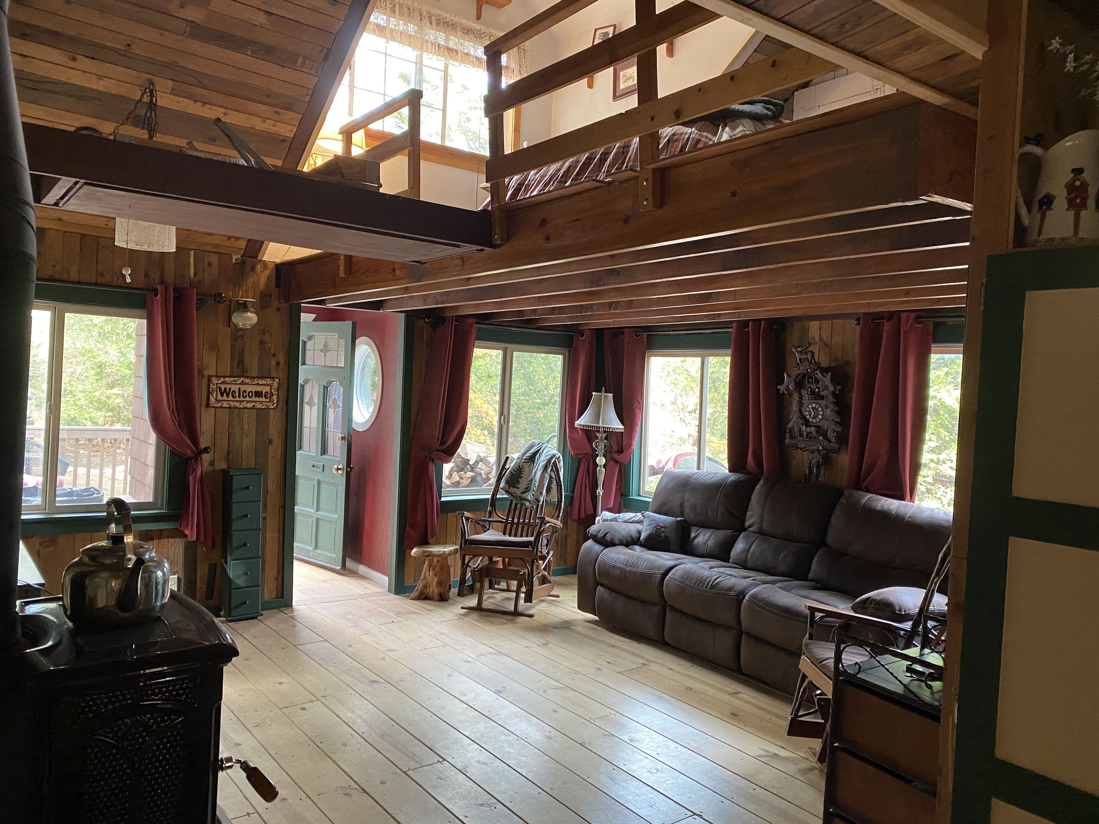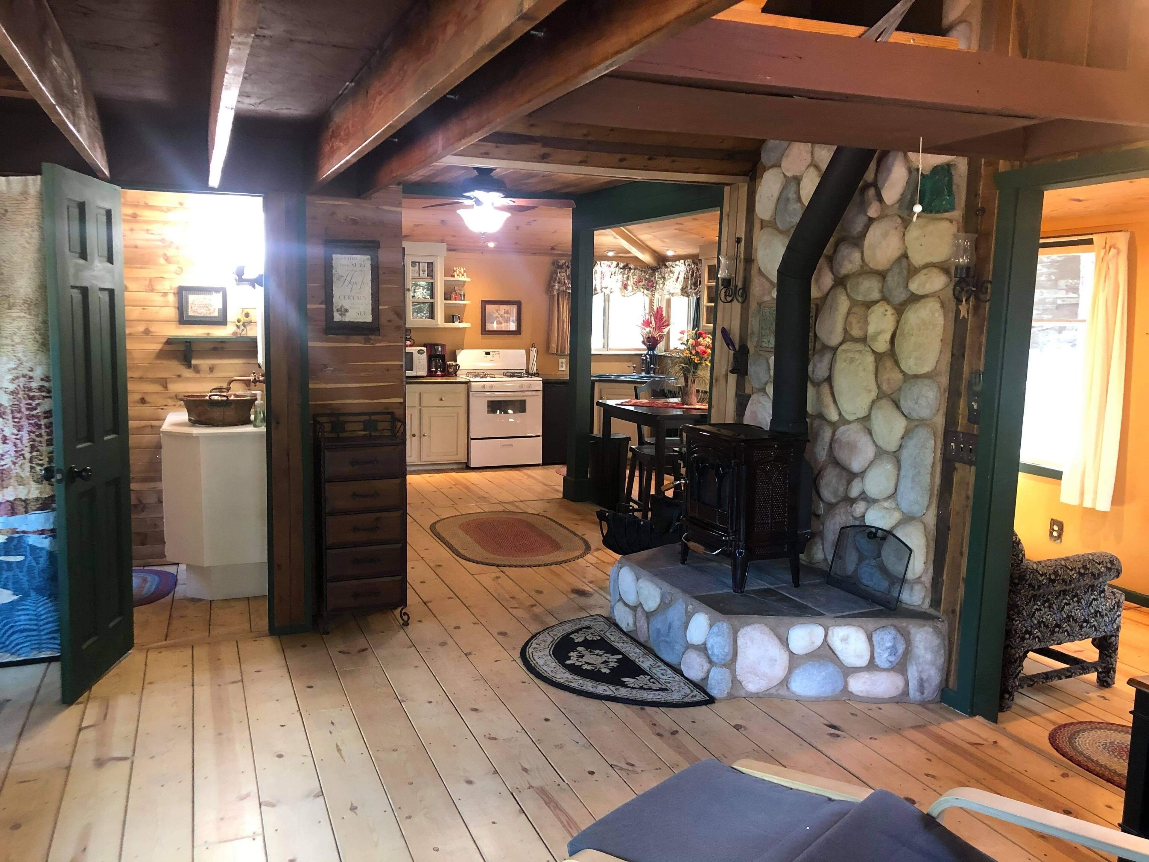 Woodland Hideaway This cabin has a cozy living room with a wood burning stove and a beautiful rock wall and spacious kitchen to cook your meals. Sit and drink your coffee or tea in the sun room, looking out at the mountain side where you will see several different types of birds. The master bedroom nook with a queen size bed is tucked behind the bathroom. Climb up the attic ladder to two more sle...