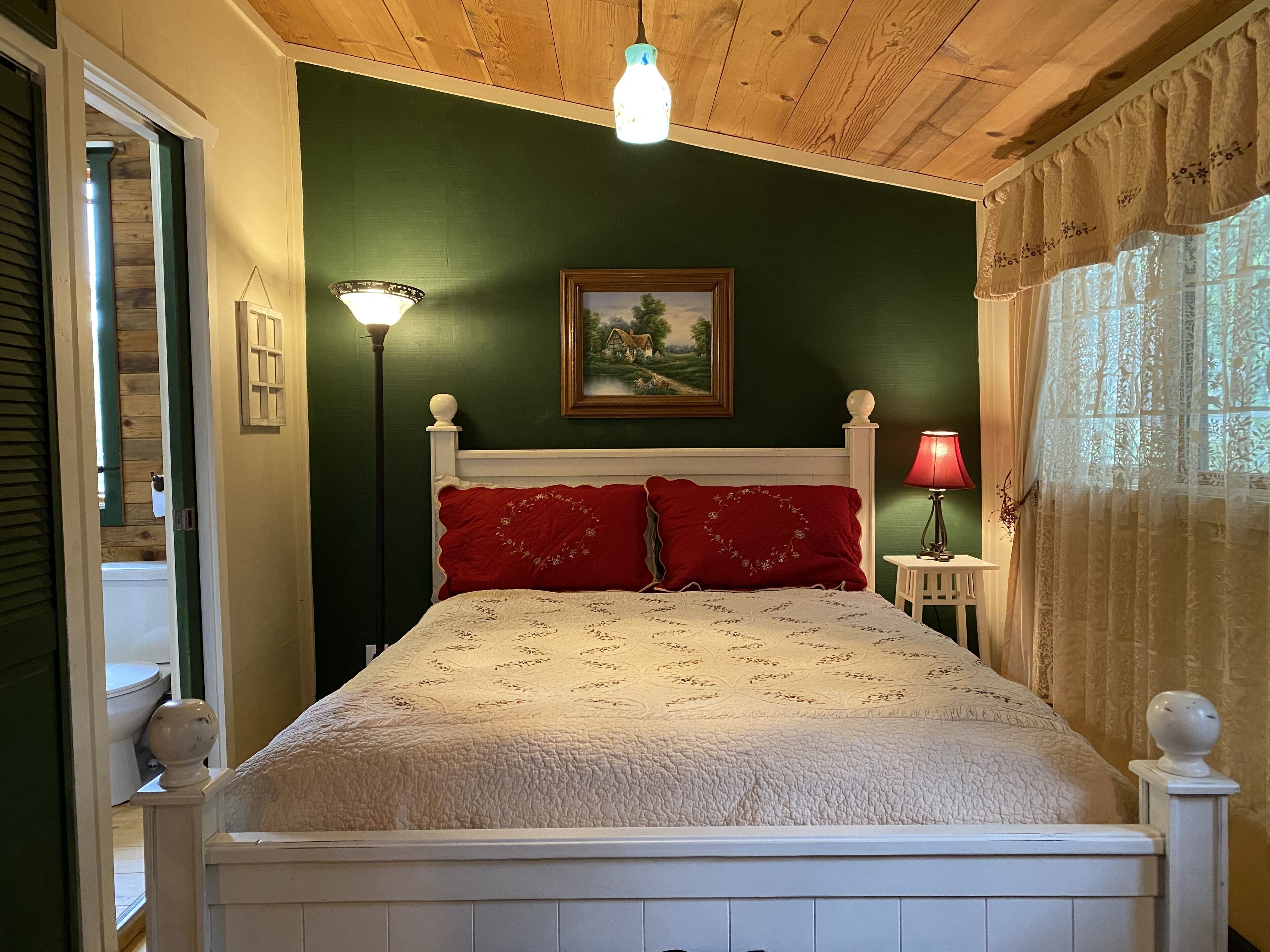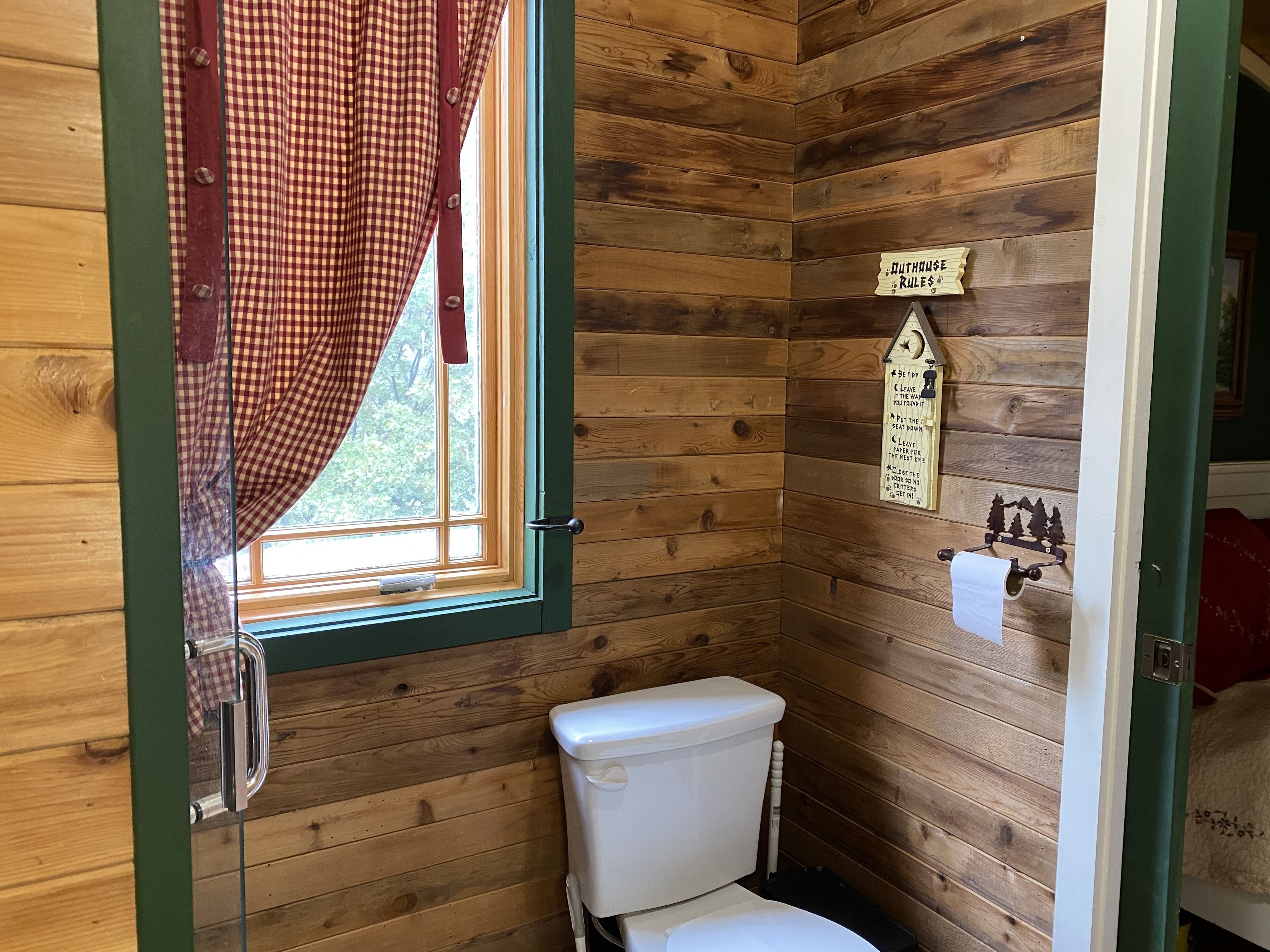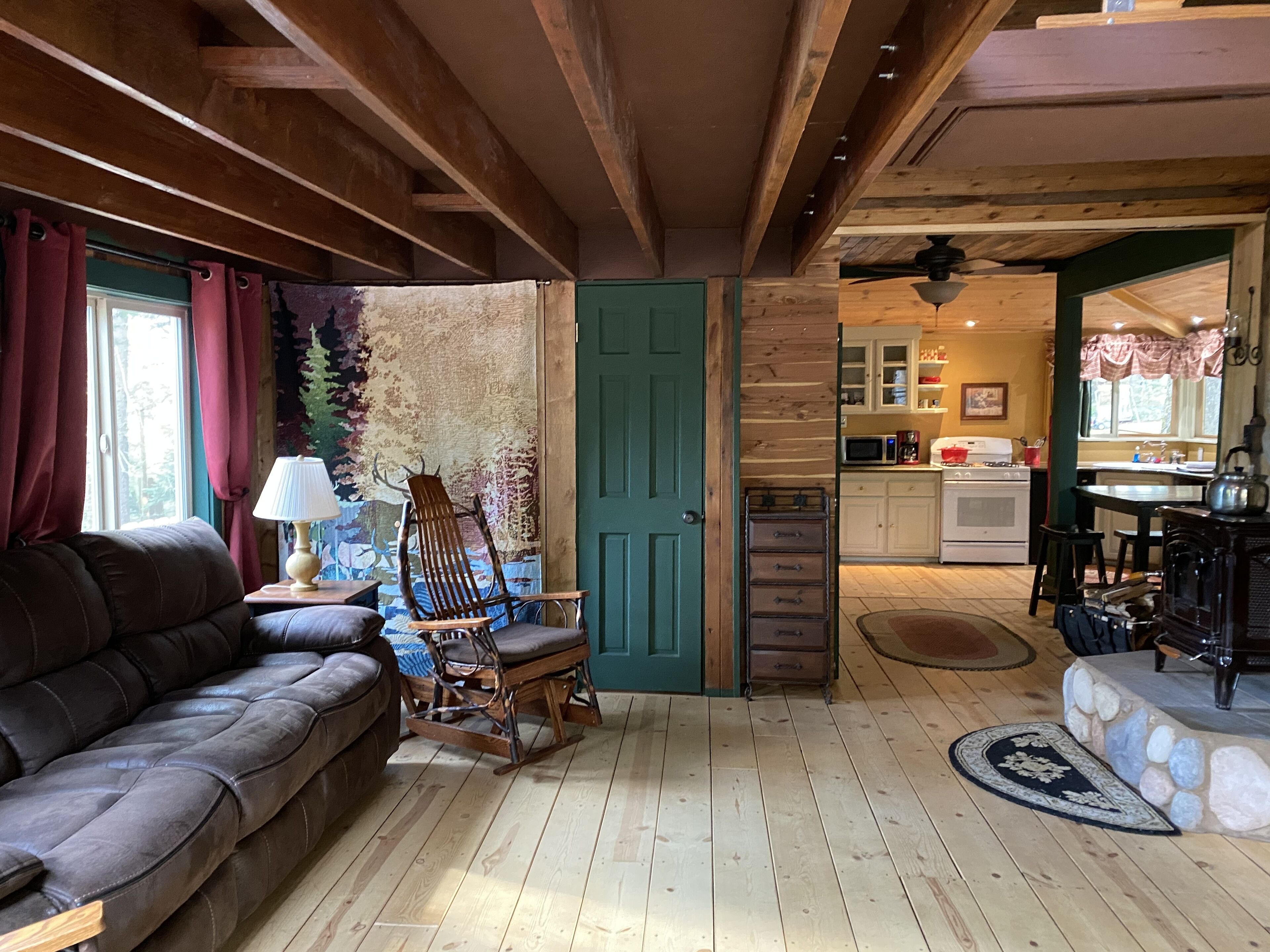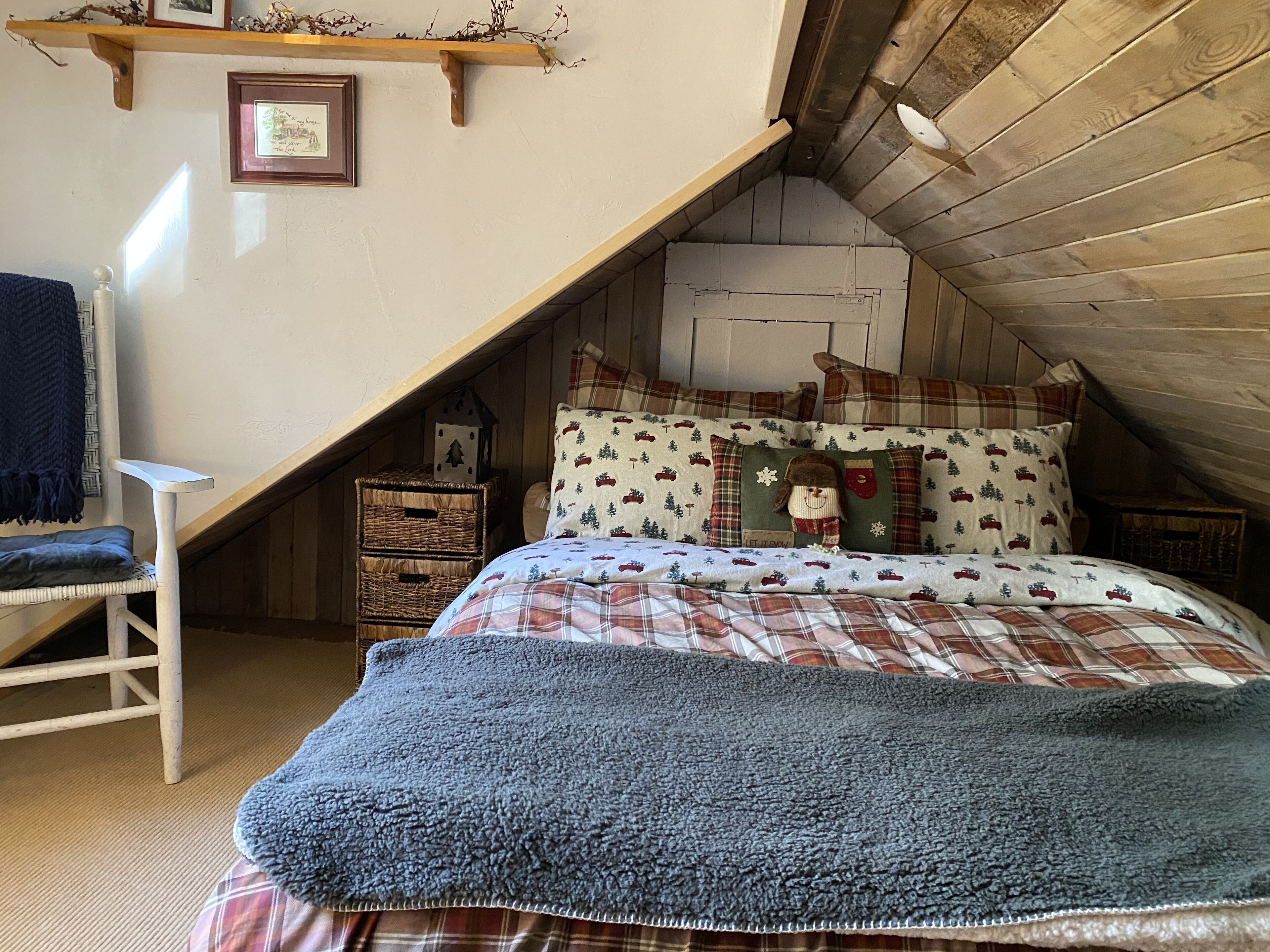 Woodland Hideaway This cabin has a cozy living room with a wood burning stove and a beautiful rock wall and spacious kitchen to cook your meals. Sit and drink your coffee or tea in the sun room, looking out at the mountain side where you will see several different types of birds. The master bedroom nook with a queen size bed is tucked behind the bathroom. Climb up the attic ladder to two more sle...