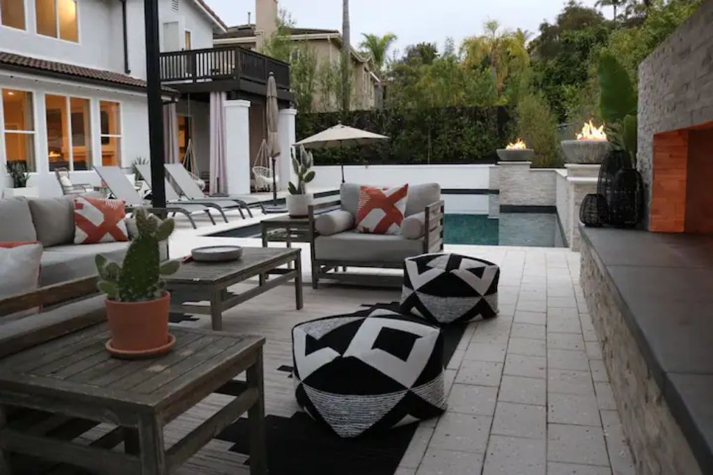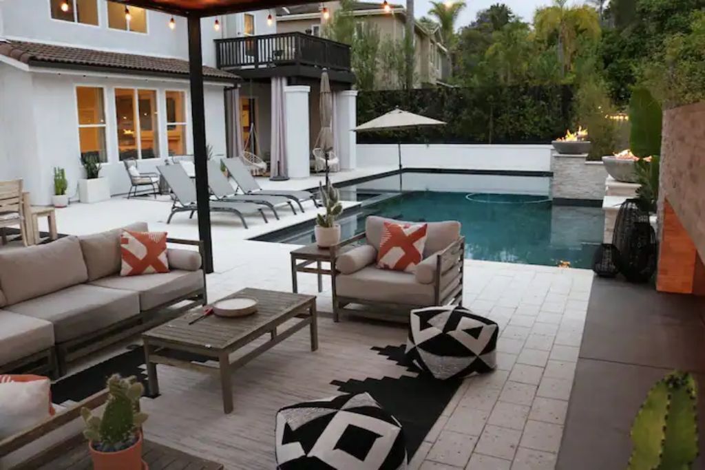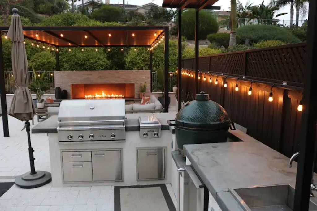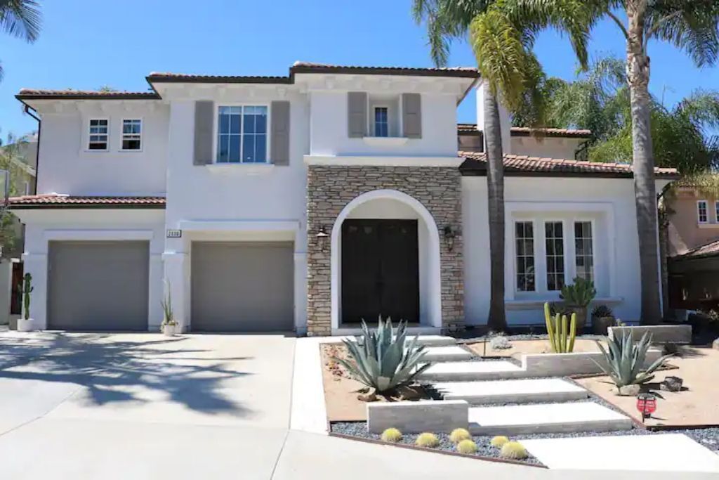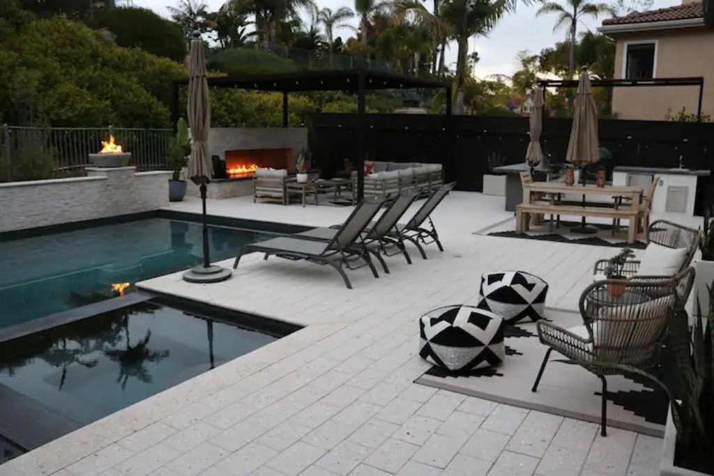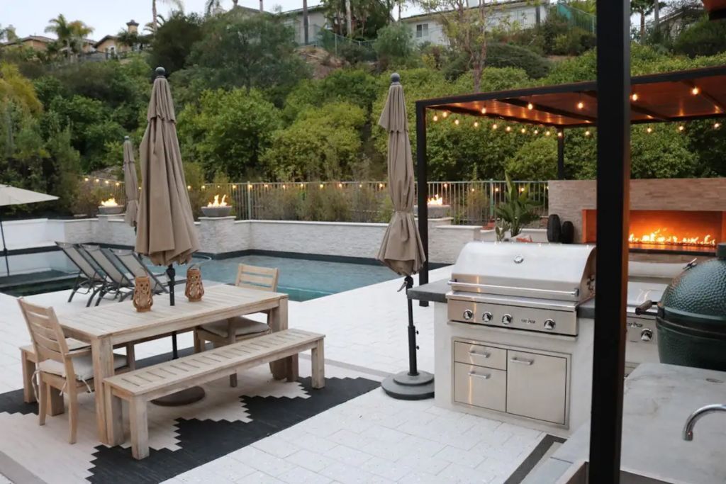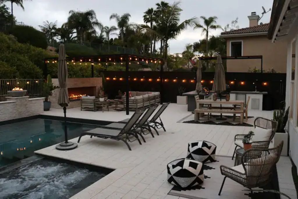 Luxury Resort Pool Home Exquisite 4,100 sf Luxury home in North County San Diego with new chef’s dream kitchen with all Viking appliances. Modern backyard resort with incredible solar heated pool, hot tub, outdoor kitchen, covered lounge areas, and massive fireplace. 4 bed/4 bath, and 2 separate living rooms offer comfort and convenience. Pool table and ping pong room for your entertainment. 4 fireplaces and 5 large flat-screen TV’s. Dedicated office/work space. Workout area with free weights, bench, and equipment.The spaceBackyard offers an incredible resort experience. Large modern fireplace with an outdoor seating area covered with fine Ipe hardwood. The large modern pool is perfect for swimming laps or just cooling off. The pool is solar heated, and includes 3 waterfalls. The jacuzzi can be heated quickly with the push of a button. The outdoor kitchen includes a Delta Heat gas grill, 2 burners, sink, refrigerator, and a Big Green Egg for your grilling enthusiasts.Large dining room, pool table, and ping pong room. The master bath is a perfect place to relax. Draw a bath in the claw-foot tub, or take a long hot shower. Huge walk-in closets. There are 5 work stations/desks if you need to get some work done. Brand new washer and dryer in the laundry room. Fully equipped kitchen for all your cooking and entertaining needs.Sorry, no pets allowed. Owners are allergic.Guest accessThere is room for 2 cars in the driveway, and plenty of street parking available.Access to the front door is through a digital keypad, so there are no keys to worry about.Other things to noteOur home is located just minutes from Encinitas and Carlsbad beaches, Legoland, Lake San Marcos, Del Mar, and La Jolla. Enjoy the incredible parks, lakes, restaurants, and beaches, which are all very close.No access to garage - Owner's storage