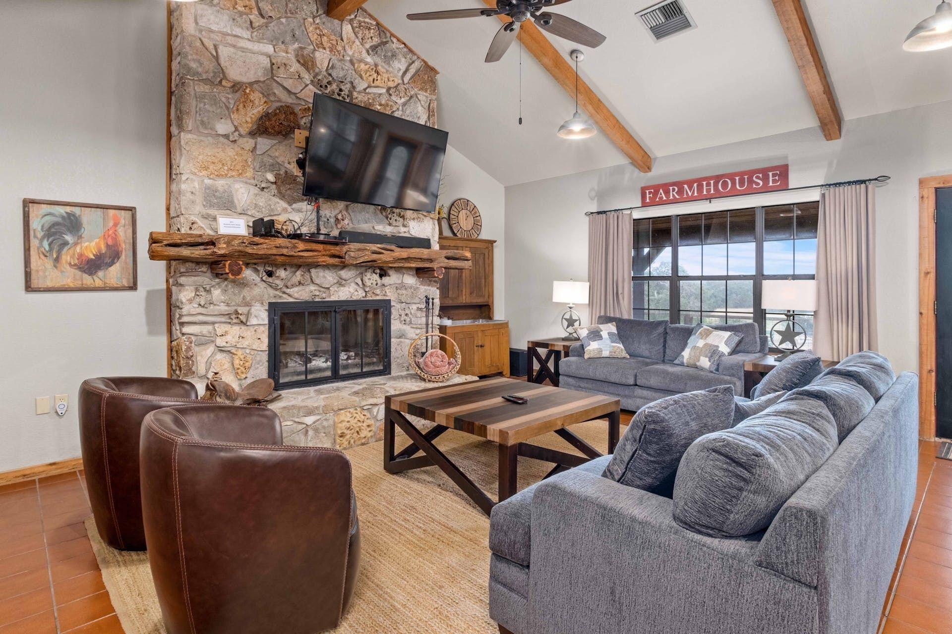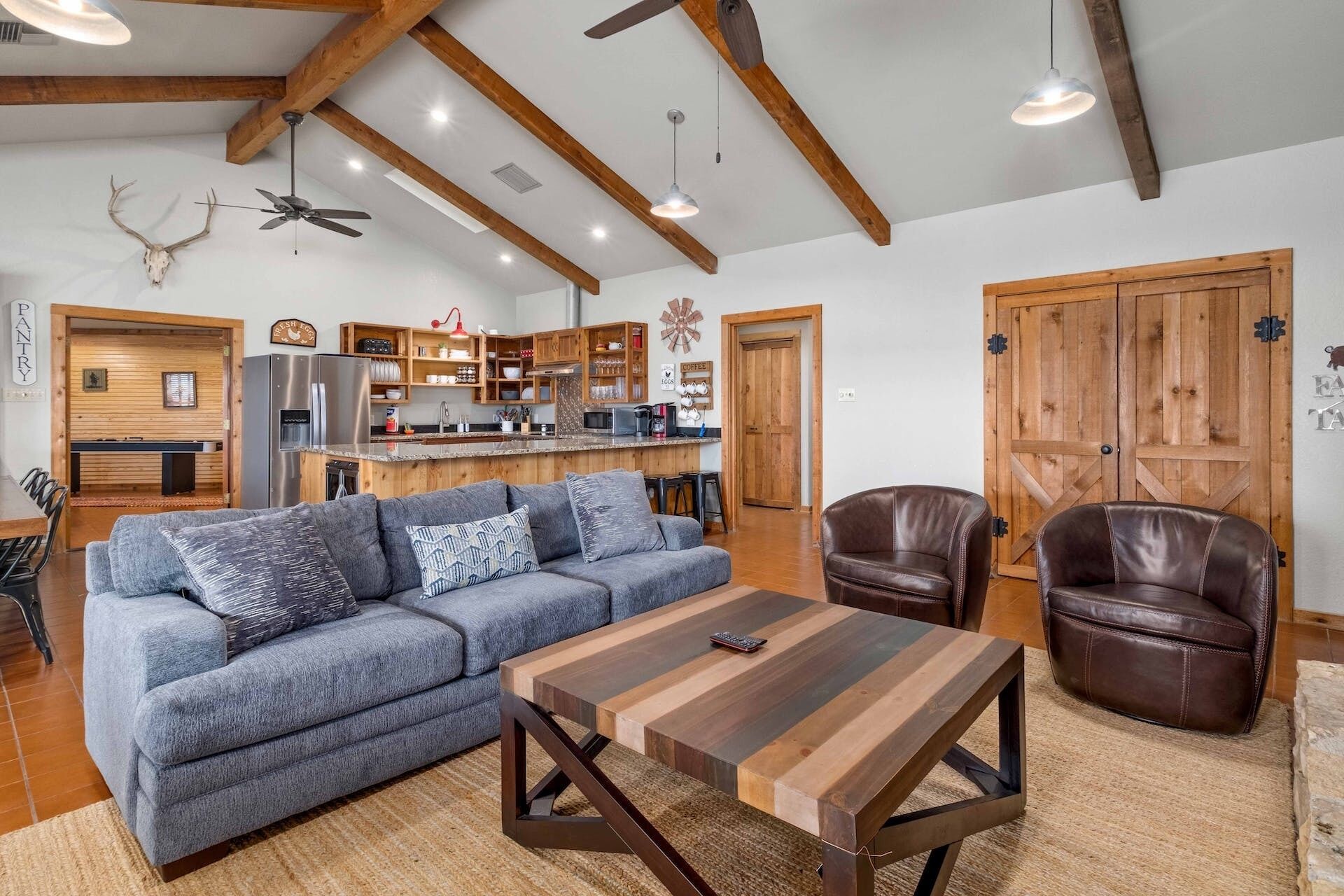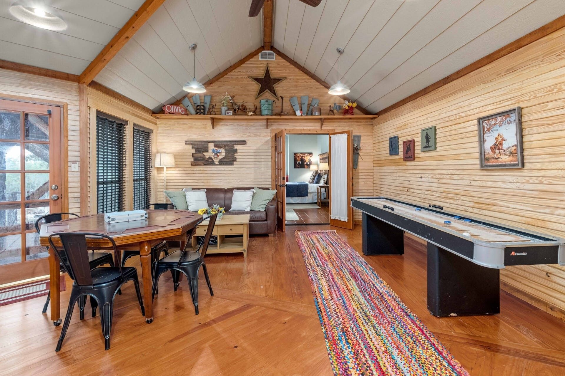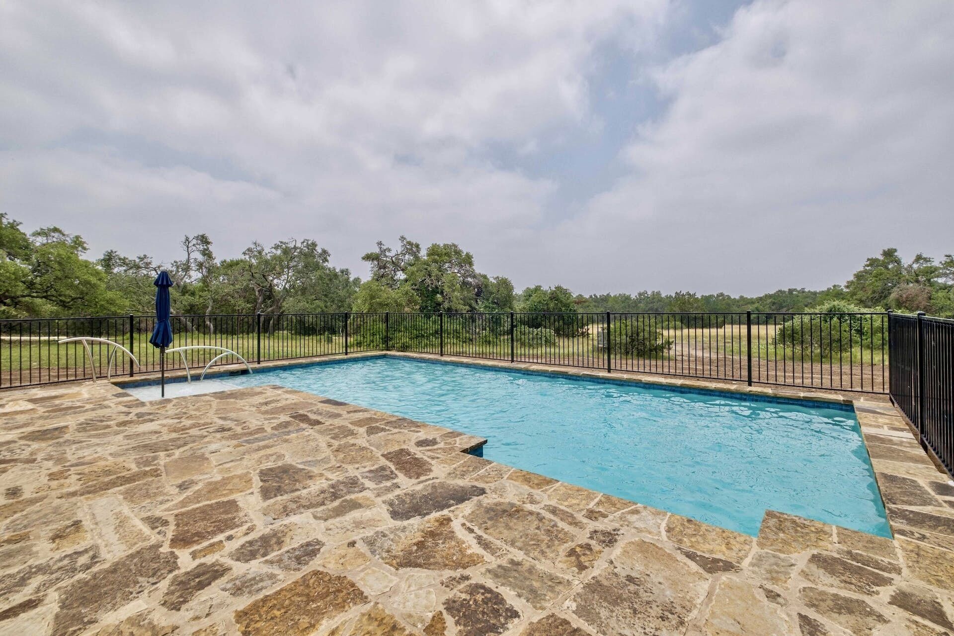Charming Farmhouse on 34 Private Acres w/Heated Pool *The pool can be heated from October - March. Three days advance notice (prior to your arrival) is required if you would like to heat the pool. There is an additional charge of $150 per day to cover the propane usage/cost it incurs. The pool must be heated for the entirety of the reservation.An exquisite, handcrafted home, blending contemporary with warm rustic elegance, in a Hill Country setting on 34 private acres. Relax on the porch in a rocking chair, enjoy snuggling up by the the indoor fireplace, read a book while soaking in the hot tub, or just do nothing at all - this is relaxation at its best!The open living, kitchen, and dining areas make it convenient for your family and friends to enjoy quality time no matter where they prefer to hang out. The game room was designed with both kids and adults in mind. Enjoy a night of poker around the game table, a competitive game of shuffleboard, or bust one of the good old fashioned family board games. Although the home only has 4 bedrooms, the owners very thoughtfully and strategically created a way for groups as large as 13 guests to enjoy the space together comfortably. The outdoor amenities do not disappoint offering a grill area, outdoor fire pit, a brand new swimming pool!Bedroom/Bed Configuration: Master Bedroom – 1 King bedBedroom 2 – 1 King bed, 1 Twin bedBedroom 3 – 1 Queen bedBedroom 4 – 2 Queen beds, 1 Twin bedBonus Room – 1 Twin bedPET POLICY: Pets are only allowed if they have been registered prior to your arrival. A maximum of 2 dogs are allowed and a pet fee of $25.00 per pet, per night will be added once your pets are approved.SELF CHECK-IN REQUIREMENTS: All reservations will be required to sign a rental agreement and provide Hills of Texas Lodging with a valid credit card to be placed on file for their stay. In lieu of charging a damage deposit or non-refundable damage waiver, a temporary hold will be placed on a credit card upon arrival for incidentals (just like they do at hotels). We are basically just verifying with your financial institution that sufficient funds are available in the event they were needed to cover property damage(s). If there are no property damages, the card will not be charged.