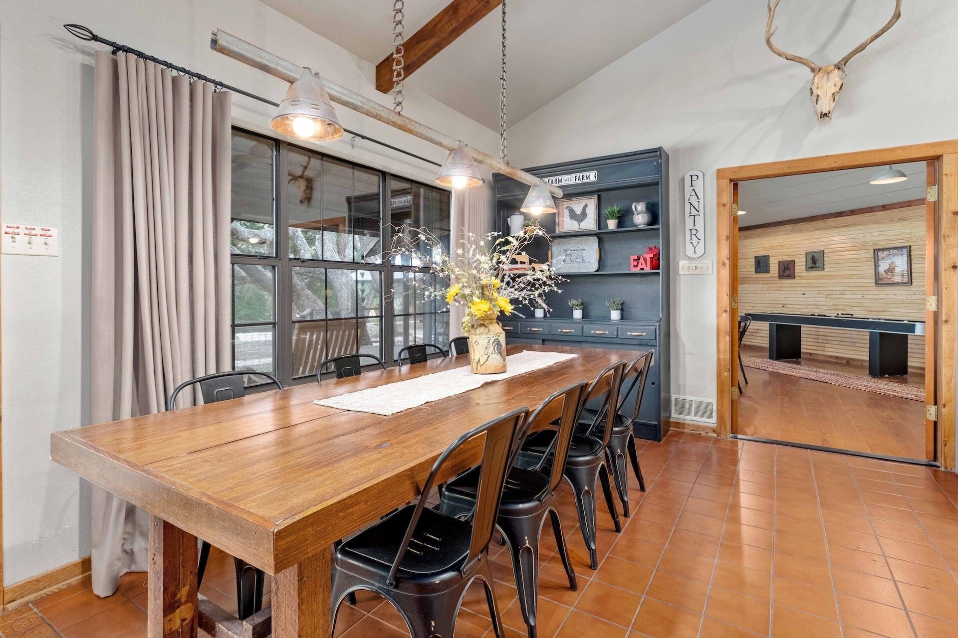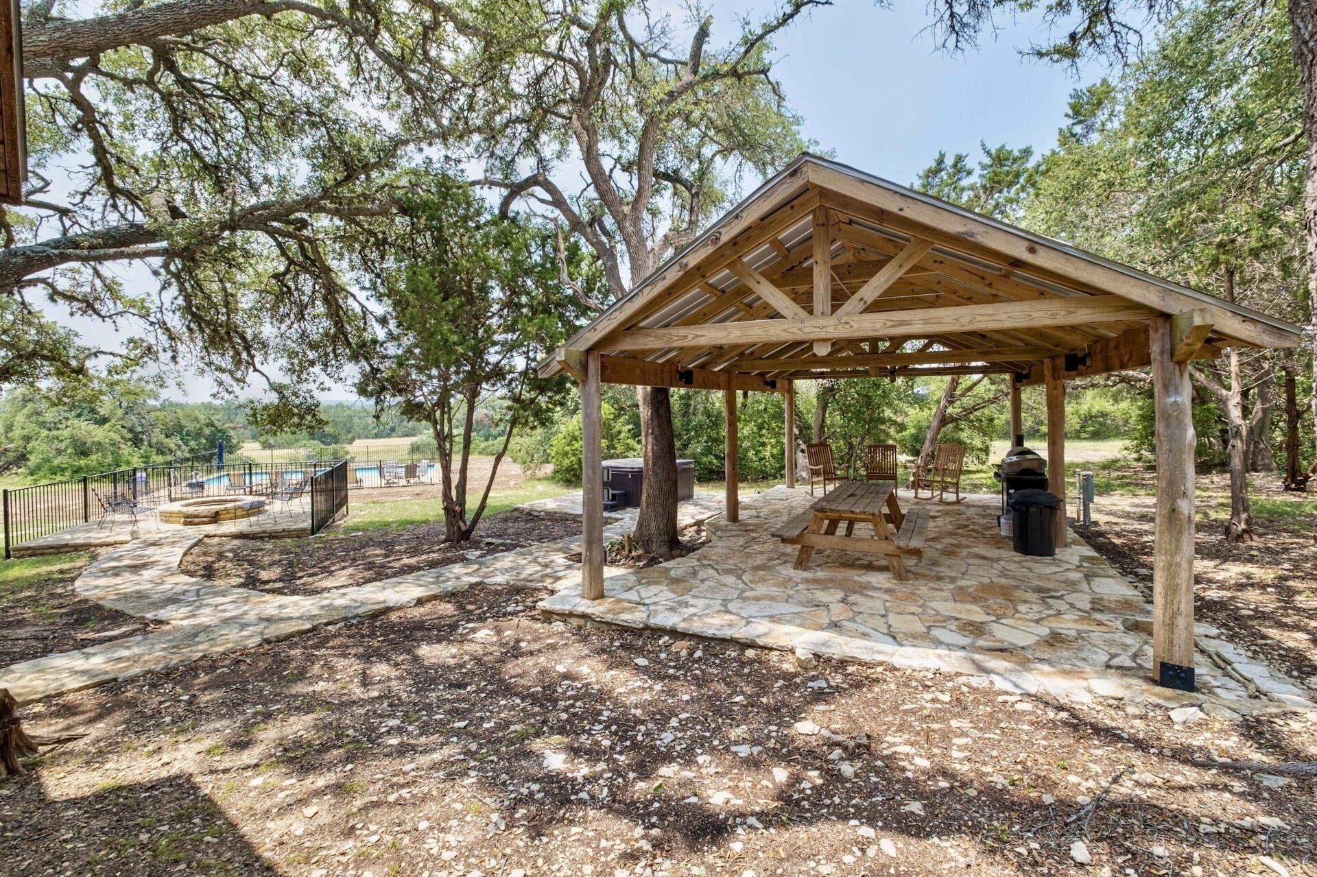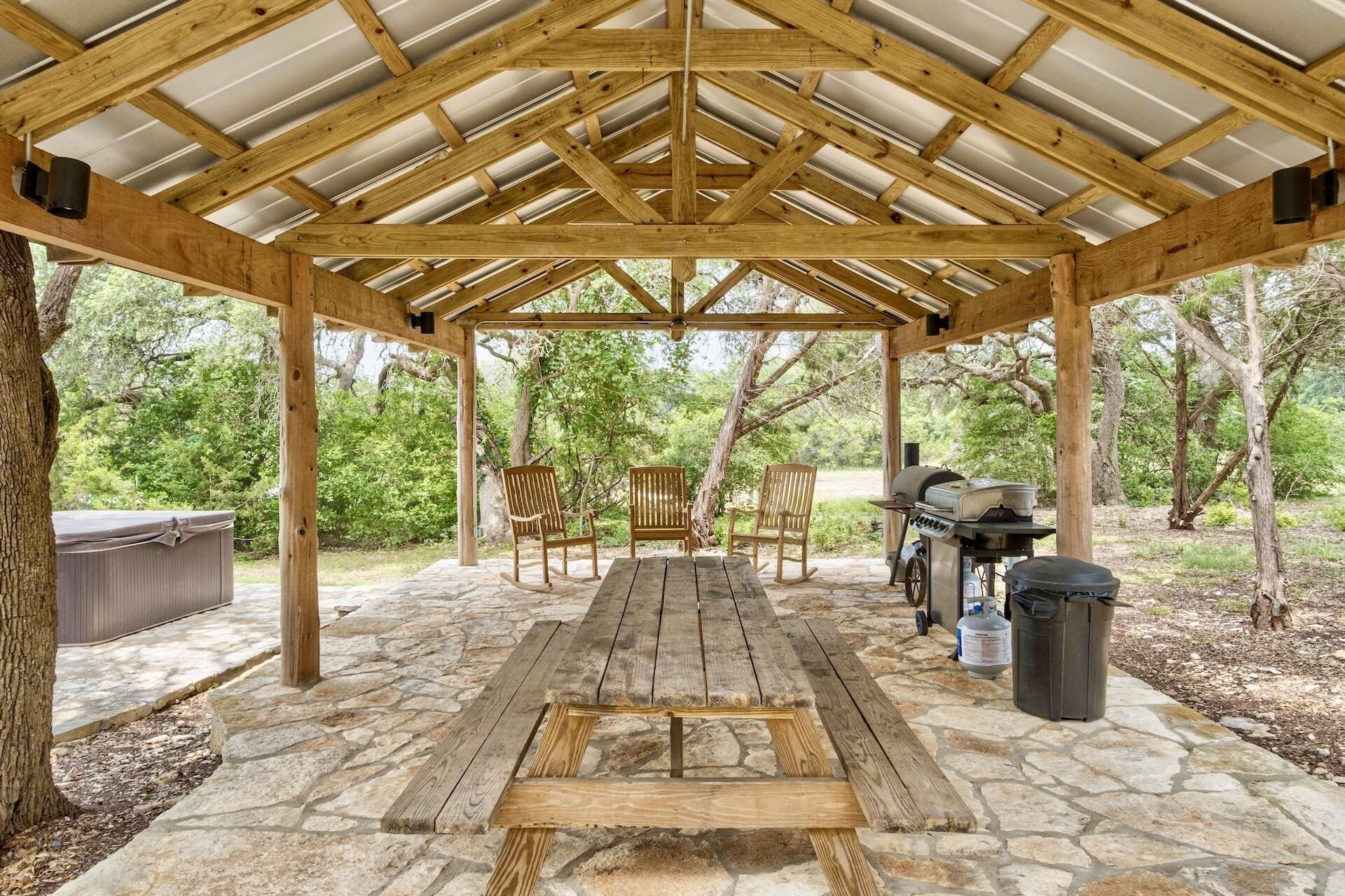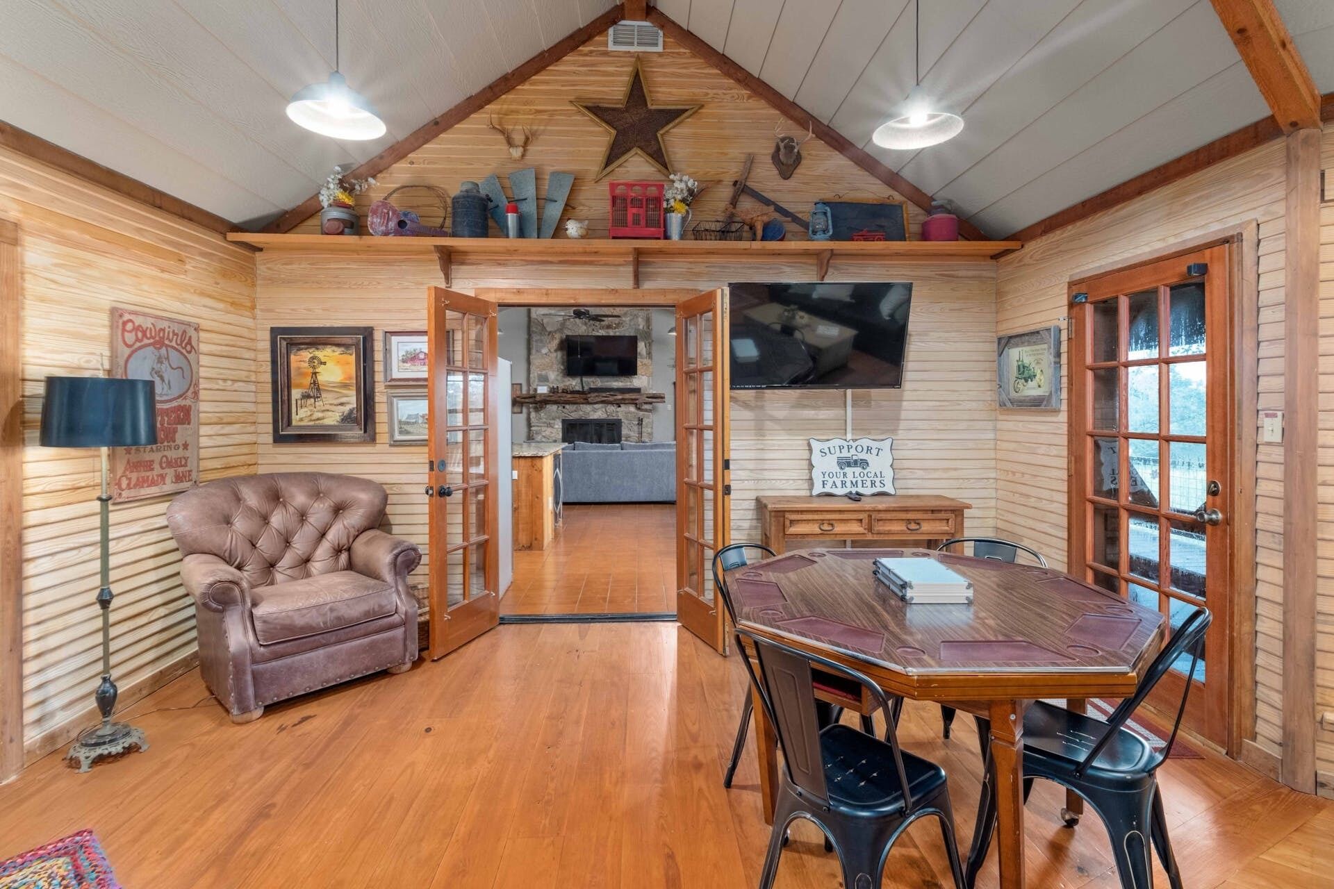 Charming Farmhouse on 34 Private Acres w/Heated Pool *The pool can be heated from October - March. Three days advance notice (prior to your arrival) is required if you would like to heat the pool. There is an additional charge of $150 per day to cover the propane usage/cost it incurs. The pool must be heated for the entirety of the reservation.An exquisite, handcrafted home, blending contemporary with warm rustic elegance, in a Hill Country setting on 34 private acres. Relax on the porch in a rocking chair, enjoy snuggling up by the the indoor fireplace, read a book while soaking in the hot tub, or just do nothing at all - this is relaxation at its best!The open living, kitchen, and dining areas make it convenient for your family and friends to enjoy quality time no matter where they prefer to hang out. The game room was designed with both kids and adults in mind. Enjoy a night of poker around the game table, a competitive game of shuffleboard, or bust one of the good old fashioned family board games. Although the home only has 4 bedrooms, the owners very thoughtfully and strategically created a way for groups as large as 13 guests to enjoy the space together comfortably. The outdoor amenities do not disappoint offering a grill area, outdoor fire pit, a brand new swimming pool!Bedroom/Bed Configuration: Master Bedroom – 1 King bedBedroom 2 – 1 King bed, 1 Twin bedBedroom 3 – 1 Queen bedBedroom 4 – 2 Queen beds, 1 Twin bedBonus Room – 1 Twin bedPET POLICY: Pets are only allowed if they have been registered prior to your arrival. A maximum of 2 dogs are allowed and a pet fee of $25.00 per pet, per night will be added once your pets are approved.SELF CHECK-IN REQUIREMENTS: All reservations will be required to sign a rental agreement and provide Hills of Texas Lodging with a valid credit card to be placed on file for their stay. In lieu of charging a damage deposit or non-refundable damage waiver, a temporary hold will be placed on a credit card upon arrival for incidentals (just like they do at hotels). We are basically just verifying with your financial institution that sufficient funds are available in the event they were needed to cover property damage(s). If there are no property damages, the card will not be charged.