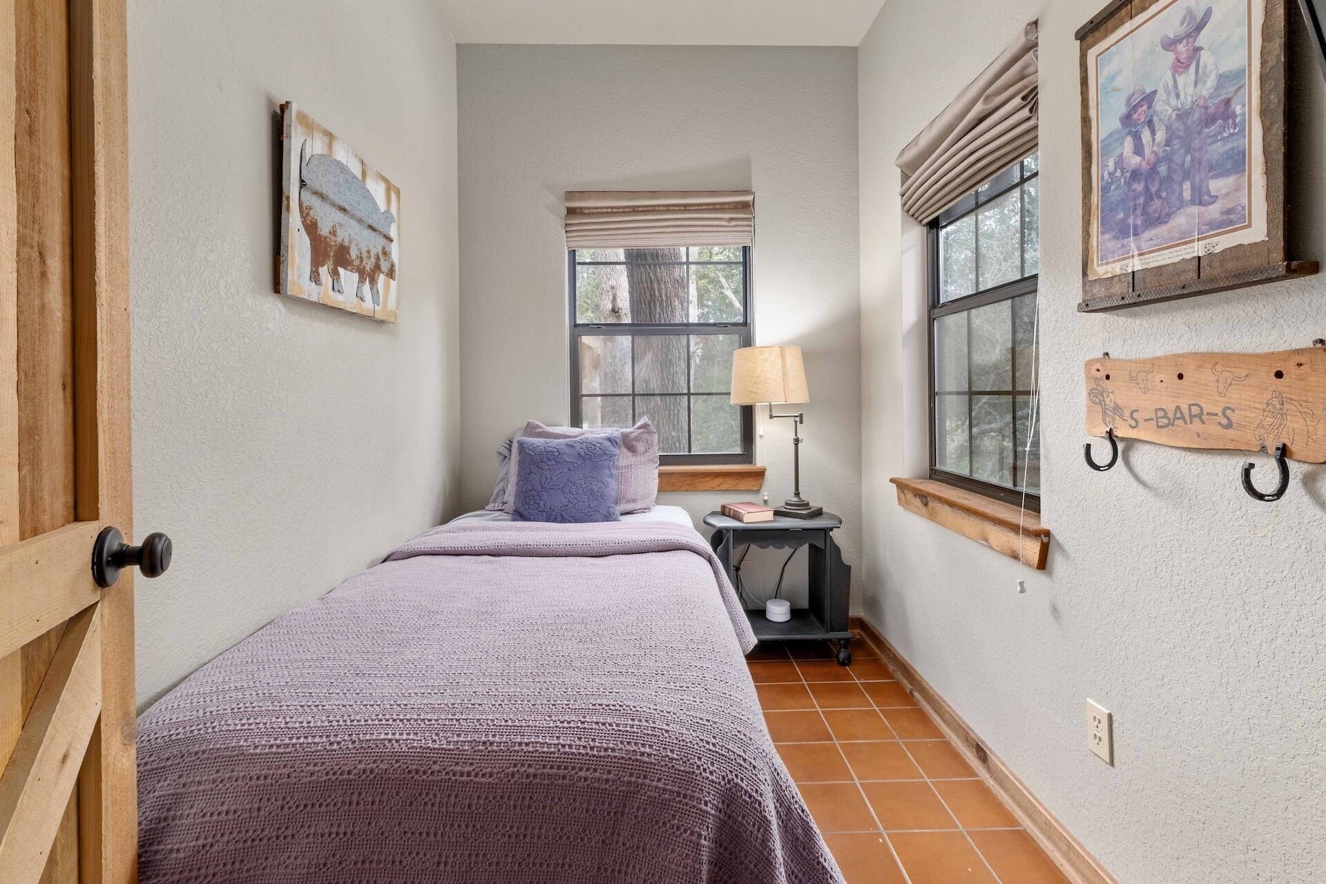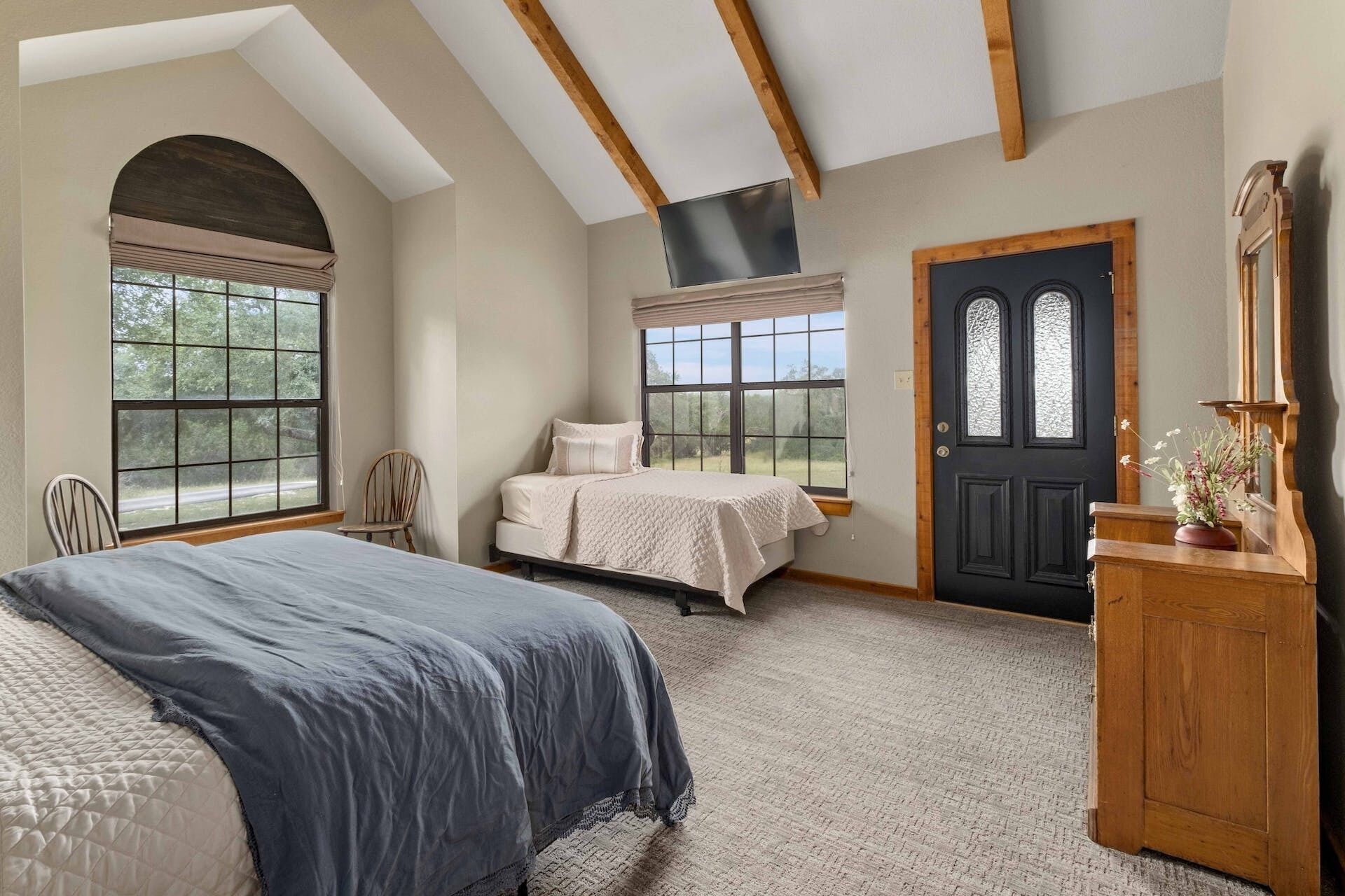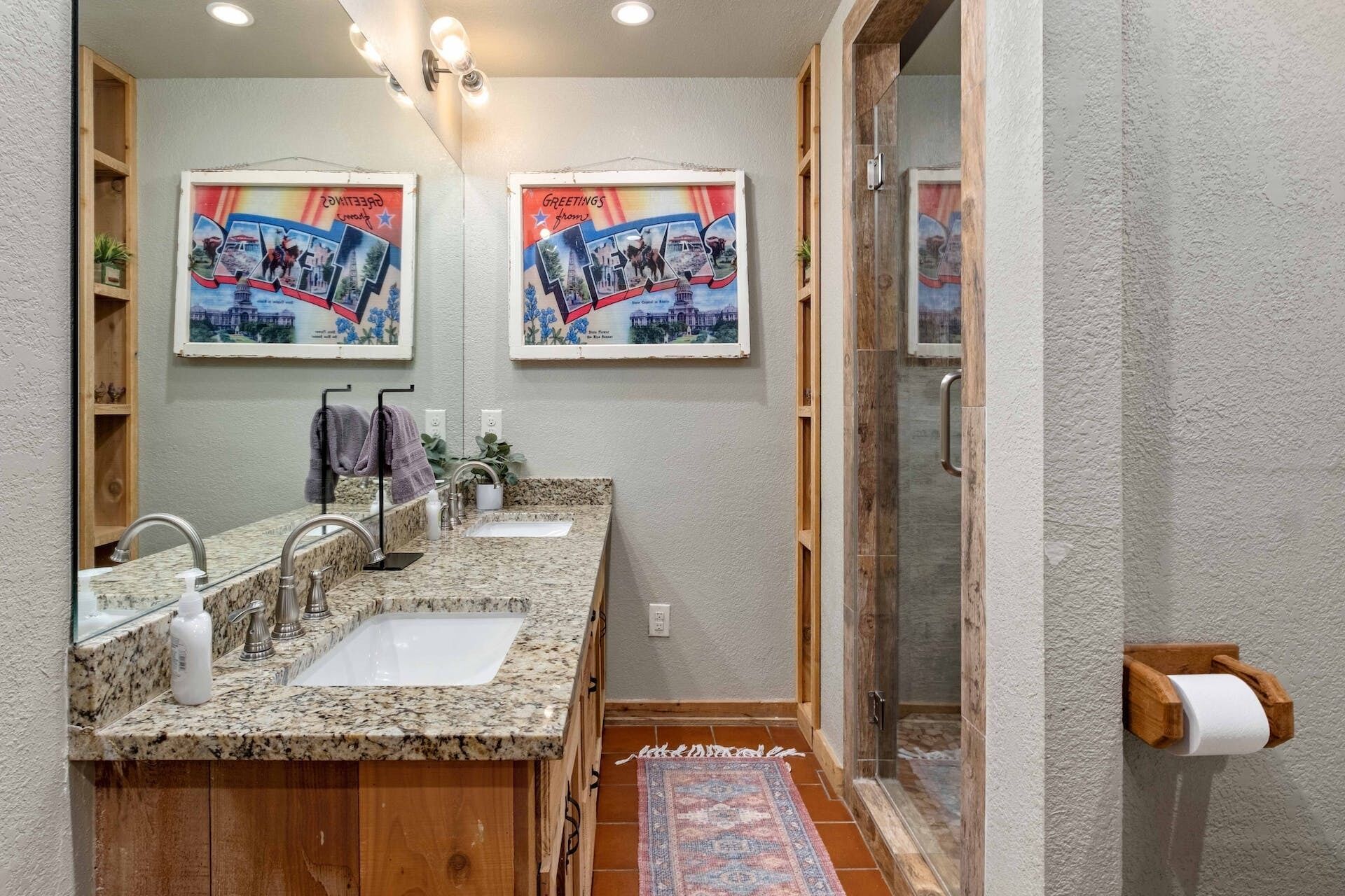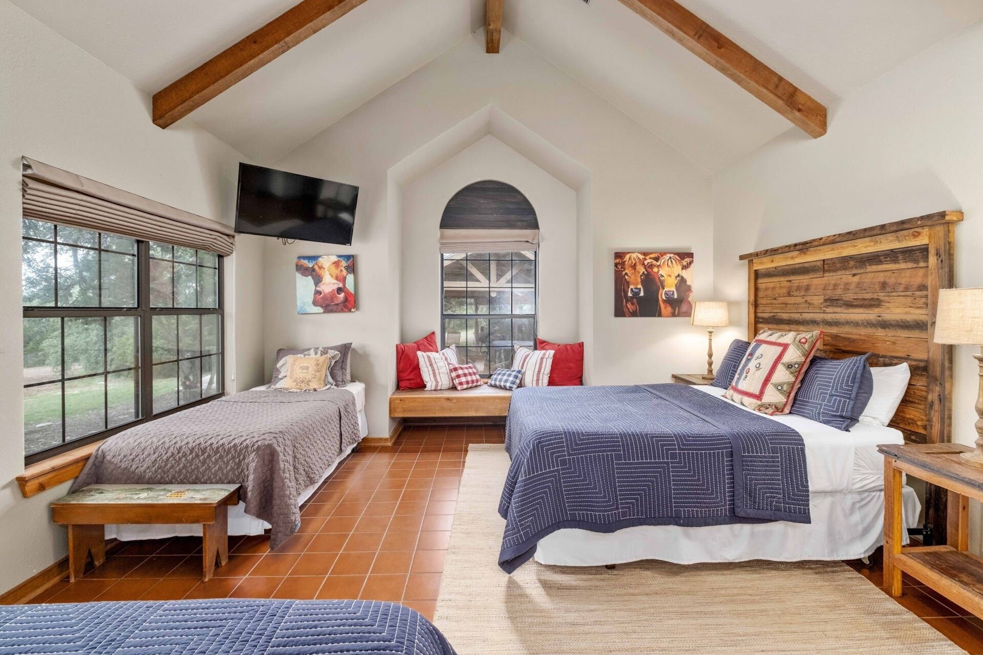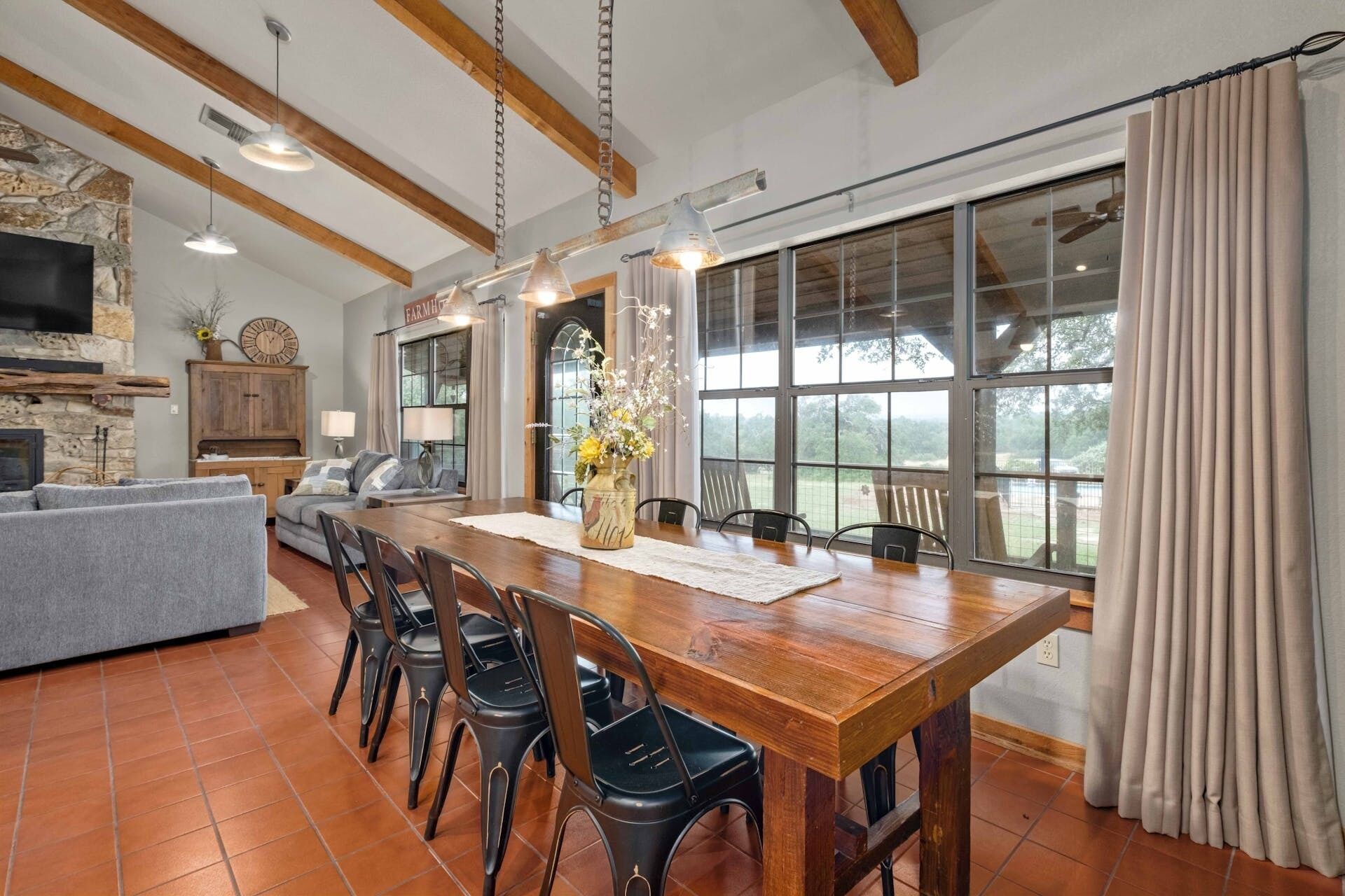 Charming Farmhouse on 34 Private Acres w/Heated Pool *The pool can be heated from October - March. Three days advance notice (prior to your arrival) is required if you would like to heat the pool. There is an additional charge of $150 per day to cover the propane usage/cost it incurs. The pool must be heated for the entirety of the reservation.An exquisite, handcrafted home, blending contemporary with warm rustic elegance, in a Hill Country setting on 34 private acres. Relax on the porch in a rocking chair, enjoy snuggling up by the the indoor fireplace, read a book while soaking in the hot tub, or just do nothing at all - this is relaxation at its best!The open living, kitchen, and dining areas make it convenient for your family and friends to enjoy quality time no matter where they prefer to hang out. The game room was designed with both kids and adults in mind. Enjoy a night of poker around the game table, a competitive game of shuffleboard, or bust one of the good old fashioned family board games. Although the home only has 4 bedrooms, the owners very thoughtfully and strategically created a way for groups as large as 13 guests to enjoy the space together comfortably. The outdoor amenities do not disappoint offering a grill area, outdoor fire pit, a brand new swimming pool!Bedroom/Bed Configuration: Master Bedroom – 1 King bedBedroom 2 – 1 King bed, 1 Twin bedBedroom 3 – 1 Queen bedBedroom 4 – 2 Queen beds, 1 Twin bedBonus Room – 1 Twin bedPET POLICY: Pets are only allowed if they have been registered prior to your arrival. A maximum of 2 dogs are allowed and a pet fee of $25.00 per pet, per night will be added once your pets are approved.SELF CHECK-IN REQUIREMENTS: All reservations will be required to sign a rental agreement and provide Hills of Texas Lodging with a valid credit card to be placed on file for their stay. In lieu of charging a damage deposit or non-refundable damage waiver, a temporary hold will be placed on a credit card upon arrival for incidentals (just like they do at hotels). We are basically just verifying with your financial institution that sufficient funds are available in the event they were needed to cover property damage(s). If there are no property damages, the card will not be charged.
