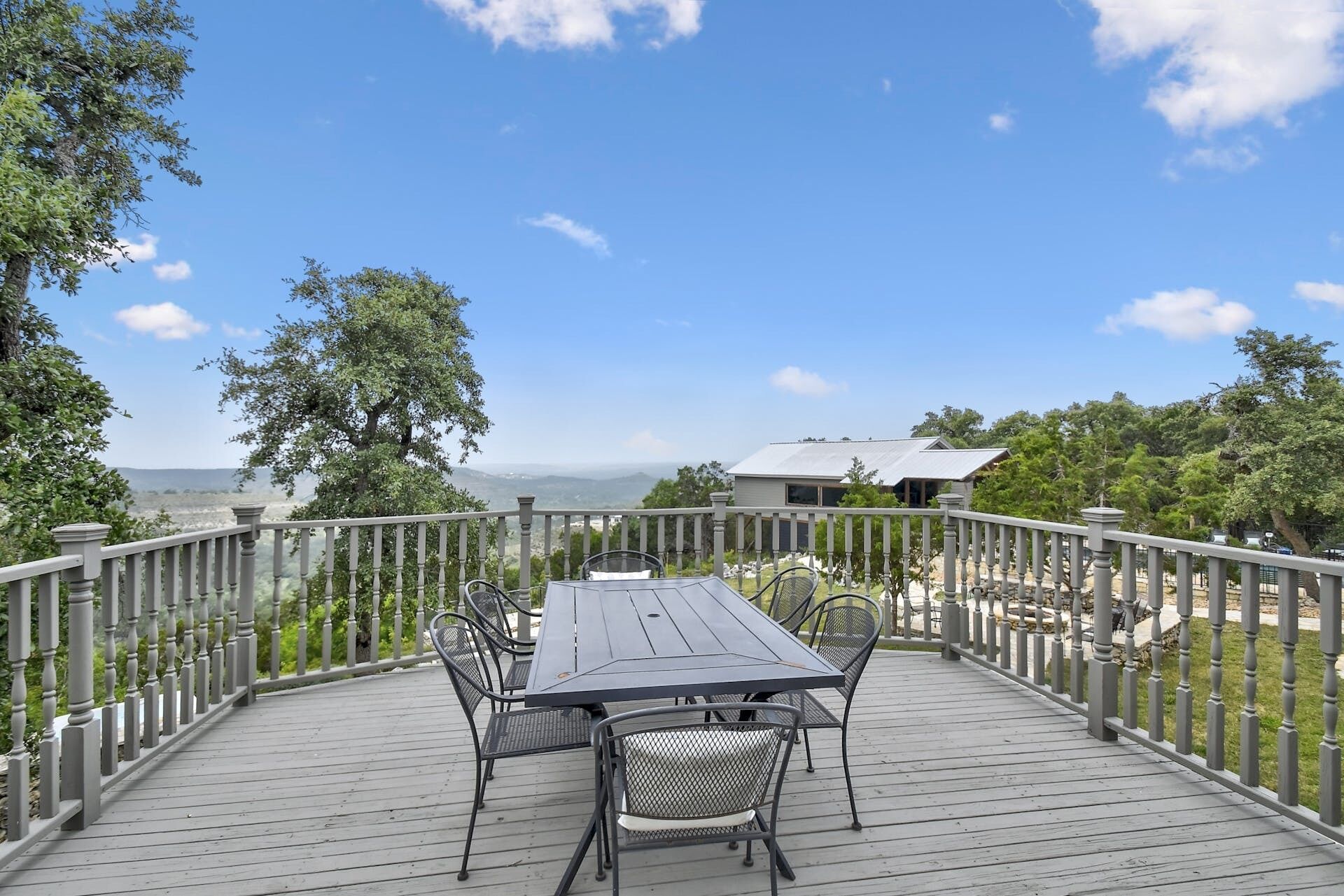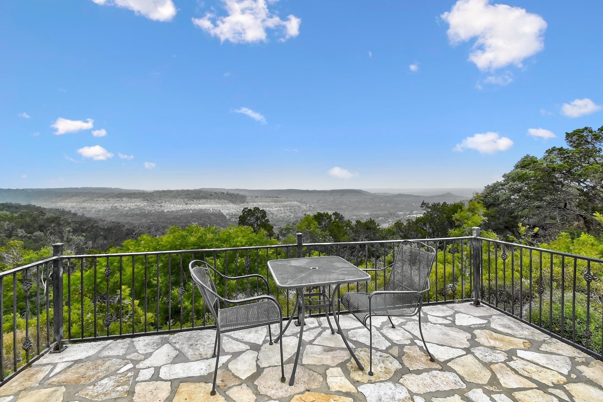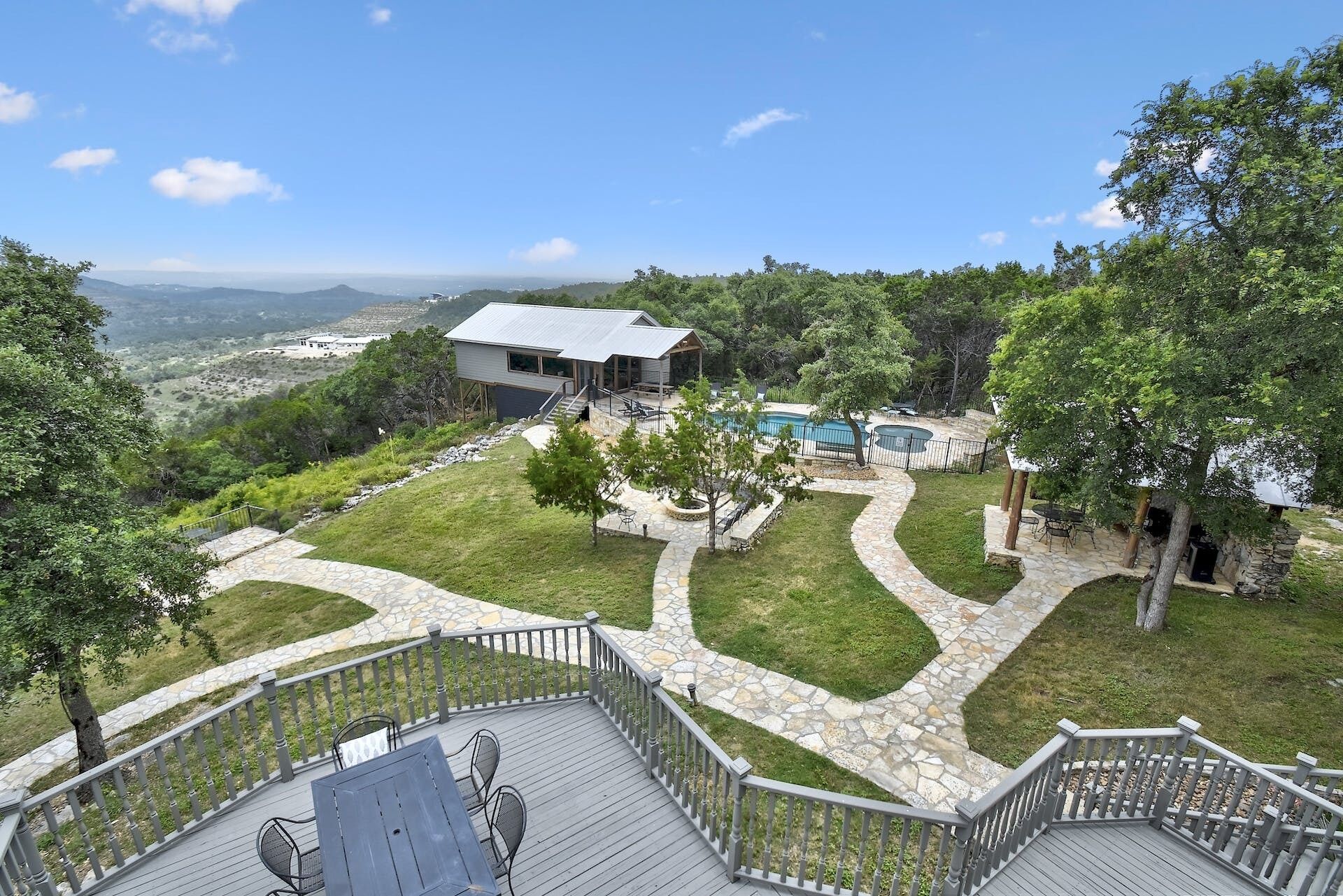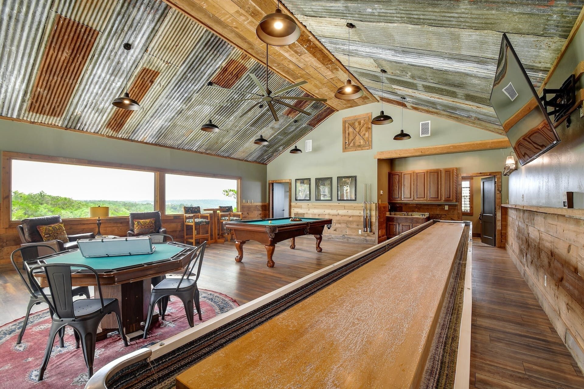 Ridge View Charming Victorian Home w/ AMAZING VIEW, Pool, Hot Tub, Game Room **HUGE GAME ROOM** Game Room - 22 ft Shuffleboard table, Pool Table, Game Table, 1 private king bedroom with full detached bathroom.Ridge View Escape is the perfect get away from it all. Located on Devil's Backbone, just 6 miles from Downtown Wimberley, Ridge View Escape has an amazing 40 mile view that overlooks the Wimberley Valley!First FloorBedroom 1 with king bed and attached full bathroom.second floorBedroom 2- 1 King bed and private bathBedroom 3- Queen Bed Uses detached full bathroom with bedroom 4Bedroom 4- 1 Queen and 1 twin bed with trundle bed uses detached full bathroom with bedroom 33rd floorBedroom 5 1 King bed with private full bath with shower and claw foot bathtubMain House- 5 bedrooms and 4 bathrooms Game room- 1 private king bedroom with full detached bathroomAmenities:PoolHot Tub50" 4K TV in living room with 200+ channels (some premium channels) and DVD playerFirst floor bedroom and game room bedroom do not have a tvLarge tv in Game roomNewly renovated kitchen with high-end stainless steel appliances .Covered Pavilion with gas grill and Smoker.Outdoor Fire PitAmazing 40 mile view!*Please note that this 39 acre estate is shared with our Voca House . Both properties are very private and each have there own pools and hot tubs, and has a tall privacy fence inbetween.