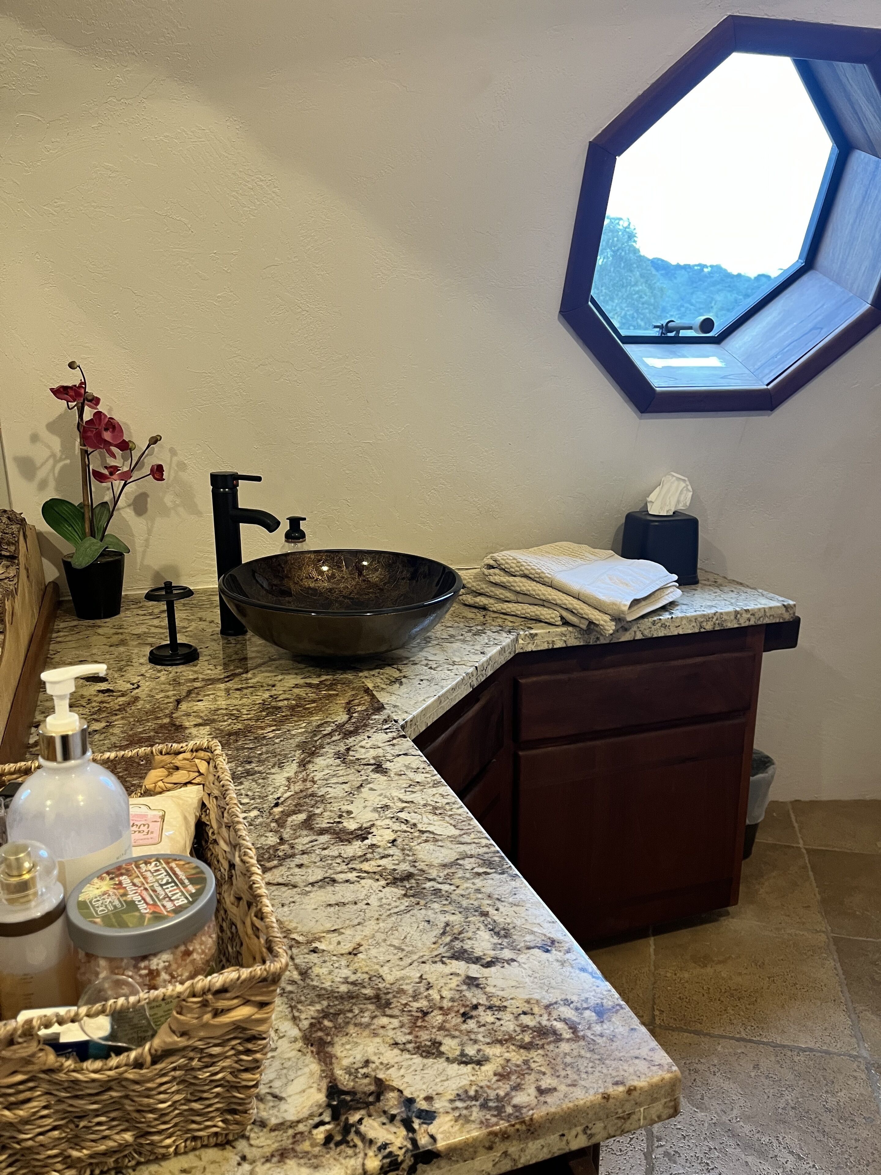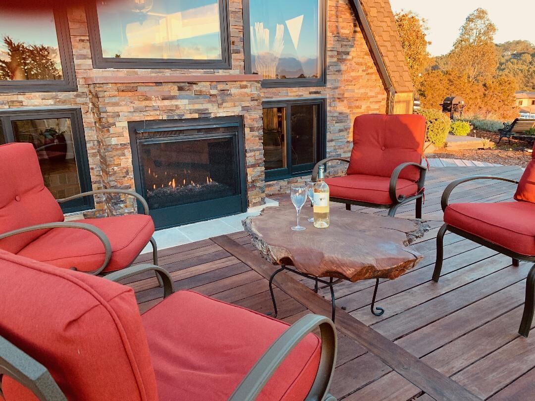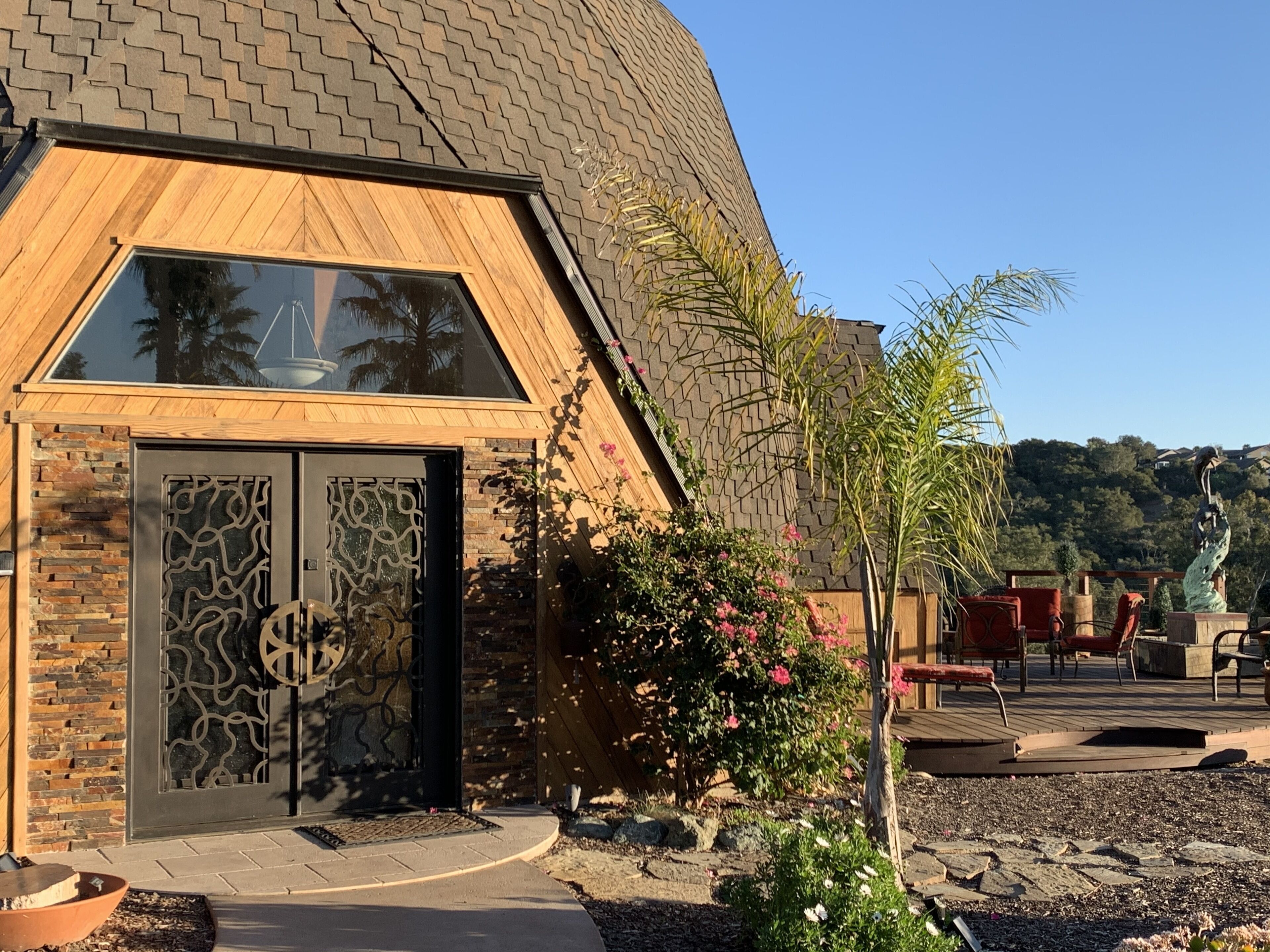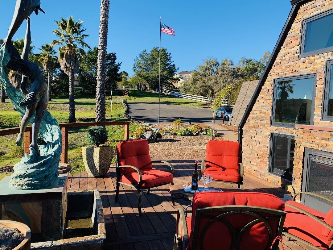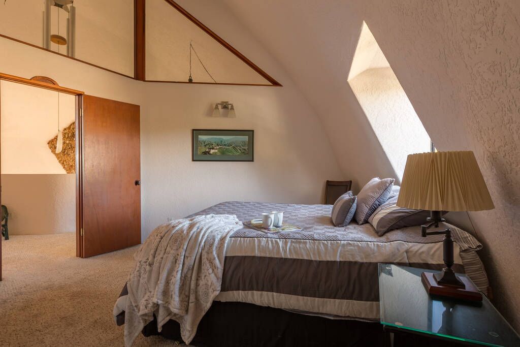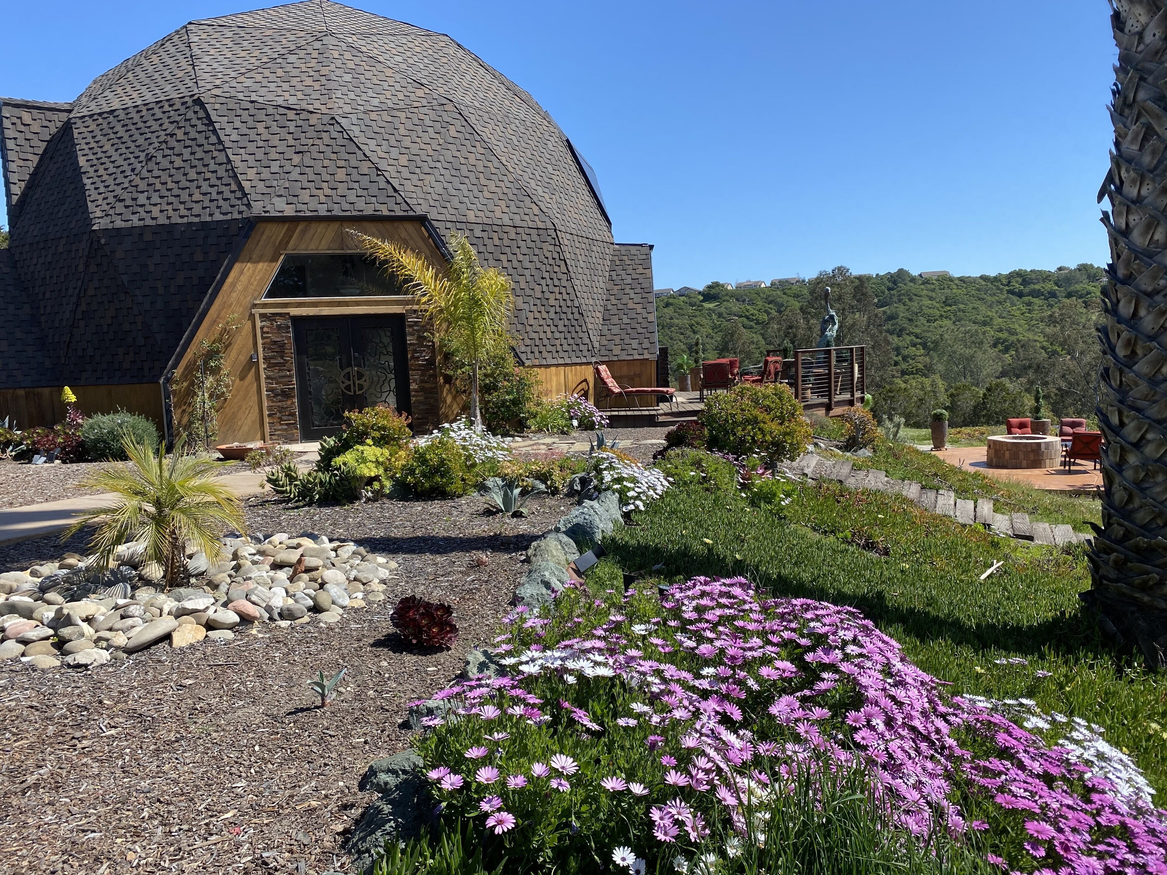 California Dreamin' Upscale Architectural marvel / Horizon ocean view on 3 acres Vista Seas is a custom geodesic dome located on a 3 acre hilltop, with a horizon ocean view of the sea, 5 min. from both Pismo or Grover Beach, 15 minutes from the airport, San Luis Obispoos many downtown cafes, breweries, boutiques and wineries galore.We are 1 minute from the 101 freeway and 5 minutes from anywhere in the 5 cities. A favorite just a 5 minute drive is the Old Town of Arroyo Grande with it's Saturday morning Farmer's market and a multitude of bistros, restaurants and boutiques. Another 5 min. drive takes you to Pismo Beach and it's new boardwalk and pier or try the 'drive on' sand dunes of Grover Beach. Another favorite beach to enjoy with it's many shops and bistros is Avila, a 15 min. drive. The upscale college town of San Luis Obispo is just a 15 min away and more to explore there. It's famous "Thursday night market" where downtown streets are closed off for outdoor vendors and restauants open to the street, it is a crowd pleaser for adults and kids. To keep you busy besides the beaches...did we mention we are centered in the very heart of California's Central Coast WIneries? Too many to mention and all start no more than 10 minutes away.Enjoy the quiet and views of oaks, pines and palms gazing down to the rim of the sea from the Tiger wood decking warmed by the interior/exterior fireplace. Enjoy the Japanese soaking cedar tub. Then take the curved stairs down to the lower stained cement patio and sit around the massive custom Chicago brick firepit with a curved stacked stone wall framing the upper deck. Ample arm chairs and couch with table to sit and enjoy the views with our art in place in the form of massive custom pots and their silk plants to soften the hillside views. Peace and solitude after your busy day.Walking through the custom steel and glass double entry doors you will find the space, light and tranquility that makes the interior of this custom home so unique. 33 foot (11M) high ceilings in the living area, hand troweled plaster walls and a stacked stone wall surrounding the gas interior/exterior fireplace with light from the 20 foot (7M) high custom framed windows that pours into the sunken living area creates an ambiance that is exceptional. The sunken living room fireplace opens out onto the circular Tigerwood deck, complete with seating, table and our unique bronze art piece, "Inspiration" from a L.A. sculptor.The living room with it's high ceiling is exceptional in open plan living with unique art throughout. All lower level floors are Travertine, the counters in the kitchen are Typhoon Bordeaux. In the open plan kitchen is a gas range and an oven with both convection or standard heat choices, all stainless appliances, ultra quiet Bosch dishwasher. Store your wines in the wine frig next to the sink! In the deep sunken living room is the hearth of Rain Forest marble and a massive stacked stone wall with custom 'picture framed' windows facing oaks and palms beyond our deck, is a unique Rainforest marble, as are the counters in the master bath. This theme of nature, stone, rock, and marble runs throughout the home, both in flooring and counters as well as the unique live edge wood furnishings. With such massive ceiling heights, it is the light, the light that makes this home feel as if you are living within nature inside and out. Theatre spot lights brighten up the art and walls in the evenings.Our eclectic art is often the most remarked comments by our guests. From an Egyptian tomb wall replica to an accent up light inside the bones of a Sedona Saguara Cactus set in an Indian Urhli ceremonial bowl keeps ouyr guests on the look out for what else is there? This all adds to the richness that our guests enjoy and helps create an atmosphere that this is not "just a rental" but a home of unique quality and comfort.The master bedroom is on the ground floor and has a California King mattress and en suite bathroom . The art continues with a massive Triptych photo of Bryce Canyon after a snow storm on the wall, as well as an antique Japanese wedding Kimono on another. Sit down at the foot of the bed on a Blue Pine live edge seat to change shoes for beach going flip flops.Before heading up the curved stairs, the office contains a live edged desk, sofa and cushion below the coffee table to play board games oin that are stored in the bookcase, also filled with books. This room features owner's passion for all things magic and has news articles, memorabelia galore to check out while hooking up your lap top.The two bedrooms upstairs have a queen bed in one and two extra- long singles in the third bedroom, with a Travertine tiled tub/shower bathroom in between. The mezzanine landing has a custom live edge "river" desk with ocean views, as well as a child's desk, with coloring books and crayons, kids books available as well. Teak furnishings allow for adults to set down a glass of wine on the Navajo drum, bought in Arizona on a reservation there. The horizon sea views from here are perfect for sunset watching or throughout the day.
