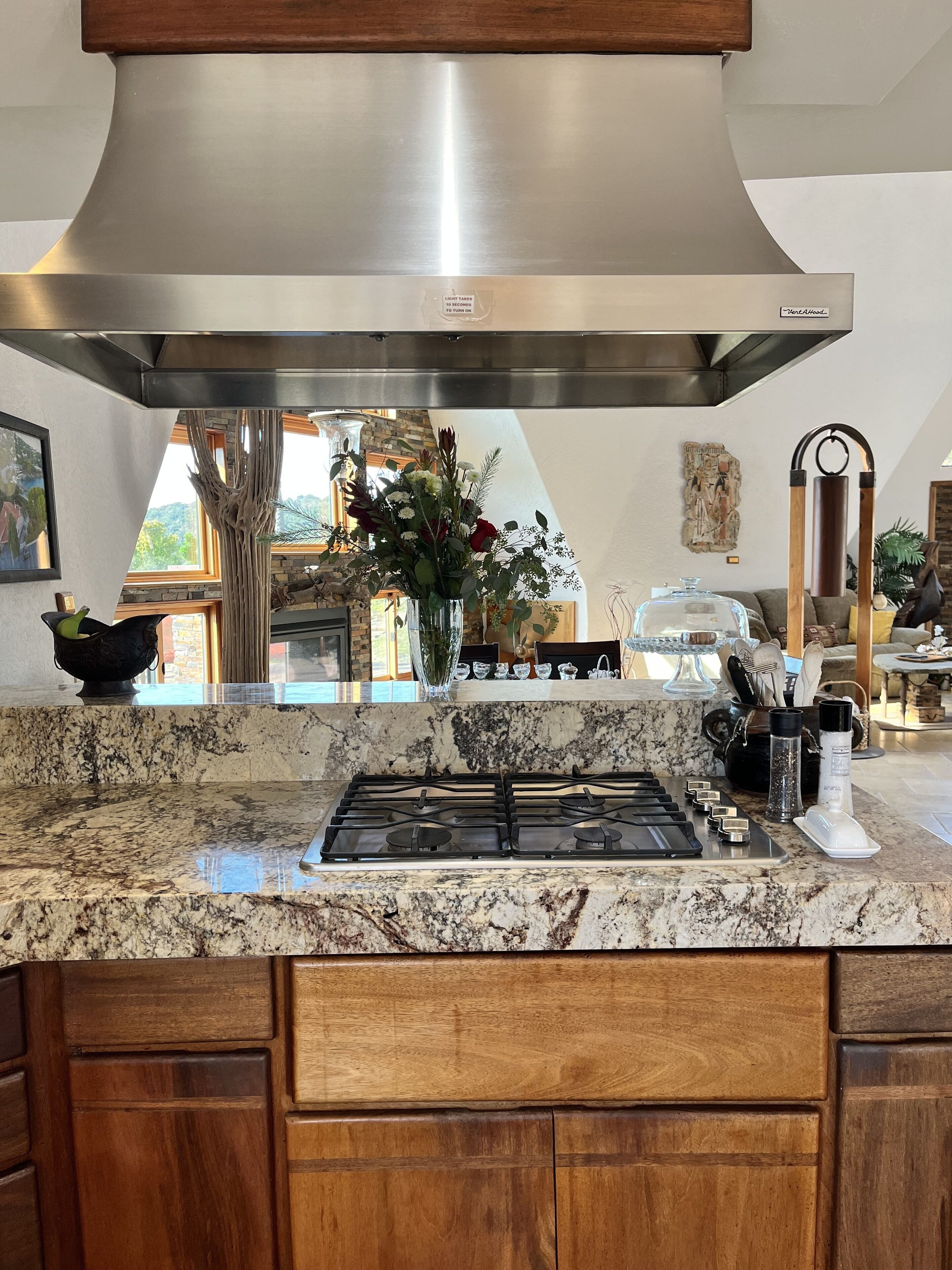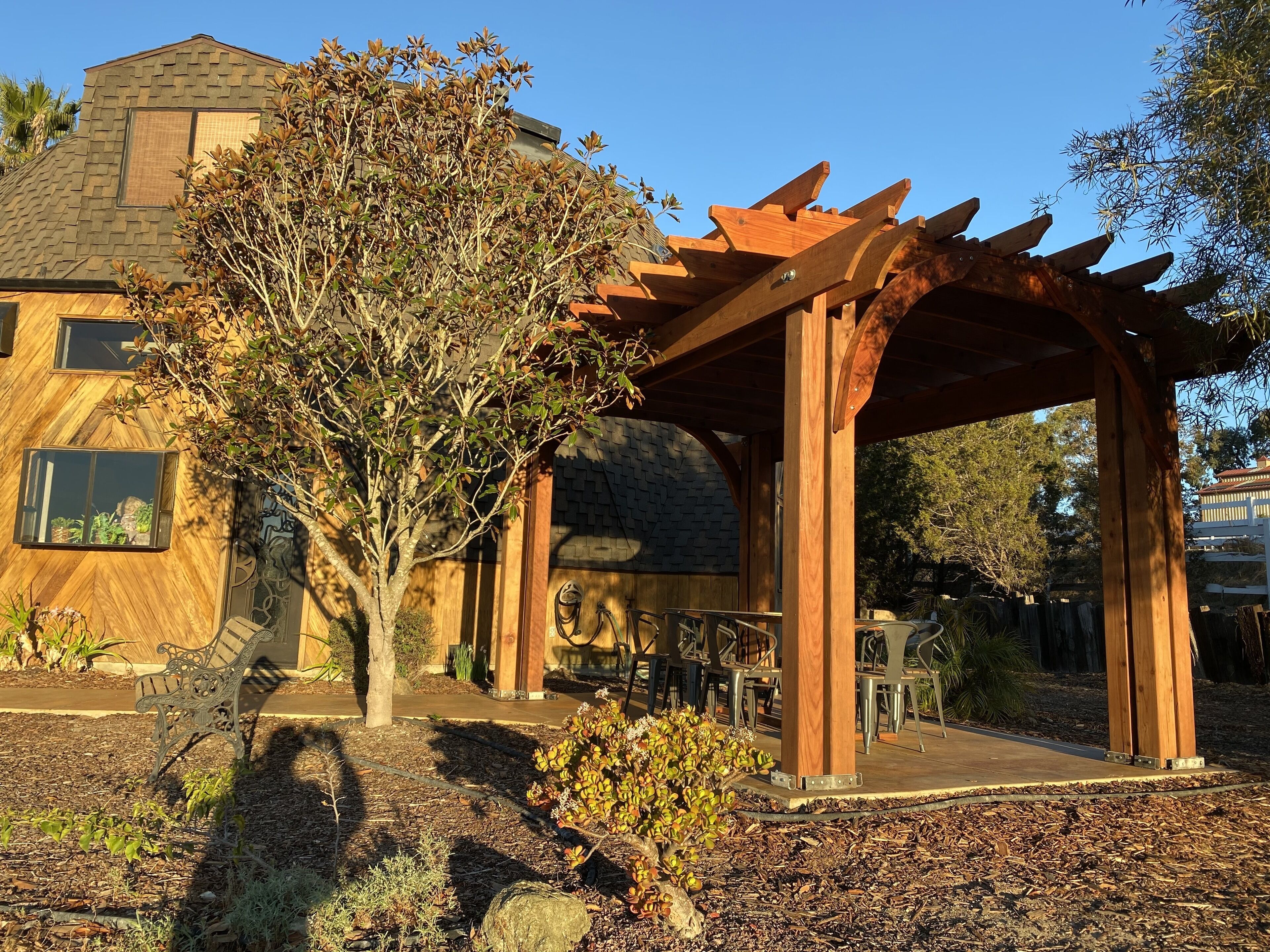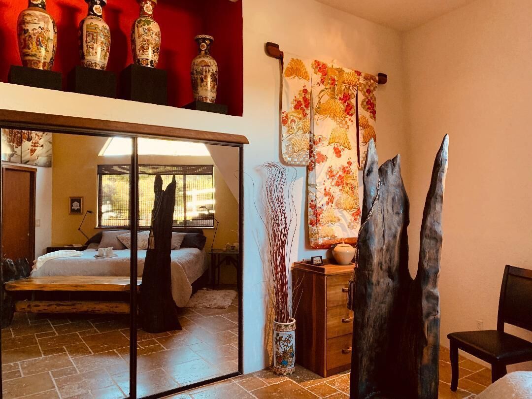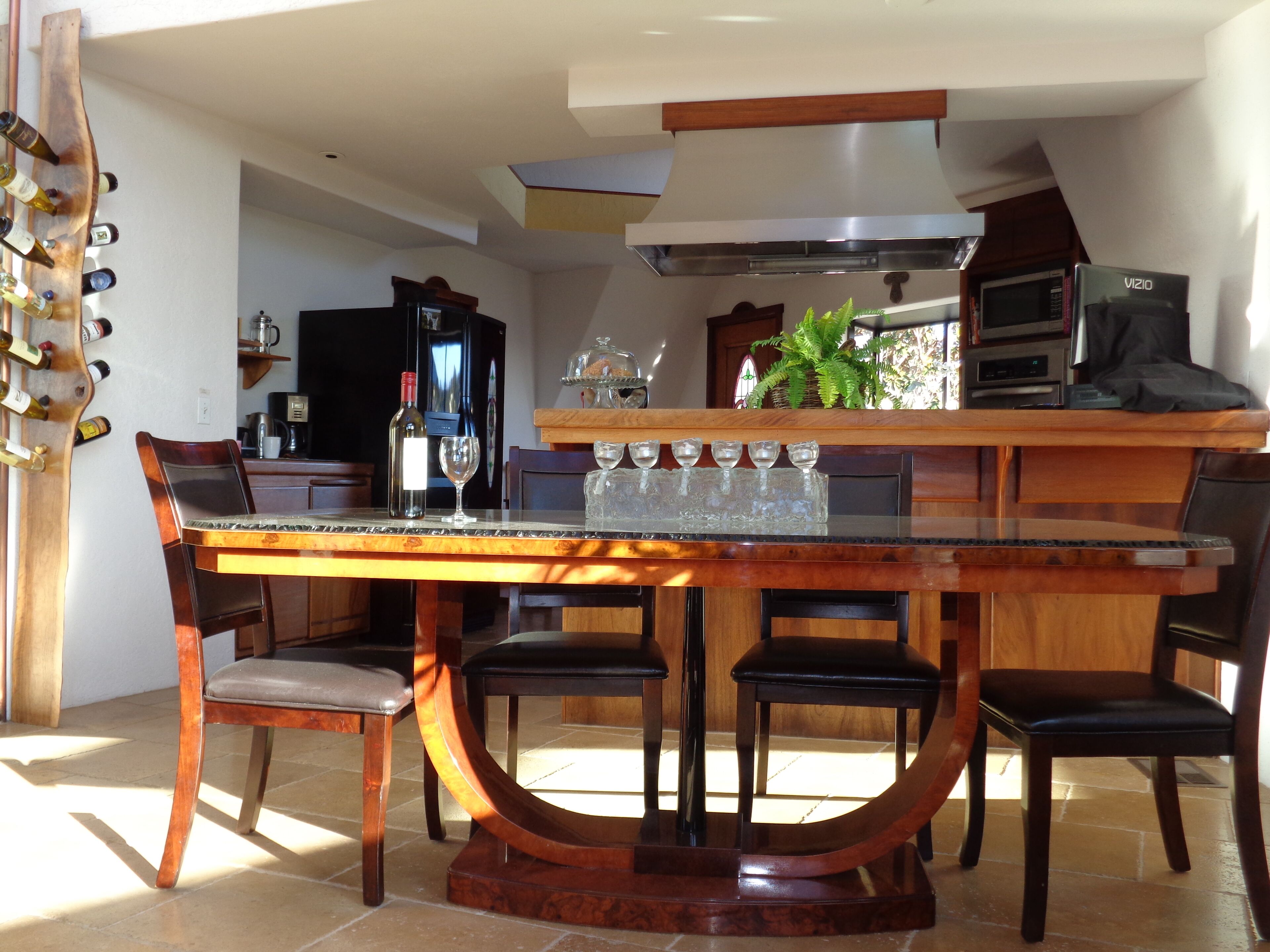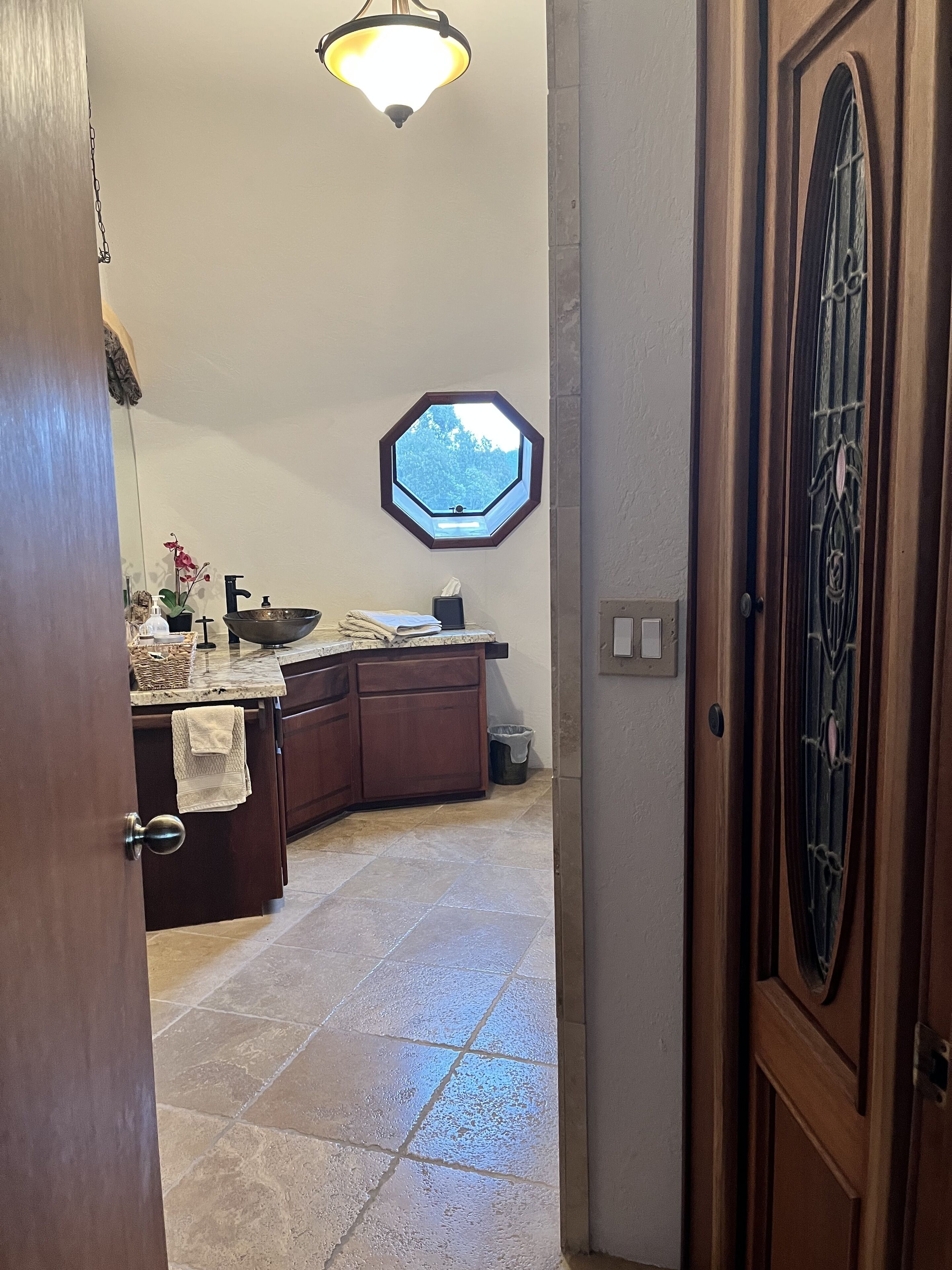 California Dreamin' Upscale Architectural marvel / Horizon ocean view on 3 acres Vista Seas is a custom geodesic dome located on a 3 acre hilltop, with a horizon ocean view of the sea, 5 min. from both Pismo or Grover Beach, 15 minutes from the airport, San Luis Obispoos many downtown cafes, breweries, boutiques and wineries galore.We are 1 minute from the 101 freeway and 5 minutes from anywhere in the 5 cities. A favorite just a 5 minute drive is the Old Town of Arroyo Grande with it's Saturday morning Farmer's market and a multitude of bistros, restaurants and boutiques. Another 5 min. drive takes you to Pismo Beach and it's new boardwalk and pier or try the 'drive on' sand dunes of Grover Beach. Another favorite beach to enjoy with it's many shops and bistros is Avila, a 15 min. drive. The upscale college town of San Luis Obispo is just a 15 min away and more to explore there. It's famous "Thursday night market" where downtown streets are closed off for outdoor vendors and restauants open to the street, it is a crowd pleaser for adults and kids. To keep you busy besides the beaches...did we mention we are centered in the very heart of California's Central Coast WIneries? Too many to mention and all start no more than 10 minutes away.Enjoy the quiet and views of oaks, pines and palms gazing down to the rim of the sea from the Tiger wood decking warmed by the interior/exterior fireplace. Enjoy the Japanese soaking cedar tub. Then take the curved stairs down to the lower stained cement patio and sit around the massive custom Chicago brick firepit with a curved stacked stone wall framing the upper deck. Ample arm chairs and couch with table to sit and enjoy the views with our art in place in the form of massive custom pots and their silk plants to soften the hillside views. Peace and solitude after your busy day.Walking through the custom steel and glass double entry doors you will find the space, light and tranquility that makes the interior of this custom home so unique. 33 foot (11M) high ceilings in the living area, hand troweled plaster walls and a stacked stone wall surrounding the gas interior/exterior fireplace with light from the 20 foot (7M) high custom framed windows that pours into the sunken living area creates an ambiance that is exceptional. The sunken living room fireplace opens out onto the circular Tigerwood deck, complete with seating, table and our unique bronze art piece, "Inspiration" from a L.A. sculptor.The living room with it's high ceiling is exceptional in open plan living with unique art throughout. All lower level floors are Travertine, the counters in the kitchen are Typhoon Bordeaux. In the open plan kitchen is a gas range and an oven with both convection or standard heat choices, all stainless appliances, ultra quiet Bosch dishwasher. Store your wines in the wine frig next to the sink! In the deep sunken living room is the hearth of Rain Forest marble and a massive stacked stone wall with custom 'picture framed' windows facing oaks and palms beyond our deck, is a unique Rainforest marble, as are the counters in the master bath. This theme of nature, stone, rock, and marble runs throughout the home, both in flooring and counters as well as the unique live edge wood furnishings. With such massive ceiling heights, it is the light, the light that makes this home feel as if you are living within nature inside and out. Theatre spot lights brighten up the art and walls in the evenings.Our eclectic art is often the most remarked comments by our guests. From an Egyptian tomb wall replica to an accent up light inside the bones of a Sedona Saguara Cactus set in an Indian Urhli ceremonial bowl keeps ouyr guests on the look out for what else is there? This all adds to the richness that our guests enjoy and helps create an atmosphere that this is not "just a rental" but a home of unique quality and comfort.The master bedroom is on the ground floor and has a California King mattress and en suite bathroom . The art continues with a massive Triptych photo of Bryce Canyon after a snow storm on the wall, as well as an antique Japanese wedding Kimono on another. Sit down at the foot of the bed on a Blue Pine live edge seat to change shoes for beach going flip flops.Before heading up the curved stairs, the office contains a live edged desk, sofa and cushion below the coffee table to play board games oin that are stored in the bookcase, also filled with books. This room features owner's passion for all things magic and has news articles, memorabelia galore to check out while hooking up your lap top.The two bedrooms upstairs have a queen bed in one and two extra- long singles in the third bedroom, with a Travertine tiled tub/shower bathroom in between. The mezzanine landing has a custom live edge "river" desk with ocean views, as well as a child's desk, with coloring books and crayons, kids books available as well. Teak furnishings allow for adults to set down a glass of wine on the Navajo drum, bought in Arizona on a reservation there. The horizon sea views from here are perfect for sunset watching or throughout the day.