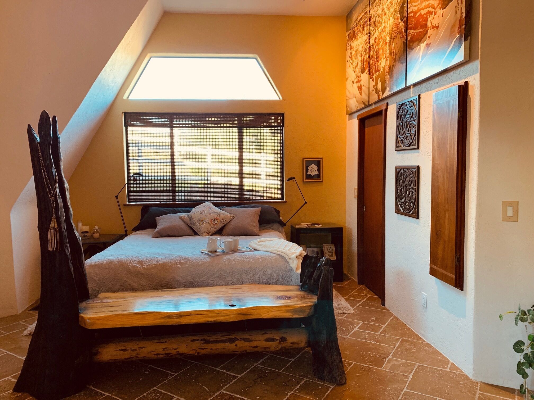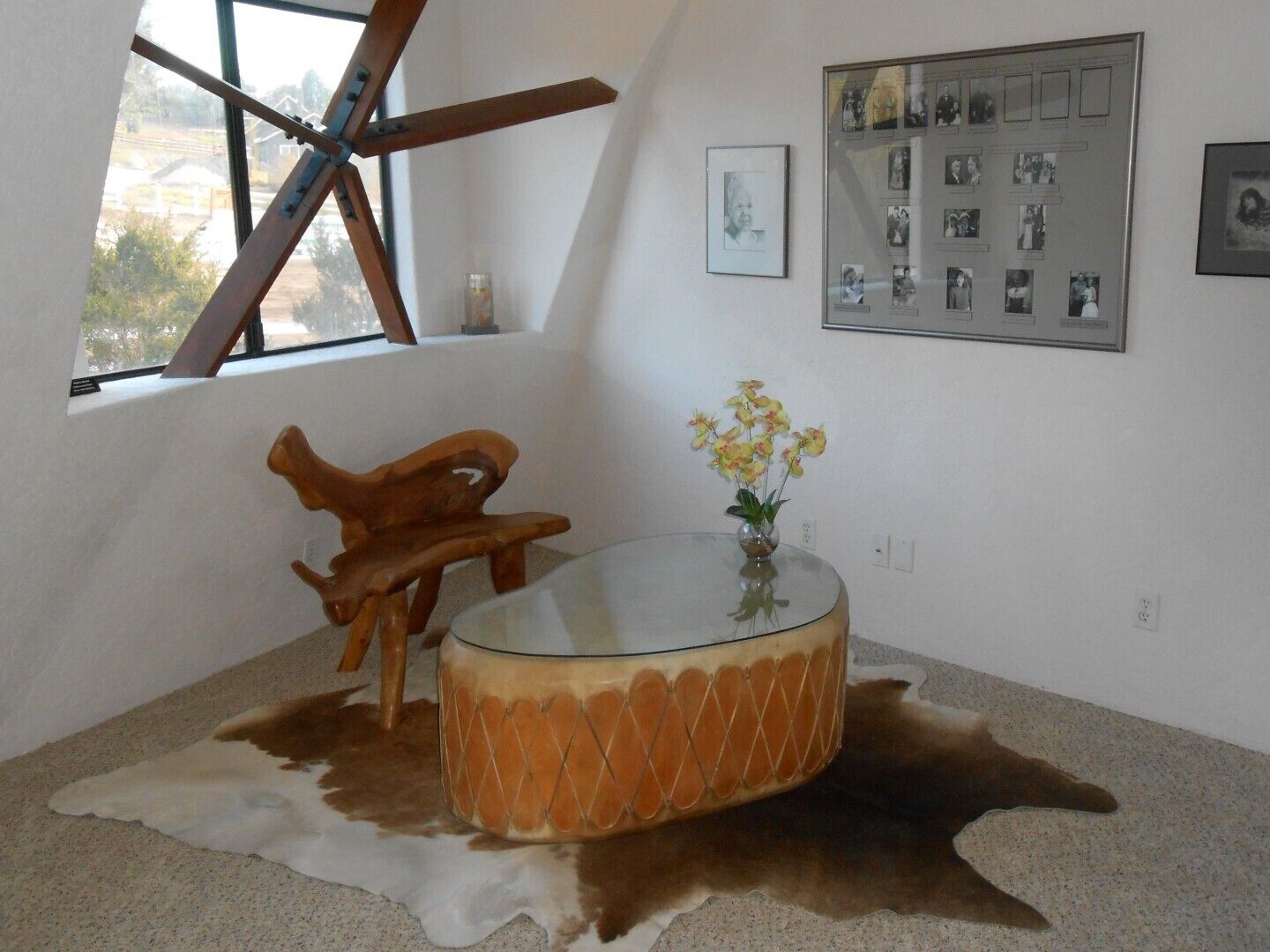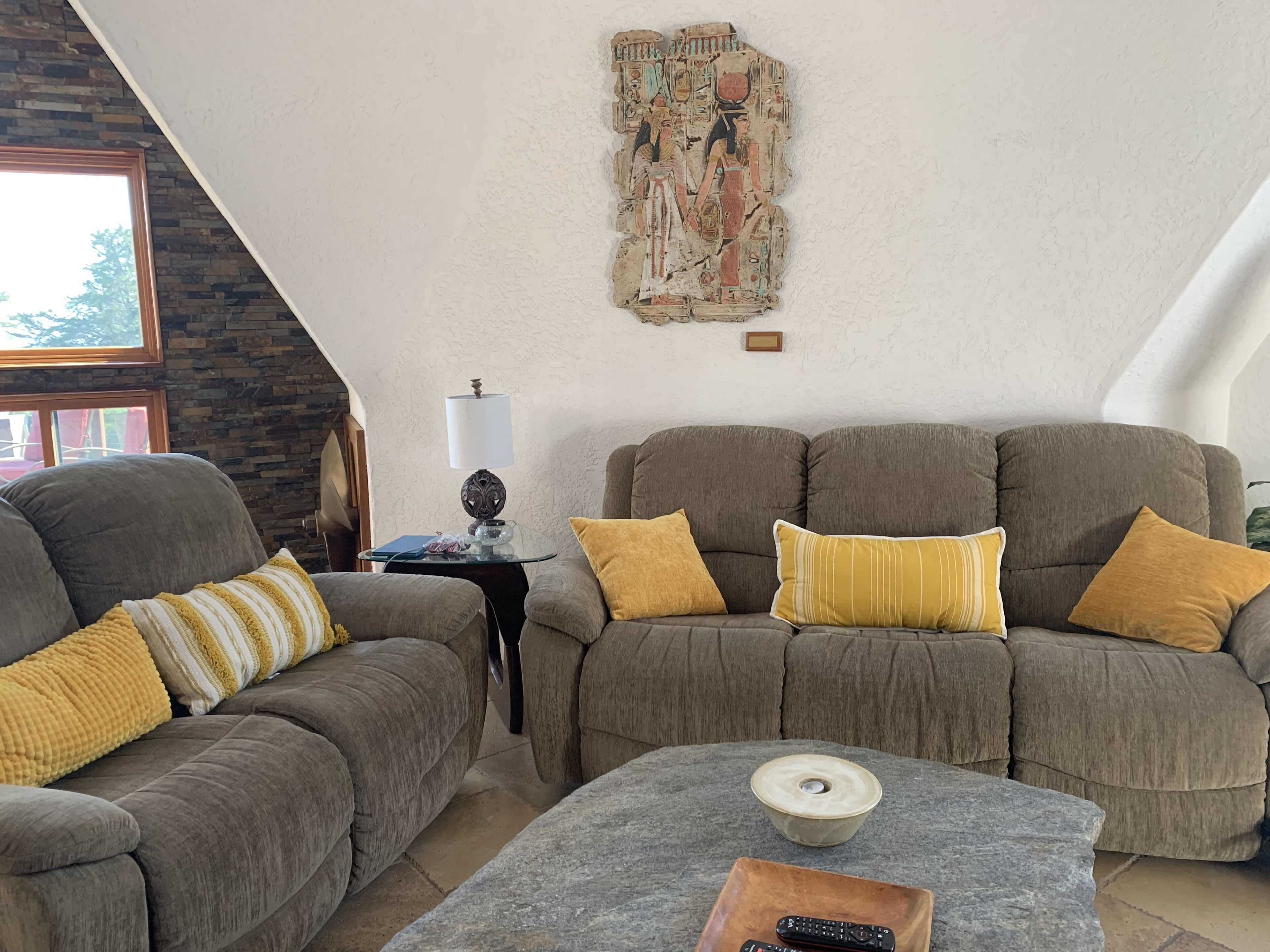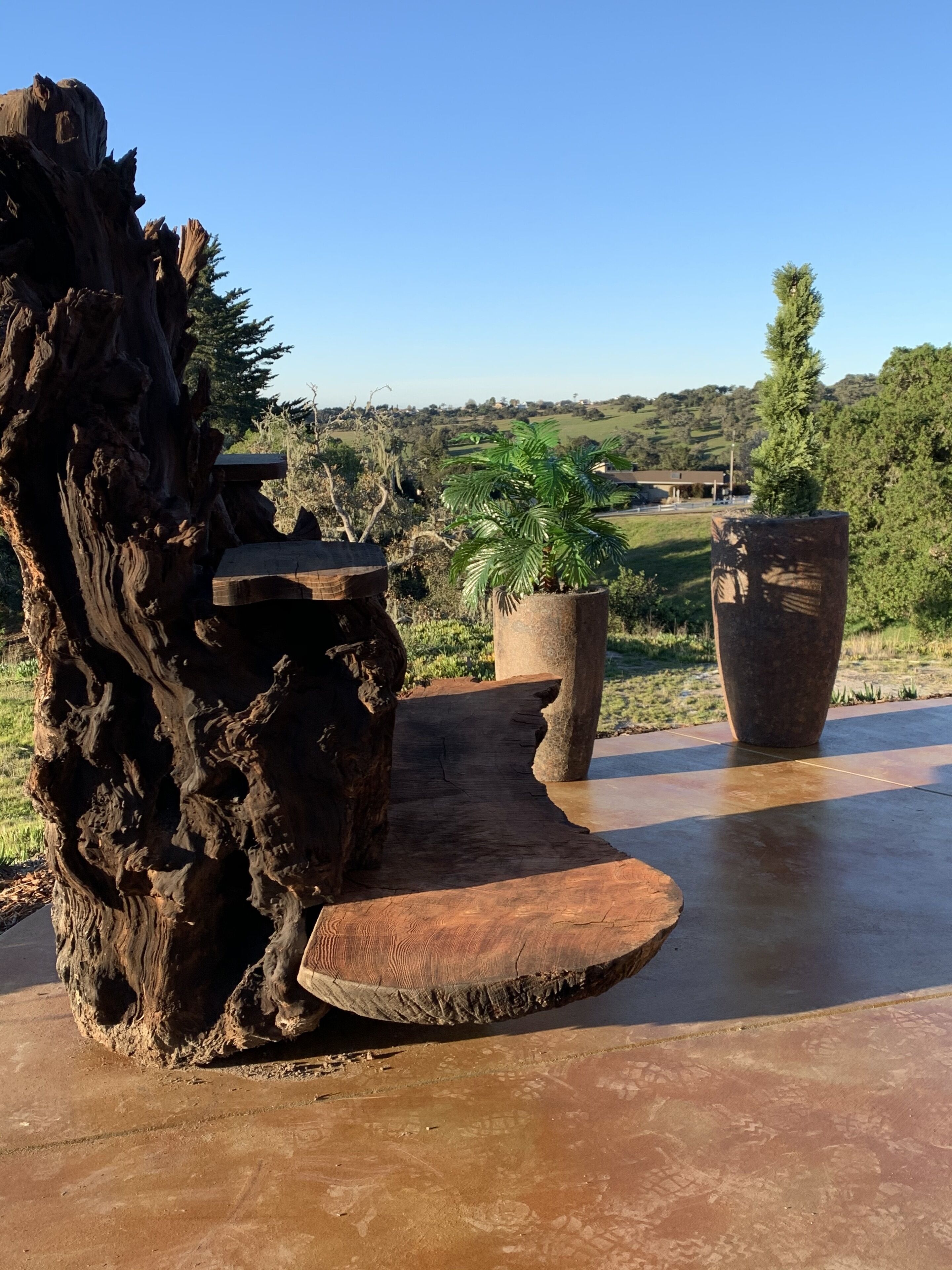 California Dreamin' Upscale Architectural marvel / Horizon ocean view on 3 acres Vista Seas is a custom geodesic dome located on a 3 acre hilltop, with a horizon ocean view of the sea, 5 min. from both Pismo or Grover Beach, 15 minutes from the airport, San Luis Obispoos many downtown cafes, breweries, boutiques and wineries galore.We are 1 minute from the 101 freeway and 5 minutes from anywhere in the 5 cities. A favorite just a 5 minute drive is the Old Town of Arroyo Grande with it's Saturday morning Farmer's market and a multitude of bistros, restaurants and boutiques. Another 5 min. drive takes you to Pismo Beach and it's new boardwalk and pier or try the 'drive on' sand dunes of Grover Beach. Another favorite beach to enjoy with it's many shops and bistros is Avila, a 15 min. drive. The upscale college town of San Luis Obispo is just a 15 min away and more to explore there. It's famous "Thursday night market" where downtown streets are closed off for outdoor vendors and restauants open to the street, it is a crowd pleaser for adults and kids. To keep you busy besides the beaches...did we mention we are centered in the very heart of California's Central Coast WIneries? Too many to mention and all start no more than 10 minutes away.Enjoy the quiet and views of oaks, pines and palms gazing down to the rim of the sea from the Tiger wood decking warmed by the interior/exterior fireplace. Enjoy the Japanese soaking cedar tub. Then take the curved stairs down to the lower stained cement patio and sit around the massive custom Chicago brick firepit with a curved stacked stone wall framing the upper deck. Ample arm chairs and couch with table to sit and enjoy the views with our art in place in the form of massive custom pots and their silk plants to soften the hillside views. Peace and solitude after your busy day.Walking through the custom steel and glass double entry doors you will find the space, light and tranquility that makes the interior of this custom home so unique. 33 foot (11M) high ceilings in the living area, hand troweled plaster walls and a stacked stone wall surrounding the gas interior/exterior fireplace with light from the 20 foot (7M) high custom framed windows that pours into the sunken living area creates an ambiance that is exceptional. The sunken living room fireplace opens out onto the circular Tigerwood deck, complete with seating, table and our unique bronze art piece, "Inspiration" from a L.A. sculptor.The living room with it's high ceiling is exceptional in open plan living with unique art throughout. All lower level floors are Travertine, the counters in the kitchen are Typhoon Bordeaux. In the open plan kitchen is a gas range and an oven with both convection or standard heat choices, all stainless appliances, ultra quiet Bosch dishwasher. Store your wines in the wine frig next to the sink! In the deep sunken living room is the hearth of Rain Forest marble and a massive stacked stone wall with custom 'picture framed' windows facing oaks and palms beyond our deck, is a unique Rainforest marble, as are the counters in the master bath. This theme of nature, stone, rock, and marble runs throughout the home, both in flooring and counters as well as the unique live edge wood furnishings. With such massive ceiling heights, it is the light, the light that makes this home feel as if you are living within nature inside and out. Theatre spot lights brighten up the art and walls in the evenings.Our eclectic art is often the most remarked comments by our guests. From an Egyptian tomb wall replica to an accent up light inside the bones of a Sedona Saguara Cactus set in an Indian Urhli ceremonial bowl keeps ouyr guests on the look out for what else is there? This all adds to the richness that our guests enjoy and helps create an atmosphere that this is not "just a rental" but a home of unique quality and comfort.The master bedroom is on the ground floor and has a California King mattress and en suite bathroom . The art continues with a massive Triptych photo of Bryce Canyon after a snow storm on the wall, as well as an antique Japanese wedding Kimono on another. Sit down at the foot of the bed on a Blue Pine live edge seat to change shoes for beach going flip flops.Before heading up the curved stairs, the office contains a live edged desk, sofa and cushion below the coffee table to play board games oin that are stored in the bookcase, also filled with books. This room features owner's passion for all things magic and has news articles, memorabelia galore to check out while hooking up your lap top.The two bedrooms upstairs have a queen bed in one and two extra- long singles in the third bedroom, with a Travertine tiled tub/shower bathroom in between. The mezzanine landing has a custom live edge "river" desk with ocean views, as well as a child's desk, with coloring books and crayons, kids books available as well. Teak furnishings allow for adults to set down a glass of wine on the Navajo drum, bought in Arizona on a reservation there. The horizon sea views from here are perfect for sunset watching or throughout the day.