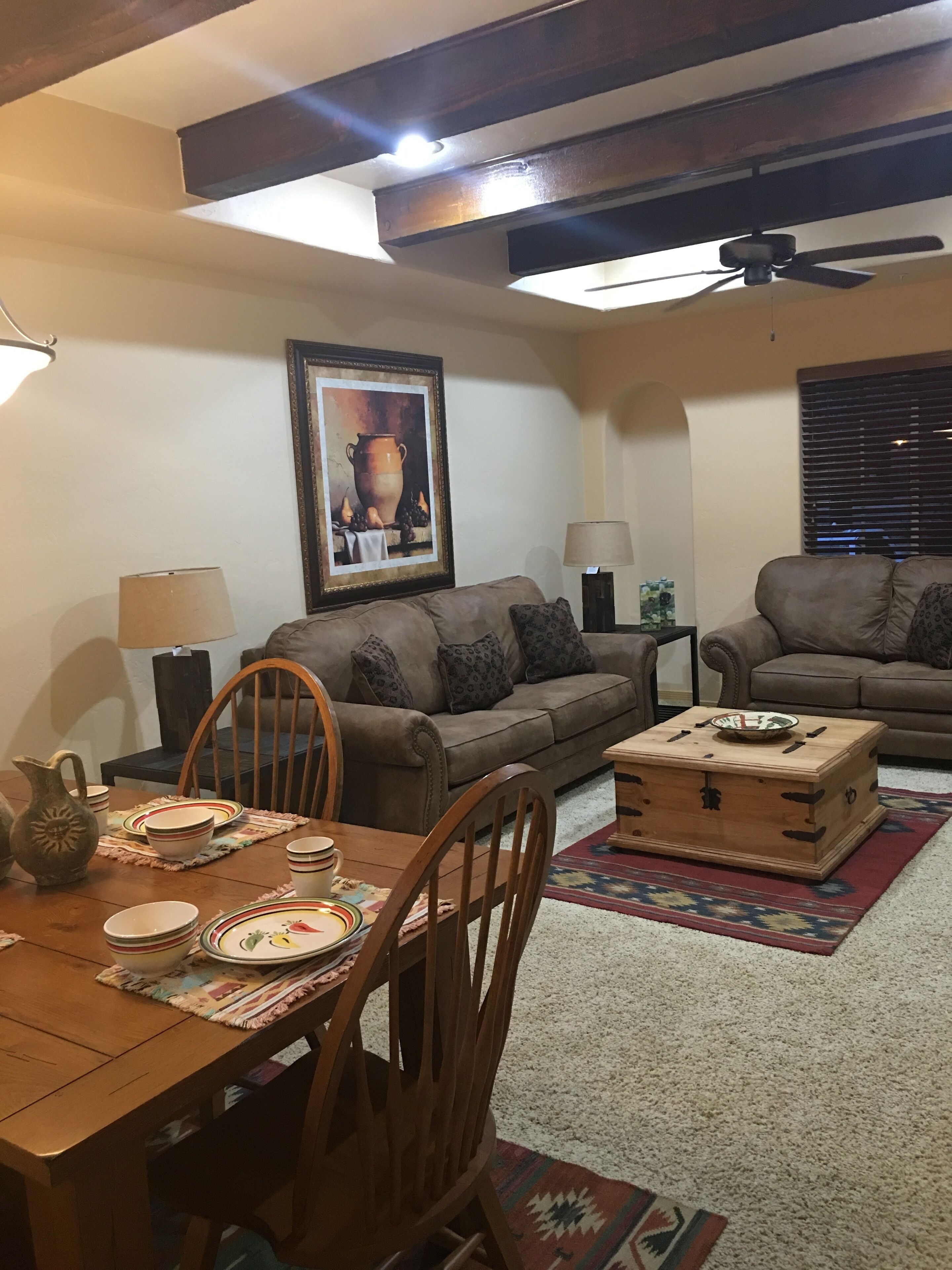 Encanto de Mesilla - Comfort and Taste! Luxury ground floor condo, decorated in Southwestern style. 2 bedroom condo in Villa Esperanza. King luxury bed in master bedroom, luxury queen bed in second bedroom, and sofa bed in living room. Gated community minutes from historic Old Mesilla. Exercise room and swimming pool located in complex. Host Ana takes care of their guests like they are family, with great warmth and friendship. Enjoy our southwest cozy abode elegantly decorated in modern southwest style and the most comfortable beds and bedding.We allow one dog under 50 lbs. with a non-refundable $125.00 deposit.Why Las Cruces, NM, USA:We are close to interstate 1-10 which will take you into El Paso, Texas in 50 minutes with the El Paso, Texas airport about 1 hr. away. There is also the Sunland Park Racetrack and Casino. Along the way there is a big outlet store mall for lots of great shopping. We have Ruidoso Downs and Casino and the Inn of the Mountain Gods Resort, run by the Apache tribe is just 2 hours away! We have Truth or Consequences which is the home of Elephant Butte Dam with lots of boating and fun water sports. This is only 1 hour away. We are on the border of Mexico. We are the proud Aggies of New Mexico State University and enjoy the beautiful Organ Mountains panoramic view. We have the Picacho Country Club where there is golf a few minutes away plus we have other golf courses such as New Mexico State University Golf Course, Sonoma Golf Course, and Red Hawk Golf Course. We are an hour away from the White Sands Missile Range and Space Museum. We are also one hour away from Spaceport America. We are three hours from Albuquerque, New Mexico and four hours away from Santa Fe, New Mexico. We are the Land of Enchantment. We have different festivals going on all year round such as: Día de Los Muertos, Cinco de Mayo Fiesta, Las Cruces Film Festival, The Las Cruces Symphony Orchestra, The Rio Grande Theater, Community Theater, Black Box Theater, The Downtown Farmers Market on Saturdays, The Electric Light Parade on the Fourth of July, plus many more fun events. For events, check: https://www.visitlascruces.com/things-to-do/