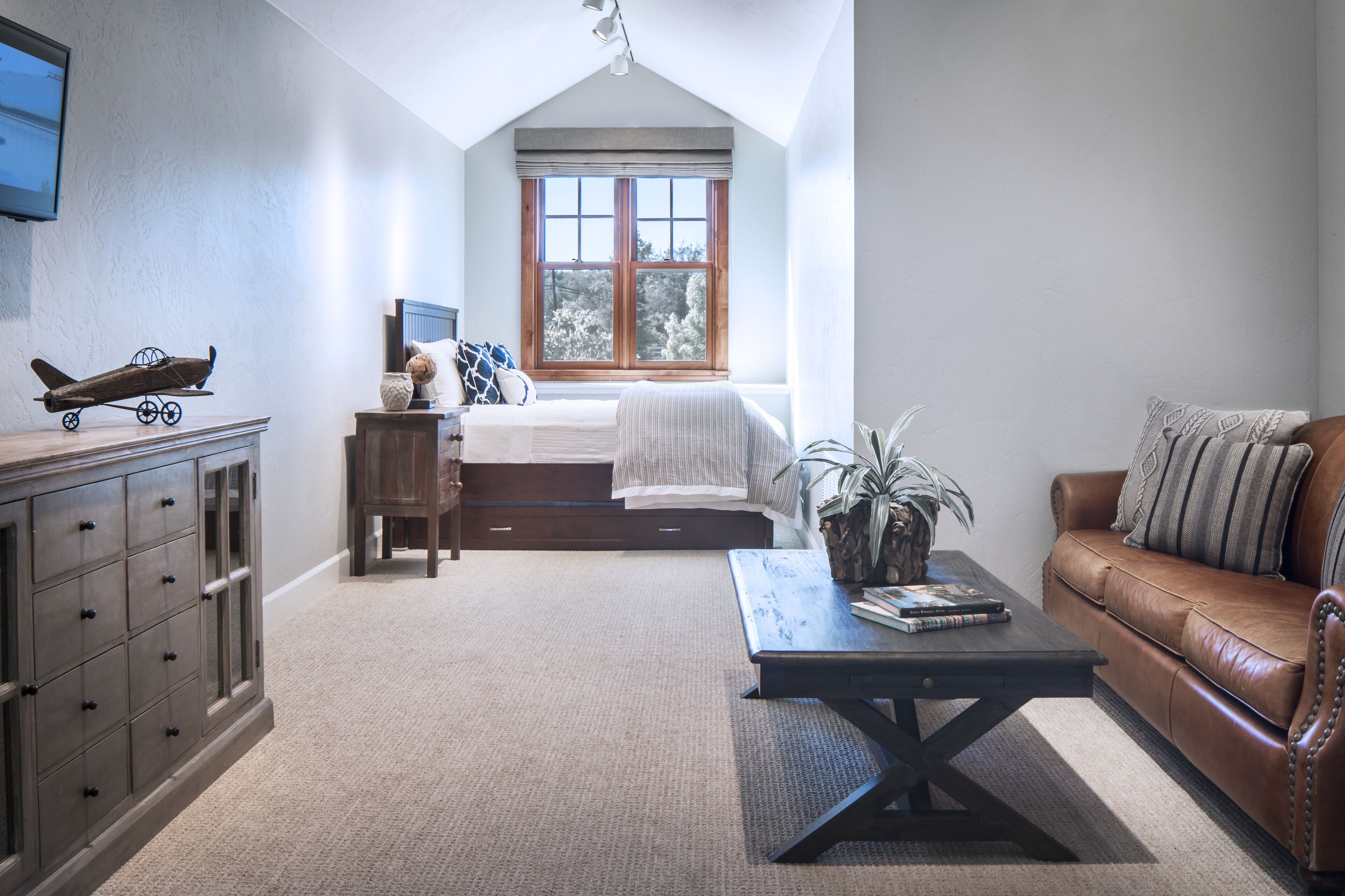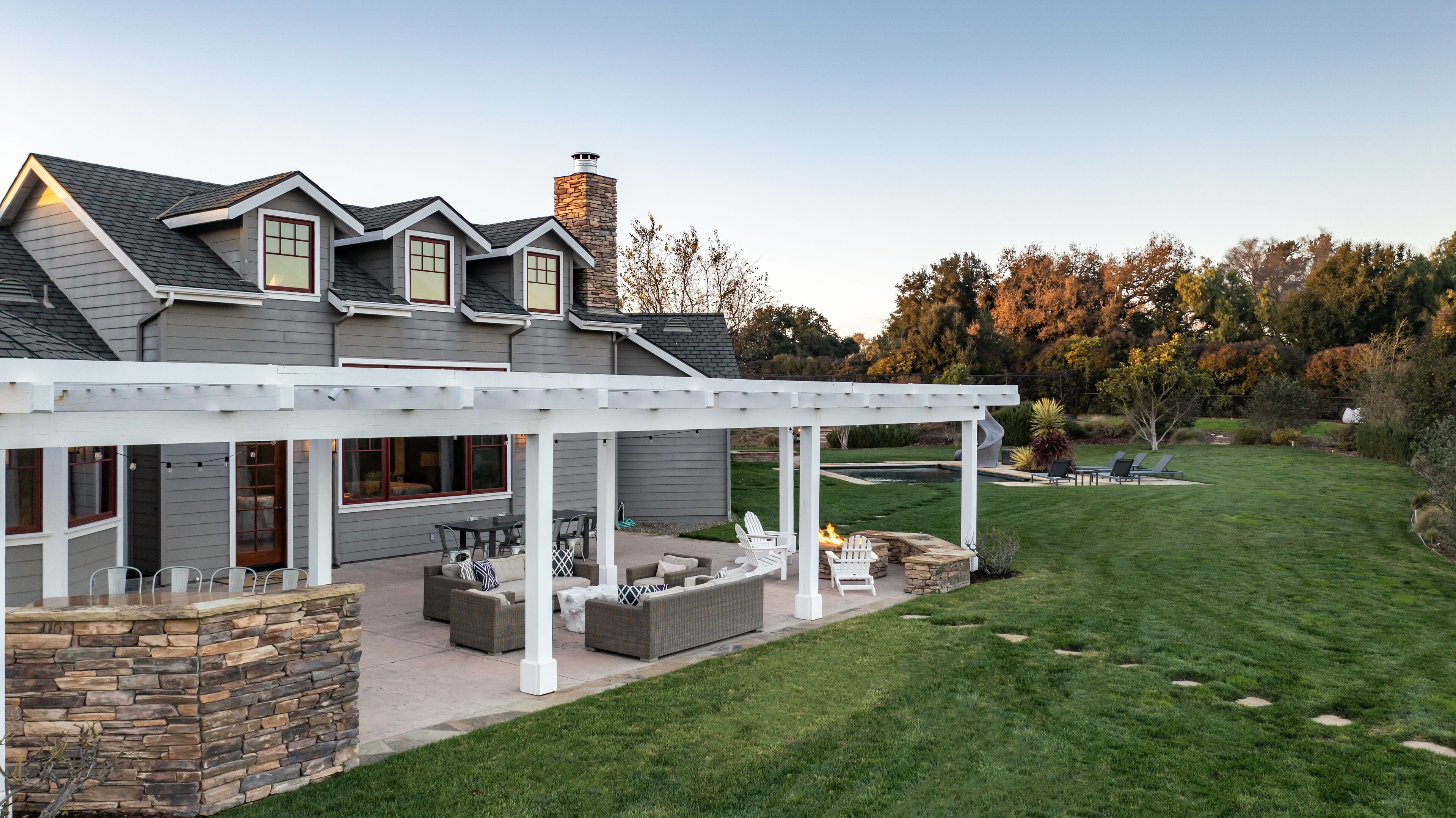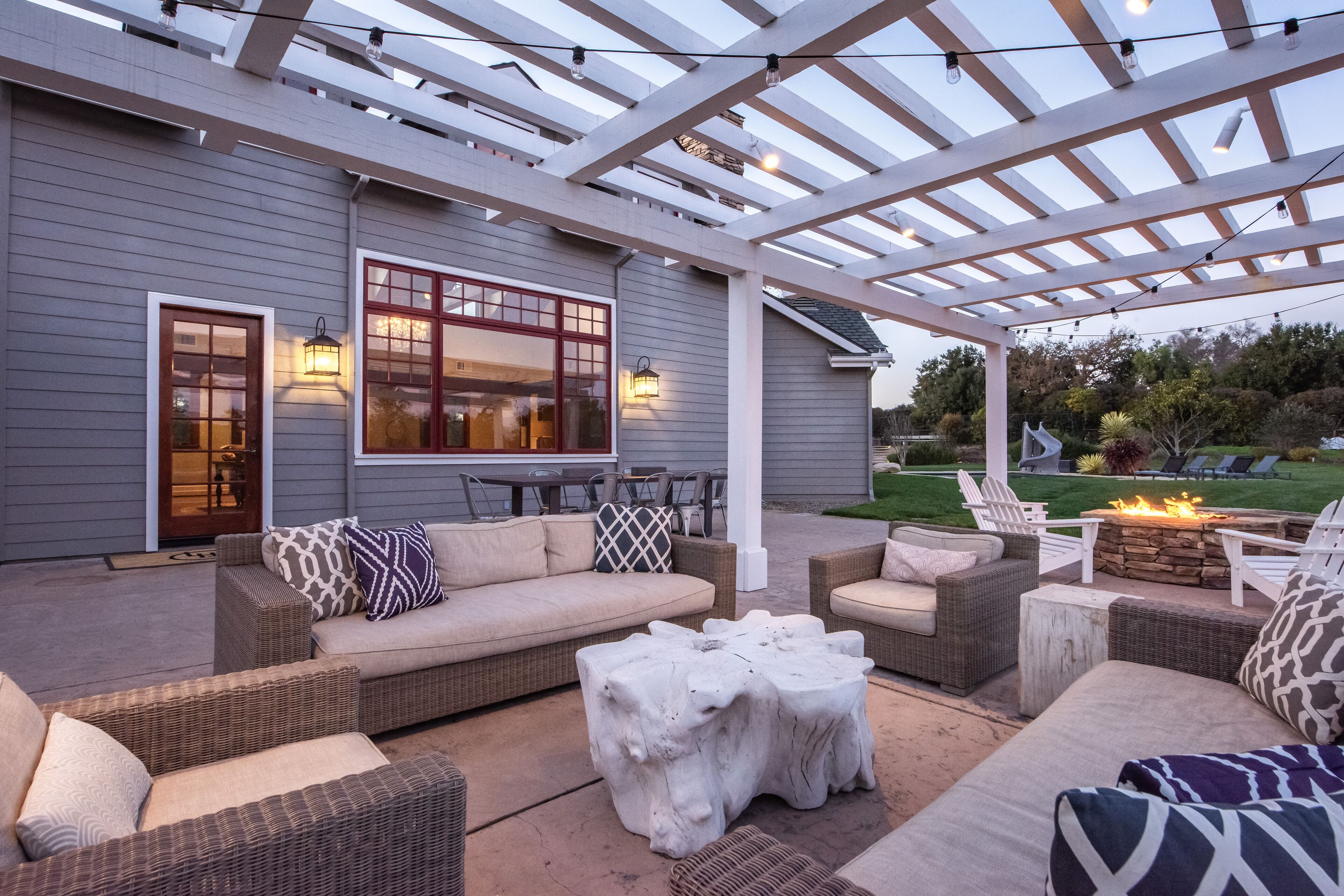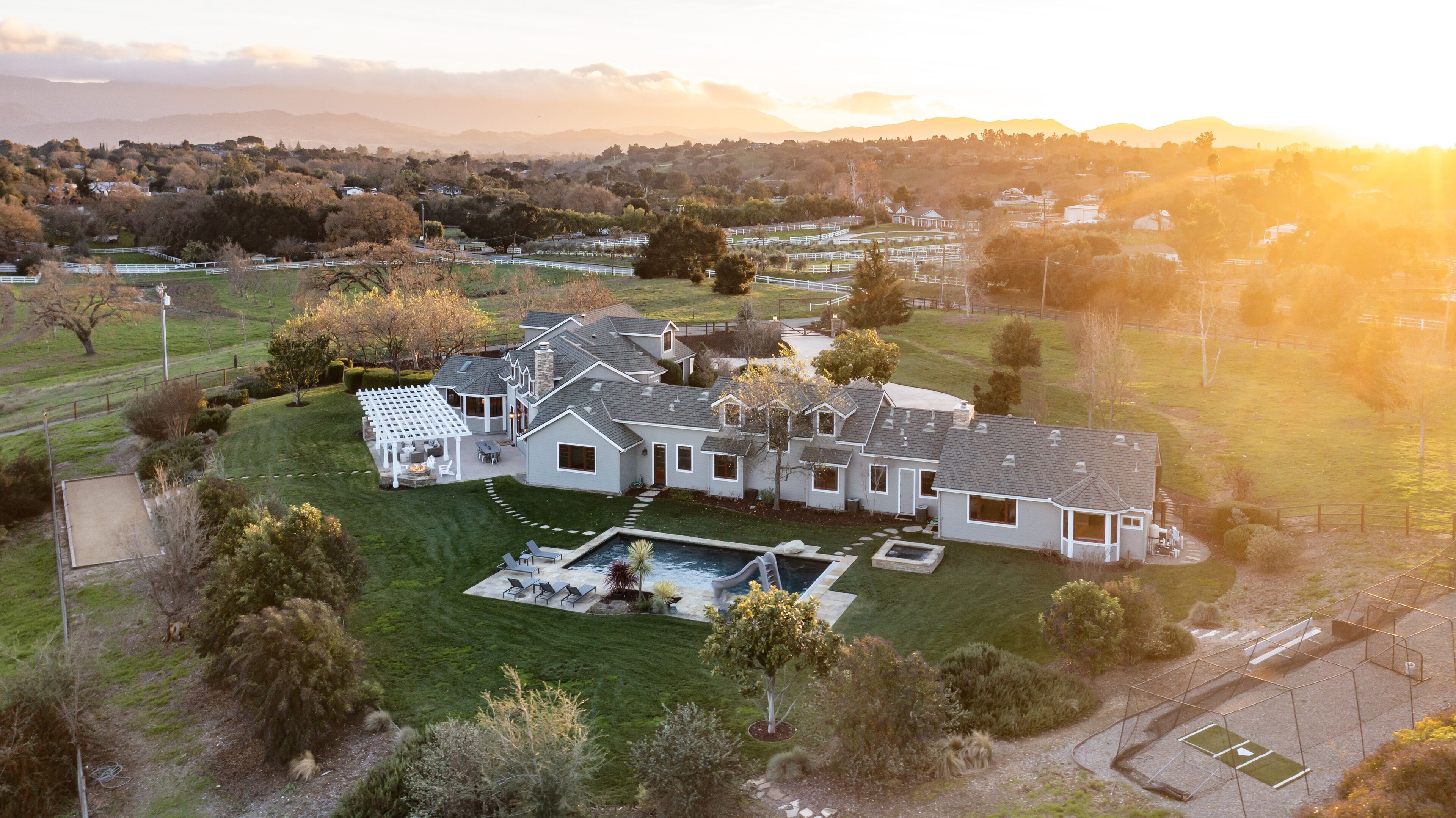 Extraordinary Wine Country Property Santa Ynez / Los Olivos ** Please note this property is available on a 30-day rental basis. Please contact owner for more details. **Lose yourself in the splendor of this extraordinary light-filled wine country property. Halfway between the charming townships of Solvang, Santa Ynez and Los Olivos, 5-acre Left Hand Ranch is a truly impressive home. Luxury amenities abound providing unlimited possibilities for recreation and relaxation.The home has a large gourmet kitchen, a cozy breakfast nook, formal dining room, hot tub, pool, outdoor fire pit, and an indoor wet bar graced with the presence of a majestic longhorn. The splendor of Left Hand Ranch is apparent from the moment you walk through the front doors. The elevated ceilings with a full wall of glass window provide a beautiful view of the San Rafael Mountains, ideal for those early risers looking to catch a glorious sunrise. With 6,500 square feet, the house is spacious enough so everyone can enjoy a wonderful family vacation. There is a formal living room with a gorgeous stone fireplace sharing an open floor plan with the kitchen and wet bar, as well as a more casual family room with a plush leather sectional and a large flat screen television. The attention to detail in the design of this house goes far below the surface here; it’s outfitted with state of the art Nest thermostat so that you may set the temperature before your arrival as well as Sonos sound system throughout the interior and exterior. Control the environment through your i-phone, what a dream.The 5 bedrooms are divided thoughtfully: a grand master with a California King four poster bed, fireplace, and en-suite bathroom; two more master bedrooms with California Kings, walk in closets, and en-suite bathrooms; a second story devoted to children with 5 built in full sized bunk beds and an attached playroom with TV; and an upstairs two bedroom apartment with a queen bed, a full bed, a full trundle bed, a queen sleeper sofa and an attached bathroom. The separation comes in handy. The outdoor space is optimal for enjoying this inclusive property. The backyard has a regulation sized bocce ball court, hot tub, a large pool with a water slide, plenty of lounge chairs to lose yourself in the long summer afternoons and an outdoor dining area complete with a built in BBQ grill, fire pit, and a large dining table.