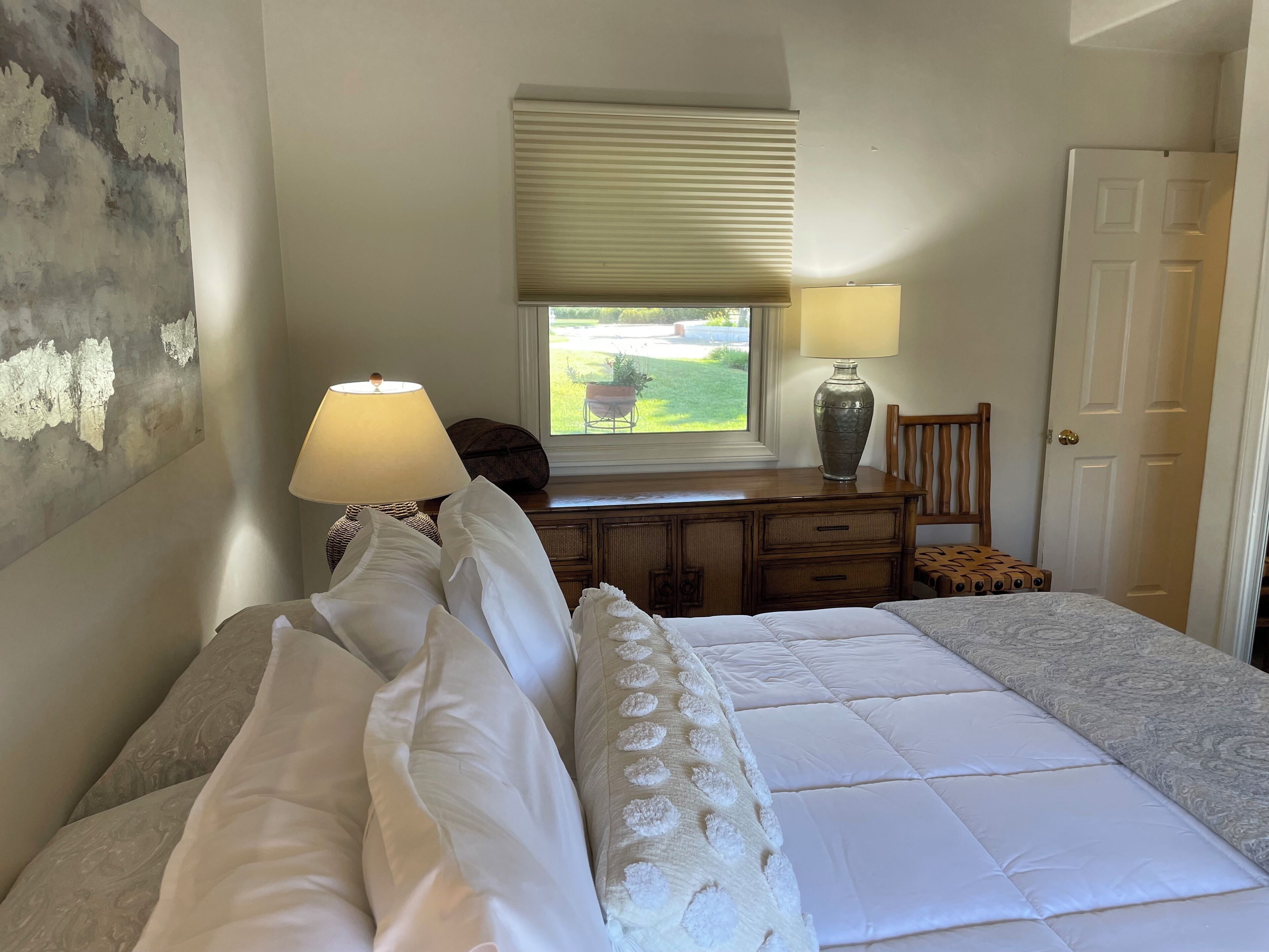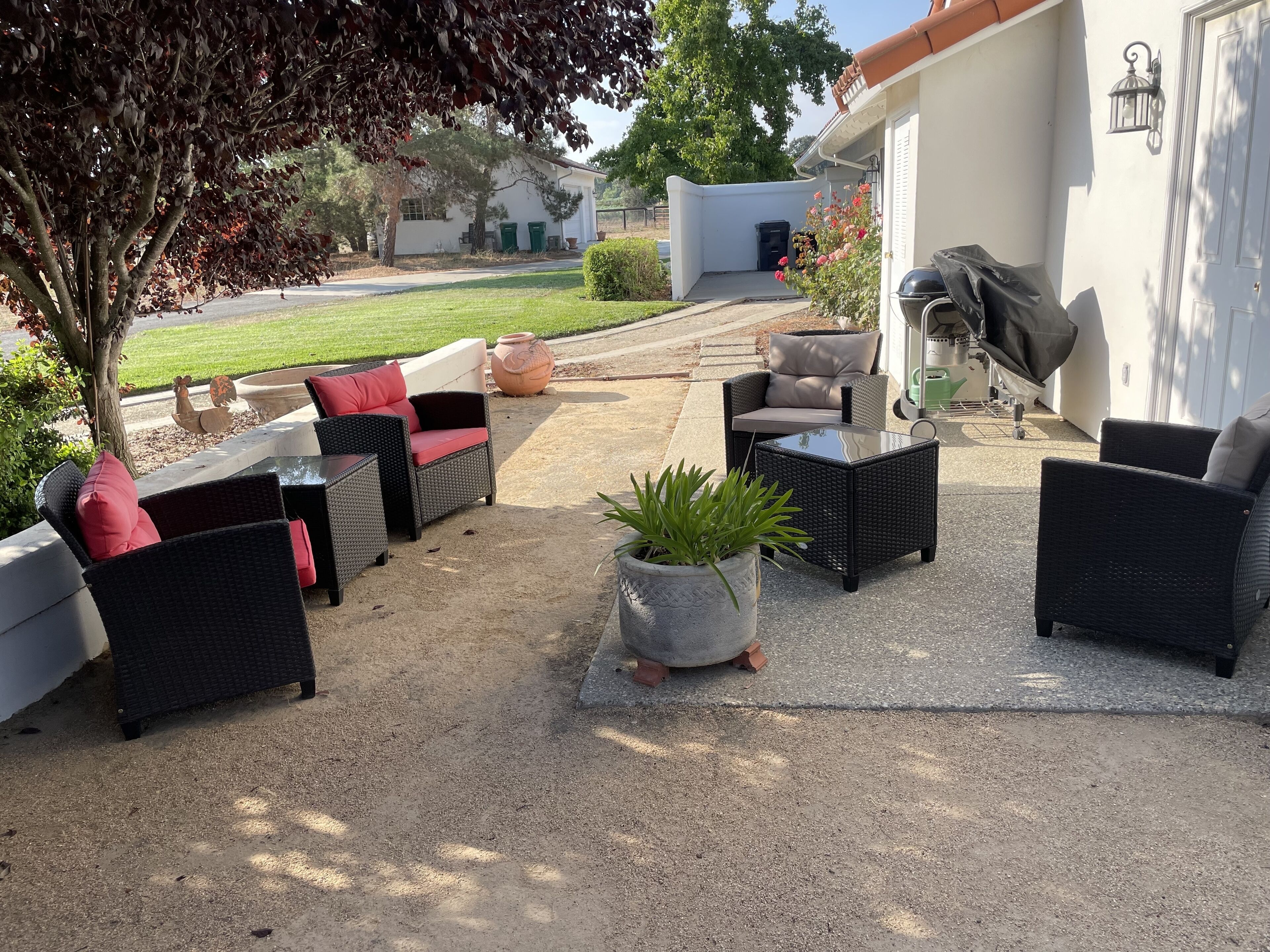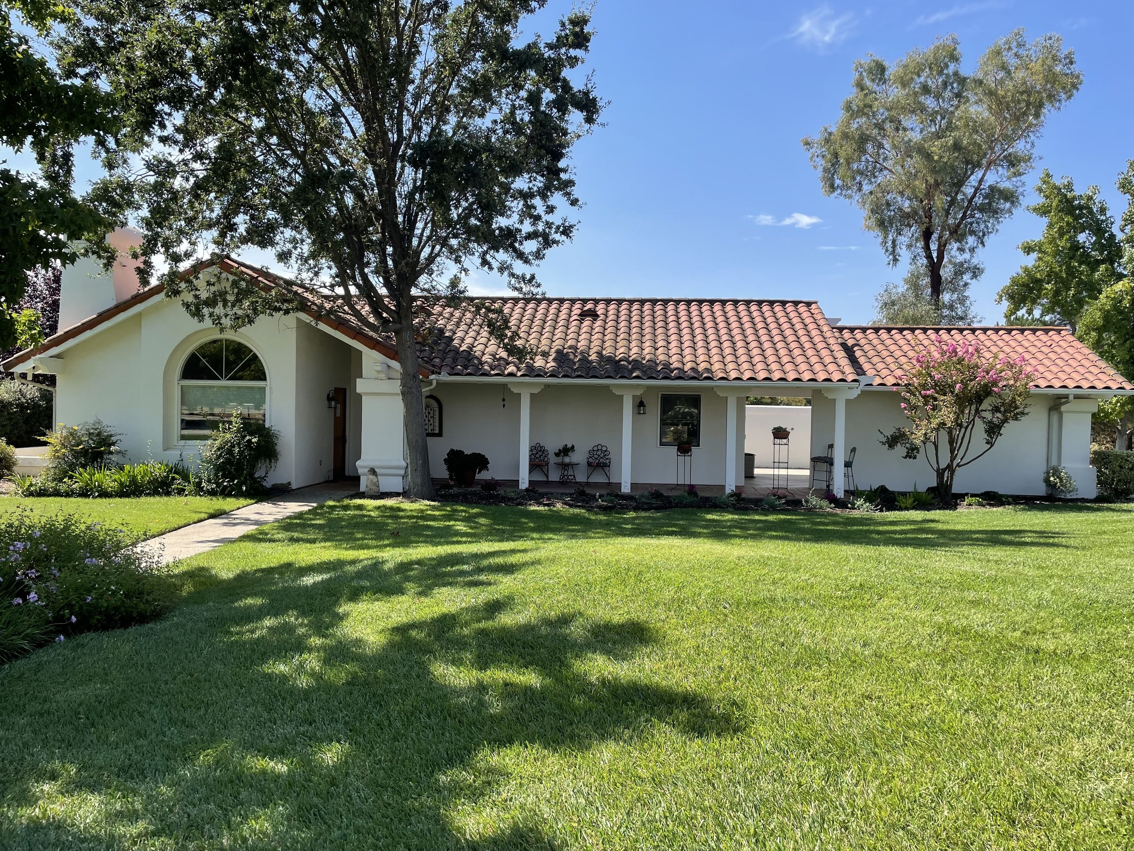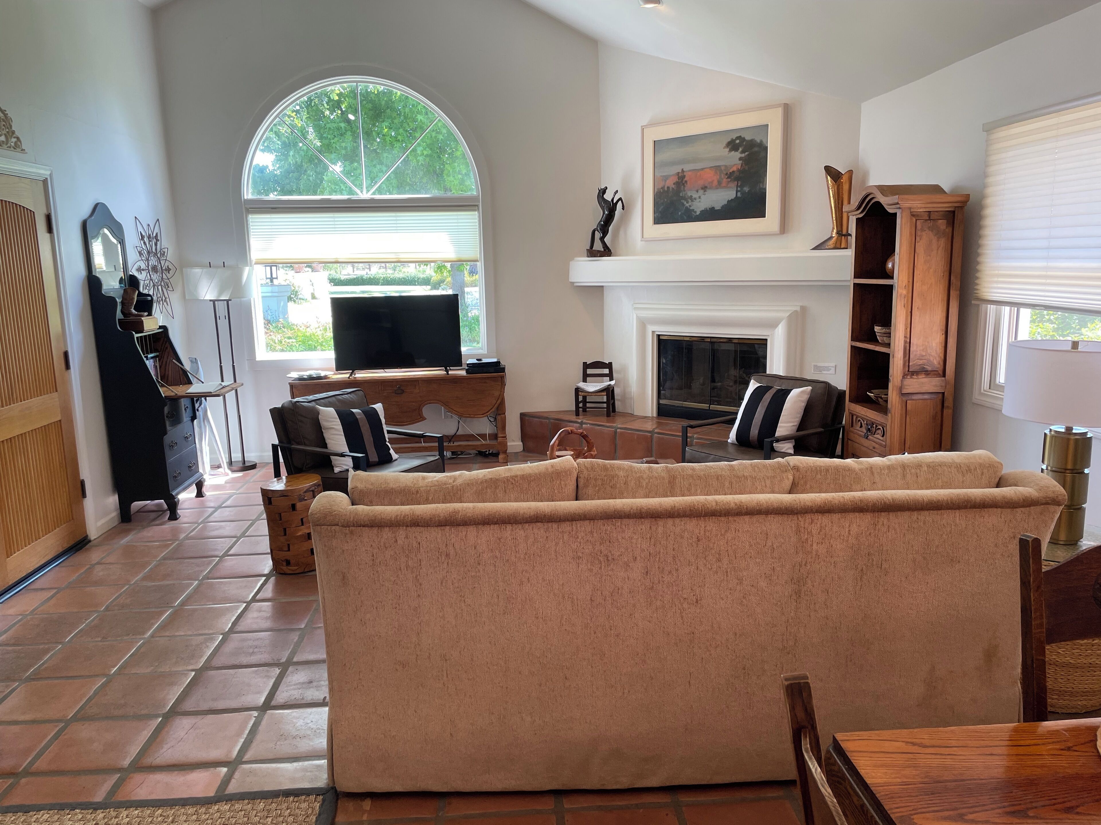 Your OWN Private Refuge ON 10 Acres IN Santa Ynez Enjoy your own private residence set on 10 acres centrally located to all of the Valley's finest restaurants, wineries and activities in this 2 bedroom 1 bath casita. Set among horse ranches with striking mountain views, we are just 1/2 mile from downtown Santa Ynez, 3 miles from Los Olivos and 5 miles from Solvang. All the comforts of home await you in this Spanish-style home complete with plaster walls, vaulted ceilings and terra cotta tile. It is completely private and separate from the main house where the owners reside with their 2 beloved dogs who are fenced in their own private yard.The great room features a large picture window affording spectacular views of the property, a large gas fireplace with hearth and numerous windows to enjoy the beautifully landscaped grounds. There is a 43" Smart TV with Netflix and Prime Video, DirecTV service and a DVD player with a wide assortment of DVD's. High speed WiFi recently added. A secretary desk is the perfect place for your computer work.The primary bedroom has a very comfortable King size bed to guarantee a wonderful night's sleep. Windows on either side of the bedroom provide views of the beautiful landscape. The second bedroom offers 2 twin beds which can be separated or combined to form one Queen size bed.A fully stocked kitchen offers everything for the most industrious cook. Grind your coffee beans and enjoy a cup of coffee on the front porch or on the back patio. Full spice rack and cooking oils make it easy to prepare dinner at home. Dining for 4 in adjacent breakfast area. A lovely patio includes a table for 4, additional seating and an outdoor grill. Your covered carport houses a sports locker of sports equipment and a basketball hoop sits across the driveway.This is the perfect getaway for families and couples. Comfortable, convenient and tranquil........all the makings for the perfect vacation stay.We are dog friendly with a 2 dog maximum for a flat fee of $30.00 paid at time of booking. Please bring your own beds/crates. NO CATSPlease note: Price quoted is for 2 people. Add $25/night for 3rd and/or 4th person.Keywords: