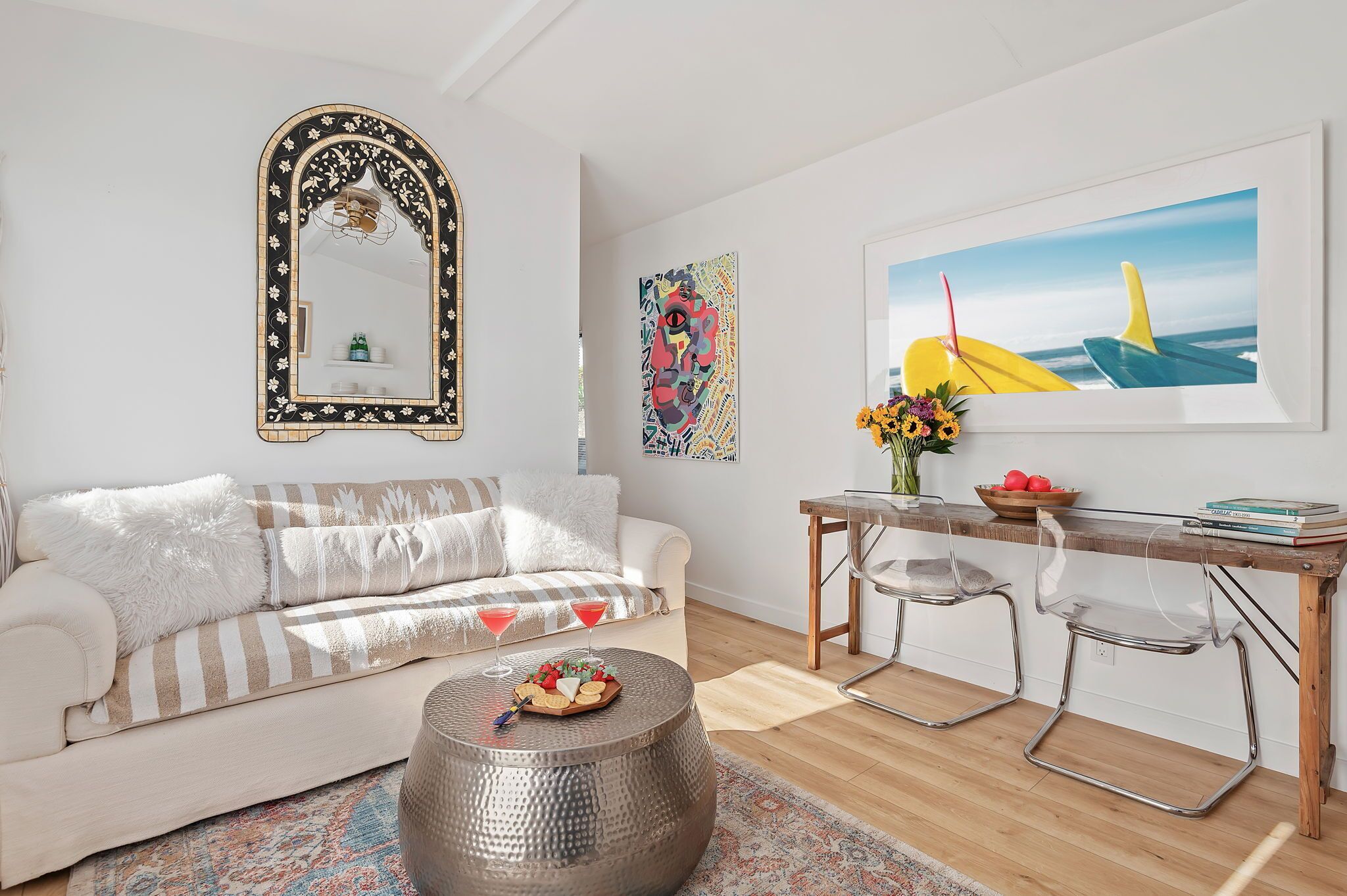 Sweet Summerland Sand 1 BD Walk to Beach, Restaurants, and Shops! Summerland SandExperience coastal living perfection at the Summerland "Sand" Beach Chic Bungalow. Nestled within a charming three-unit compound in prestigious Summerland, CA, this one-bedroom plus TV Room/Den offers a tranquil escape with a touch of elegance.In 1883, the spiritualists aptly christened the city "Summerland," a name that still resonates today. It's a haven for those seeking a blend of leisure and adventure. Immerse yourself in the community spirit by gathering around the inviting fire pit, lounging in the communal area, or savoring al fresco BBQ meals with ocean views. With a short walk to the pristine sandy beaches, local restaurants, and shops, you'll find everything you need just steps away.Inside, the bedroom features a comfortable King-sized bed with a flat-screen TV, and the second TV Room/Den has a Queen pull-out couch with a desk area. The cozy living room/kitchen boasts a sofa, a bar area with a slim table, and two chairs for dining. The well-equipped kitchen includes a stove, microwave, and refrigerator. Step onto the front deck, which has a lounge area and a table with four chairs, picturesque views of the ocean, and the charming town of Summerland.Additional amenities include access to a community washer and dryer, ensuring you have all the necessary conveniences. Parking for one car is readily available in the designated area.Explore the unique charm of Summerland, where you can indulge in browsing, shopping for antiques, wine tasting, outdoor adventures, and relaxed dining. And don't miss the opportunity to experience a true rarity on the Santa Barbara South Coast—horseback riding along the sandy beach!Summerland "Sand" Beach Chic Bungalow offers a NEW White Caps Eat, Stay, Play – Beer Garden and amazing Lobster food truck on the property making your coastal getaway unforgettable.*Summerland is a quaint, cute community near the freeway and the train.Summerland Sands apartment is located downtown Summerland next to the shops and restaurants. Next door is The Nugget Steakhouse, Summerland Beach Cafe, Summerland Winery, Rusty's Pizza Parlor, Red Kettle Coffee, and a quaint farm stand with organic produce. Special Features of the home: • Relaxing Deck Ocean Views. • Community Gas Grill• Community Outdoor Firepit & Lounge Area• Deck with Dining Area• WIFI• Flat-Screen TV• Community Laundry• Enjoy Discounts at Local Restaurants!Nearby Activities: • Summerland Beach (.2 mile)• Downtown Summerland• Wine Tasting, Shops, & Restaurants• Carpinteria (5.5 miles)• Montecito Lower Village (3 miles)• Hiking Trails• Horseback Rides