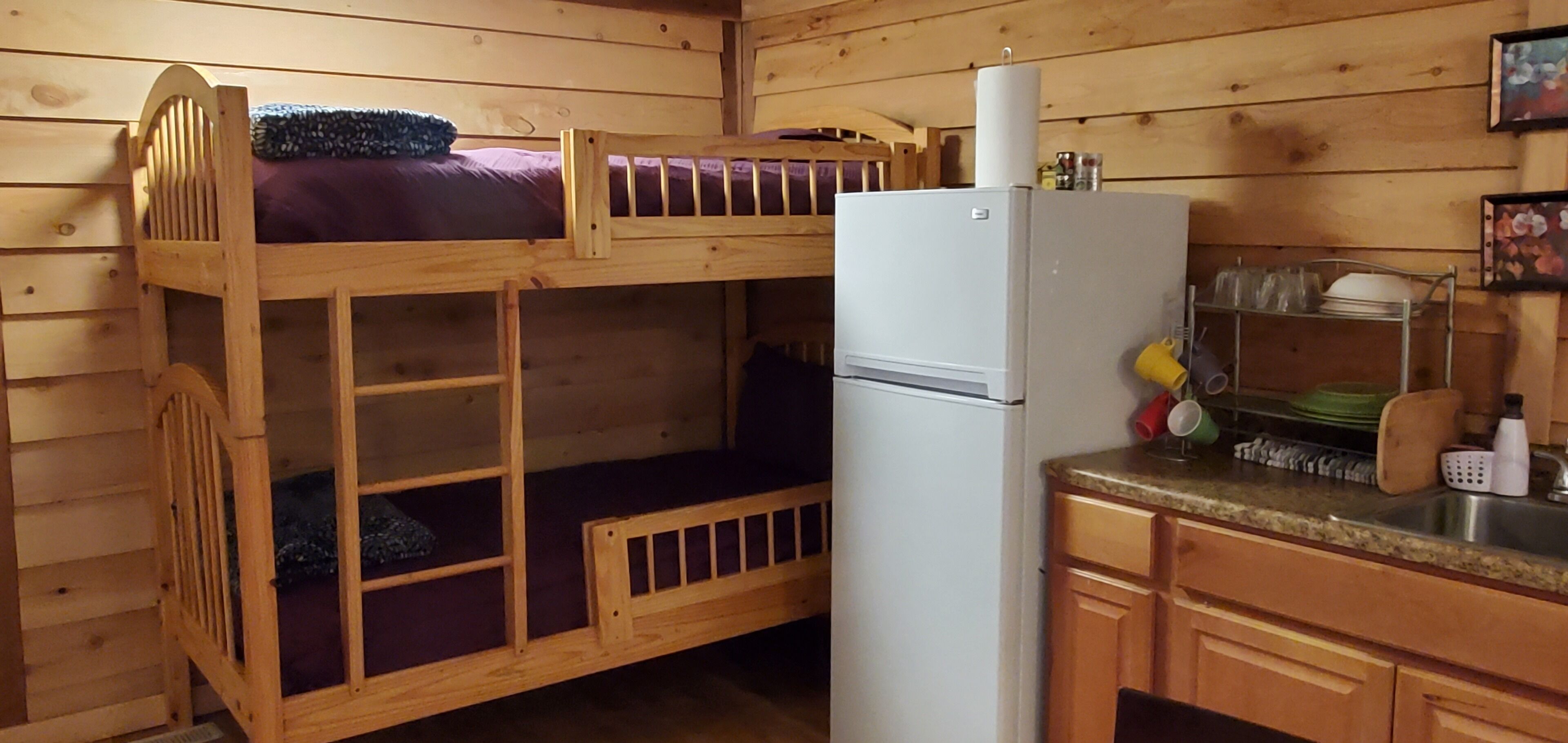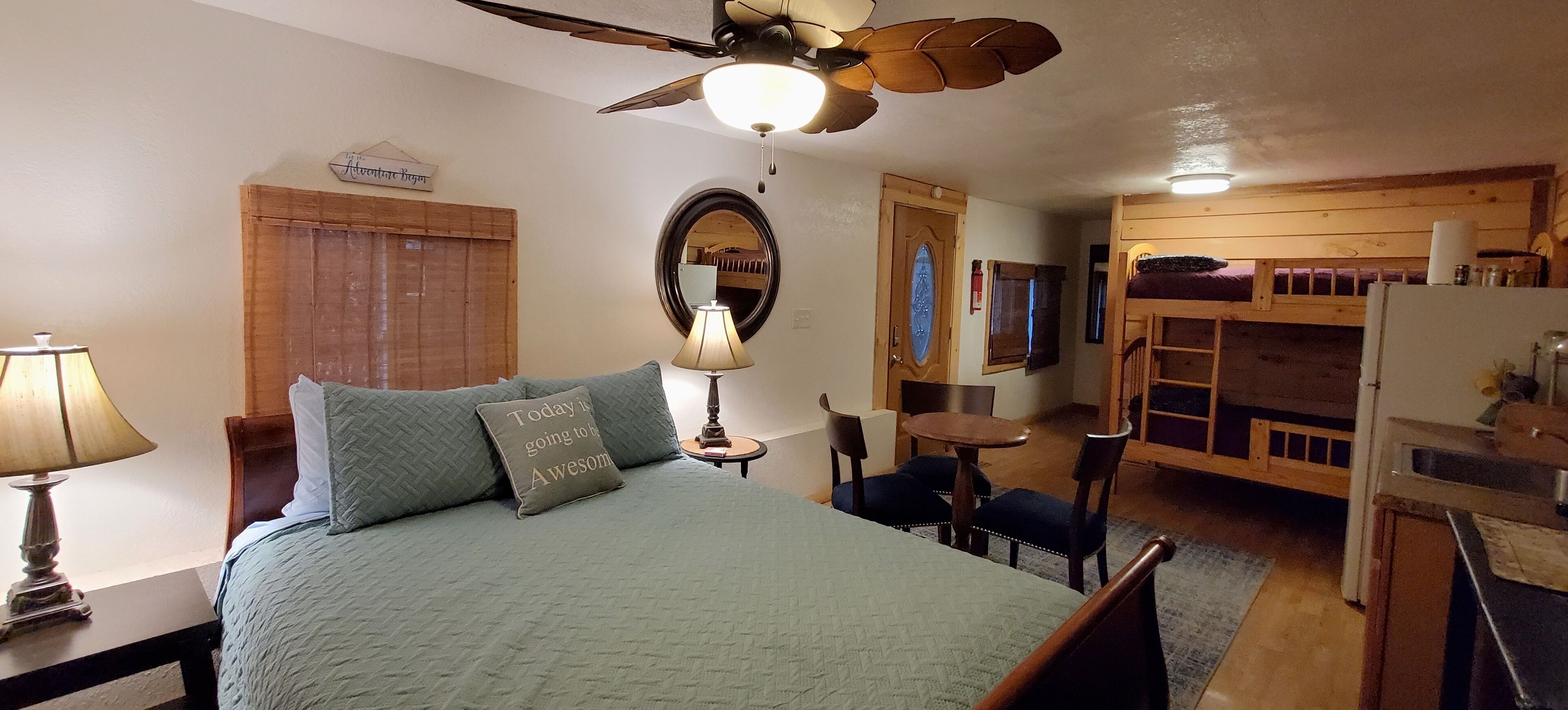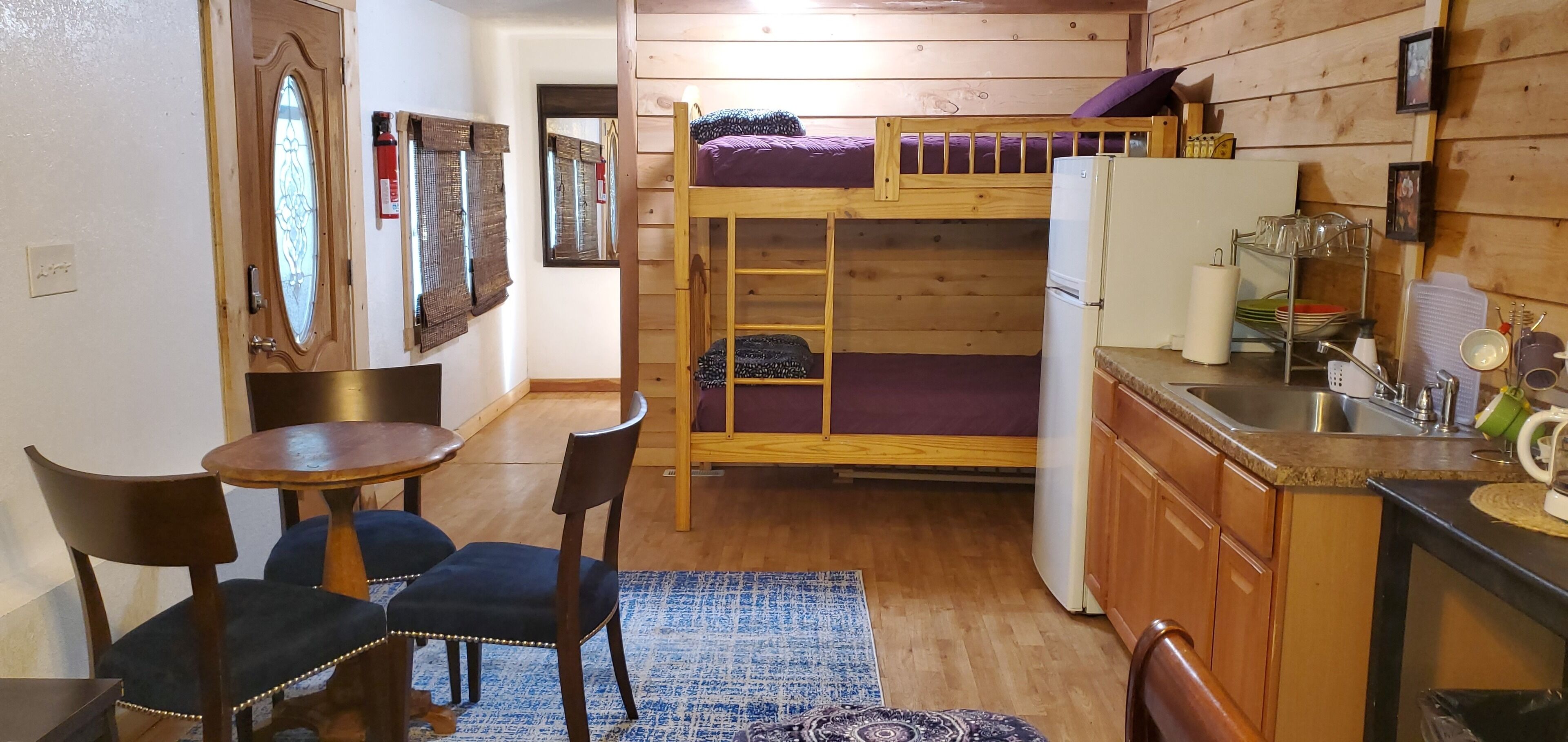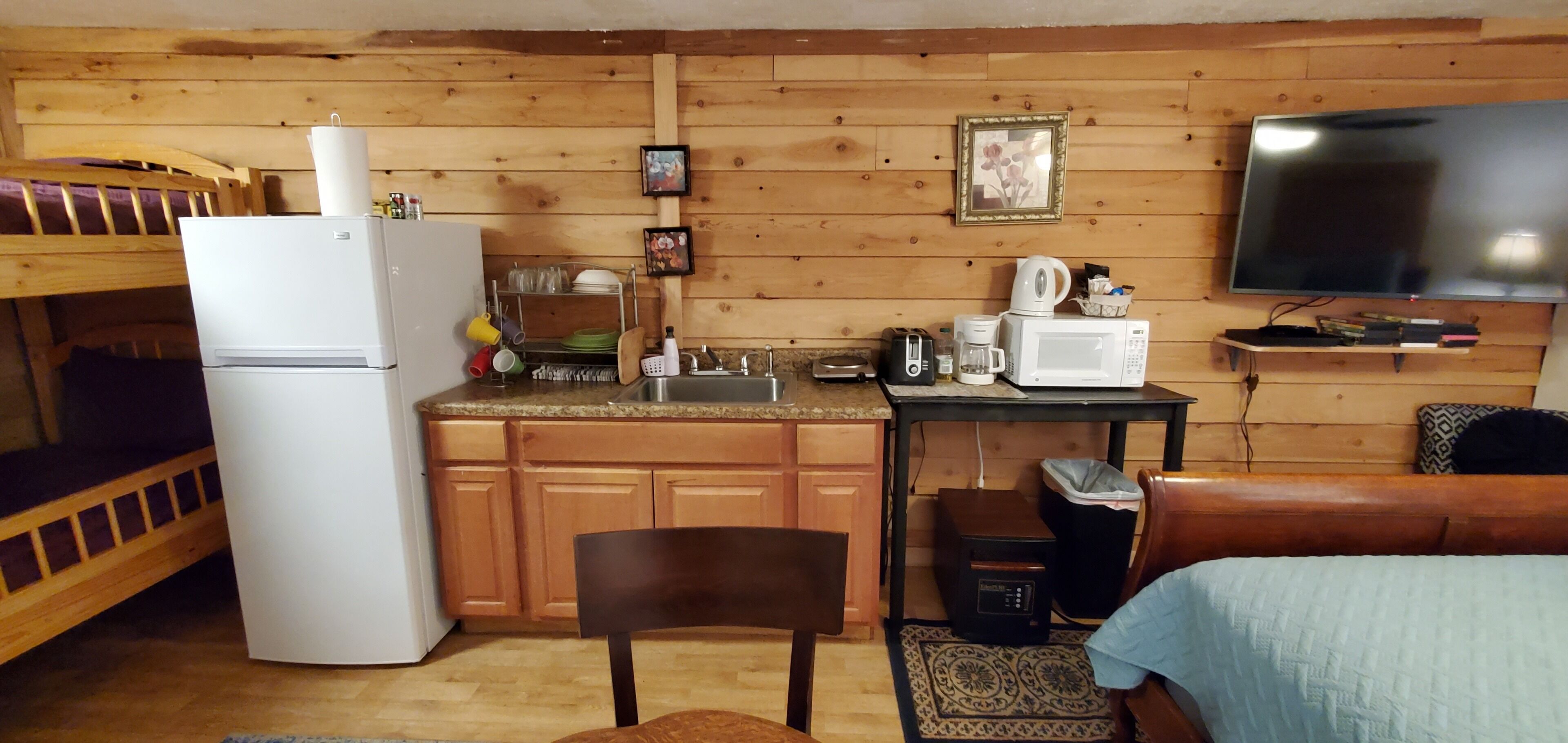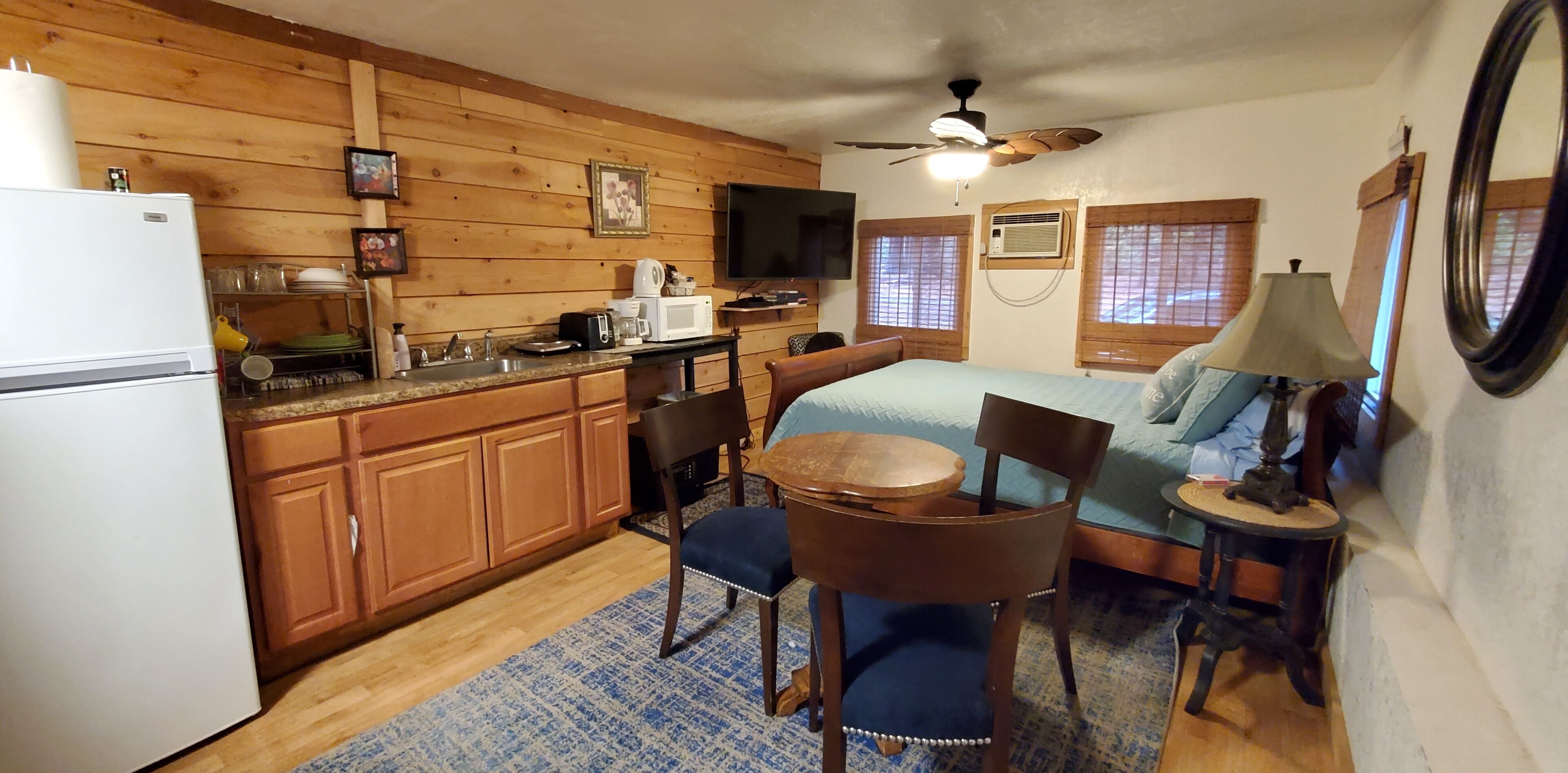Studio A at Living Springs Resort w/Creek, Mt. Lassen Studio in the woods with majestic tall pine and cedar trees close to Lassen Volcanic National Park. There's also a mini lake and a creek on the property where you can relax in the natural and peaceful wooded setting . Quiet and beautiful place to enjoy with your friends and family. Guests from all backgrounds are welcome here.Studio "A" is housed in a single wide mobile that has been completely remodeled to provide two cozy studios. There is a Queen size bed in the Studio along with a bunk bed (2 twin beds). The unit has a kitchenette with a single burner hot plate for basic cooking needs and full size fridge. There is a coffee maker and cups and toaster for the convenience of the camper. Also a microwave. The studio has furnace for winter and an air conditioner for those few warm nights we experience. Outside the Studio there is a picnic table with a wood/charcoal BBQ grill and a fire pit for cooking or for evening ambiance. The studio is fully furnished with linens and towels.Please help us keep the cost of cleaning low by keeping the place clean as possible. Do not leave garbage around, please put the trash in a trash bag/can.We kindly ask that prior to leaving, you clean and put away any dishes or kitchenware used and put any dirty towels near the entry door upon leaving. It helps us get through the cleaning process quicker and allows us to keep the cleaning costs down for you and future guests.The campground sells large wood bundles for $10 or you can bring your own charcoal. Bringing your own wood is NOT permitted (unless it is store bought locally).PETS: There is a one time pet fee of $40 per stay. There is a shared laundry room on the grounds, just short walking distance from the studio with coin operated washers and dryers.