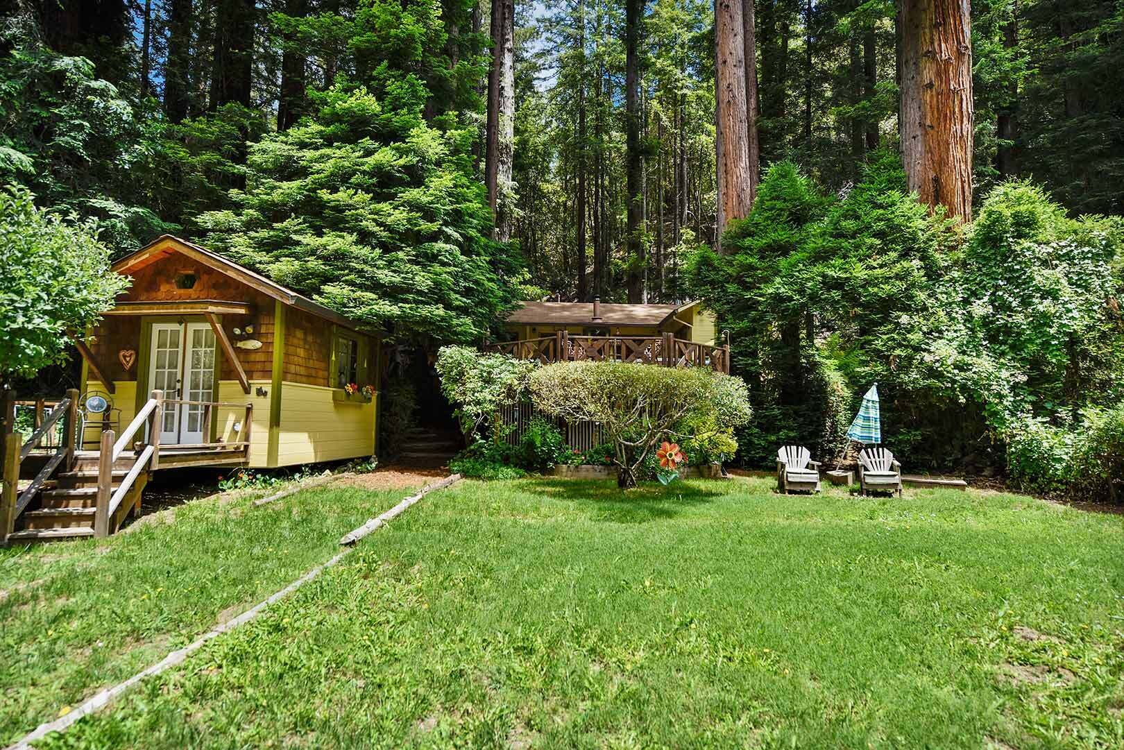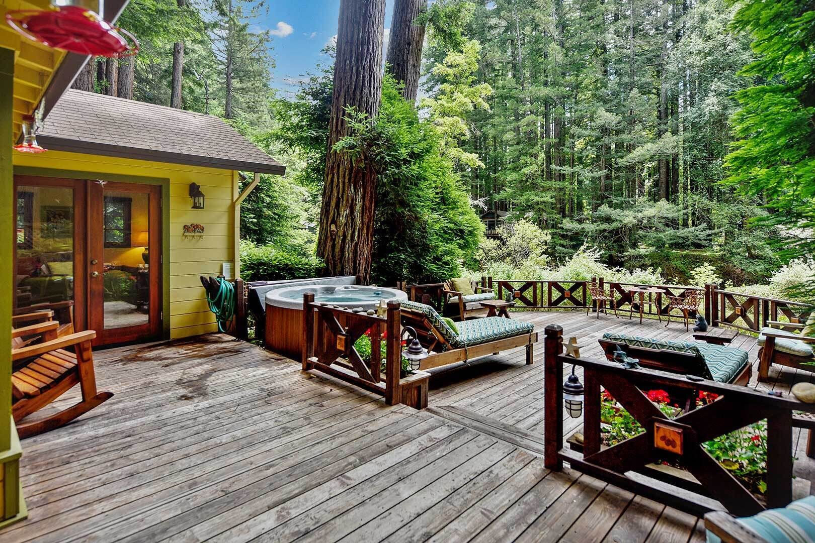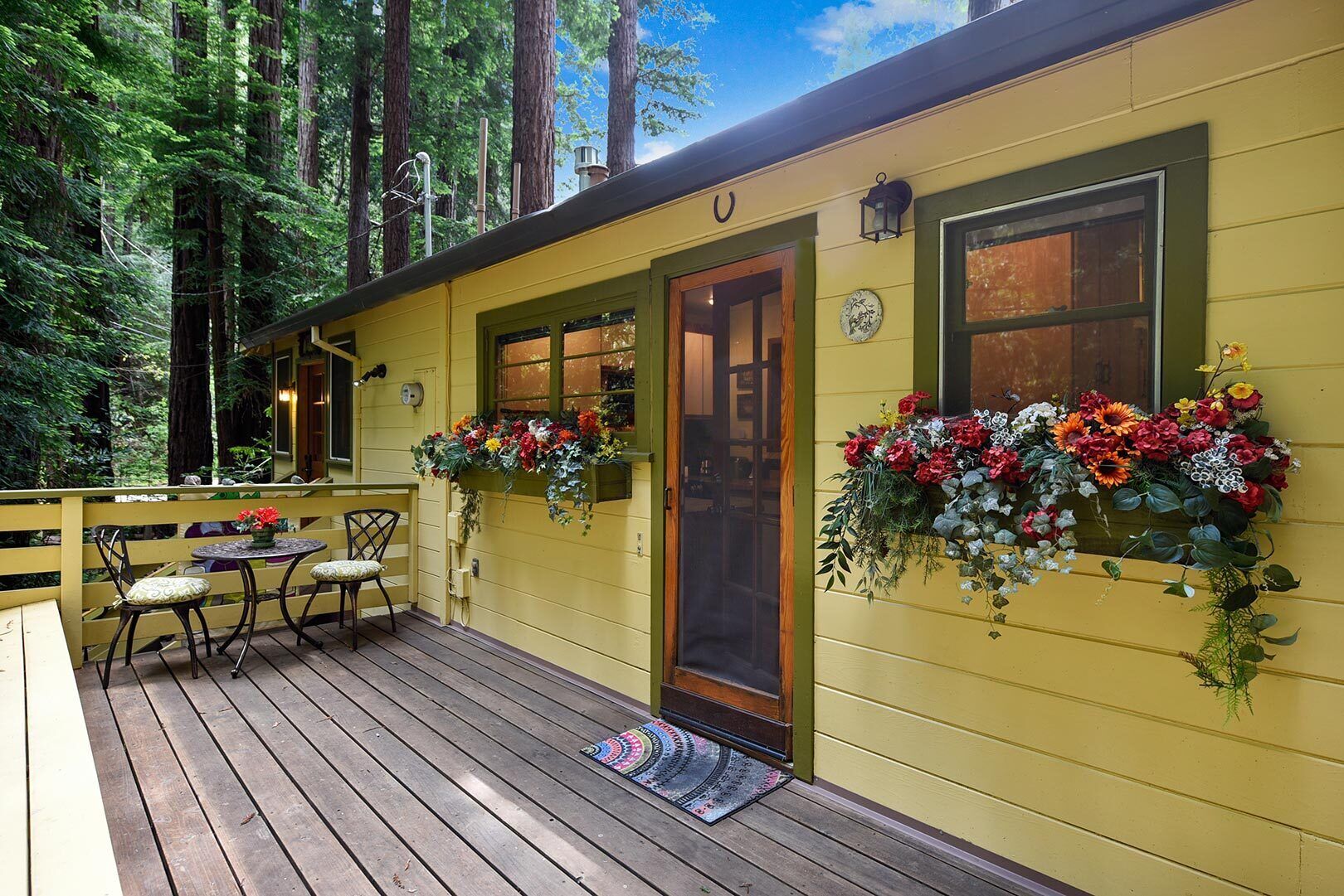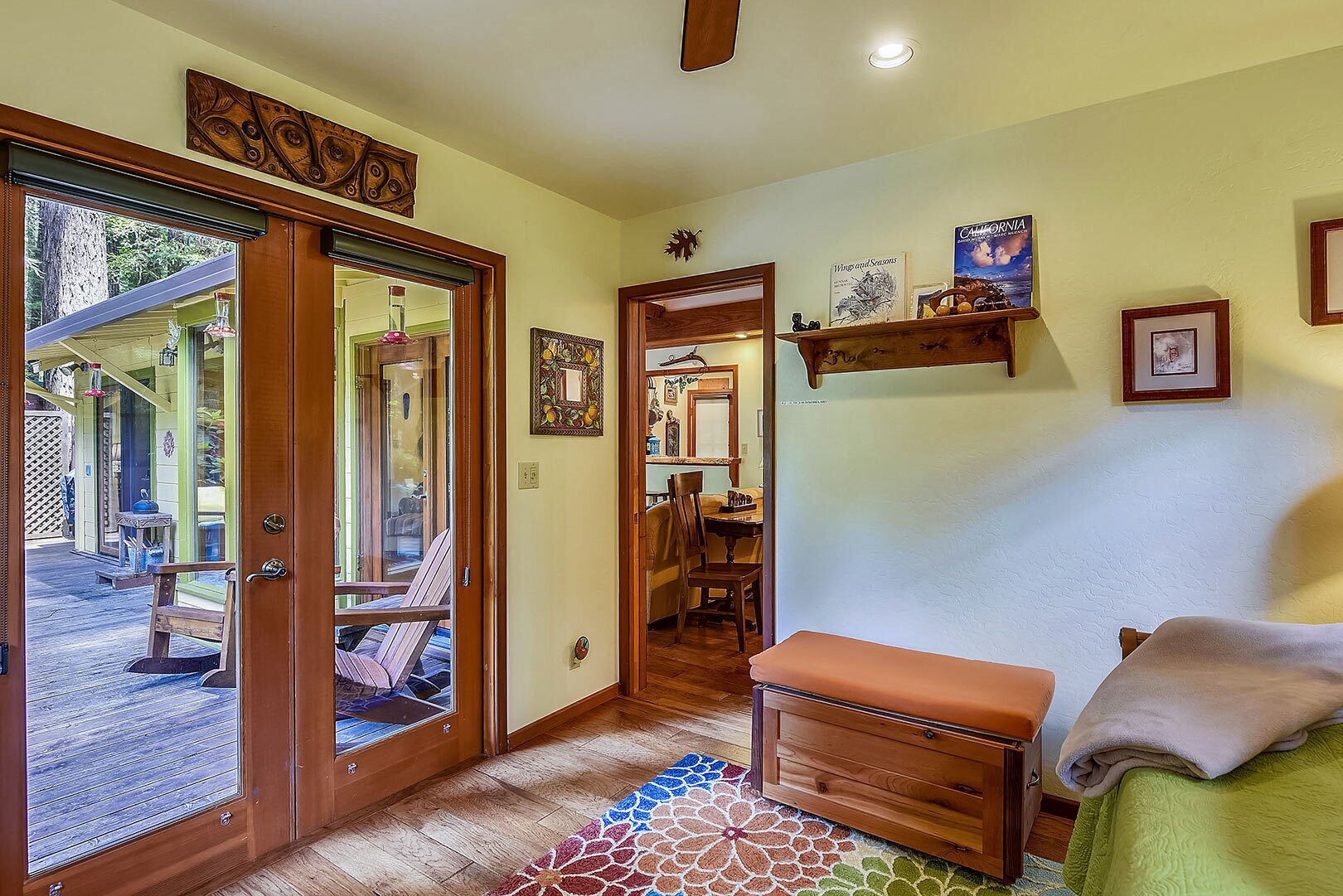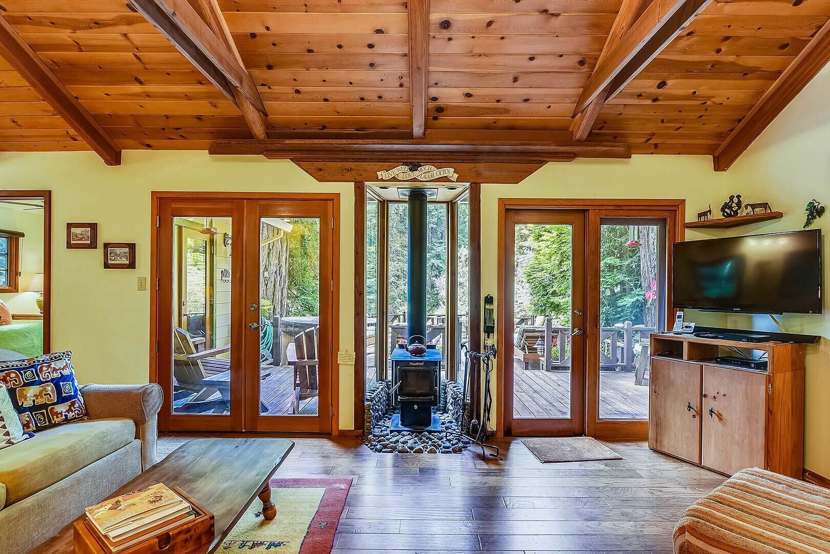 Tranquil Retreat on Austin Creek, Surrounded by Forest Views Blackberry Bliss is a tranquil, romantic and well-appointed vintage cabin oasis on the banks of beautiful Austin Creek that offers a setting of breathtaking beauty. It was built in 1954 and has been lovingly restored and updated. The house features a private creekside beach and sunny, level backyard meadow. Blackberry Bliss's 1,000 sq ft redwood deck is complete with a private outdoor hot tub, custom oversized redwood chaise lounges, dining bistro, and even more seating providing views of the creek, yard, flowers and trees, including the majestic redwoods, and is enclosed and gated for pets. At night, you'll rejoice in the privacy of magical moon and star-filled nights. The interior of the cabin is detailed with vaulted open wood beamed ceilings, French doors that seamlessly bring the outdoors in, custom finished redwood detailing and live-edge pass through bar. Blackberry Bliss is artistically furnished including an eclectic collection of both local and international art and artifacts. Blackberry Bliss is well located within minutes of Guerneville, the Sonoma Coast/beaches and other nearby historic Russian River towns, including Duncan's Mills, Jenner and Bodega Bay and offering several great restaurants, wine tasting, golf and fun shopping. Know Before You Book: Maximum Occupancy and Quiet Hours: The maximum occupancy at Blackberry Bliss is 2 people. Quiet hours are from 10:00 p.m. until 7:00 a.m. Outdoor amplified sound is prohibited at any time.Parking: There is parking for 2 cars in front of the house. RVs, trailers and campers are prohibited, per the Sonoma County Vacation Rental OrdinancePet Friendly: This home welcomes up to 2 well-mannered dogs. If you have more than 2 dogs or other types of pets, please contact us to see if exceptions can be made before reserving.Bed Sizes: Master Bedroom: Queen; "Bonus" Room: Twin DaybedHeat Source: Woodstove and Gas FireplaceStairs: There are less than 10 steps to the front door and several steps from the back deck to the lawn and backyard. The main deck has a couple steps to the hot tub area.Work from HERE: Blackberry Bliss has two workspaces - one in the living room and one just off the bedroom - plus a darling dining nook at the front of the house. Advertised Wifi Speed: Xfinity ResidentialFencing: The yard is partially fenced.Common Amenities not included: This home does not have Air Conditioning, but with the blessing of redwood trees, you most likely won't need it anyway.Proximity to wineries: There are an abundance of wineries and tasting rooms in West Sonoma County - several in downtown Guerneville and many more within a short drive. The famed vineyards of Westside Road are 16 miles from the house.Nearest River Beach: The closest public river beach is 7 miles away in Monte Rio.Nearest Ocean Beach: The closest ocean beaches re on the Sonoma Coast in Jenner - approx9 miles from the house.Sonoma County TOT Number: 1991