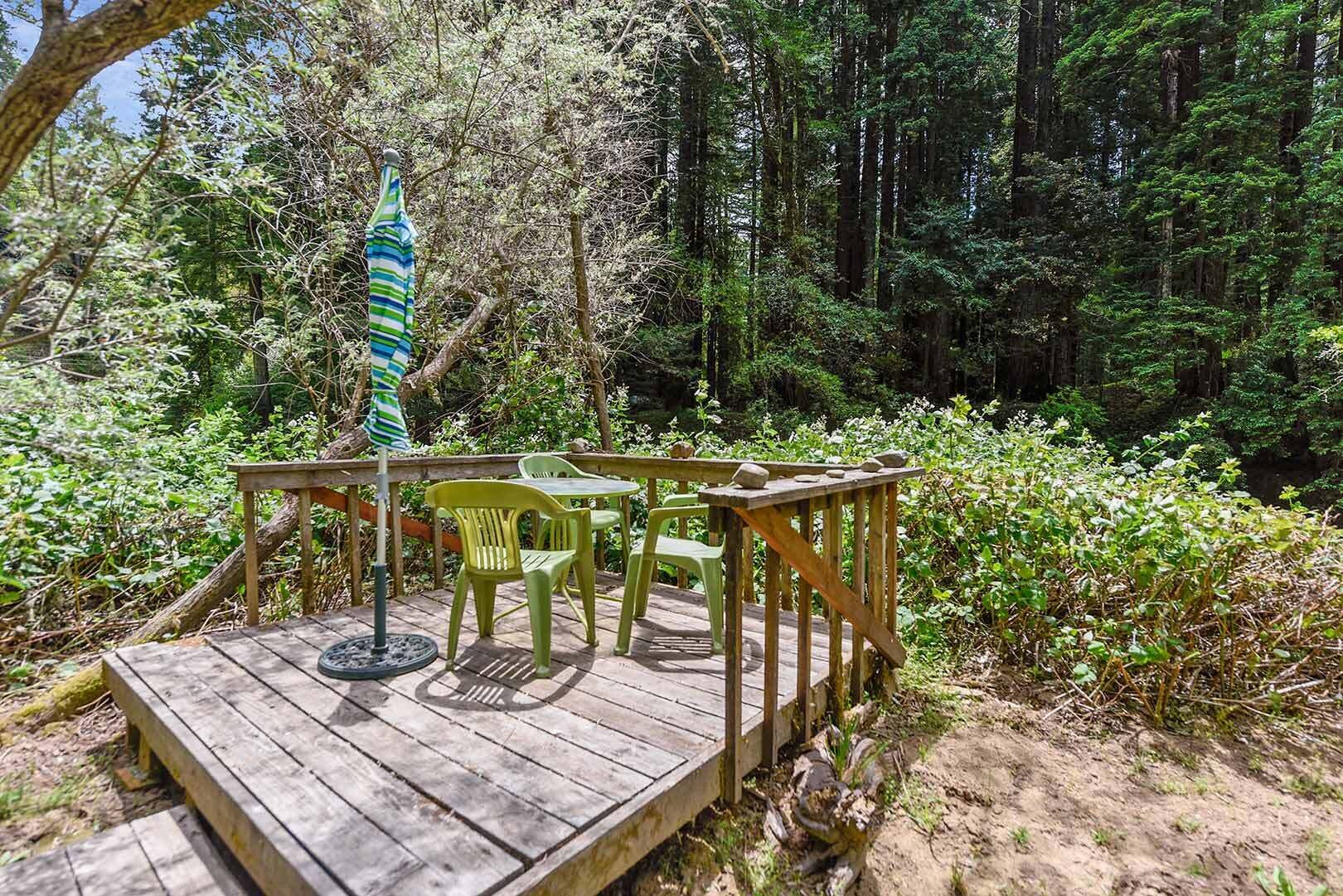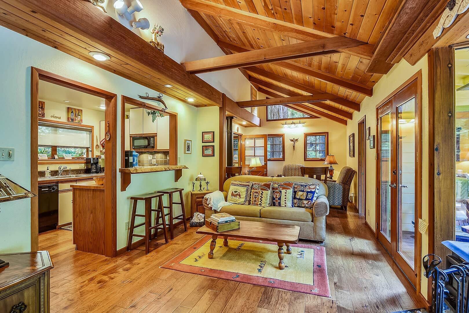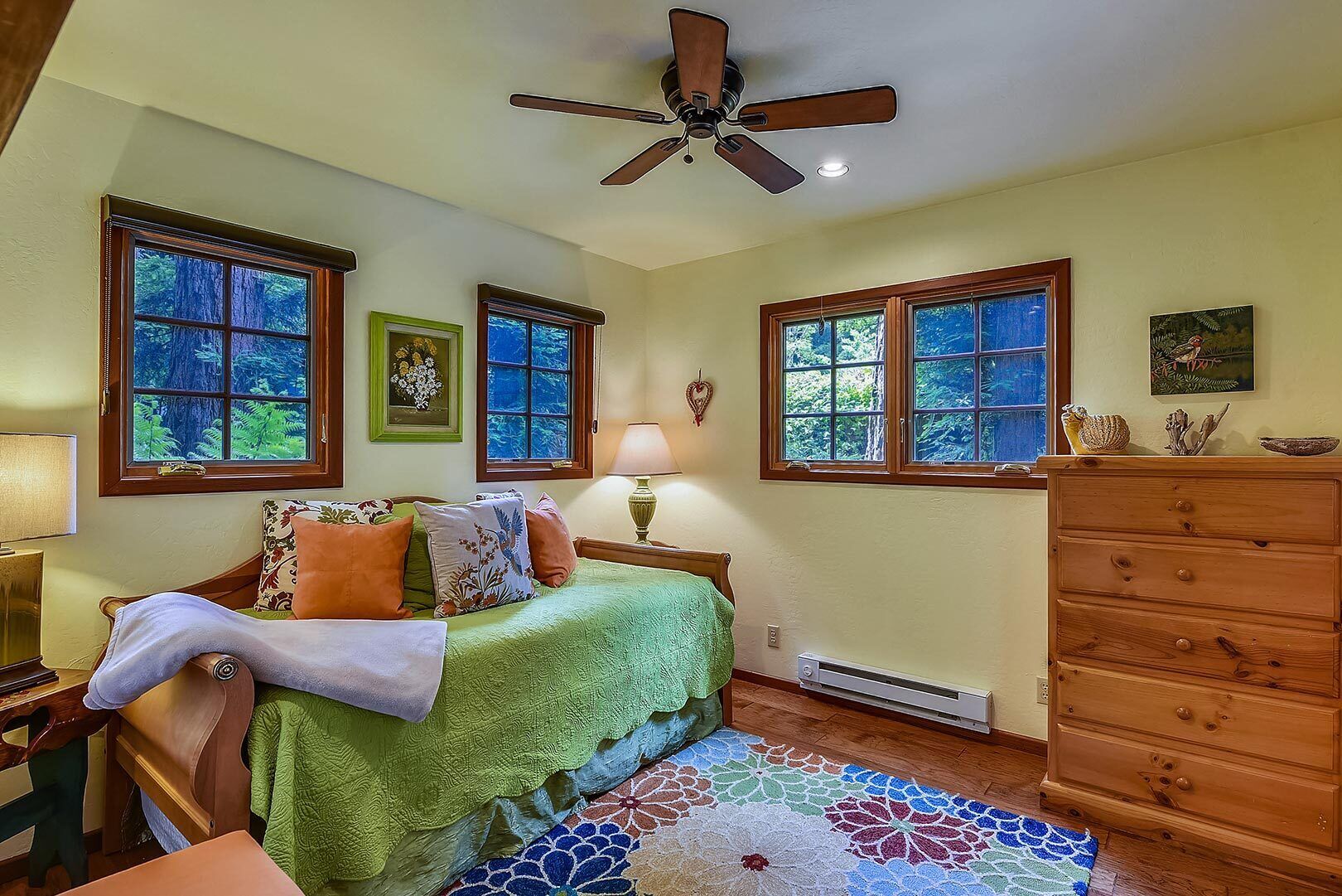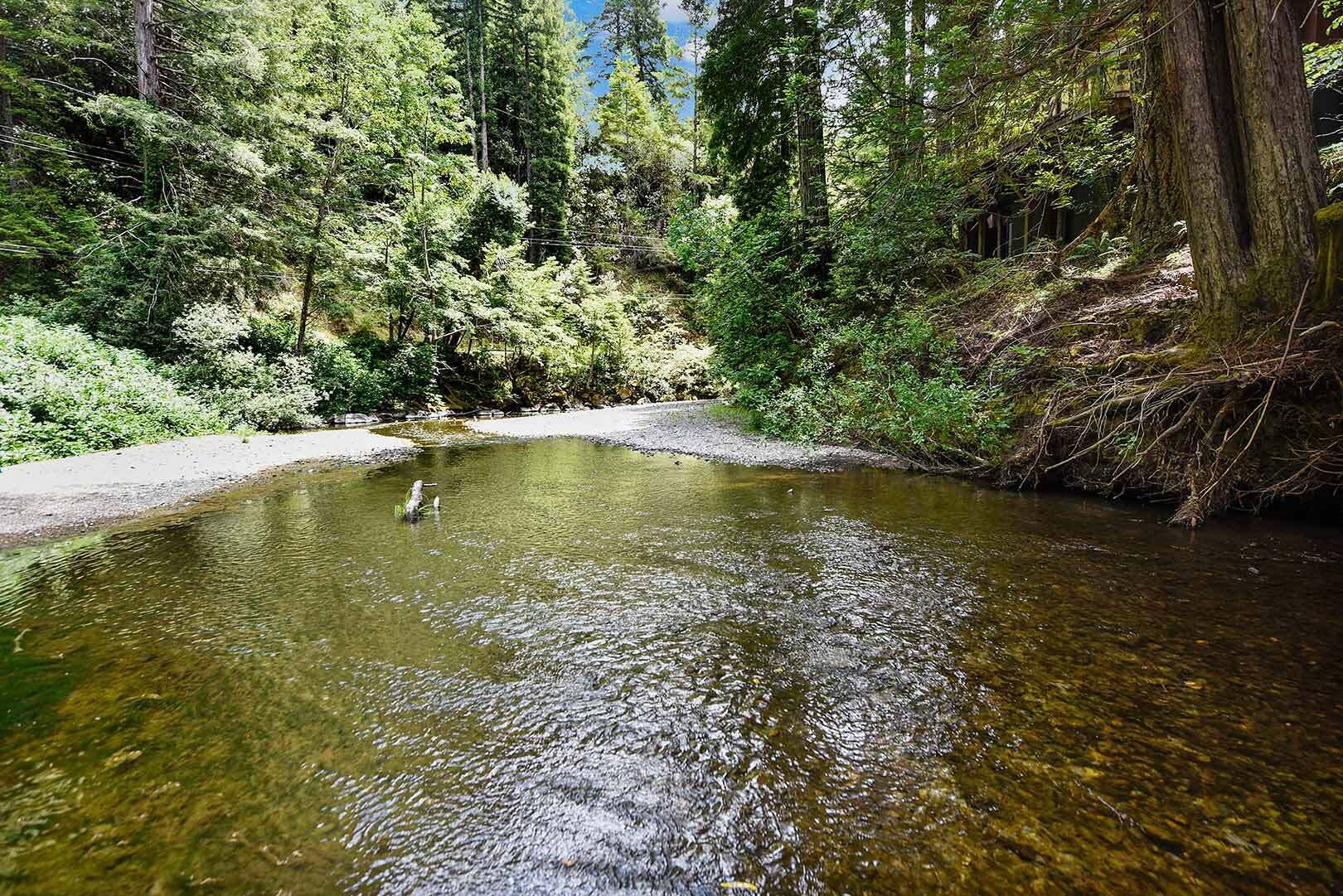 Tranquil Retreat on Austin Creek, Surrounded by Forest Views Blackberry Bliss is a tranquil, romantic and well-appointed vintage cabin oasis on the banks of beautiful Austin Creek that offers a setting of breathtaking beauty. It was built in 1954 and has been lovingly restored and updated. The house features a private creekside beach and sunny, level backyard meadow. Blackberry Bliss's 1,000 sq ft redwood deck is complete with a private outdoor hot tub, custom oversized redwood chaise lounges, dining bistro, and even more seating providing views of the creek, yard, flowers and trees, including the majestic redwoods, and is enclosed and gated for pets. At night, you'll rejoice in the privacy of magical moon and star-filled nights. The interior of the cabin is detailed with vaulted open wood beamed ceilings, French doors that seamlessly bring the outdoors in, custom finished redwood detailing and live-edge pass through bar. Blackberry Bliss is artistically furnished including an eclectic collection of both local and international art and artifacts. Blackberry Bliss is well located within minutes of Guerneville, the Sonoma Coast/beaches and other nearby historic Russian River towns, including Duncan's Mills, Jenner and Bodega Bay and offering several great restaurants, wine tasting, golf and fun shopping. Know Before You Book: Maximum Occupancy and Quiet Hours: The maximum occupancy at Blackberry Bliss is 2 people. Quiet hours are from 10:00 p.m. until 7:00 a.m. Outdoor amplified sound is prohibited at any time.Parking: There is parking for 2 cars in front of the house. RVs, trailers and campers are prohibited, per the Sonoma County Vacation Rental OrdinancePet Friendly: This home welcomes up to 2 well-mannered dogs. If you have more than 2 dogs or other types of pets, please contact us to see if exceptions can be made before reserving.Bed Sizes: Master Bedroom: Queen; "Bonus" Room: Twin DaybedHeat Source: Woodstove and Gas FireplaceStairs: There are less than 10 steps to the front door and several steps from the back deck to the lawn and backyard. The main deck has a couple steps to the hot tub area.Work from HERE: Blackberry Bliss has two workspaces - one in the living room and one just off the bedroom - plus a darling dining nook at the front of the house. Advertised Wifi Speed: Xfinity ResidentialFencing: The yard is partially fenced.Common Amenities not included: This home does not have Air Conditioning, but with the blessing of redwood trees, you most likely won't need it anyway.Proximity to wineries: There are an abundance of wineries and tasting rooms in West Sonoma County - several in downtown Guerneville and many more within a short drive. The famed vineyards of Westside Road are 16 miles from the house.Nearest River Beach: The closest public river beach is 7 miles away in Monte Rio.Nearest Ocean Beach: The closest ocean beaches re on the Sonoma Coast in Jenner - approx9 miles from the house.Sonoma County TOT Number: 1991