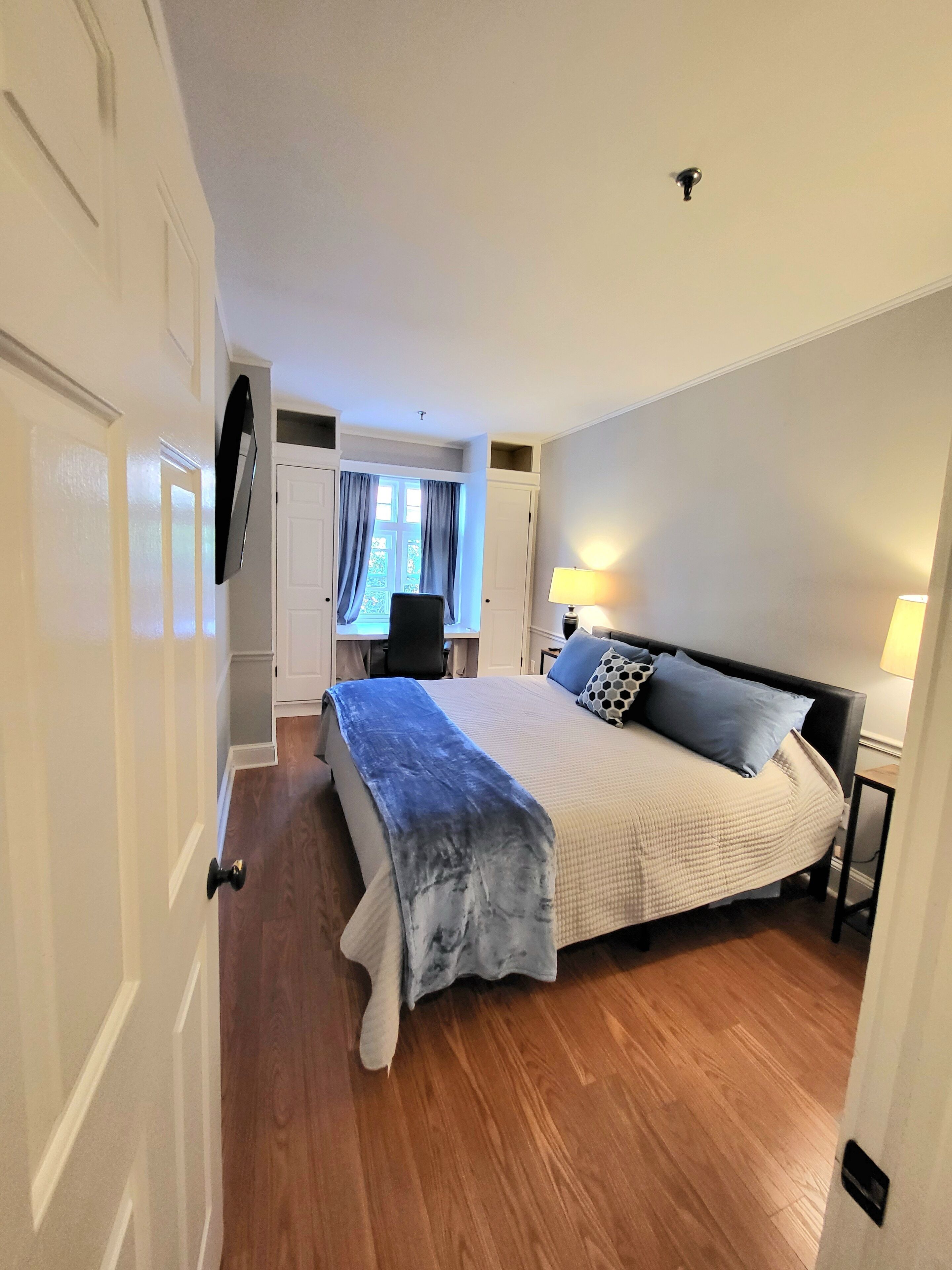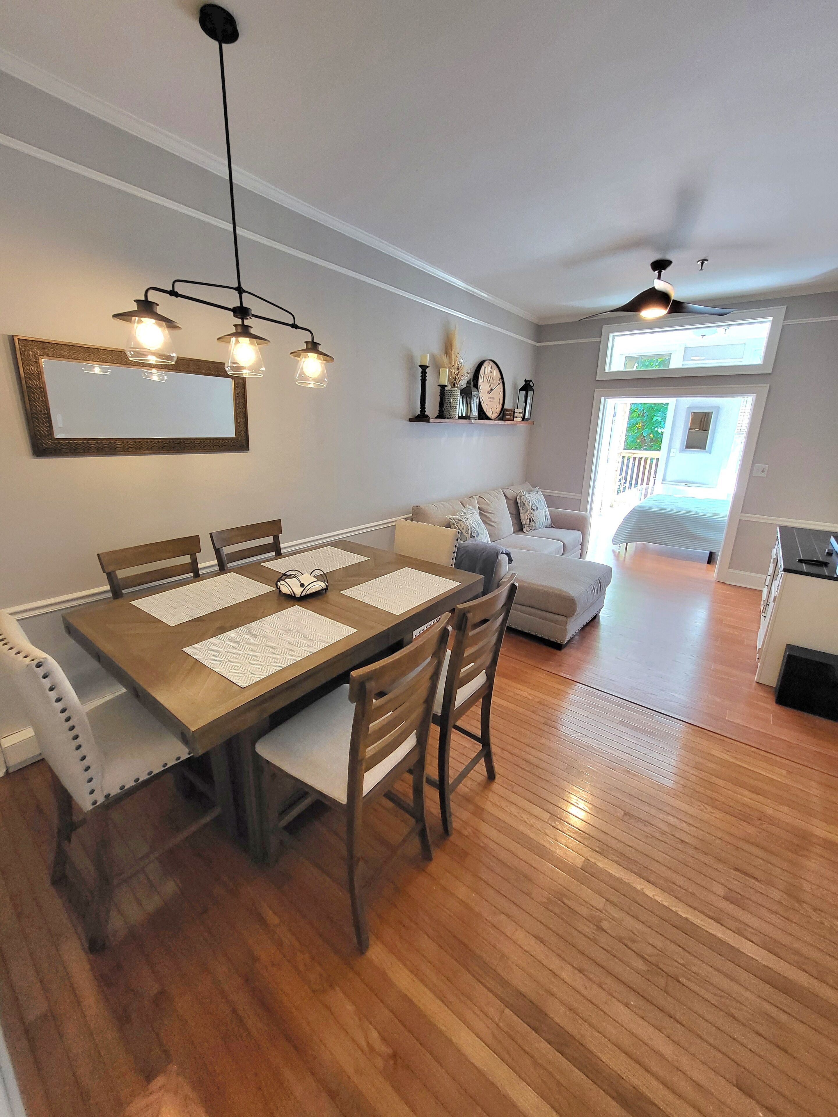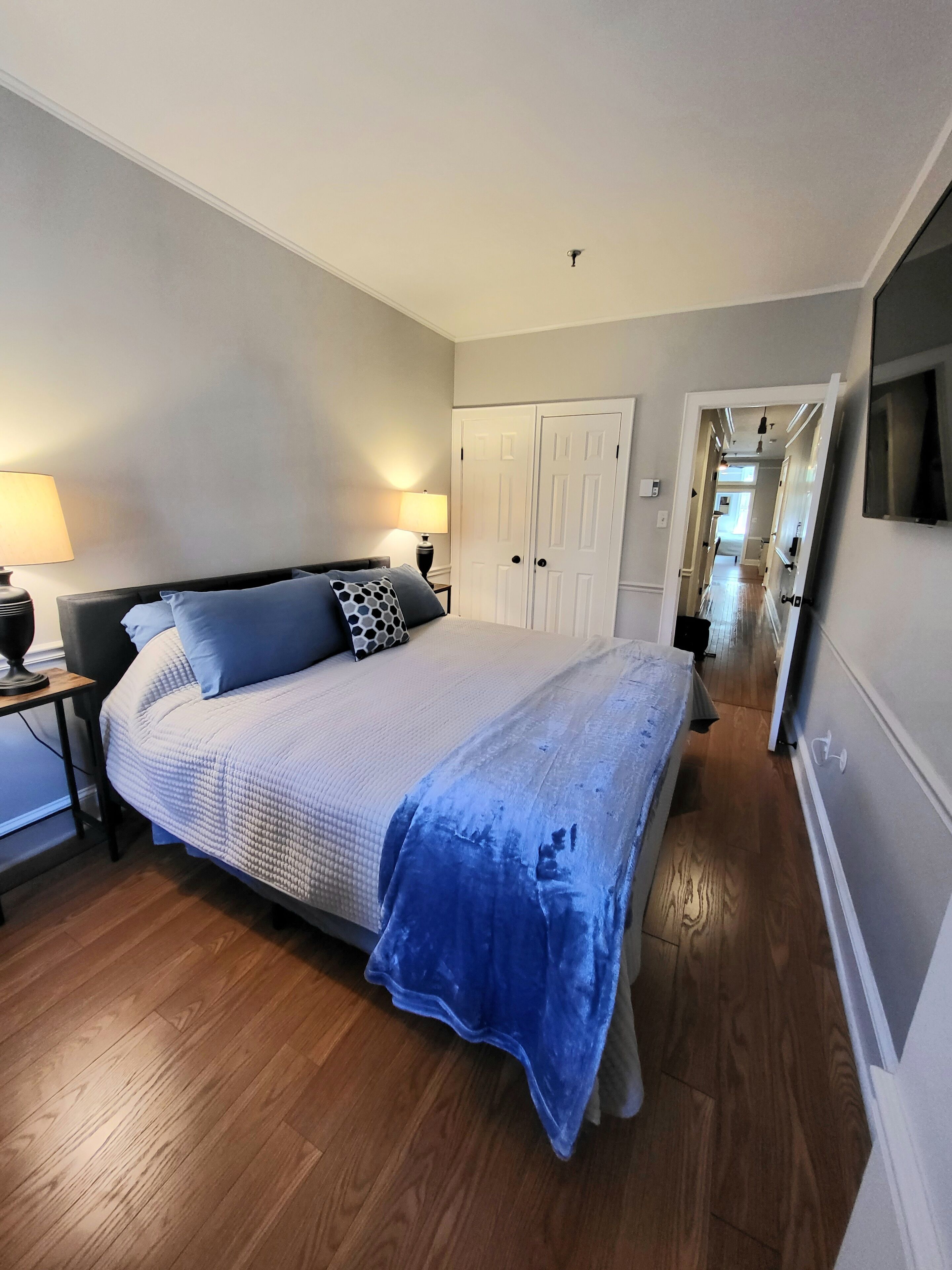 Hoboken Brownstone Condo-1st Fl, 2 Bedrms w/Private Backyard Close to NYC trains Beautifully furnished 2 bedroom condo with King and Queen Beds. Soaring 14' ceilings, hardwood floors and private outdoor space with just a short walk to Path station connecting NYC and light rail. Relax on our comfy couch w/ 65" smart TV or work at our dedicated workspace with high speed internet. Fully equiped kitch...