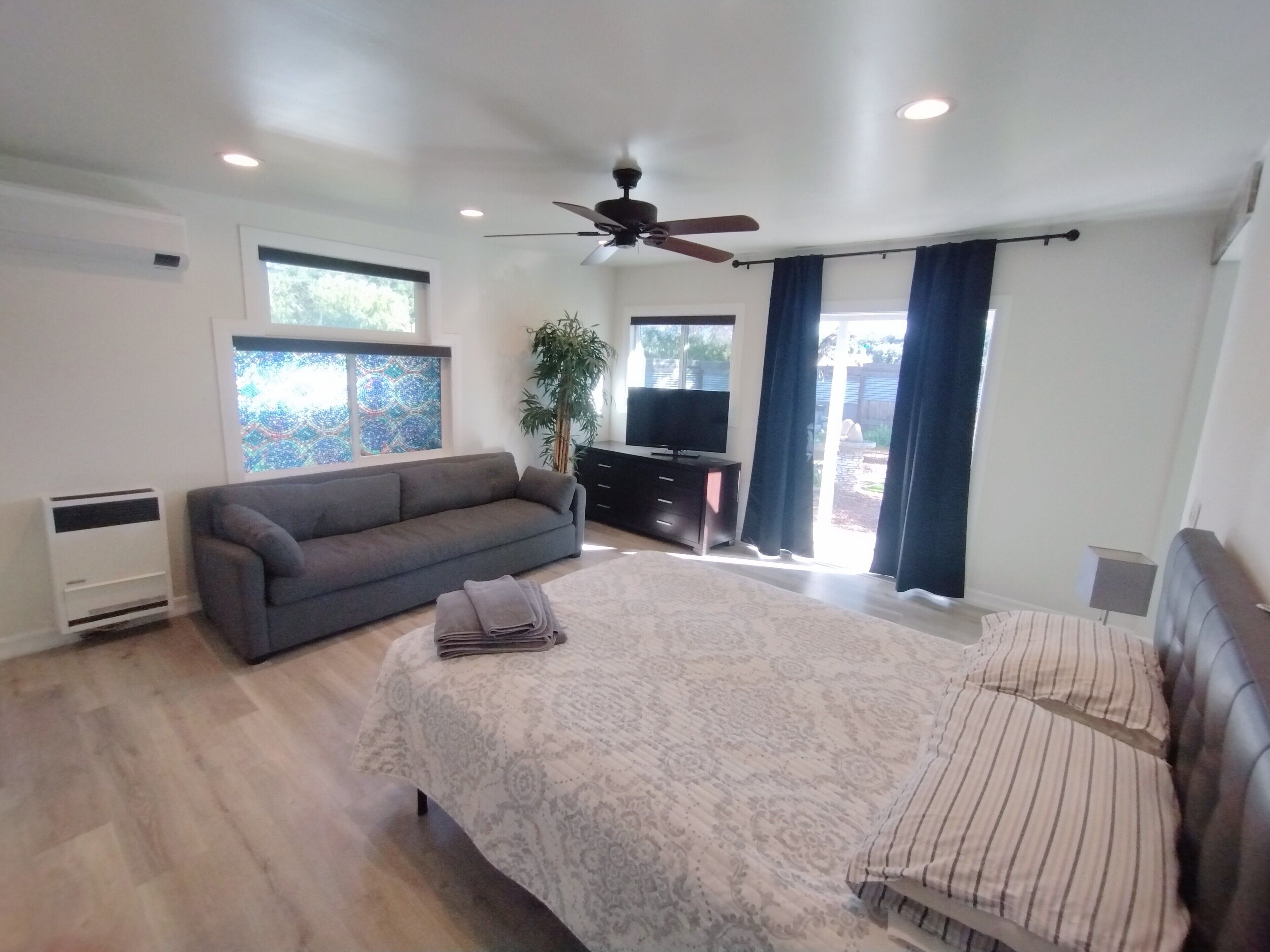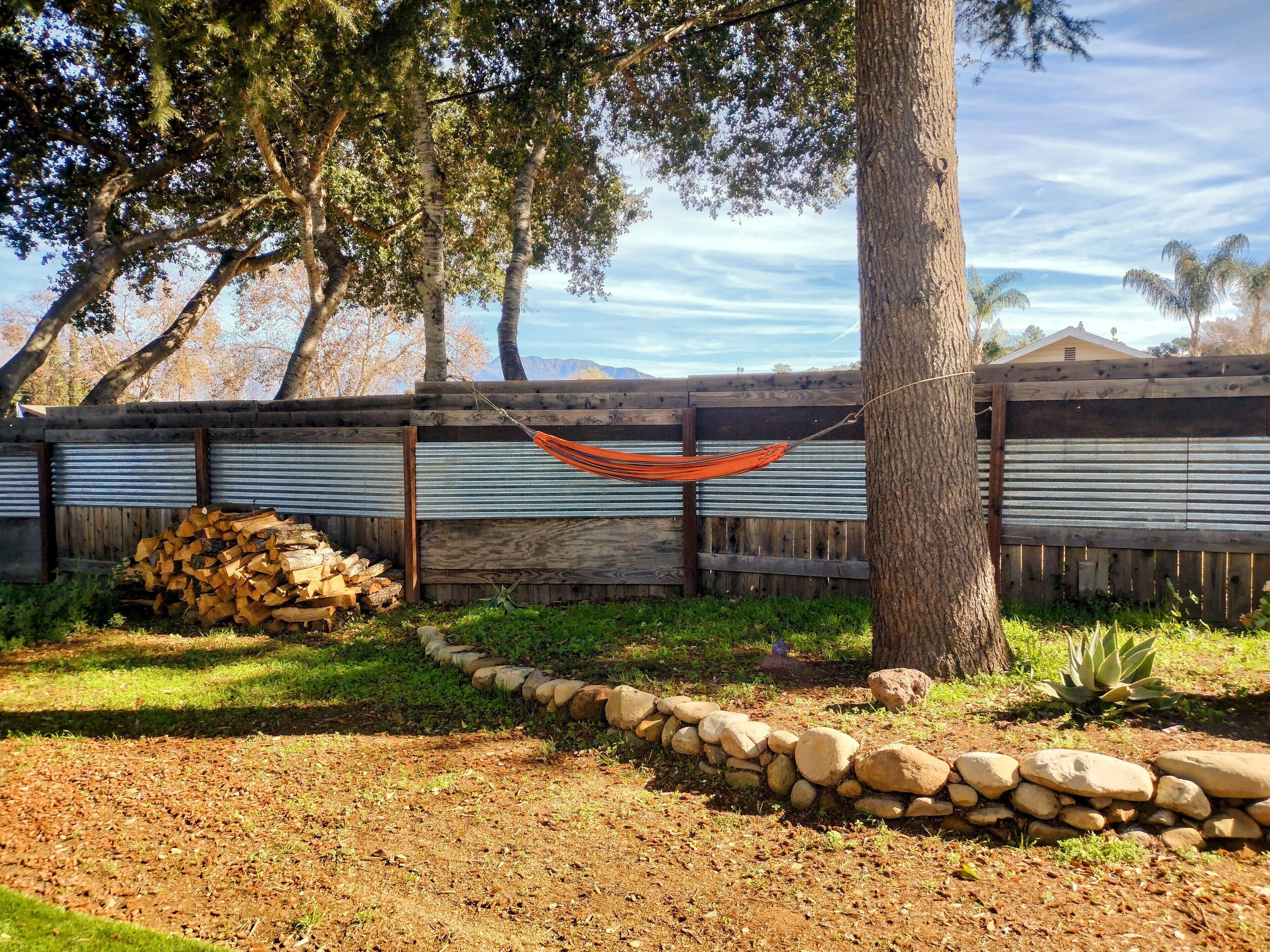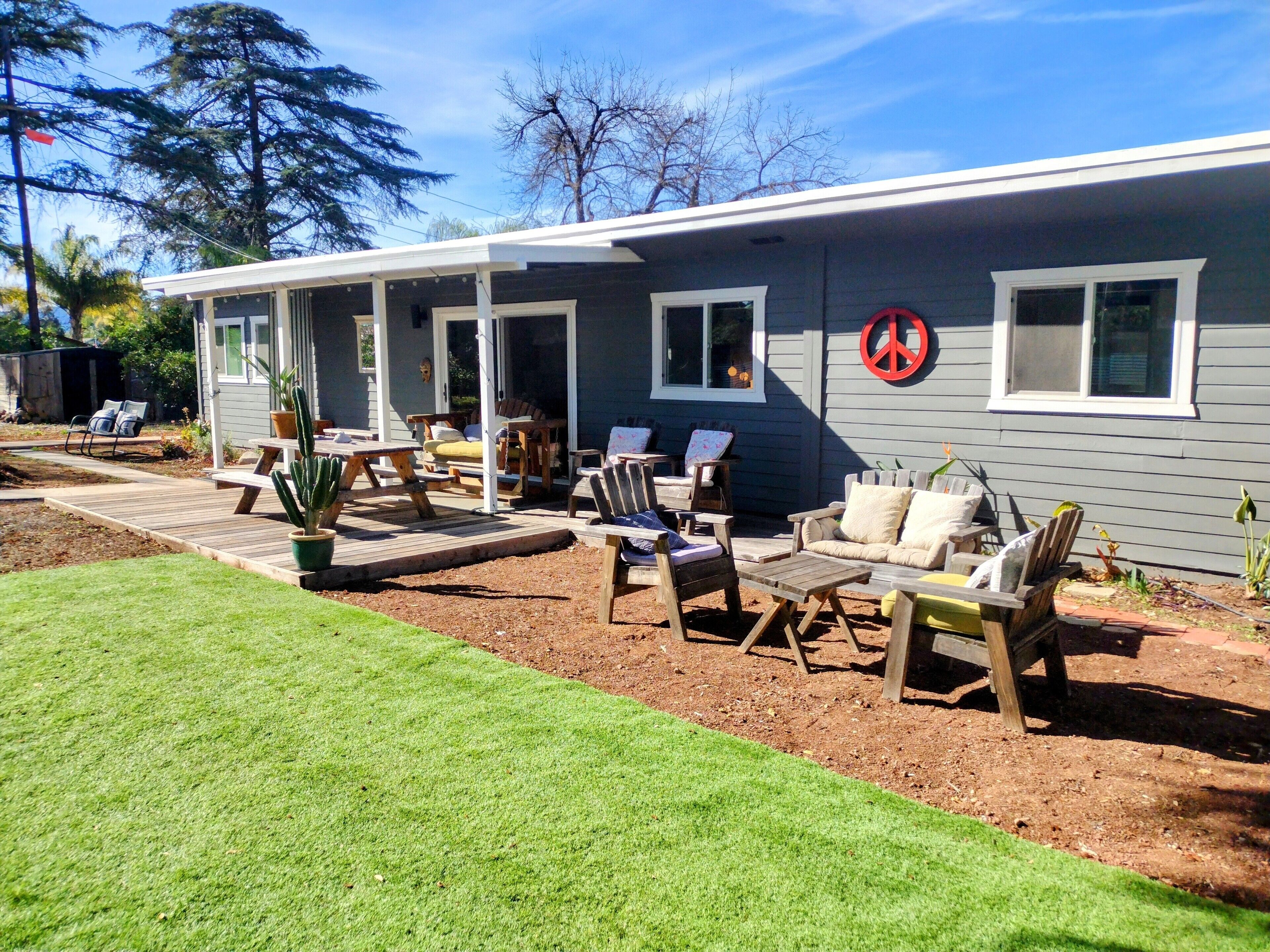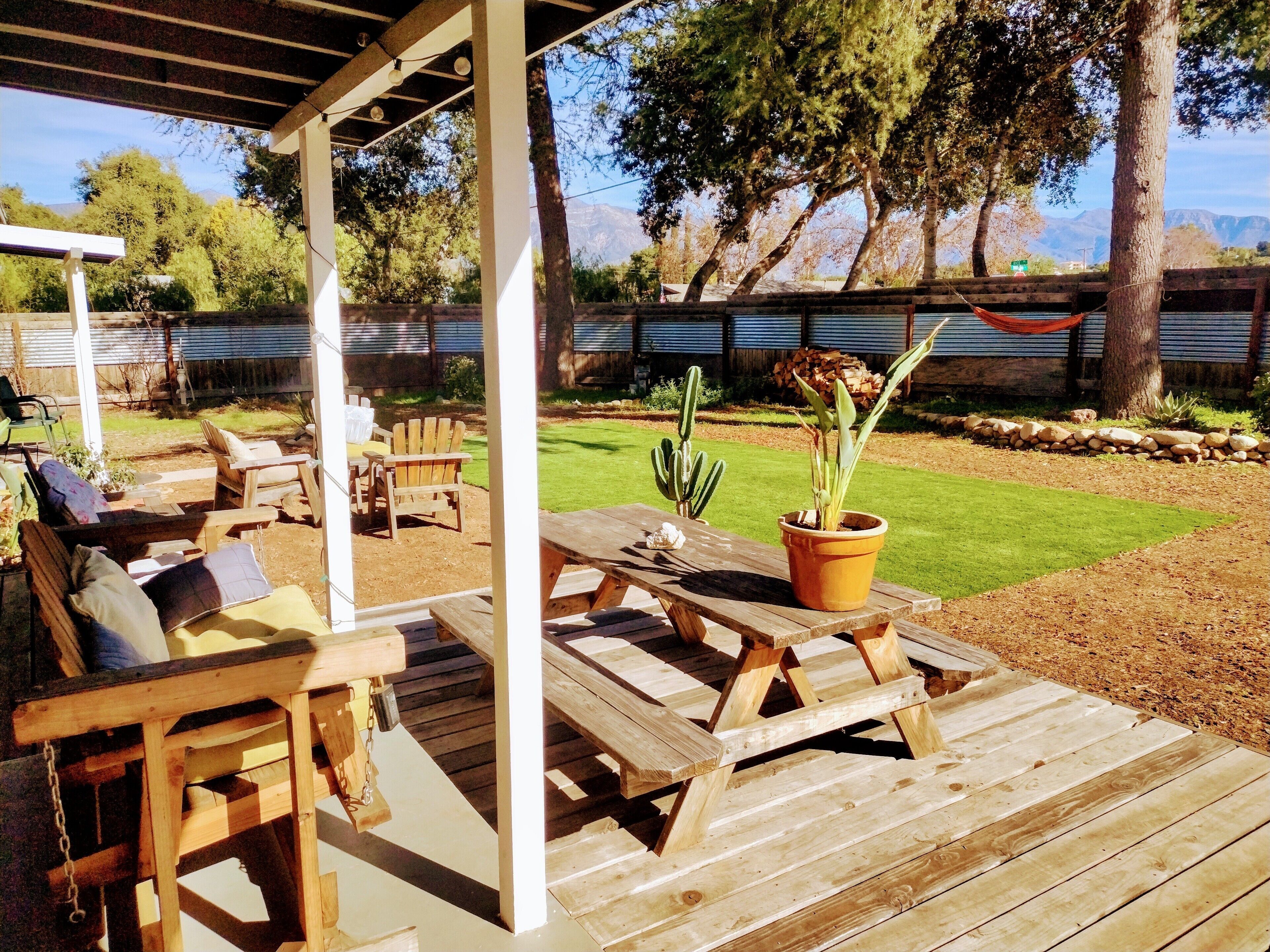 Casa Calma Modern Ojai Home Gated Best Location and Views Furnished or unfurnished. Just imagine relaxing here between the mountains and the seas perched near to the trees on a large private country Ojai property. Casa Calma boasts extreme privacy compound Oasis w 6ft fencing, hedges and trees, Topa Topa views w an indoor-outdoor vibe and an open floor plan perfect for entertaining Infants, Kids, and Seniors. Newly staged throughout and super clean. Fully fenced property pet friendly w solar, fruit trees, pine grove, home office, laundry machines, Bbq, 2 terraces, and 2 private patios, fenced park like yard, beaches nearby, and close hiking at the Ventura river preserve. Gorgeous new hard surfaces throughout the entire house stays cool and clean. A very special open floor plan w lots of windows and sliders and patios to bring nature into the house and creates a fun environment for any occasion. Come enjoy this Eco friendly solar electric house w style, organic gardens, orchard and drought tolerant botanical experience. If you want hip clean modern digs in Ojai, look no further. I recently updated all of the furnishings. Board games and kitchen w oils, condiments, dishes, pots and pans, and coffee maker etc. Plenty of giant spruce trees nice and shady. The lot is sunny with mountain views and also has shade from the trees w a cool breeze comes up from the ocean. You and your friends or family will have a blast here. Rooms have blackout window treatments allowing for maximum sleeping comfort. Lots of vintage touches throughout the property. All rooms have their own mini split AC and heating so each guest can adjust to their comfort. Master has a queen and big couch and ensuite custom bath w soaking tub for 2. 2nd bedroom has 2 single beds or a queen bed and bathroom and desk for home office. There is a couch in the living room. Please respect the property so it is nice for future guests. Great picnic tables and custom made patio furniture. Terraces and patios circle the house with vintage and new furnishings 50 inch Samsung Smart TV, and 42 inch w Google Chromecast to connect Netflix etc. I can set up bike rentals, massage therapists, yoga therapists, and or private chef. Trolly pics up on the corner ever 45 minutes. Great for wine tasting or choosing not to drive after drinking. Just hop on the trolley and it will bring you home. Let me know if you need any recommendations for restaurants etc. If you like midcentury modern homes then you will love this well appointed furnished designer home. Close to Ventura, Montecito, and Santa Barbara.