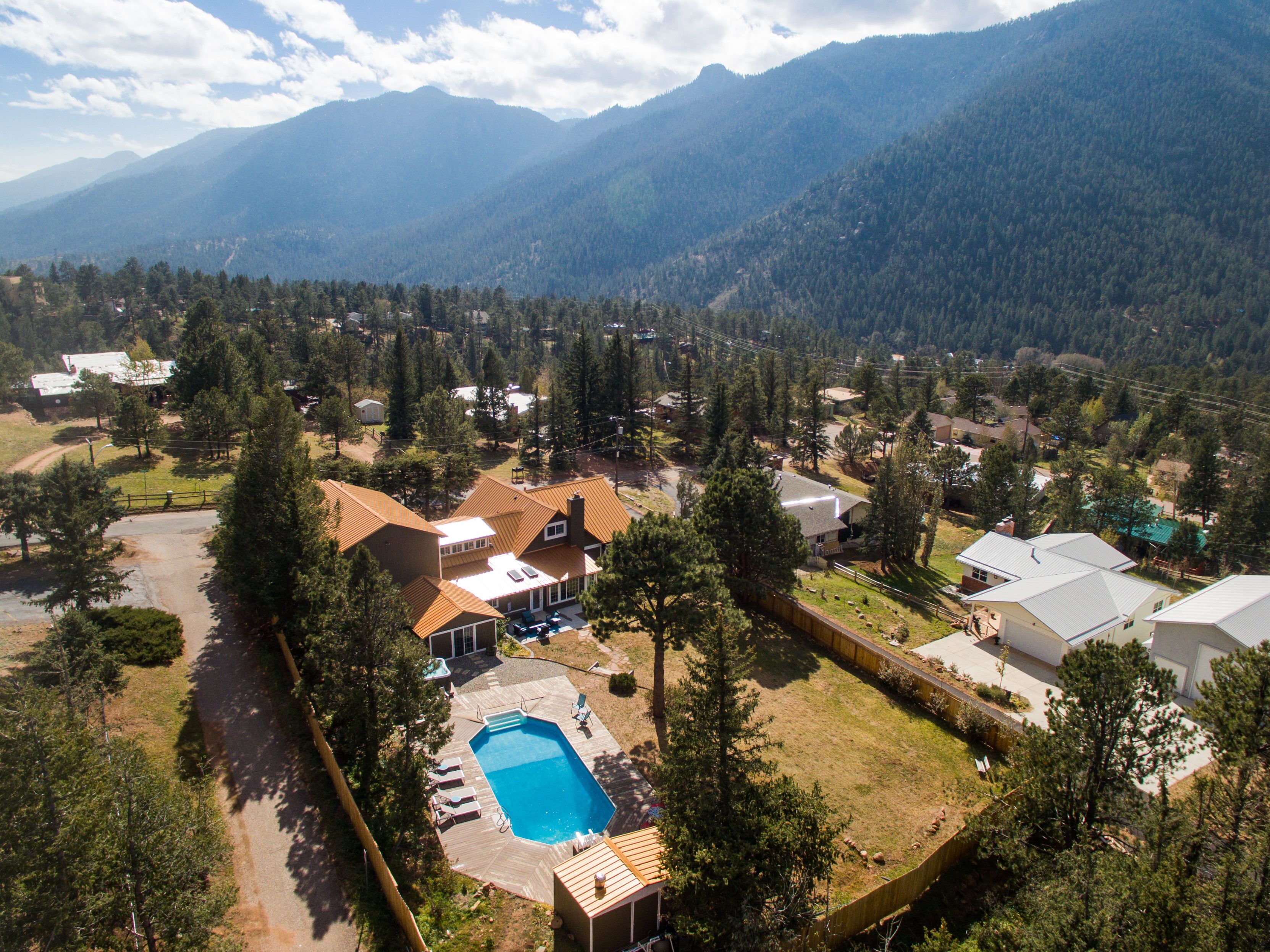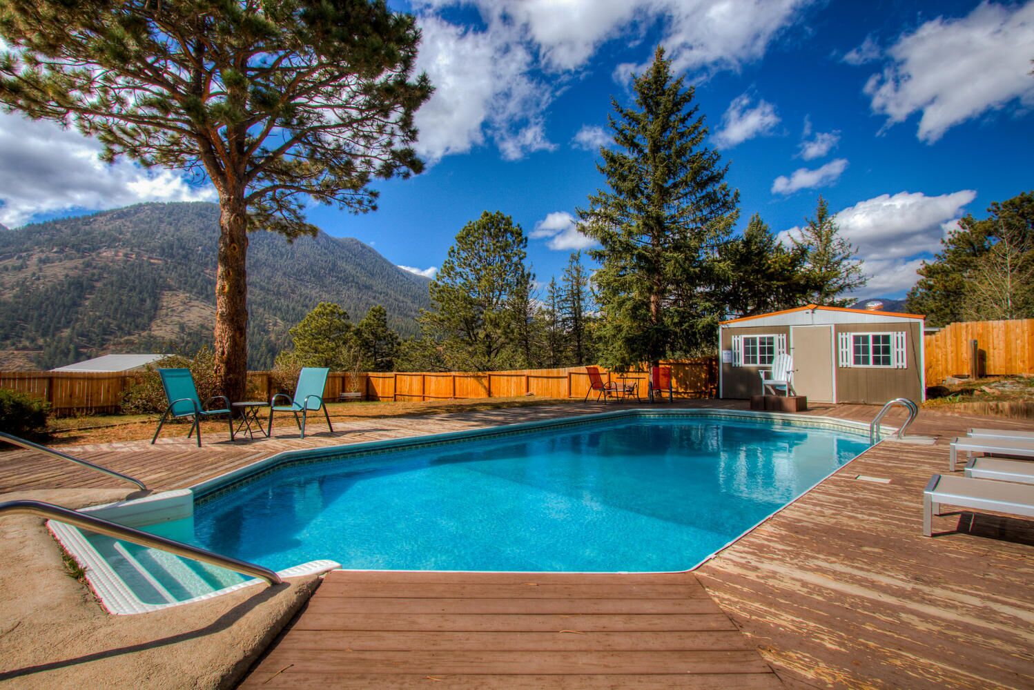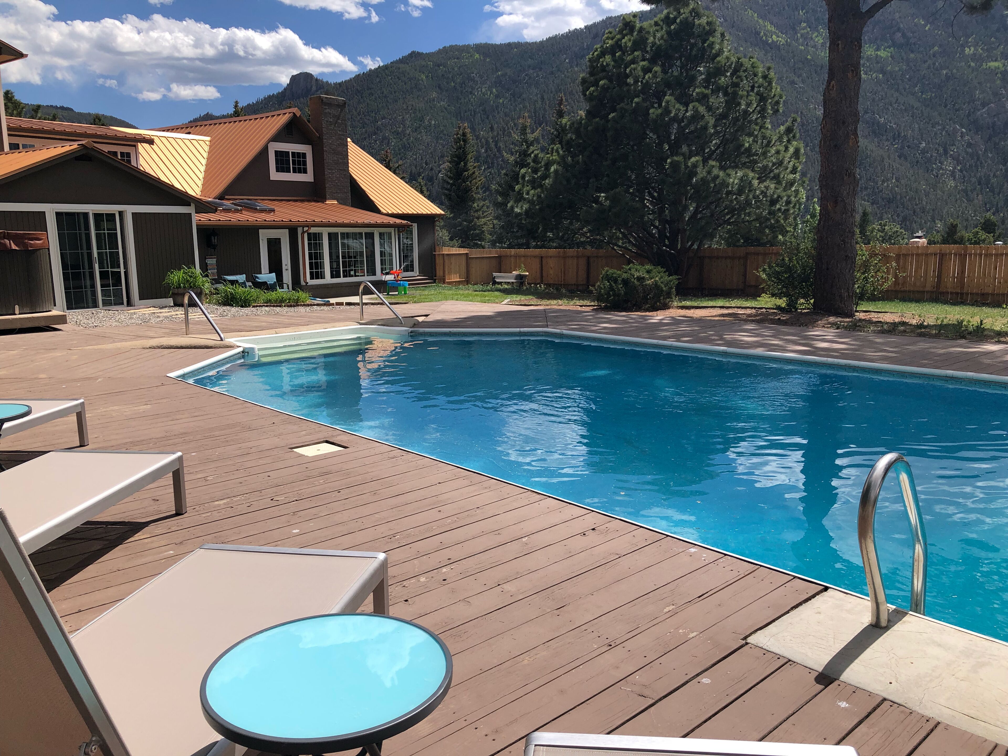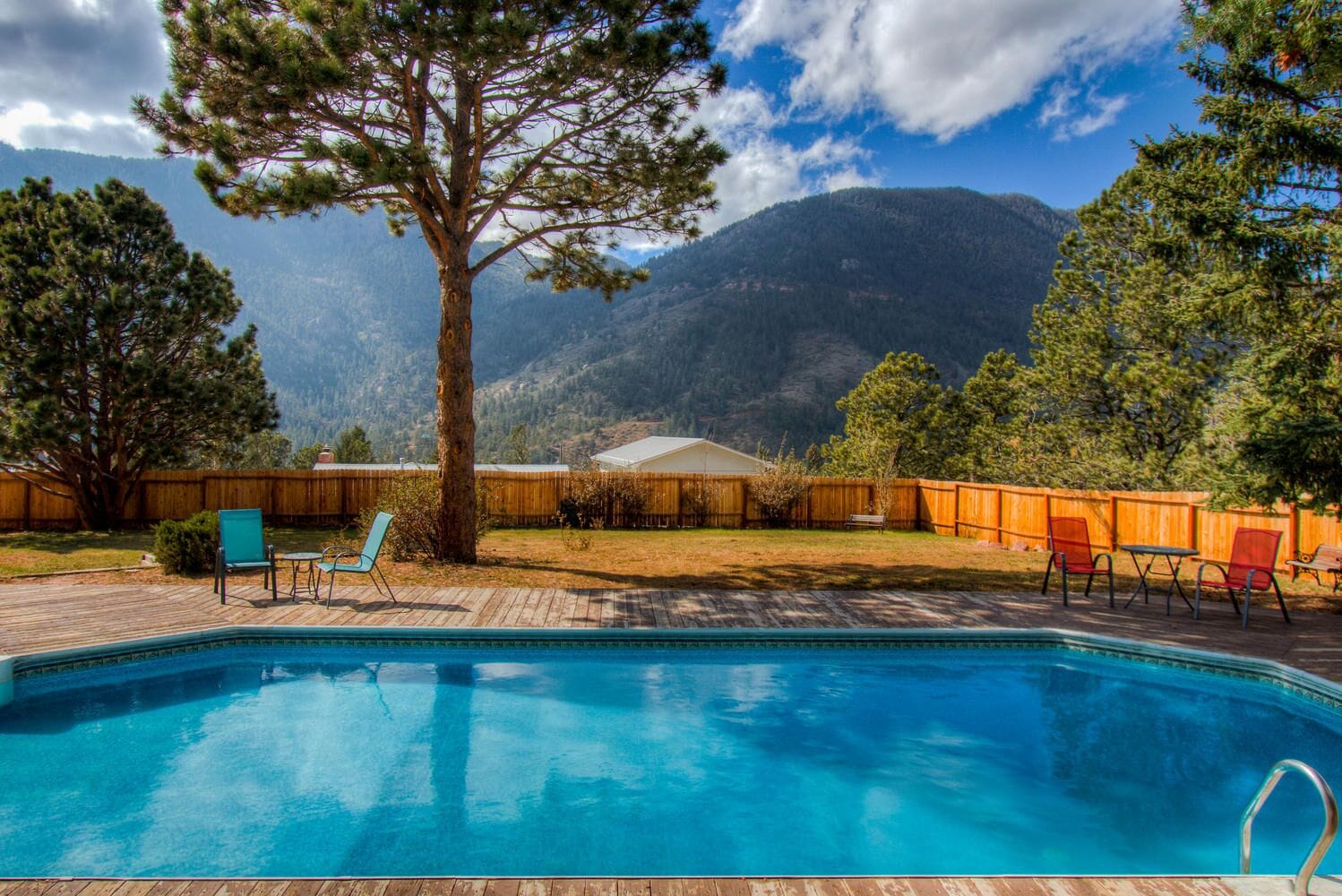 Colorado Spgs mountain luxury @base of Pikes Peak -private heated pool & hot tub The home: On the edge of Colorado Springs, Colorado, nestled between the two quaint, historic Colorado mountain towns of Manitou Springs and Woodland Park - this luxurious mountain house sits at 8200 ft at the base of Pikes Peak with quick access to endless unique local amenities, dining, and attractions. Forget about the chain restaurants, you’ll be captivated by the local cuisine and artisanship of the Rockies. Come home after a day of hiking, shopping, or scenic driving through the mountains just 2 minutes off the highway to a relaxing mountainside retreat in this unique 5600 sq ft Colorado custom "Rustic Sheek" home on over 1/2 an acre. It couldn’t be more ideal for large family vacations or reunions/gatherings of friends. The expansive living room boasts soaring windows & wall-to-wall mountain views. The kitchen is a chef’s dream with stainless steel appliances, 5 burner gas cook top, a large wine bottle cooler, gorgeous granite kitchen counters and your own coffee/tea bar. Enjoy family time together in the large theatre/game room with a brand new 58 inch flat screen, foos ball table, and a beautifully restored 110 year old pool table in the adjacent stone wall billiard room. This is the perfect place for adults to unwind with panoramic windows capturing Colorado’s outdoor beauty. Walk out to the open private fenced back yard and enjoy the jaw dropping views of the Rockies while you relax in the largest hot tub available. The expansive wood decking surrounding the outdoor heated pool allow you to entertain while you enjoy your backyard oasis and marvel at the majestic mountain views. Fun Fact: This property is rumoured to have once been a recording studio and mountain retreat for artists such as Led Zepplin, The Rolling Stones, Aerosmith, & Van Zant.Sleeping Accommodations: The main level bedroom is equipped with a queen size bed and an adjacent 3/4 bath. Up the floating stairs, the owner’s oasis includes a king size bed, a daybed and a glorious two person shower & soaking tub. There are 2 more bathrooms upstairs, one with a shower and one with a shower/tub. One other bedroom boasts a kids dream sleeping area - adults mind your head- but climb up a ladder up to a bridge crossing to a loft with a full size bedroom outfitted with a queen size bed. Below you will find an extra long full size bed. Also upstairs is another bedroom with a twin boat bed and pull out trundle. The 5th room has 2 more roomy full-size extra long adjustable beds where you can take in the beautiful mountain views from most windows, as well as an above the bed skylight: enjoy star gazing as you drift off to sleep! In the downstairs game room, a triple bunk bed is tucked away in the corner for those teens that like to fall asleep watching movies or playing games. If needing more bed space, there is an additional chair that converts nicely to a single bed for a child, as well as air mattresses available upon request. The game room downstairs also offers a triple bunk if needed, ideal for kids/teens. Community: Named for nearby waterfalls, Cascade beckons to visitors as the front door to Pikes Peak, the country's most visited mountain. We know you will love your stay in our scenic mountain town of Cascade, among these Pikes Peak foothills and just minutes from Colorado Springs. If you are looking for a mountain retreat centrally located yet not your average neighborhood home than this is the place. With numerous hiking trails right outside your door, and a prime locale for so many tourist attractions - it really is the perfect launching point for all the front range has to offer. Getting around: A short three minute drive will take you to the entrance to Pikes Peak Highway, and the famous amusement park the North Pole, (open May through December). The unheralded Wines of Colorado is walking distance from the house - a happening hot spot for creek side dining or wine tasting and a must do while you’re here. Ten minutes drive will put you in downtown Manitou Springs, where you can hunt for fountains in the quaint streets and sample underground natural spring water, known for its high mineral content. Here you will also find an abundance of shops and restaurants, a famous penny arcade, zip lining, and satisfy your sweet tooth with plenty of candy, chocolate shops and ice cream shops. Green Mountain Falls is only 5 minutes up the pass where you can have lunch and stroll along Gazebo Lake. Also within a 10 minute drive is the entrance to Cave Of the Winds and the famous towering red rocks of Garden of the Gods. The very happening downtown Colorado Springs is less than a 15 minutes drive. Only 25 minutes and you are at the South Gate to the renowned United States Air Force Academy. A short twenty minutes will take you to Cheyenne Mountain Zoo, recently named the 4th best zoo in North America, and countless other attractions in southern Colorado Springs. Keep heading west up the pass and discover Woodland Park - a charming mountain town, home to the famous Donut Mill, and the site of the Rocky Mountain Dinosaur Resource Center. Woodland Park is also home to Colorado Wolf Adventures and for a more relaxed evening, try one of the outstanding local breweries. If you come in the winter - day trips to world renowned ski slopes such as Breckenridge, are less than 2 hours away. Getting here: Fly in to the Colorado Springs Airport (COS) for a quick door to door transfer of only 30 minutes or take an hour and a half and drive the scenic route from Denver (DEN).