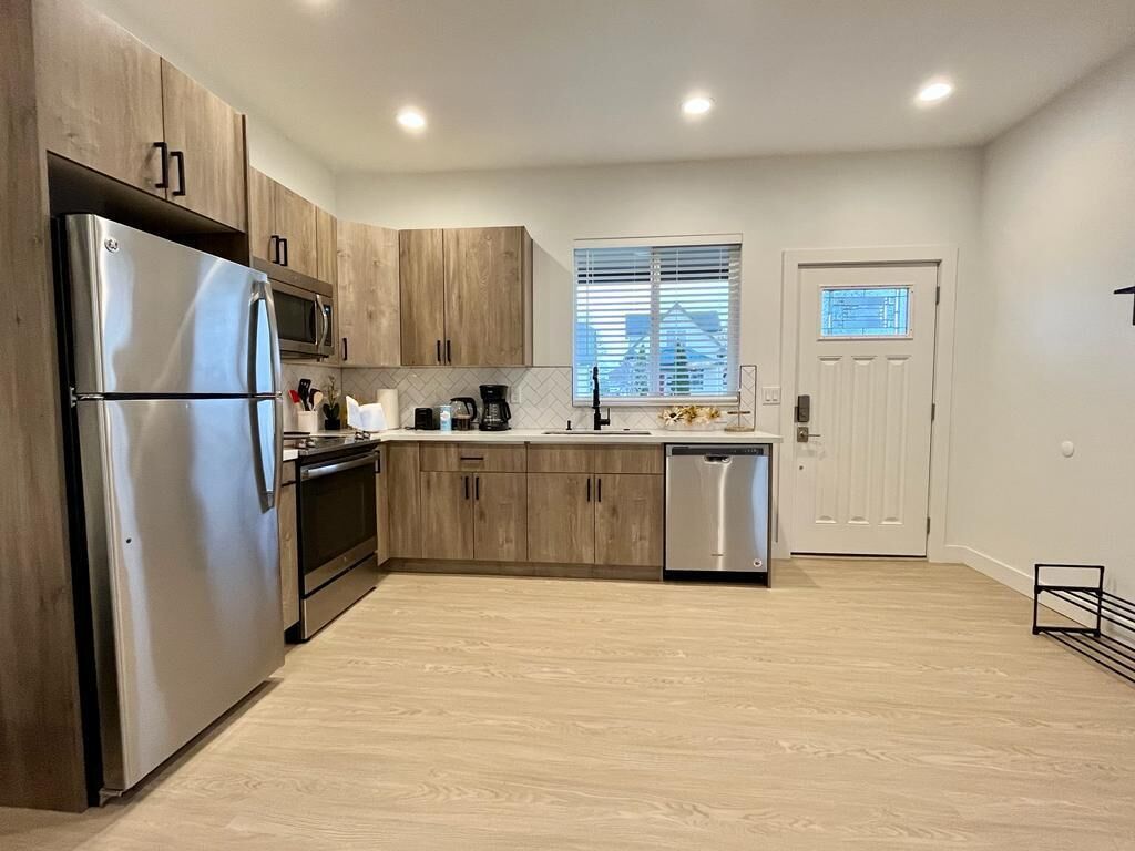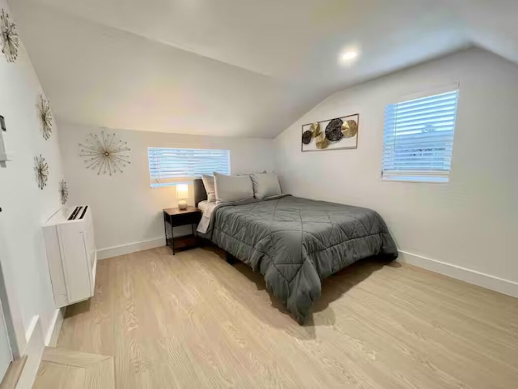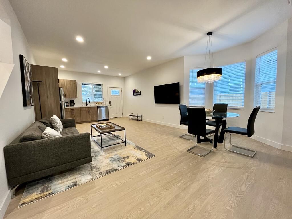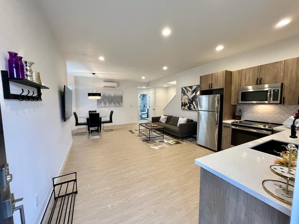 Insta-worthy! 2 Bedroom Fancy Townhouse Duplex Discover contemporary comfort in this urban retreat with AC and fast WIFI. You will not want to leave! We invite you into a stylish haven with modern and luxurious finishes and thoughtful design. The open-concept, high ceiling, living space and kitchen greets you at the front door. 1 Bedroom (King Bed) on ground level and the 2nd Bedroom (Full bed) up...