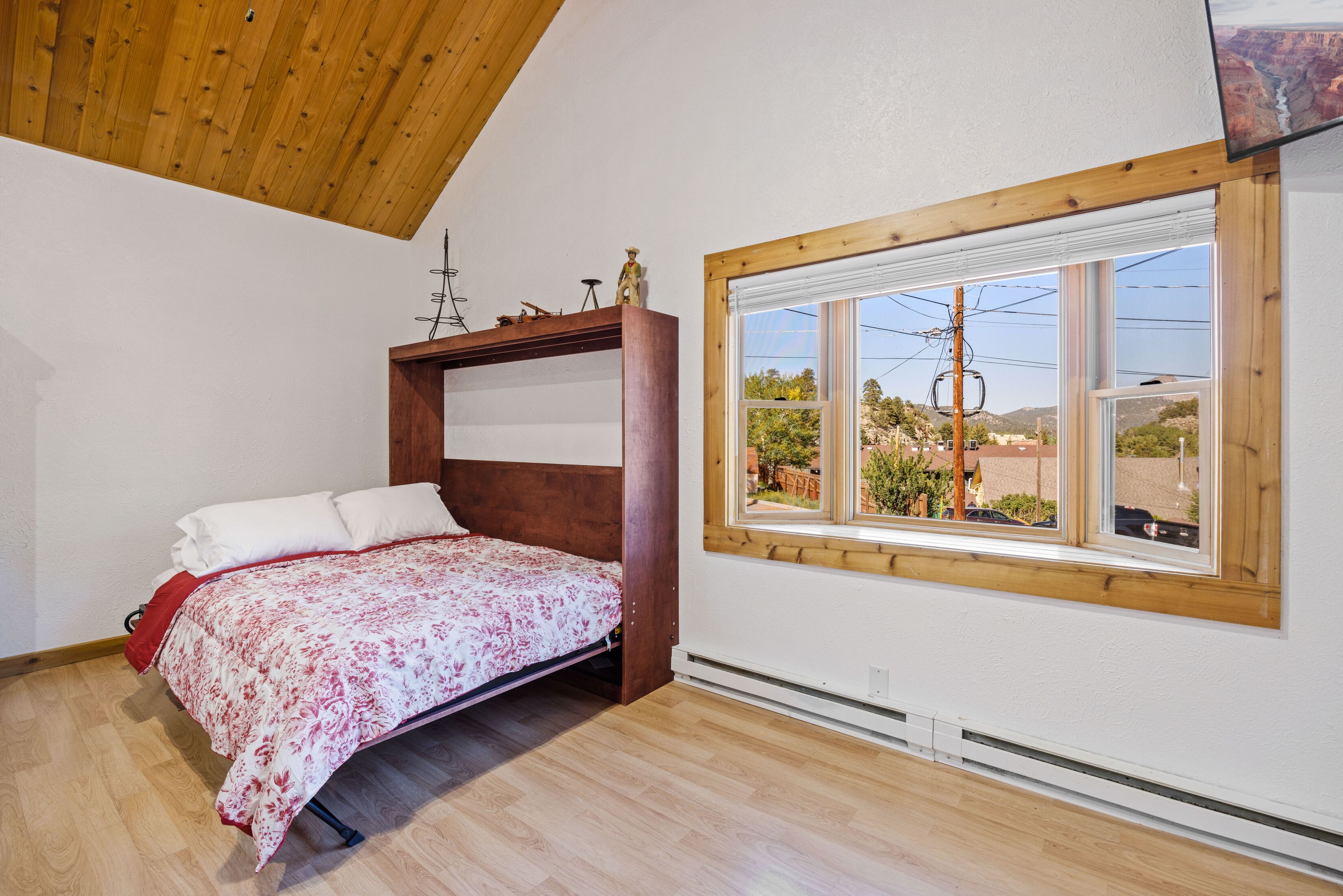 Rustic Luxury 1 Bedroom 2 Queen Murphy Beds Lic #6077 Located in Downtown Estes Park the Gateway to the Rocky Mountain National Park just a short drive from Denver Colorado. Be sure to visit the on site La-Cabana Rooftop Patio. The Bear Lake Flat is within walking distance of numerous shop's and other restaurants. Experience the beautiful mountain scenery and catch a gorgeous view of The Stanley Hotel. Complete with 1 bedroom that can accommodate up to 4 guests, 1 Full Bathroom and a Half Bathroom. In planning your trip we are inly able to issue 1 parking permit per vacation rental for our private parking lot.