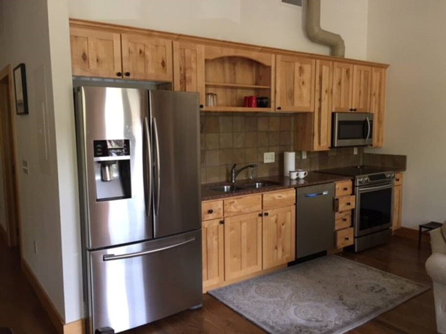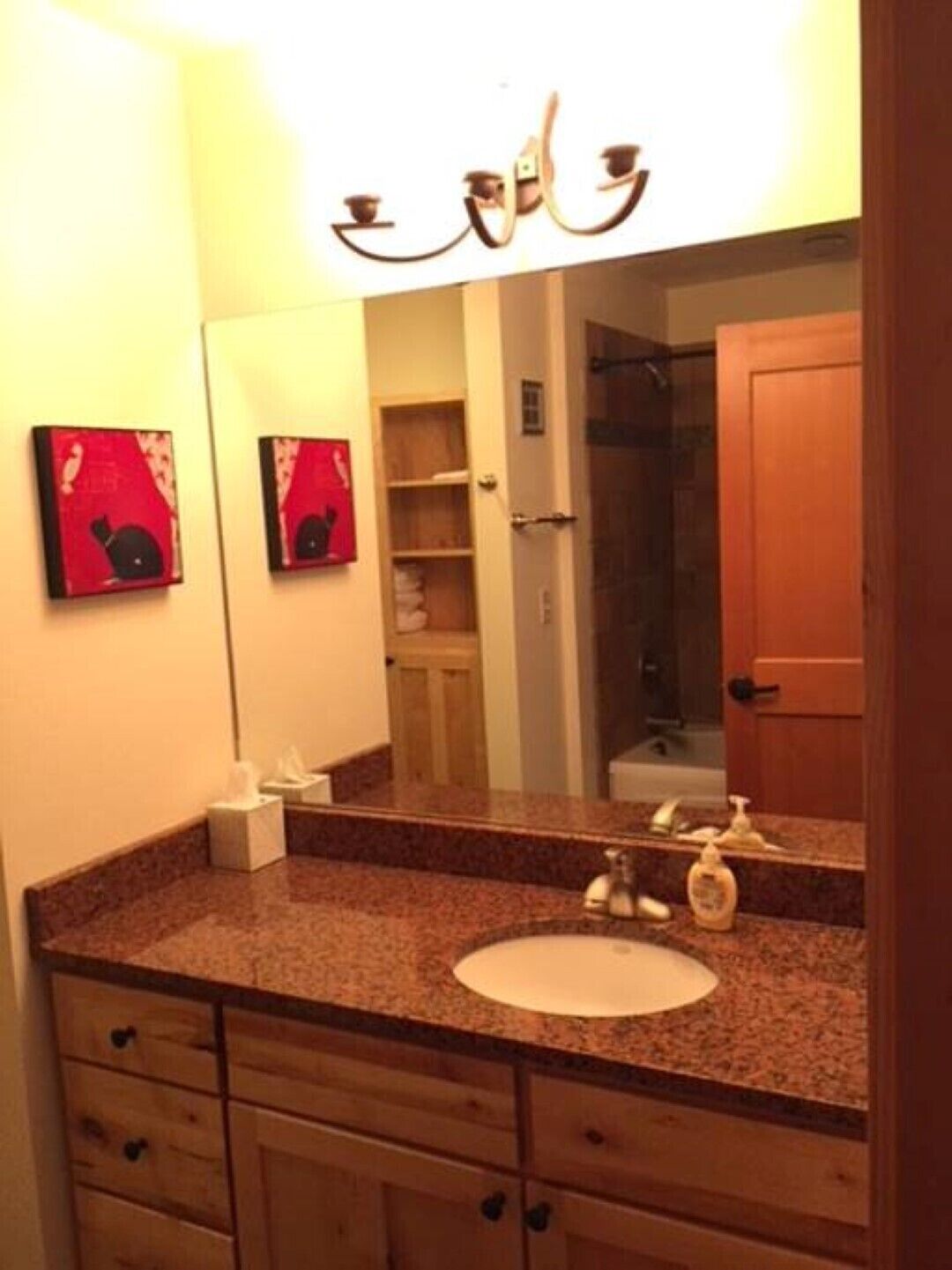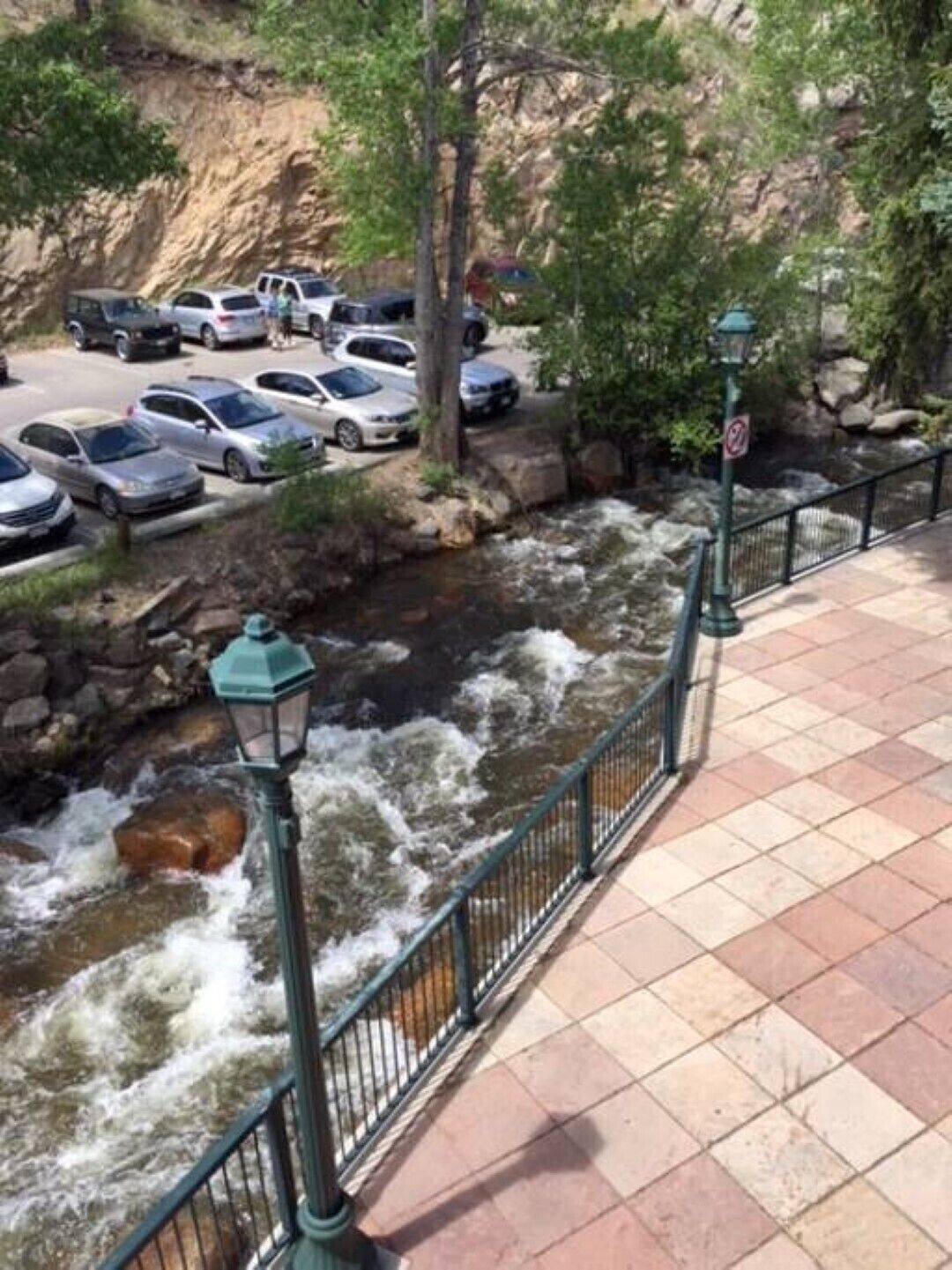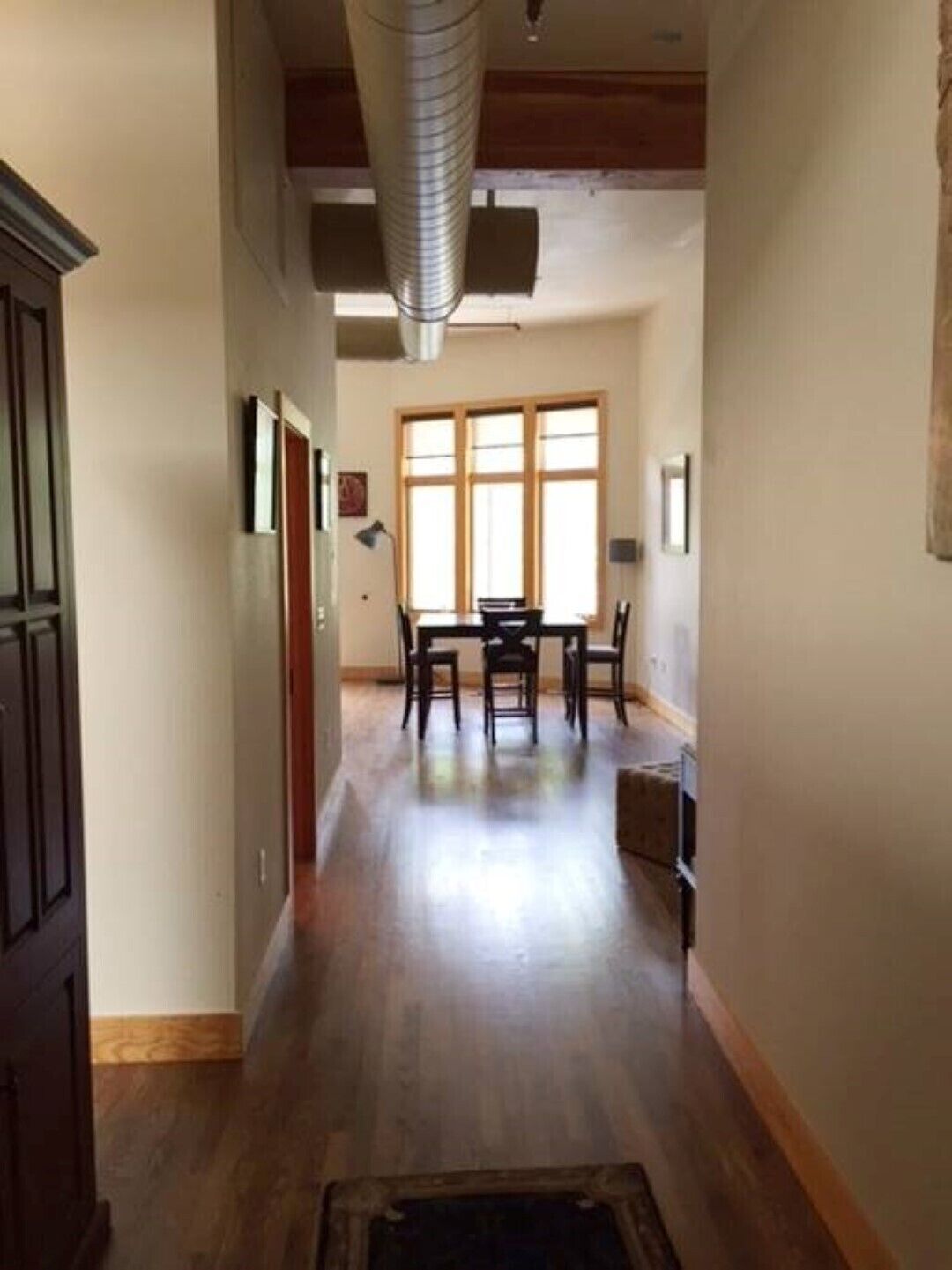 Downtown Corner Luxury Loft on the Riverwalk - King Bed! Short term rental registration number 6171. Get away from it all in the mountains of Estes Park with luxury and the convenience of a downtown location. The loft is right on the Riverwalk and main street; you'll be able to walk to shops, restaurants and art galleries on the main street of Estes Park and you're close to all the outdoor activities of RMNP and the surrounding areas.The spaceThis luxurious loft in the heart of town has 11 foot ceilings, a warm gas fireplace, sky lights, full bath with an enormous jacuzzi tub, granite counter tops and a private deck overlooking the river walk. You'll find that this loft is very quiet with a peaceful with a view of a hillside, you will feel miles away while relaxing in this quiet gem and if you're lucky you'll watch a herd of elk walking by on the hillside. Living, dining and kitchen are all part of an open, sunny space. Be sure to open the windows so you can hear the river rushing by! Our guests love the luxurious jacuzzi bathtub as well. The building is secure & safe with a few cute shops right below.Estes Park offers numerous festivals, restaurants, art galleries, shopping, golf, tennis, music venues, museums and historic properties such as the grand Stanley Hotel. Rocky Mountain National Park is only a few miles up the road and has 350 miles of hiking trails covering the most easily accessible, pristine mountains in the United States. Hiking, biking, horseback riding are all available in the park or you can drive Trail Ridge Road over the Continental Divide.