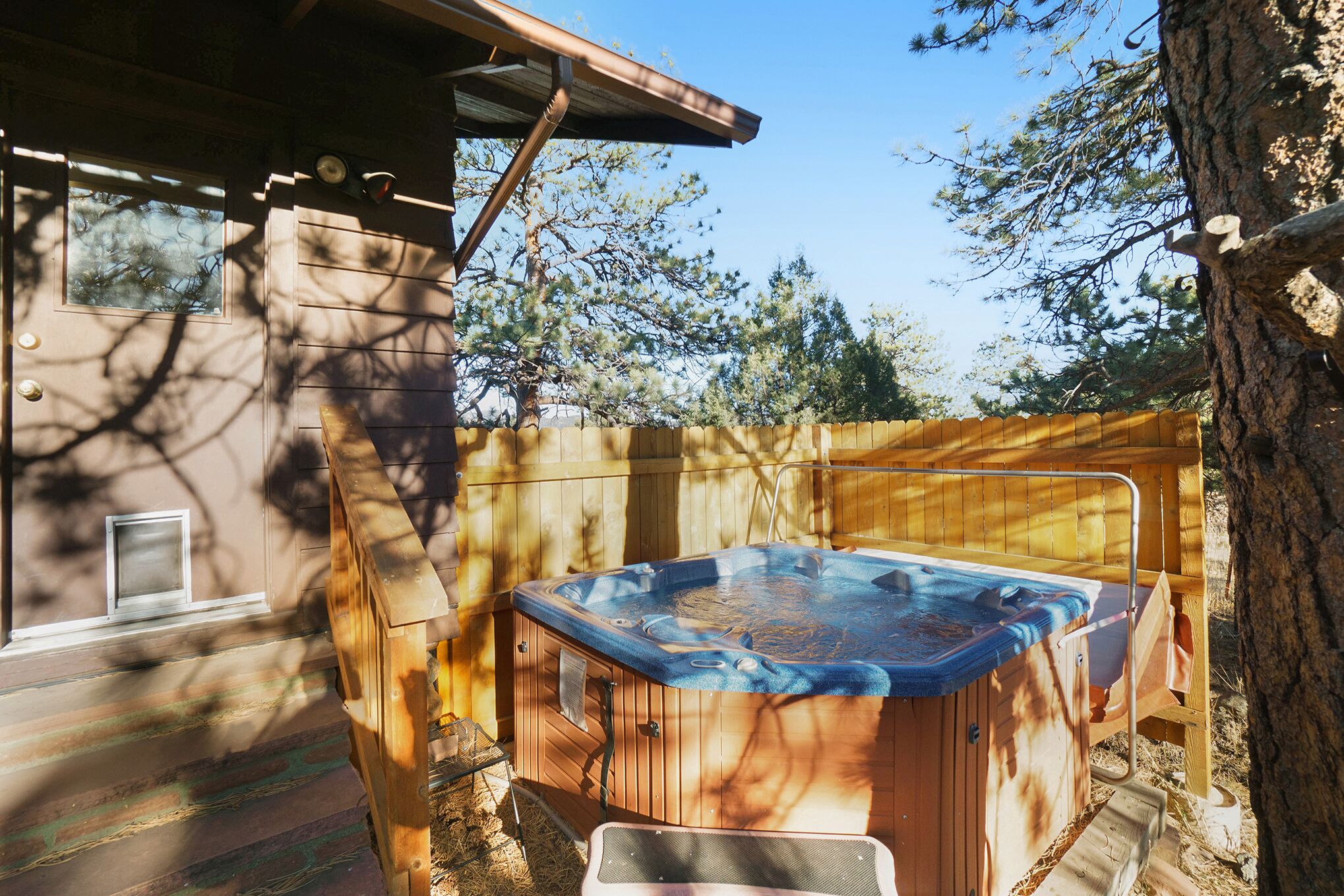 O'Deer Cabin - Pet Friendly - Walk to Downtown Estes Park - Private Hot Tub - EV#3241 O'Deer Cabin - Pet Friendly - Estes Park -- EV#3241 - a SkyRun RMNP Property EV #3241- Free, secure and private WiFi.- Available for extended stay.- Reservations of 14+ days may include extra fees. See listing details or call our office.This cozy two bedroom mountain getaway is .5 mile from downtown Estes Park, walk to plentiful shopping and a variety of restaurants. You can't beat the location, plus you can bring your dog to join in the fun.Settle in on a cool evening with the warmth from the wood burning fireplace a bowl of popcorn and a good movie. TV with cable and WiFi are both available for in-house entertainment. The kitchen is fully equipped for a home cooked meal. Gather around the table for breakfast to plan the events for the day or reconnect with the family over supper at the end of the day.There is a full size washer and dryer for guests to use. And "Fido" will enjoy this dog friendly home with a pet bed in the utility room, and a "doggy door" to the outside fenced yard. You will fall in love with the outside living/deck area where you can soak in the beauty of nature and wildlife. Relax and enjoy an early morning cup of coffee while watching the sunrise on Longs Peak. Enjoy the private hot tub next to the deck.This cabin is in the perfect location to enjoy all Estes Park has to offer. Whether you are in town for an extended stay, for a family reunion, or just a much needed getaway, you will feel like you belong at O'Deer Cabin.- Management provides a starter kit of amenities to get you through your first day, including: an extra roll of toilet paper in each bathroom, one extra roll of paper towels, 2-3 garbage bags, sample-sized bottles of shampoo and conditioner, small bar soap, 2-3 laundry powder packs, 4-5 dishwashing pods, liquid dishwashing soap, and a single brew coffee pack. Guests will need to provide or purchase additional toiletries and products as needed beyond this starter kit.- Long-term reservations of 14+ days require mid-stay property safety checks or mid-stay cleans, additional trash pickups and hot tub services. Safety checks are at no additional charge. Mid-stay cleanings include linens change, floors, bathrooms and light surface cleaning. Mid-stay services are charged to the guest, and charges can only be added after your reservation is made. Management will call the guest directly for payment for the required services. Call our office for details.What to be aware of:- No A/C - Firewood not provided, Guest must provide.- Dog must be crated while alone in the home and on a leash while being walked outside. - One dog allowed. Extra charge.- Parking for 2 cars in driveway. Do NOT park on street.- No large vehicles, i.e. RVs, trailers.- No Parties. No Smoking. No Pets. Fines apply.- Quiet Time 9 p.m.- SkyRun hot tubs are not intended for children.- Guest buys own soaps/paper items when provided starter kit items are depleted.- Estes Park is a Dark Sky Community. Bring a Flash Light.- BEARS in the area - secure trash, lock doors and windows when leaving.- Local On-Call Staff available after hours for emergency issues only, i.e. gas leak, broken furnace, broken water line.- Snow removal by SkyRun depending on property, at 4 inches of new snow.What You'll Love:- Very short drive to national park & downtown.- Private Hot Tub- Dog friendly, doggy door, fenced yard, 1 dog, fees apply- Gas Grill- Wood Burning Fireplace- Request for availability-High Chair & Pack-n-Play, complimentaryÂ
