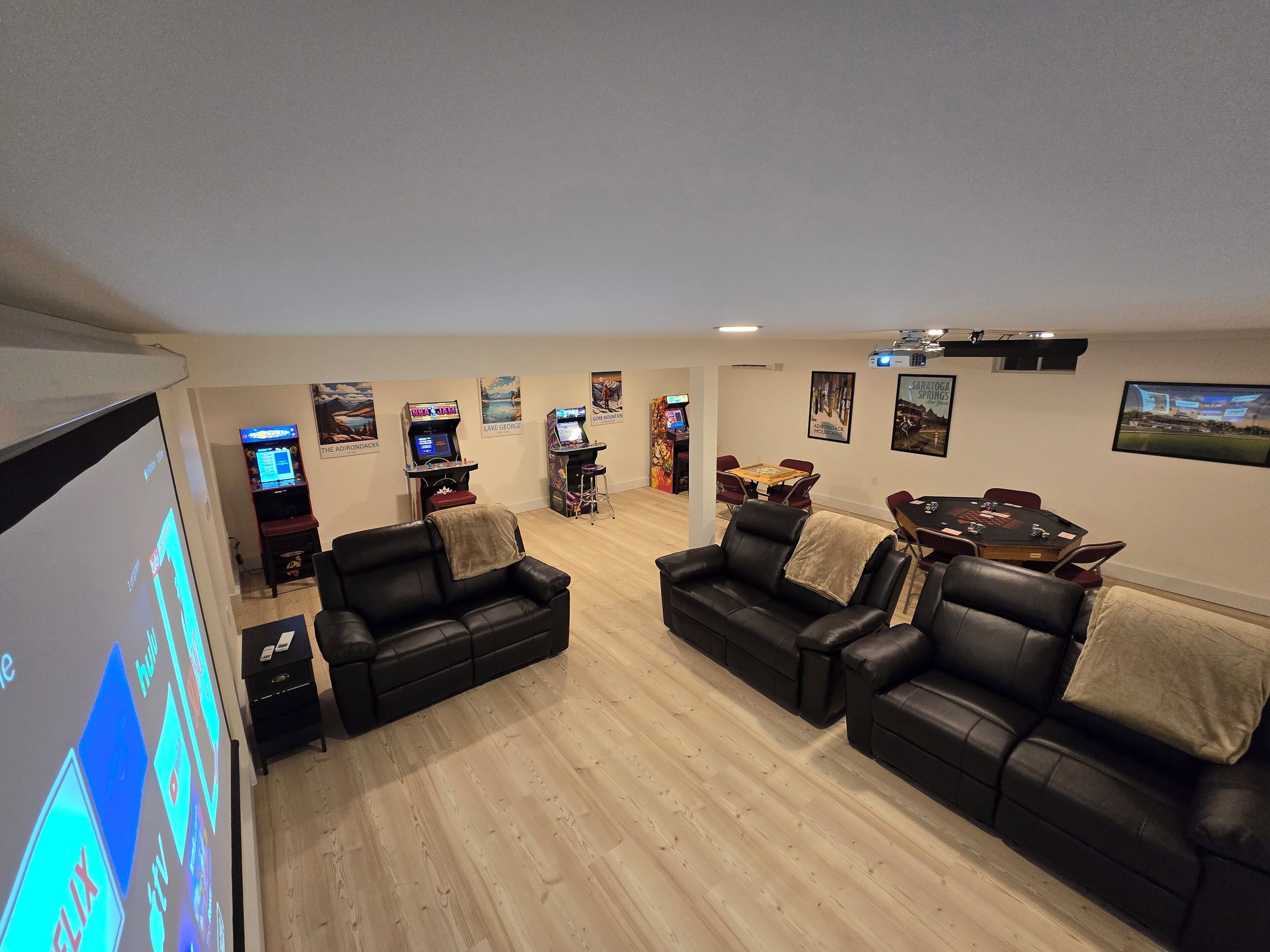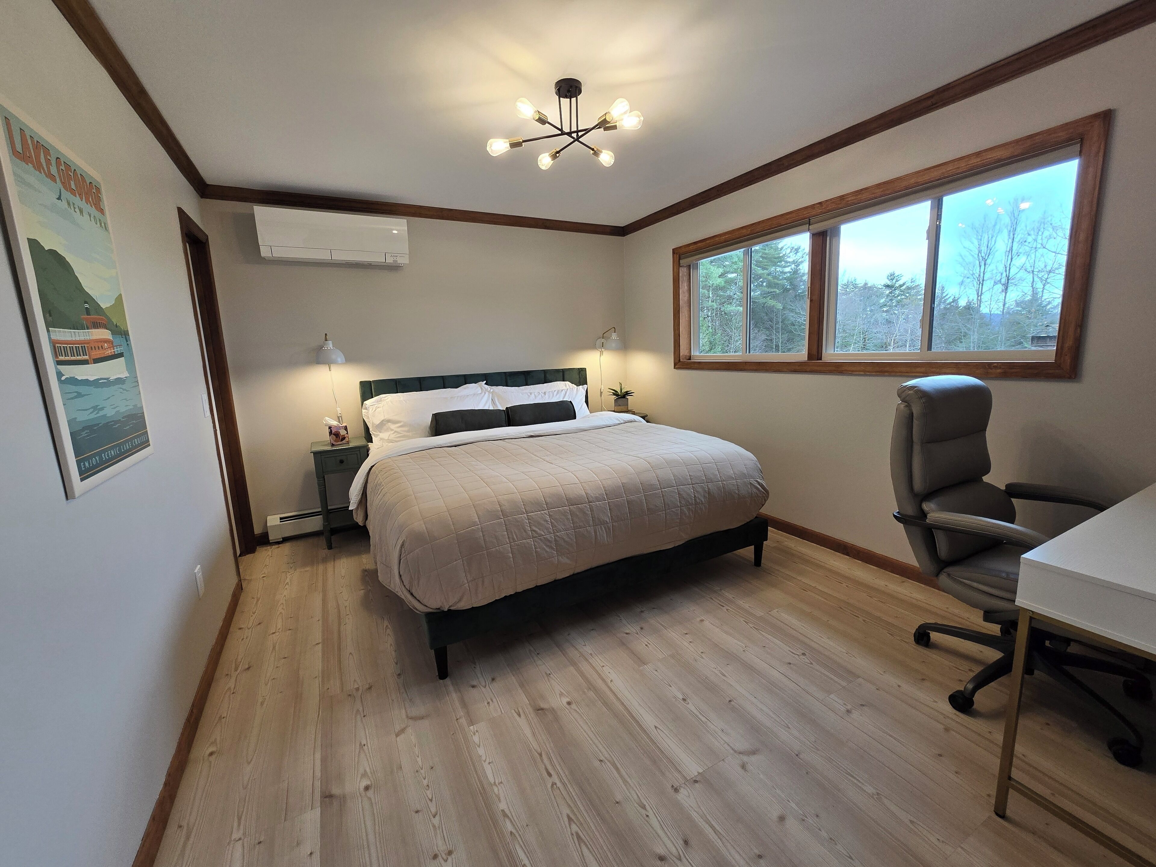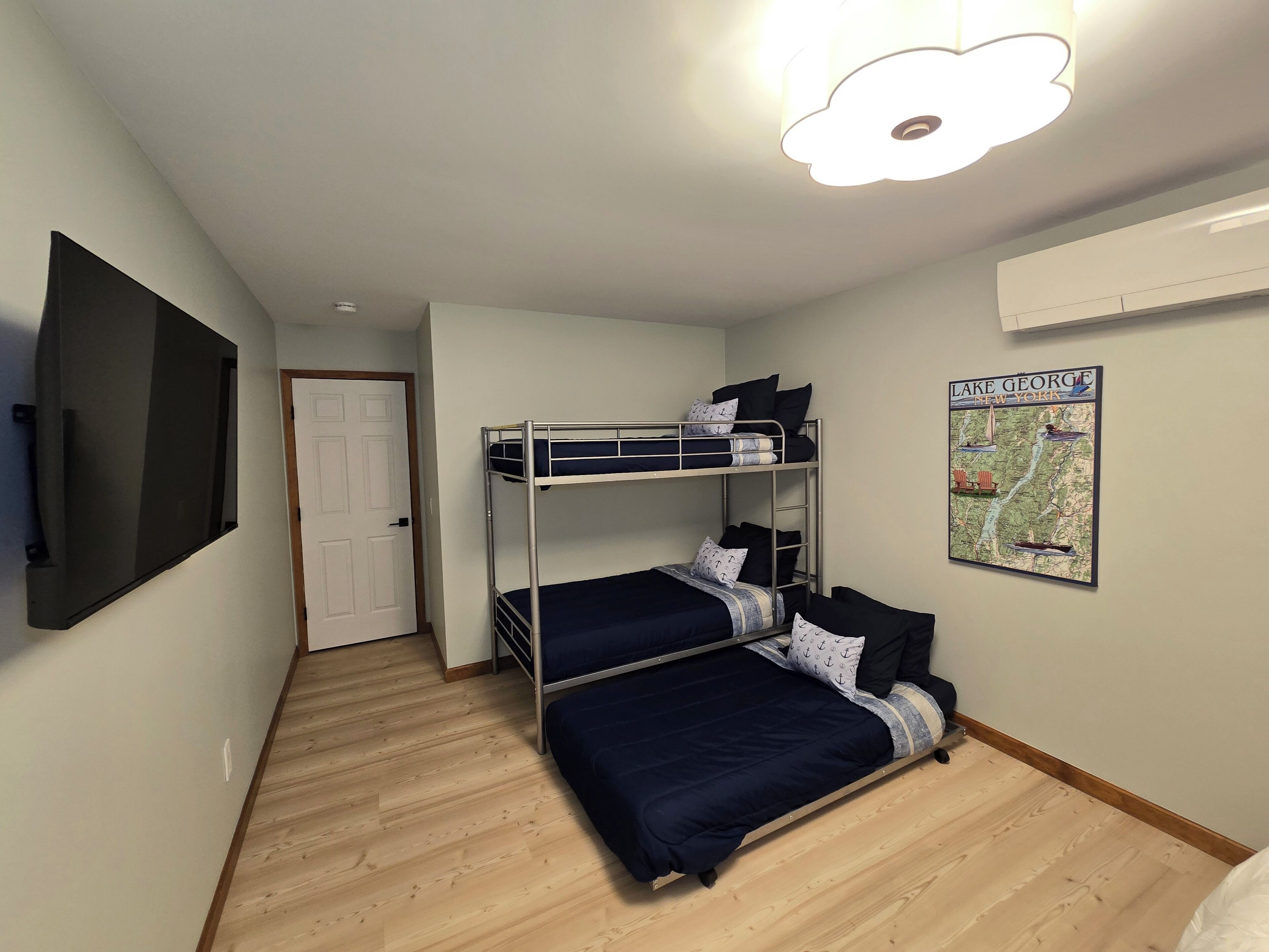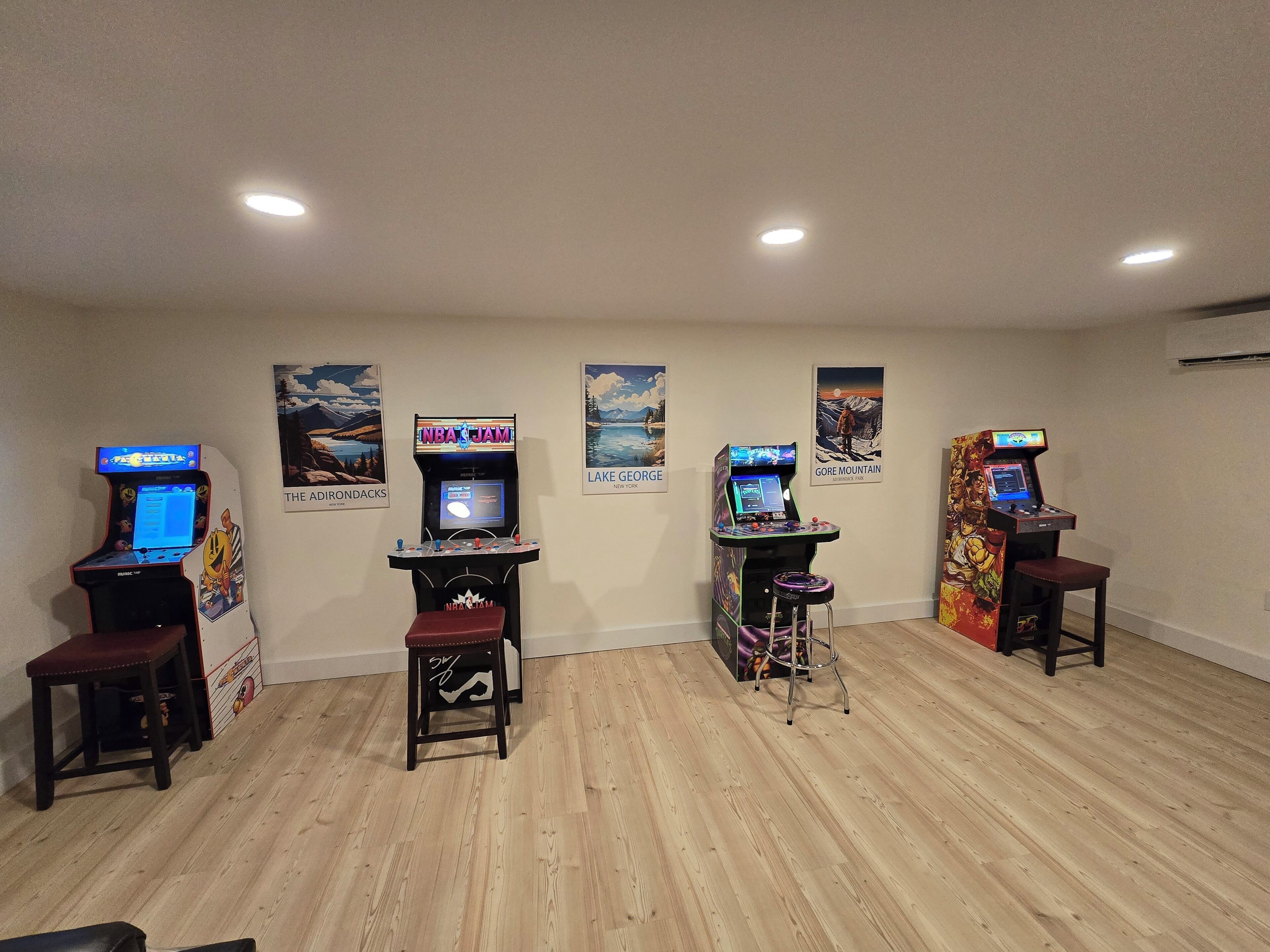 Pool Arcade Mtn Views Lake George Home Retreat WFH Welcome to Lake George Home Retreat (@LakeGeorgeHomeRetreat), a chalet style cabin nestled in the Adirondack mountains. A thoughtfully renovated home, sleeping 11 and designed to be the ultimate family destination for every season. We invite you to recharge and savor the delights a slower pace of life offers.✔ Just over 3 hours from NYC✔ Heated Inground pool✔ Outdoor fire pit with bistro lights✔ Basement arcade and projector theater✔ High Speed wifi✔ Smart TV in every bedroom✔ High end mattresses✔ Games, records & puzzles✔ Outdoor dining area w/ propane grill13 mins → Prospect Mountain21 mins → West Mountain30 mins → Gore Mountain14 mins → Lake George Steamboat Company 15 mins → Million Dollar Beach15 mins → Six Flags Great Escape18 mins →The SagamoreThe spaceMake yourself at home in this fully renovated three bedroom house. Every space was designed with intention, taking elements from its natural surroundings. Enjoy our grand living space– kitchen, dining and living room all flow from one to the next as natural sunlight fills every space. Welcome mornings from our expansive deck and close out nights listening to classics on the record player as you take in magnificent sunsets. Retreat to our basement game room and theater to play poker or classic arcade games. Our plush beds and spa like bathrooms invite you to recharge for the next day. Make a day in our backyard with a heated inground pool, grilling and firepit, or plan a day out with all that the Adironadacks has to offer. We’re minutes from hiking, boating, breweries and shopping, or explore further to Saratoga.Other amenities:➪ For families -Bassinet + high chair + Pack n Play + tamper resistant outlets + dollhouse/toys➪ Onsite washer + dryer➪ Ductless heating/cooling units and smart TV’s in every room➪ Dedicated working area➪ Fully stocked kitchen + 5 mins from supermarkets➪ Grandiose basement with projector and sofa recliners, arcade, poker table + game table➪ Backyard entertainment: life-sized Connect Four, Jenga, cornhole➪ Fire Pit + Seating Area➪ Spa-like bathroom with towel warmer, ambient lighting and heated floors➪ Self check-inGuest accessEntire space is included in this rental. Except for desginated owners closet and basement storage closets. Please, make yourself at home.If you are coming during winter or on snowy days, please consider driving a 4WD or AWD.Other things to notePlease remember that you're staying in a family house, not a hotel. We ask that you treat the space with the respect you would show your own home. If any problems arise, we will do our best to take action ASAP, but there is no one living on site 24/7.As an insurance company requirement, we request all guests to provide government issued IDs prior to check in.