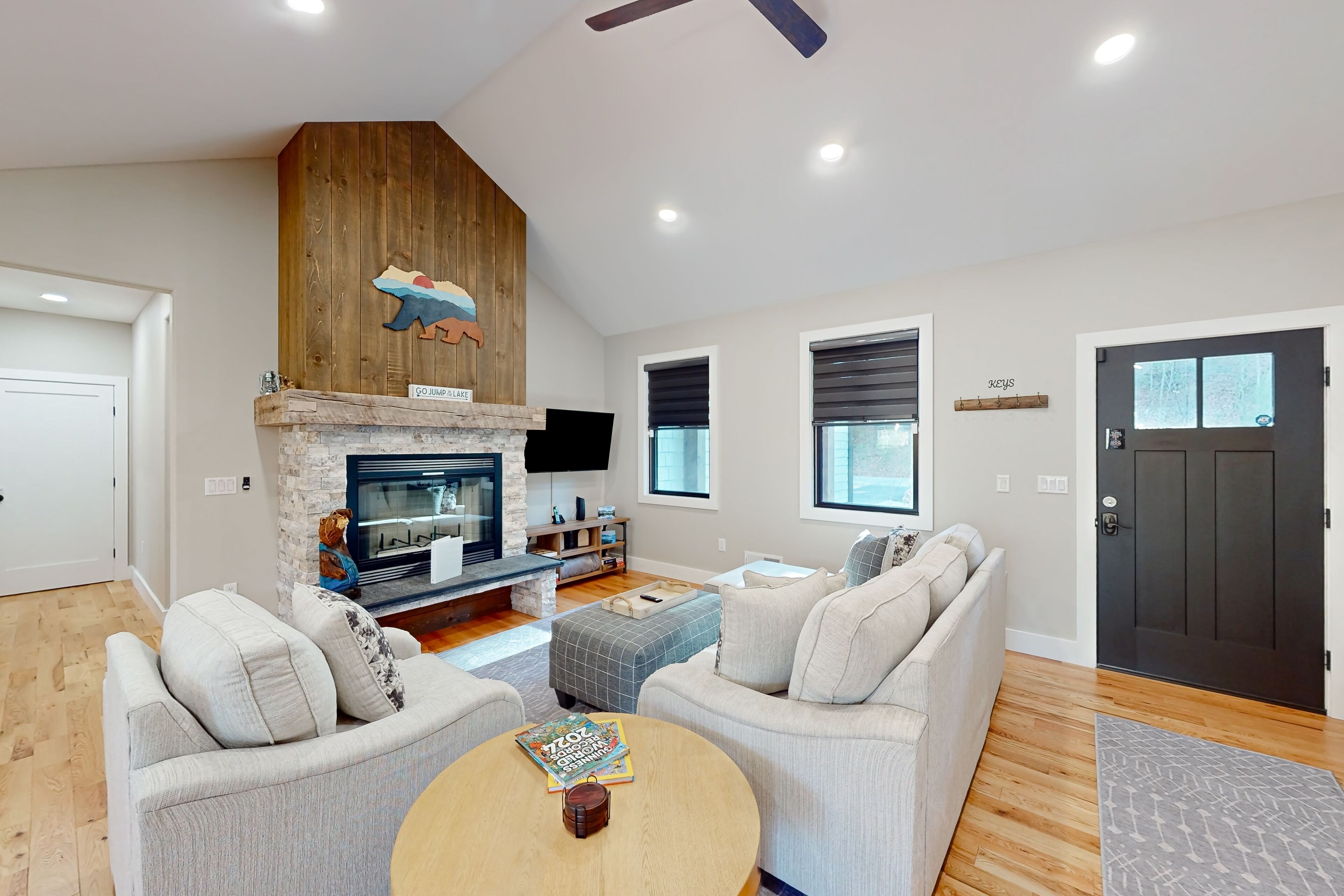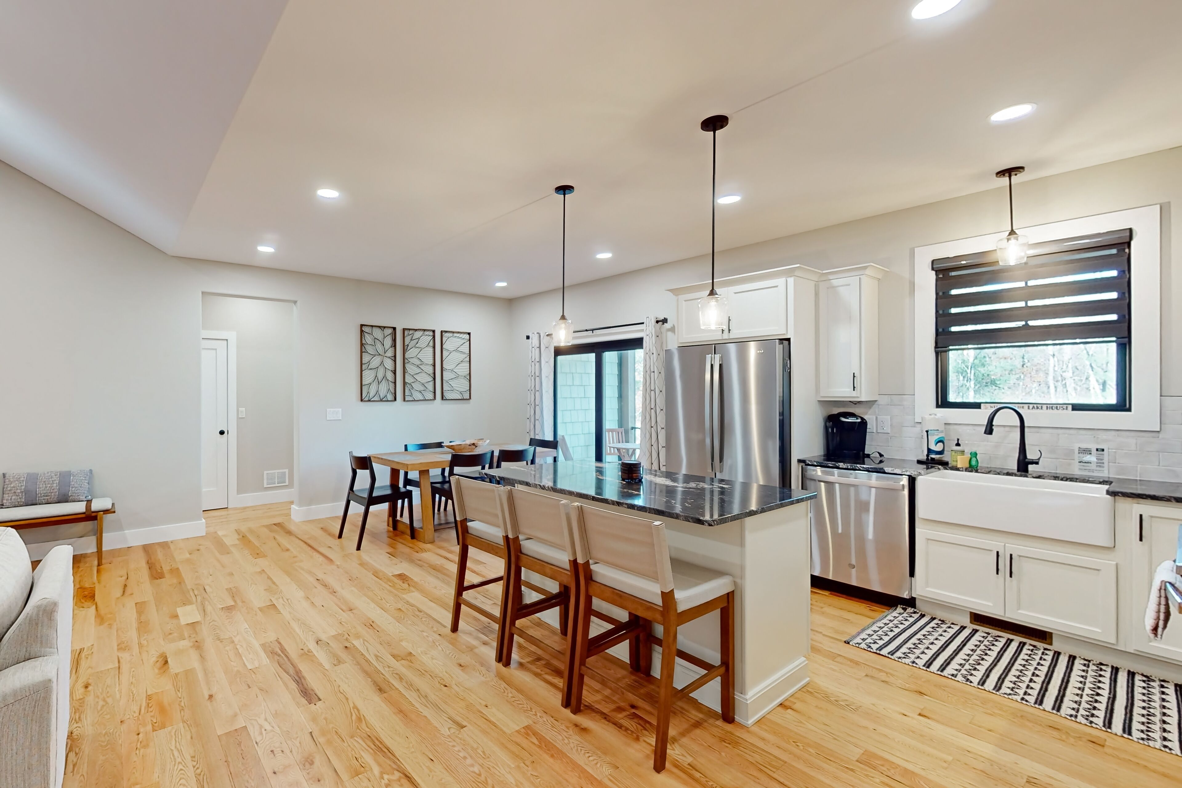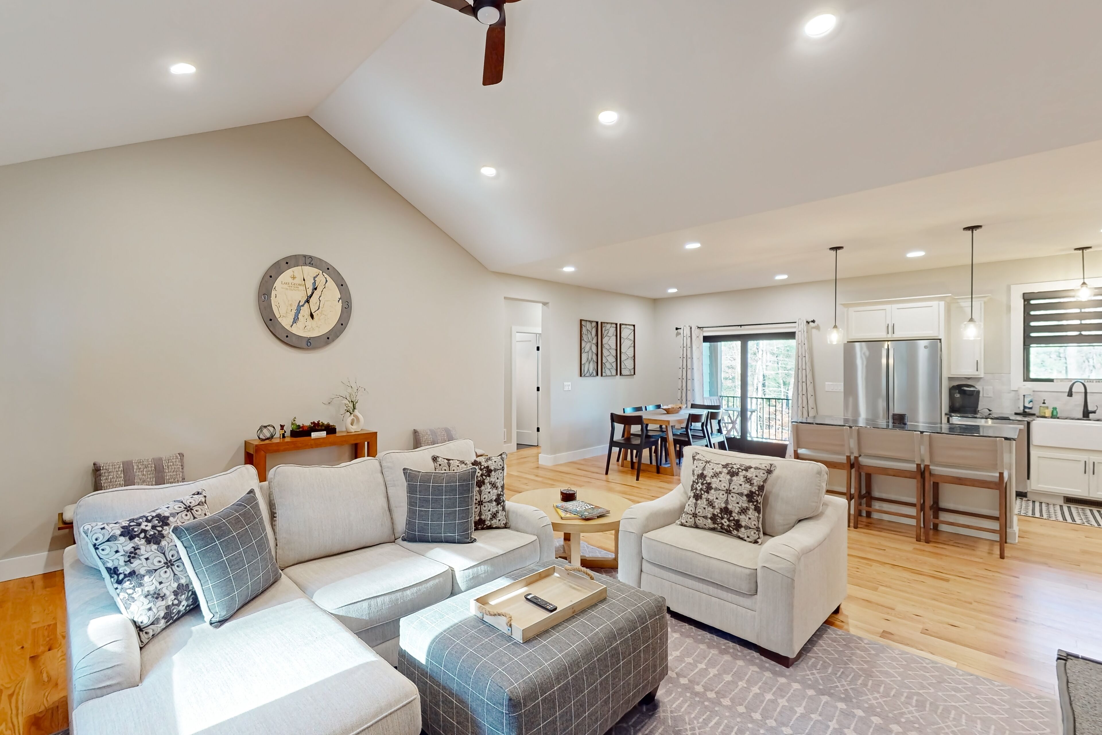 Newly built home with covered decks, large yard- great location Lake George GetawayOur calendar is updated in real-time & our nightly rates are accurately displayed. Simply enter your desired dates and click 'Book Now!'Nestled amidst a tranquil wooded landscape, this newly built home exudes an aura of serenity and privacy. Create lasting memories while preparing gourmet meals on the gas stove/oven. This well-equipped kitchen gleams with its farmhouse sink, stainless steel appliances, Keurig coffee machine, spacious center island, and other amenities.Take in the views from the top balcony or just relax on the outdoor furniture provided on both covered patios. Nearby, discover a world of exciting attractions, including breathtaking views of Lake George and Million Dollar Beach, mini golf courses, parasailing, boat rentals, fabulous restaurants, and plenty of shopping! Fort William Henry Historical Fortress & Museum and Prospect Mountain are within a mile's drive. Gore Mountain and West Mountain offer fantastic skiing for winter enthusiasts and are just a short drive away. Don't forget to book tickets for Winter Realms by Ice Castles and Winter's Dreams by Moment Factory.When seeking respite from the outdoors, retreat into your home away from home, where warm modern farmhouse wood finishes, wilderness-inspired décor, and plush furnishings create a welcoming ambience. Gather around the fireplace in the cozy living room for fun-filled family movie nights.Unwind in the primary bedroom, a private sanctuary with an en suite bathroom featuring a large vanity, walk-in shower, and a separate bathtub. Each bedroom provides a comfortable retreat with private smart TVs, soft linens, and central air-conditioning. The family loft boasts a foosball table and an additional smart 65" TV for added entertainment. A large laundry room has a new washer/dryer, and high-speed internet access completes the interior amenities.Embark on scenic hikes amidst breathtaking natural beauty, exploring trails that wind through forests and can lead to hidden waterfalls as you take in all that Lake George and the Adirondacks offer.Here is an opportunity to be one of the first guests to stay in this entirely brand-new home that offers a harmonious blend of tranquility, adventure, and spacious and clean amenities, making it the perfect destination for creating unforgettable memories.Things to KnowCheck-in time: 4:00 PM.Check-out time: 10:00 AM.All guests shall abide by Vacasa’s good neighbor policy and shall not engage in illegal activity. Quiet hours are from 10:00 PM to 8:00 AM.No smoking is permitted anywhere on the premises.Parking notes: There is free parking available for 6 vehicles.Security camera details: At exterior entries and garage, facing outwards.Damage waiver: The total cost of your reservation for this Property includes a nightly damage waiver fee, plus tax if applicable (the “Damage Waiver”). (A discount may be applied for stays of 28 nights or longer, if permitted.) The Damage Waiver covers you for up to $3,000 of accidental damage to the Property or its contents (such as furniture, fixtures, and appliances) as long as you report the incident to the host prior to checking out. The Damage Waiver fee eliminates the need for a traditional security deposit.More information can be downloaded from the "Rental Agreement" on the checkout page.Due to local laws or HOA requirements, guests must be at least 21 years of age to book. Guests under 21 must be accompanied by a parent or legal guardian for the duration of the reservation.