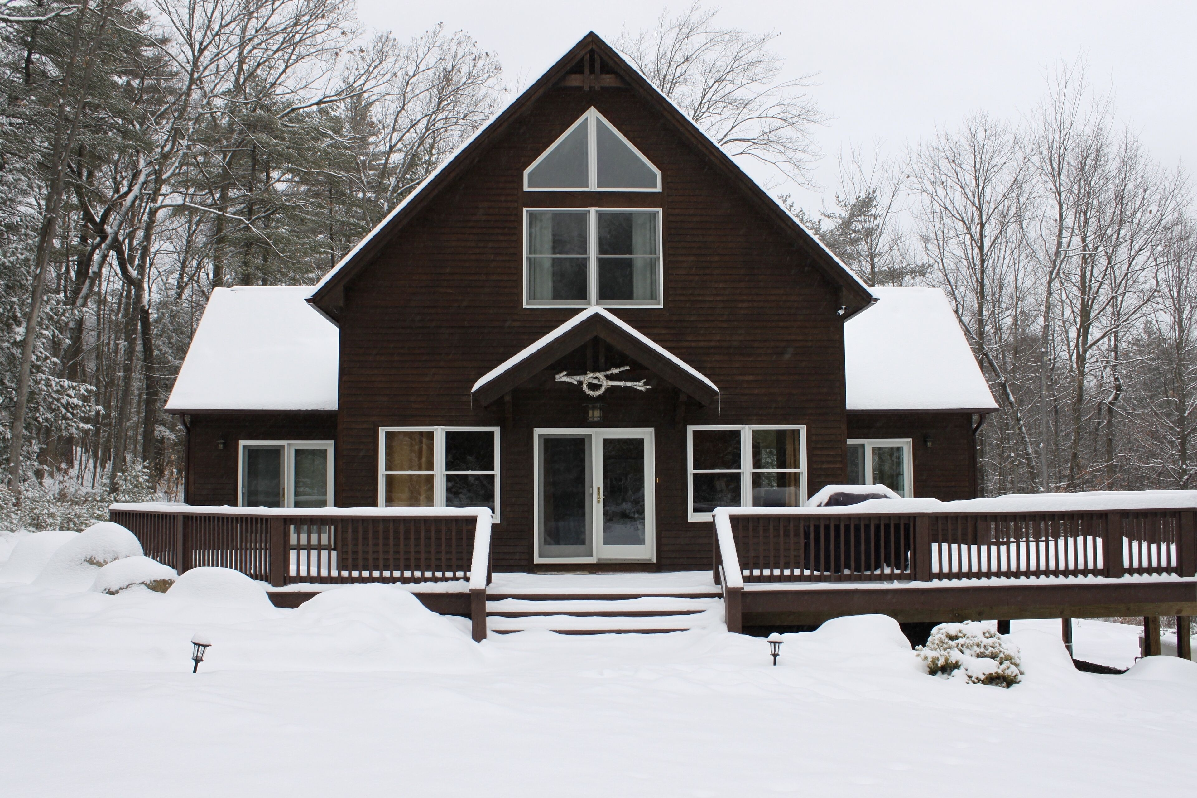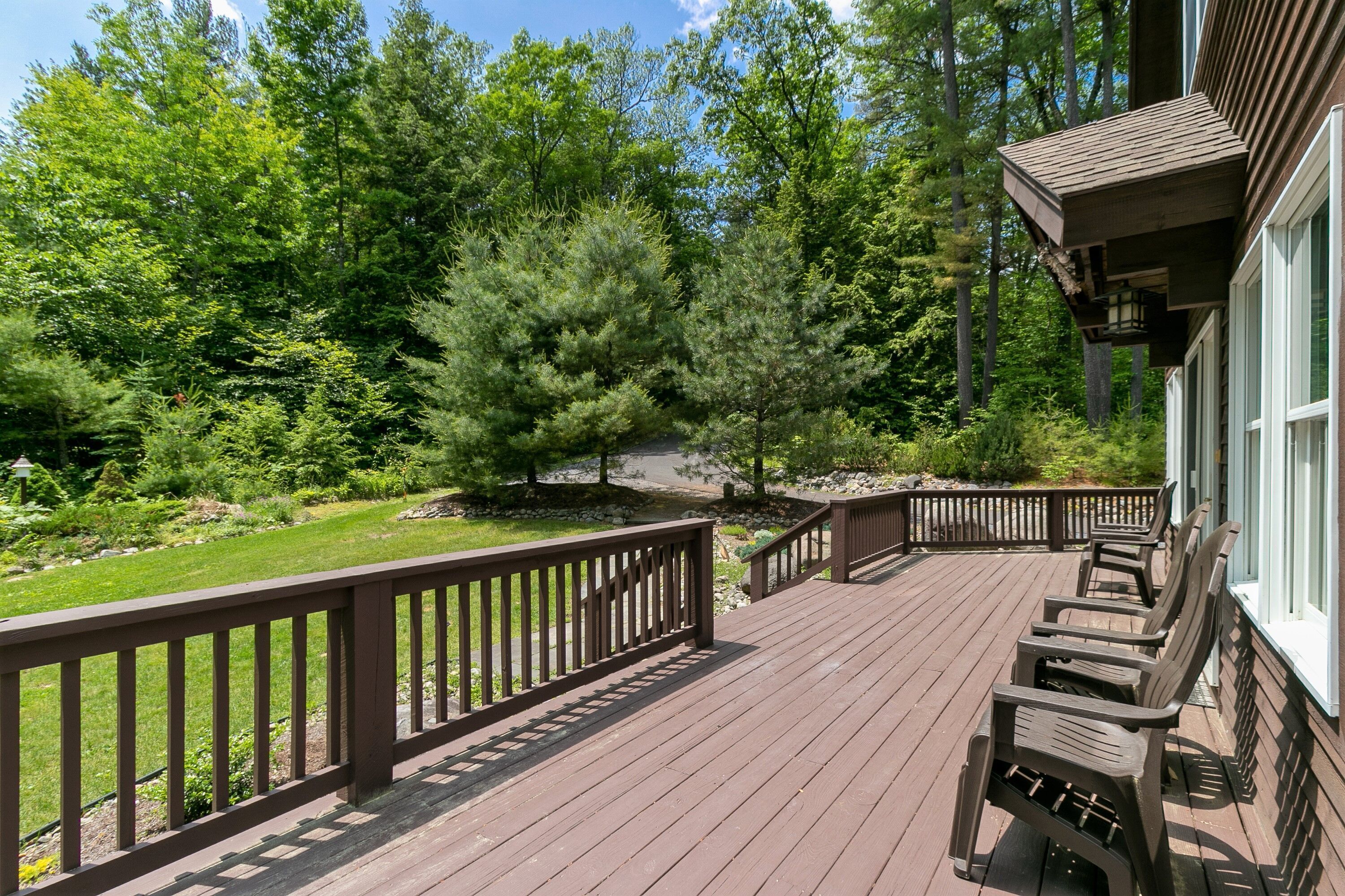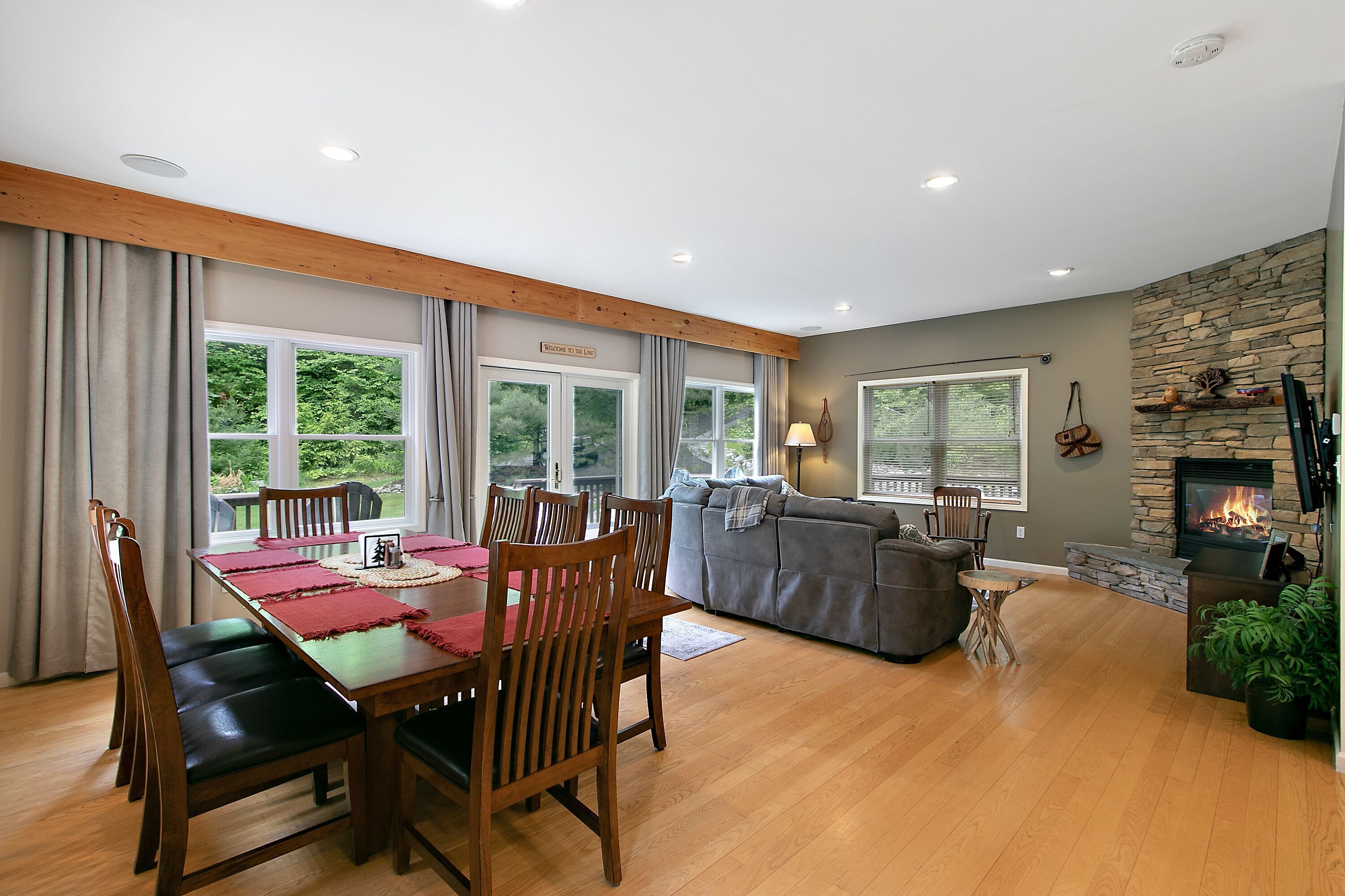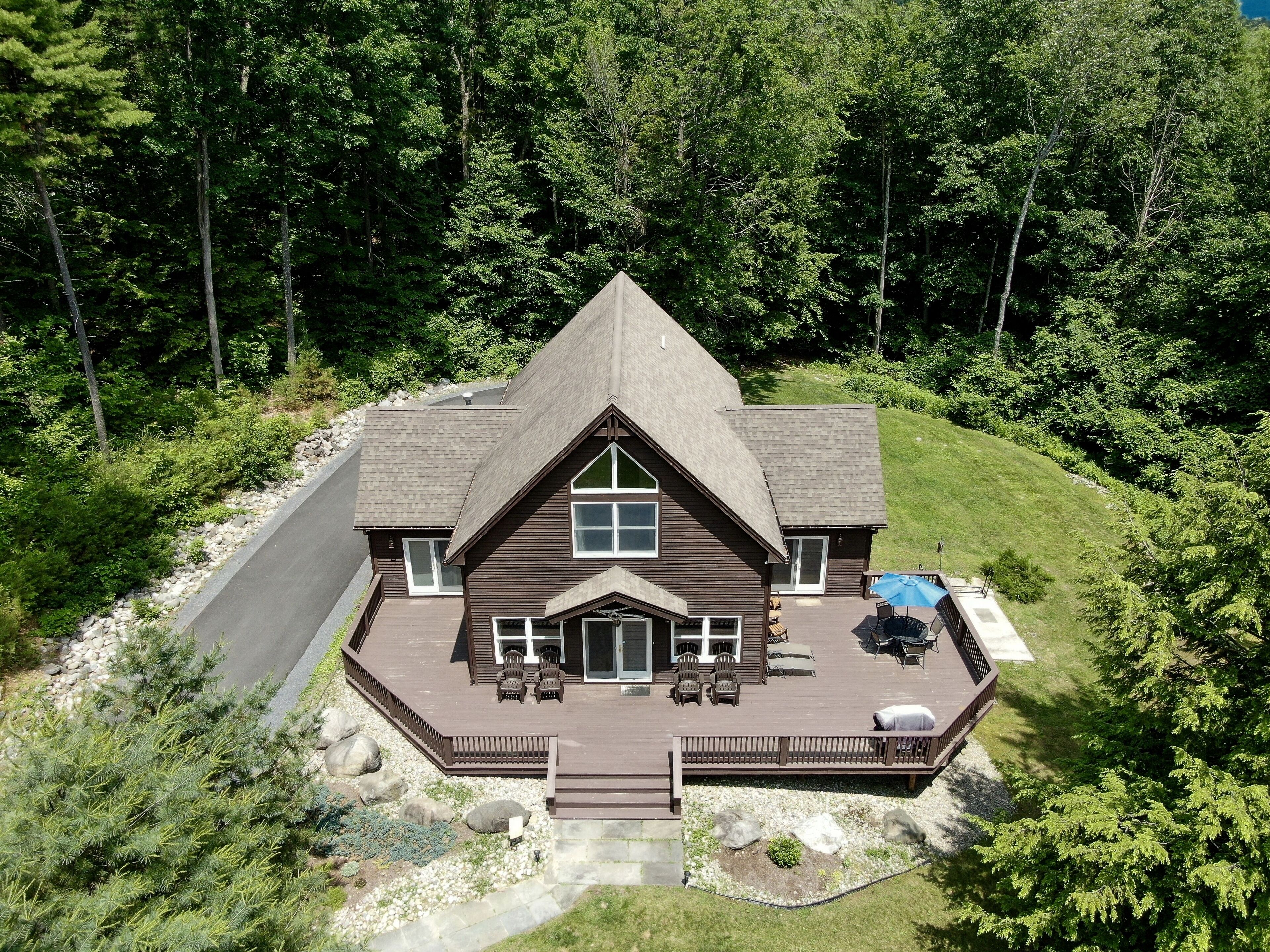 Lake George Mountain Retreat - Family And Pet Friendly *** SPECIAL OFFER *** Stay 8/16/24 - 8/22/24 minimum of 3 nights for $400 per night. Summer is typically a 7 night minimum at a rate of $450 per night *****Enjoy the best of both worlds! Experience a scenic, peaceful, private setting in the Adirondack mountains along with all the benefits of modern amenities (like Wifi and central air conditioning) and proximity to local Lake George attractions.Quickly access multiple beaches and water activities within a 5 to 10- minute drive. Delight in the hustle and bustle of Lake George Village just 1 mile away, or the slower pace of the quaint town of Bolton Landing in a 15 min car ride. Indoor and outdoor water parks, mini golf, amusement parks, horseback riding and more are all in your back yard. Serious shoppers, reach the Factory Outlets of Lake George in 15 minutes. Saratoga Springs and Gore Mountain are just a half an hour away.At home, relax on the 850 square foot wrap-around deck or huddle around the fire pit in this tranquil Adirondack paradise with a large yard surrounded by woods, providing a natural curtain for privacy. Hungry? Fire up the 4-burner gas grill and enjoy dinner on the patio set. Indoors, an open floor plan fosters quality time with family, friends and pets too! You will love the all-glass vaulted sunroom with a large sectional couch and wooden accents by local Adirondack artisans. Oversized windows bring the outside in with abundant natural light and full scale views of the landscape. The spacious, fully functioning, contemporary kitchen is a chef’s delight. Adjacent to both the sunroom and dining area, it has an eat-in bar area with plenty of counter space. It comes complete with refrigerator, induction stove, oven, dishwasher, microwave, coffee maker, toaster, blender, cooking utensils, pots and pans as well as service for 10 people. Prefer more formal dining? Set the long, mission-style dining room table with seating for eight.Kick back in the living room on the large reclining sectional sofa in front of a fieldstone gas fireplace. Watch your favorite shows on the 49" Smart LED TV or pipe your favorite tunes throughout the house with the state of the art stereo system. Xbox 360 Kinect, board games and cards are family room essentials, provided for fun-filled game nights. Enjoy a sound sleep on any one of the 5 brand new queen size mattresses/beds. Spoil yourselves in the master bedroom with walk-in closet, private entry to the deck and a full bath with Jacuzzi tub. The 2 additional bedrooms, one of which has a vaulted ceiling, are exceptionally spacious, contain two beds each and share a full bath. All bedrooms are equipped with ceiling fans. An additional half bath and laundry room with washer and dryer are conveniently located on the first floor. Iron and ironing board are provided to satisfy remaining laundry needs. Two car garage and long driveway provide ample guest parking.An idyllic Adirondack vacation awaits you at Lake George!