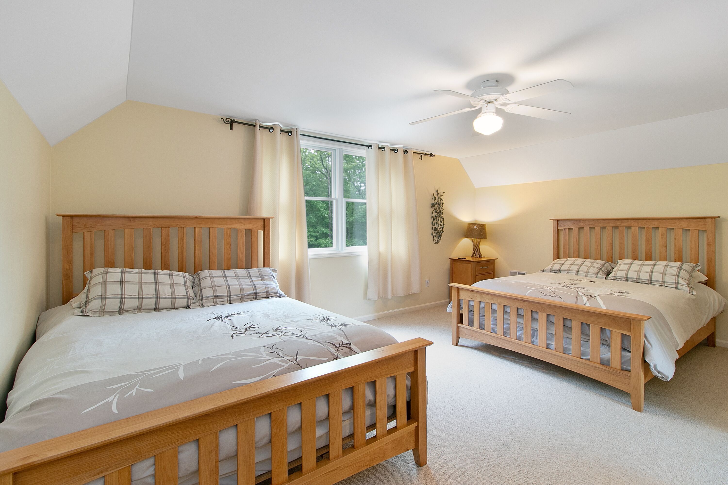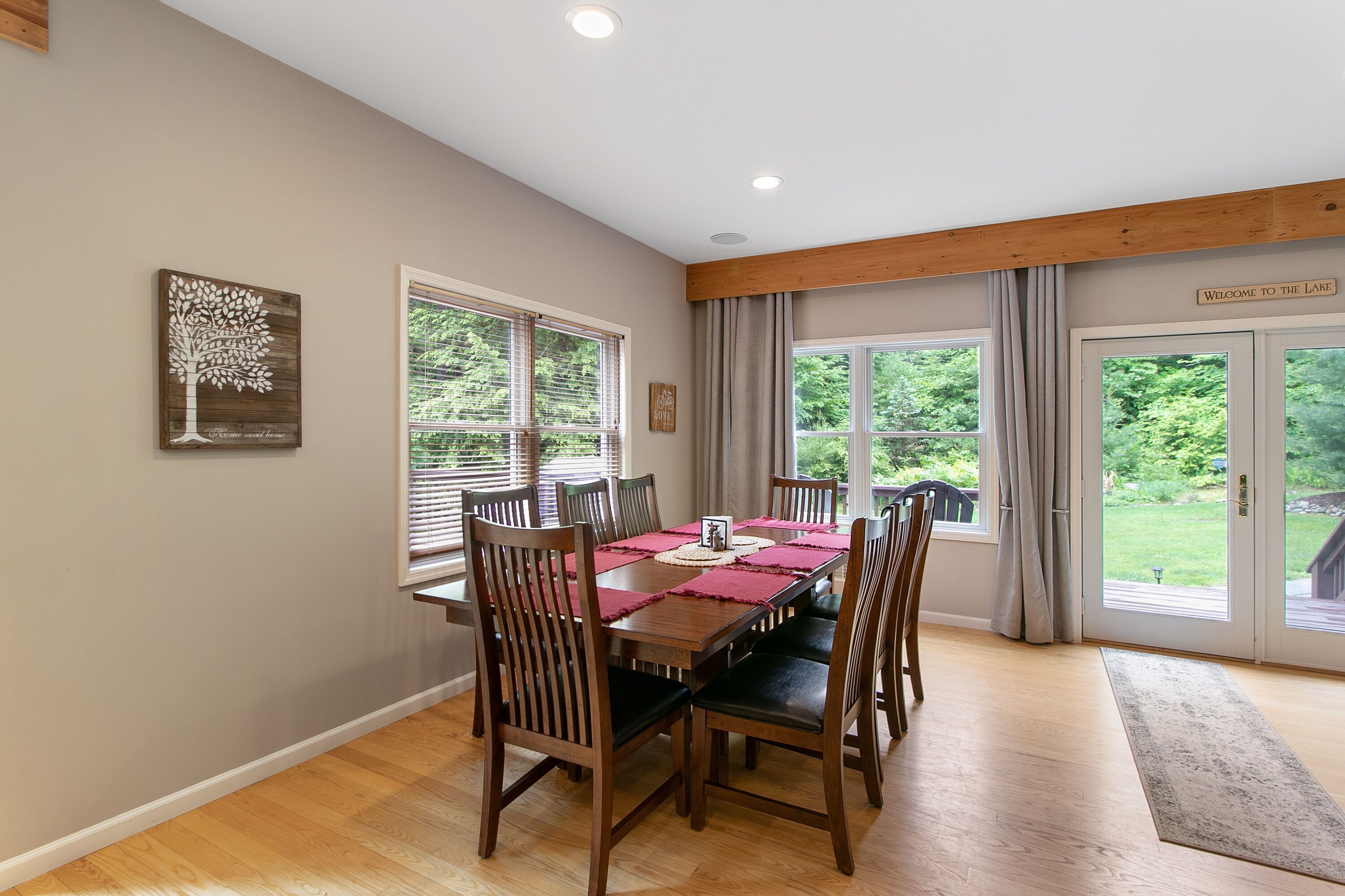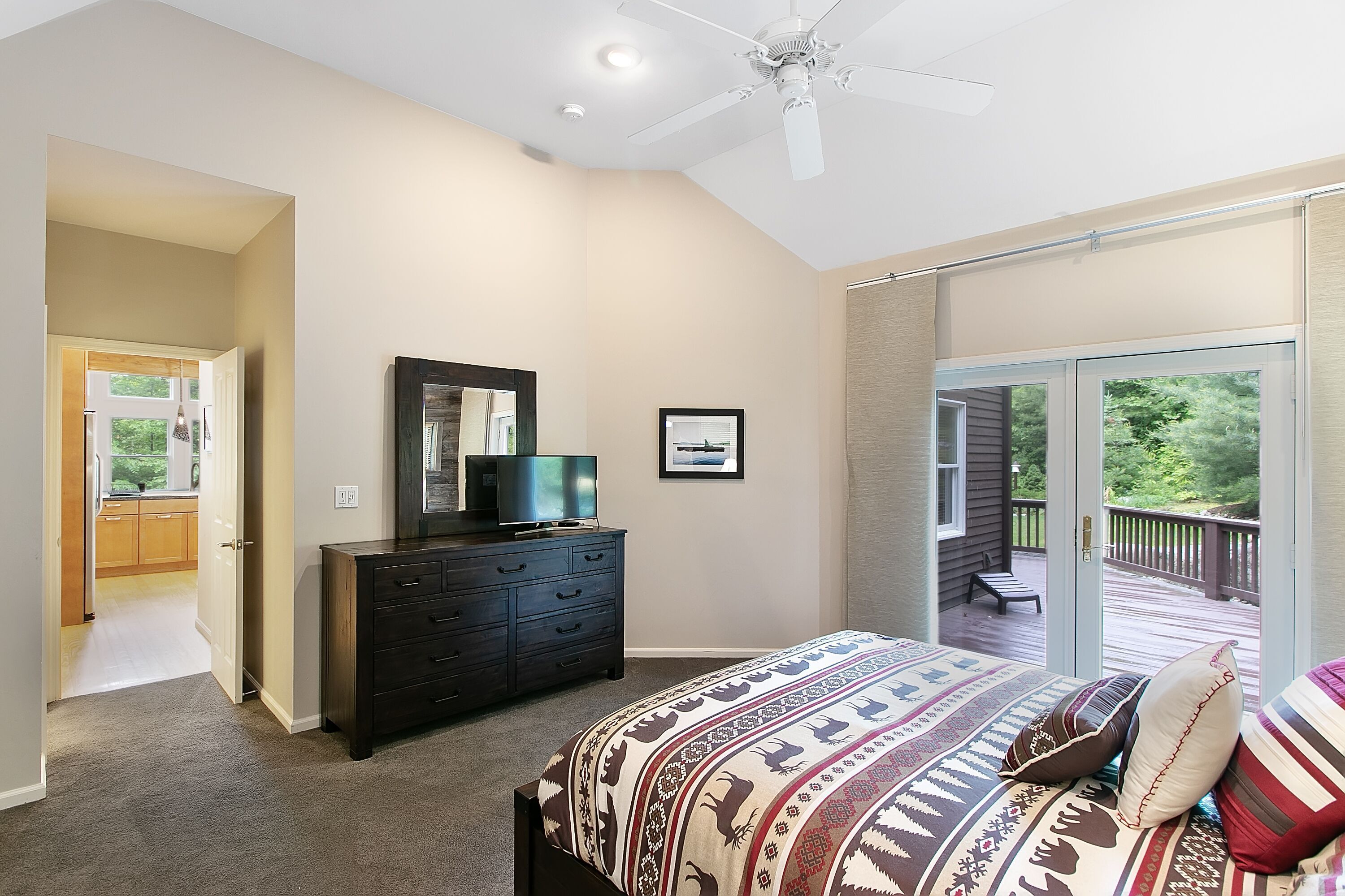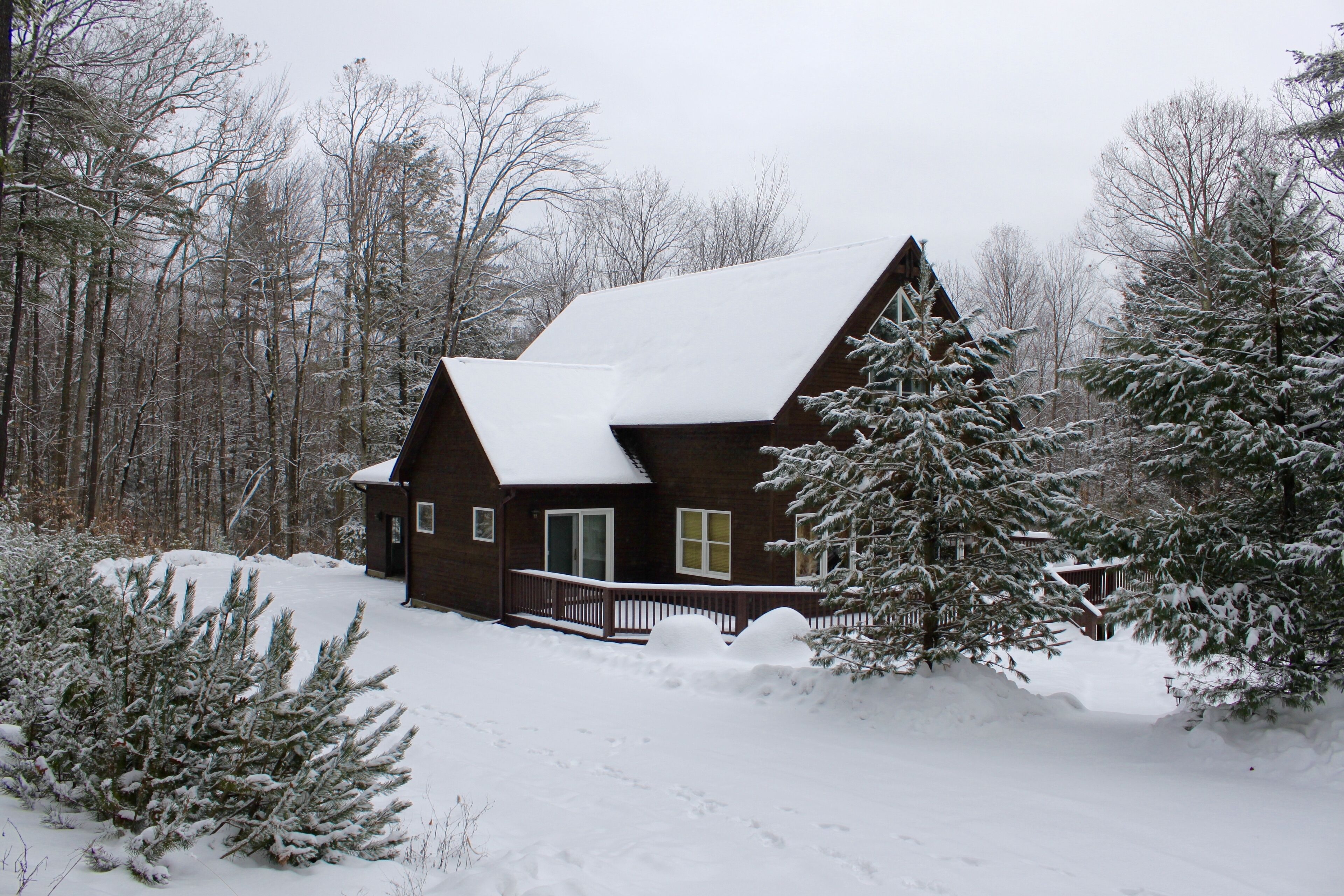 Lake George Mountain Retreat - Family And Pet Friendly *** SPECIAL OFFER *** Stay 8/16/24 - 8/22/24 minimum of 3 nights for $400 per night. Summer is typically a 7 night minimum at a rate of $450 per night *****Enjoy the best of both worlds! Experience a scenic, peaceful, private setting in the Adirondack mountains along with all the benefits of modern amenities (like Wifi and central air conditioning) and proximity to local Lake George attractions.Quickly access multiple beaches and water activities within a 5 to 10- minute drive. Delight in the hustle and bustle of Lake George Village just 1 mile away, or the slower pace of the quaint town of Bolton Landing in a 15 min car ride. Indoor and outdoor water parks, mini golf, amusement parks, horseback riding and more are all in your back yard. Serious shoppers, reach the Factory Outlets of Lake George in 15 minutes. Saratoga Springs and Gore Mountain are just a half an hour away.At home, relax on the 850 square foot wrap-around deck or huddle around the fire pit in this tranquil Adirondack paradise with a large yard surrounded by woods, providing a natural curtain for privacy. Hungry? Fire up the 4-burner gas grill and enjoy dinner on the patio set. Indoors, an open floor plan fosters quality time with family, friends and pets too! You will love the all-glass vaulted sunroom with a large sectional couch and wooden accents by local Adirondack artisans. Oversized windows bring the outside in with abundant natural light and full scale views of the landscape. The spacious, fully functioning, contemporary kitchen is a chef’s delight. Adjacent to both the sunroom and dining area, it has an eat-in bar area with plenty of counter space. It comes complete with refrigerator, induction stove, oven, dishwasher, microwave, coffee maker, toaster, blender, cooking utensils, pots and pans as well as service for 10 people. Prefer more formal dining? Set the long, mission-style dining room table with seating for eight.Kick back in the living room on the large reclining sectional sofa in front of a fieldstone gas fireplace. Watch your favorite shows on the 49" Smart LED TV or pipe your favorite tunes throughout the house with the state of the art stereo system. Xbox 360 Kinect, board games and cards are family room essentials, provided for fun-filled game nights. Enjoy a sound sleep on any one of the 5 brand new queen size mattresses/beds. Spoil yourselves in the master bedroom with walk-in closet, private entry to the deck and a full bath with Jacuzzi tub. The 2 additional bedrooms, one of which has a vaulted ceiling, are exceptionally spacious, contain two beds each and share a full bath. All bedrooms are equipped with ceiling fans. An additional half bath and laundry room with washer and dryer are conveniently located on the first floor. Iron and ironing board are provided to satisfy remaining laundry needs. Two car garage and long driveway provide ample guest parking.An idyllic Adirondack vacation awaits you at Lake George!
