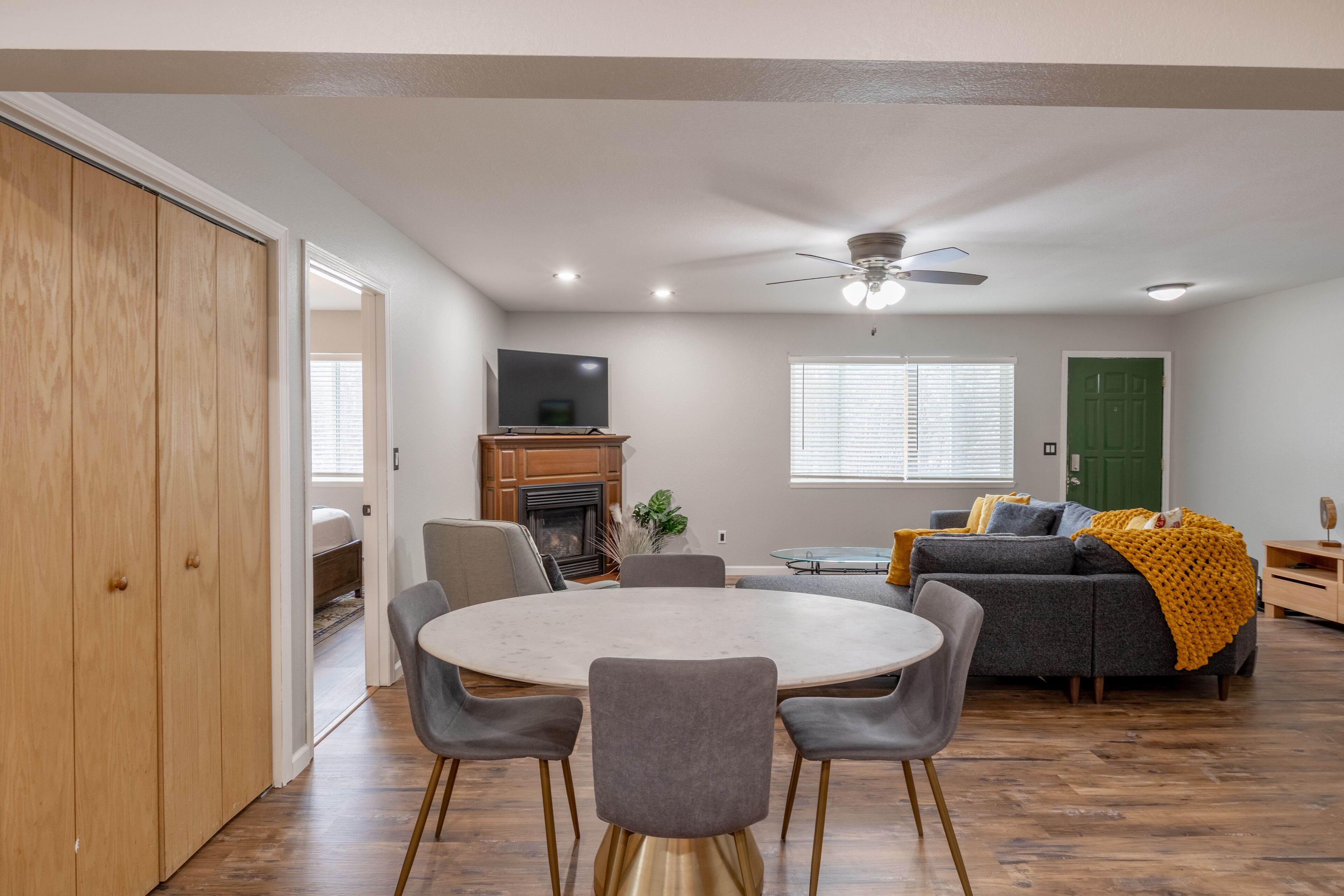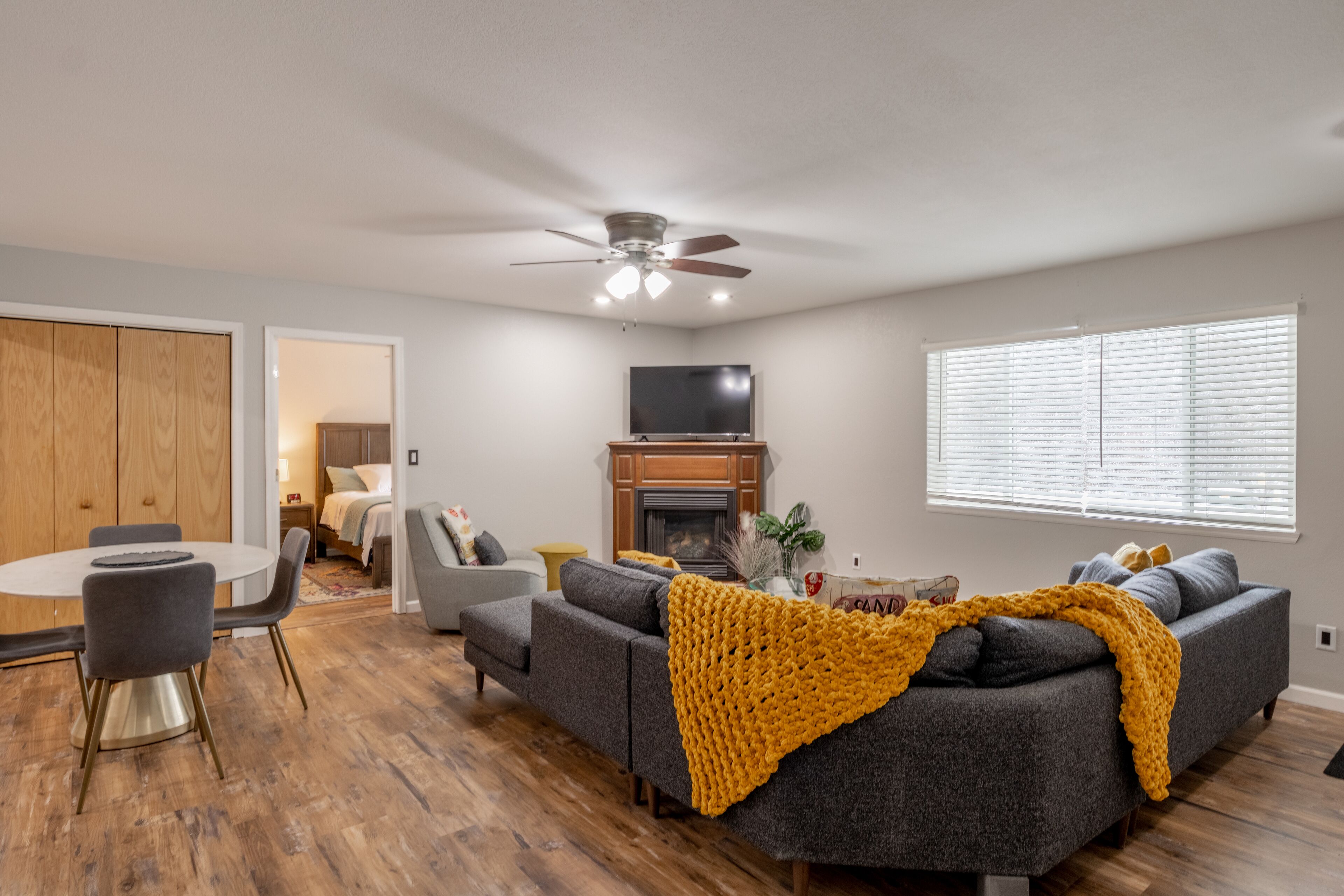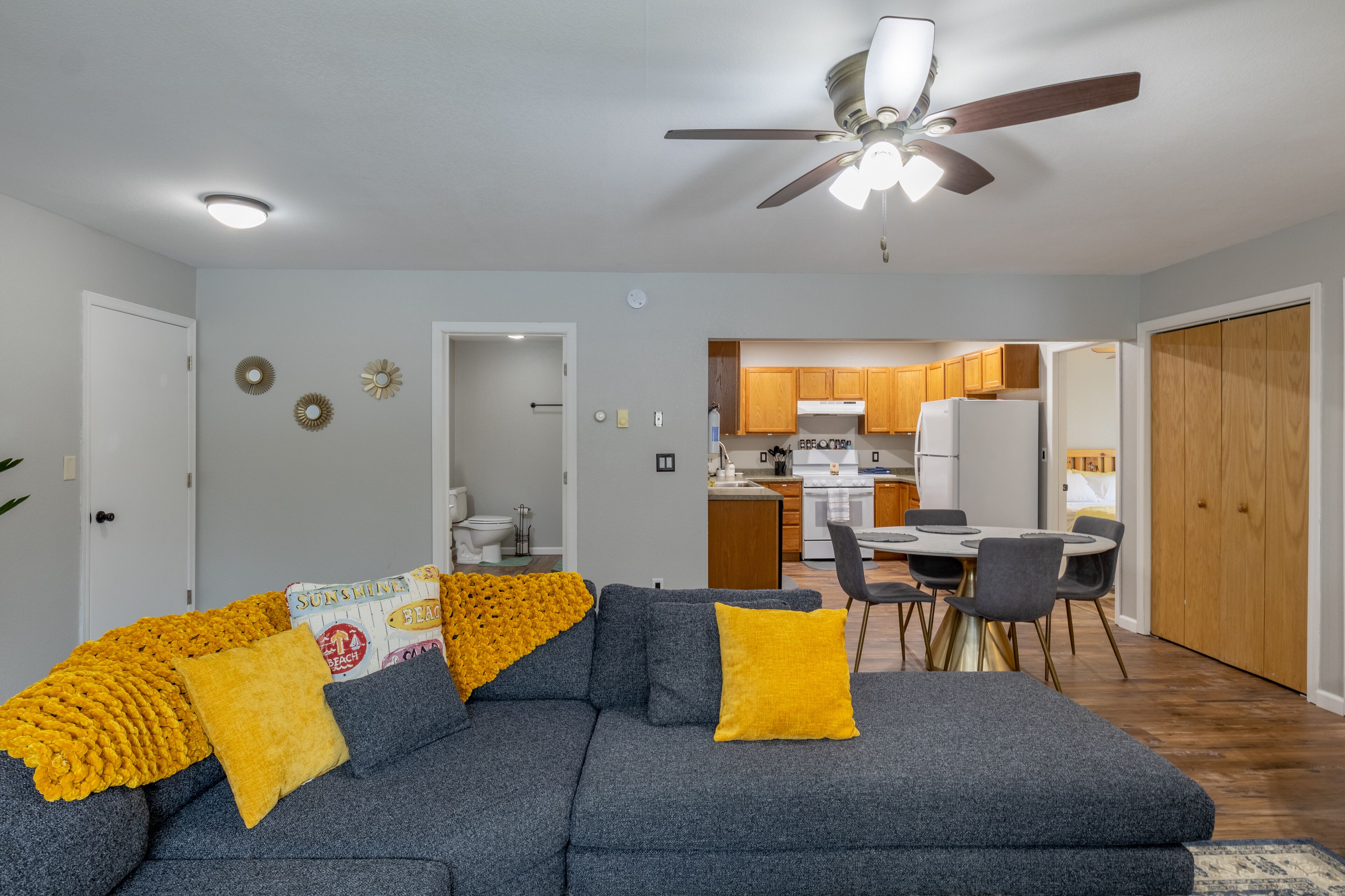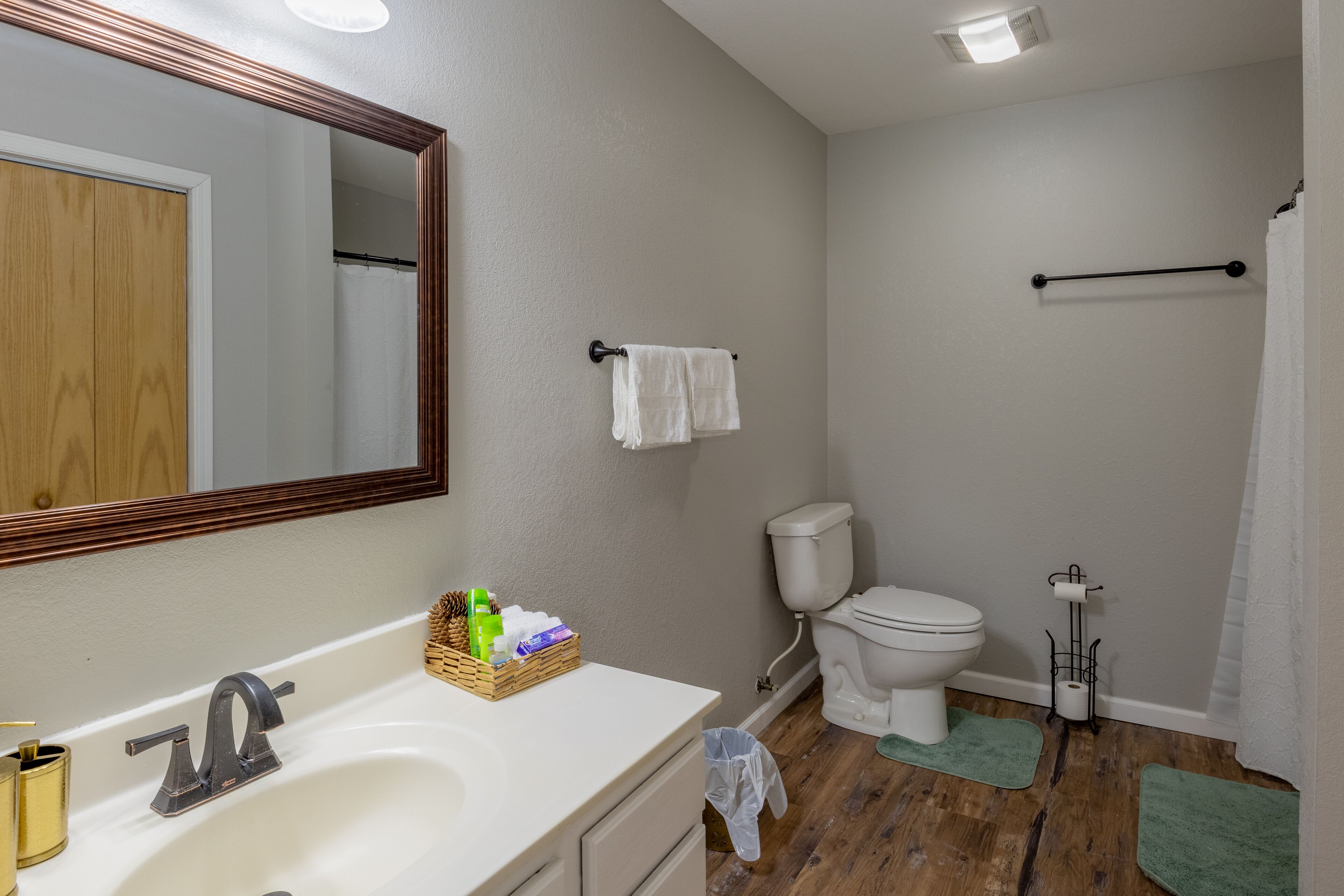 The Northwoods at Lake George, MN Welcome to The Northwoods. Come to get away from it all. Once you step through the doors, you will immediately feel a sense of comfortable and you are in for an enjoyable stay. Relax and watch TV on the most comfortable sectional, that can also sleep 2. If you feel like whipping up a meal- don't worry, the fully stocked kitchen has all that you would need- then sit around the dining table to enjoy.Long days requires a good sleep, settle in for a good night's rest in either of the 2 bedrooms- equipped with a King size bed and the 2nd room with a Queen size bed. You will have plenty of room to get ready for the next day in the spacious bathroom- that comes with hairdryer and toiletries. This unit is easy to access- sidewalk comes right off the driveway, leading to the unit.